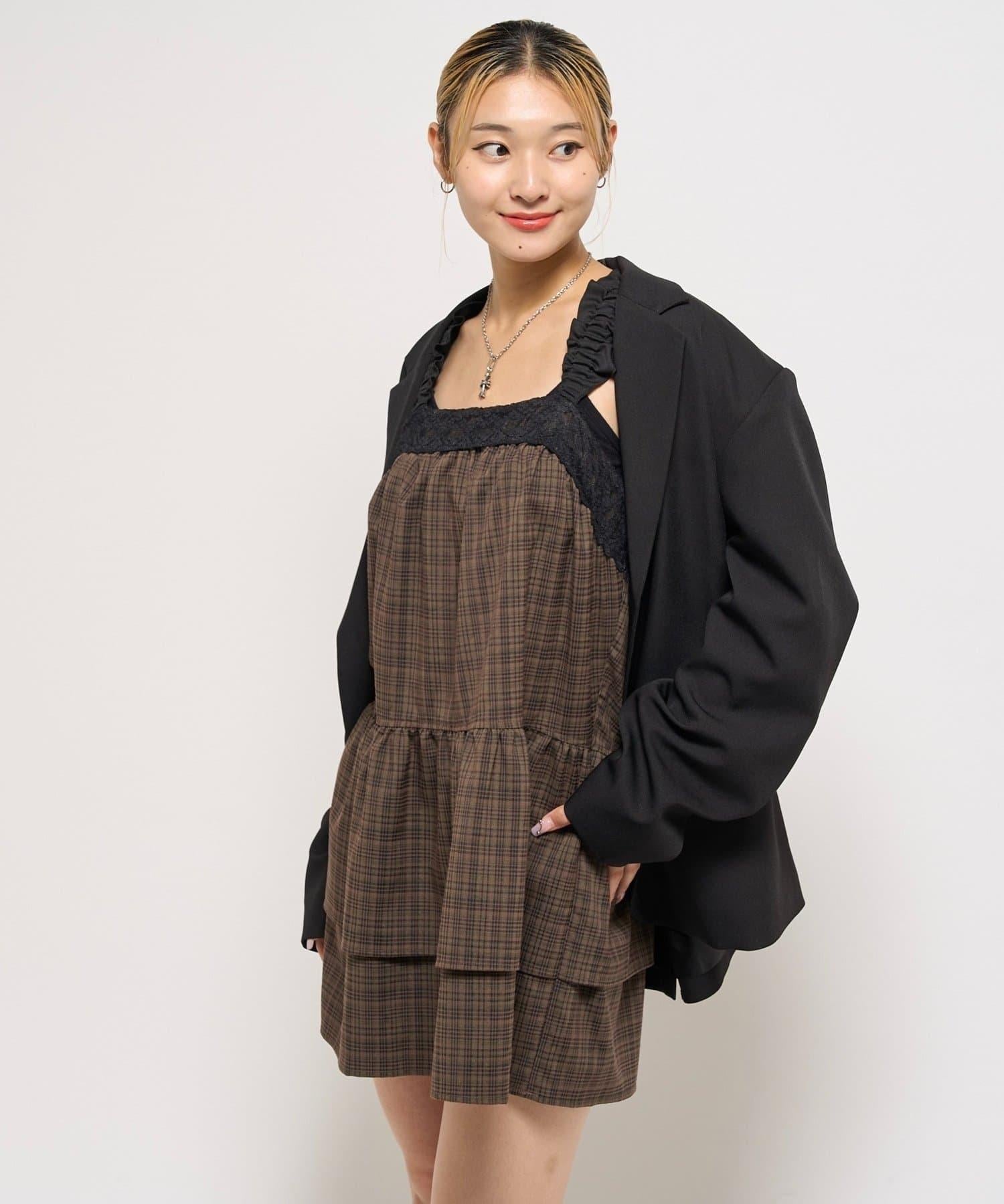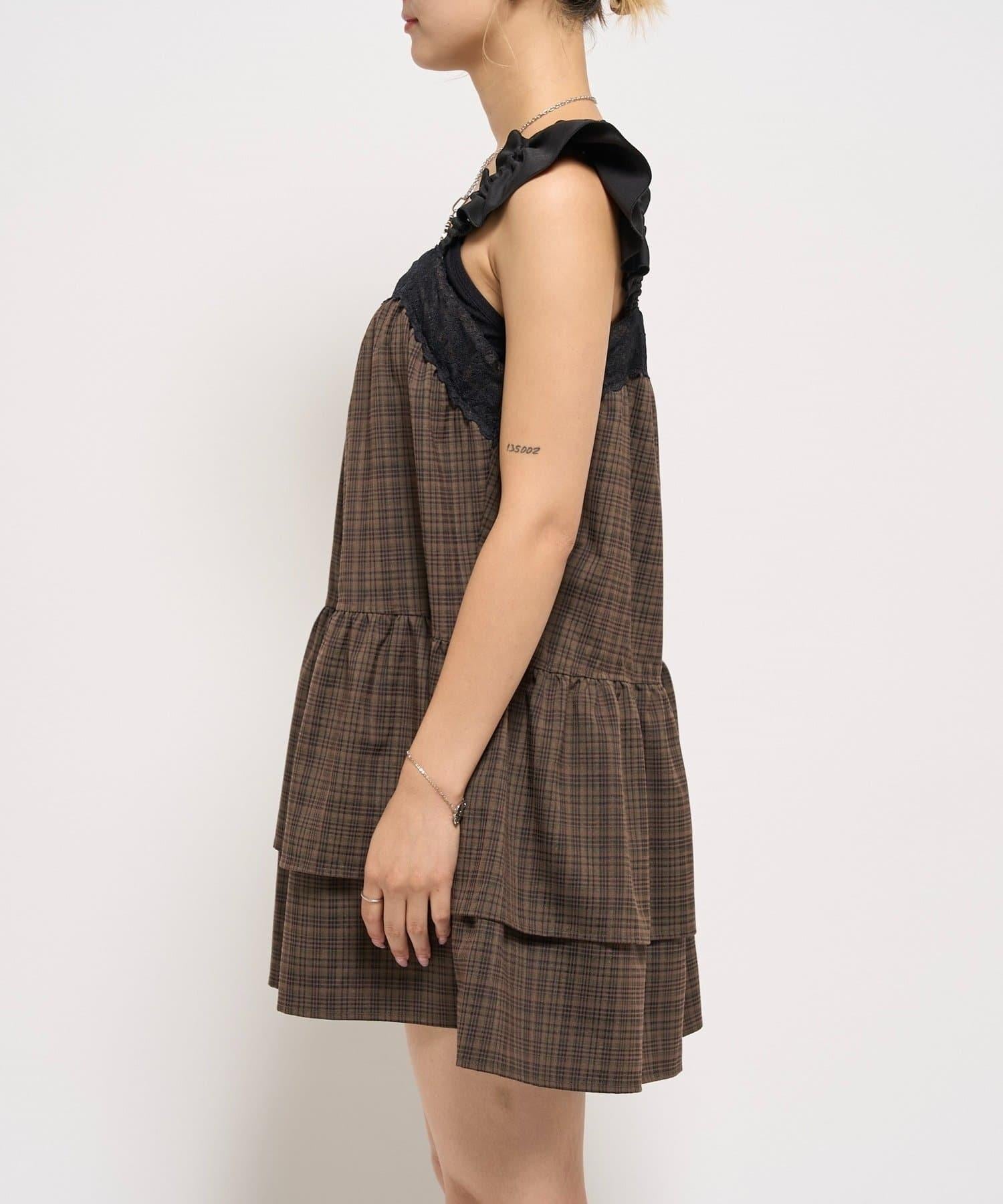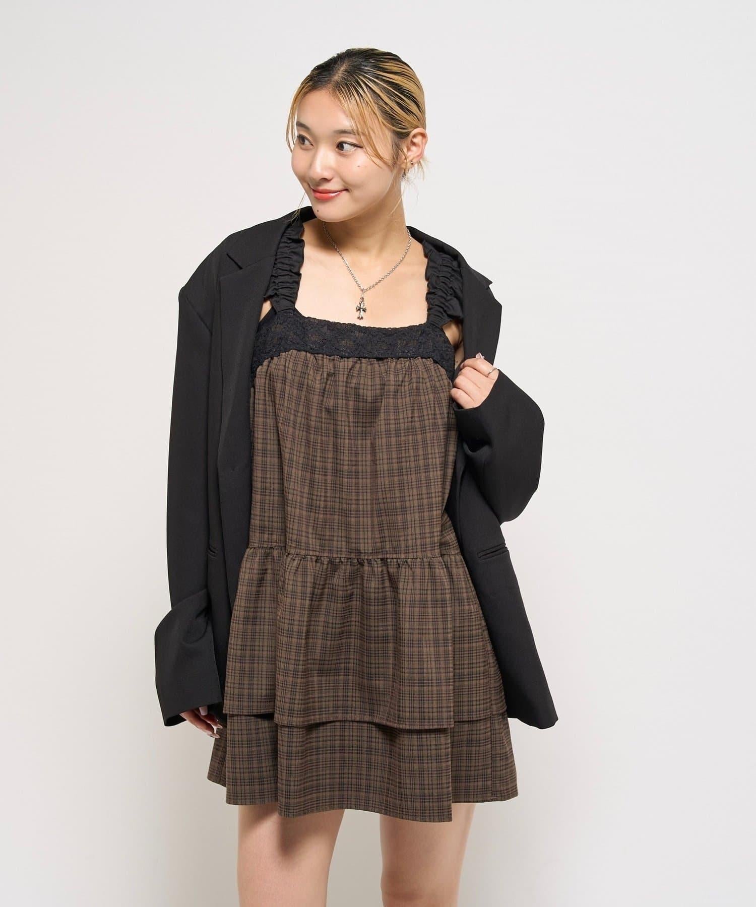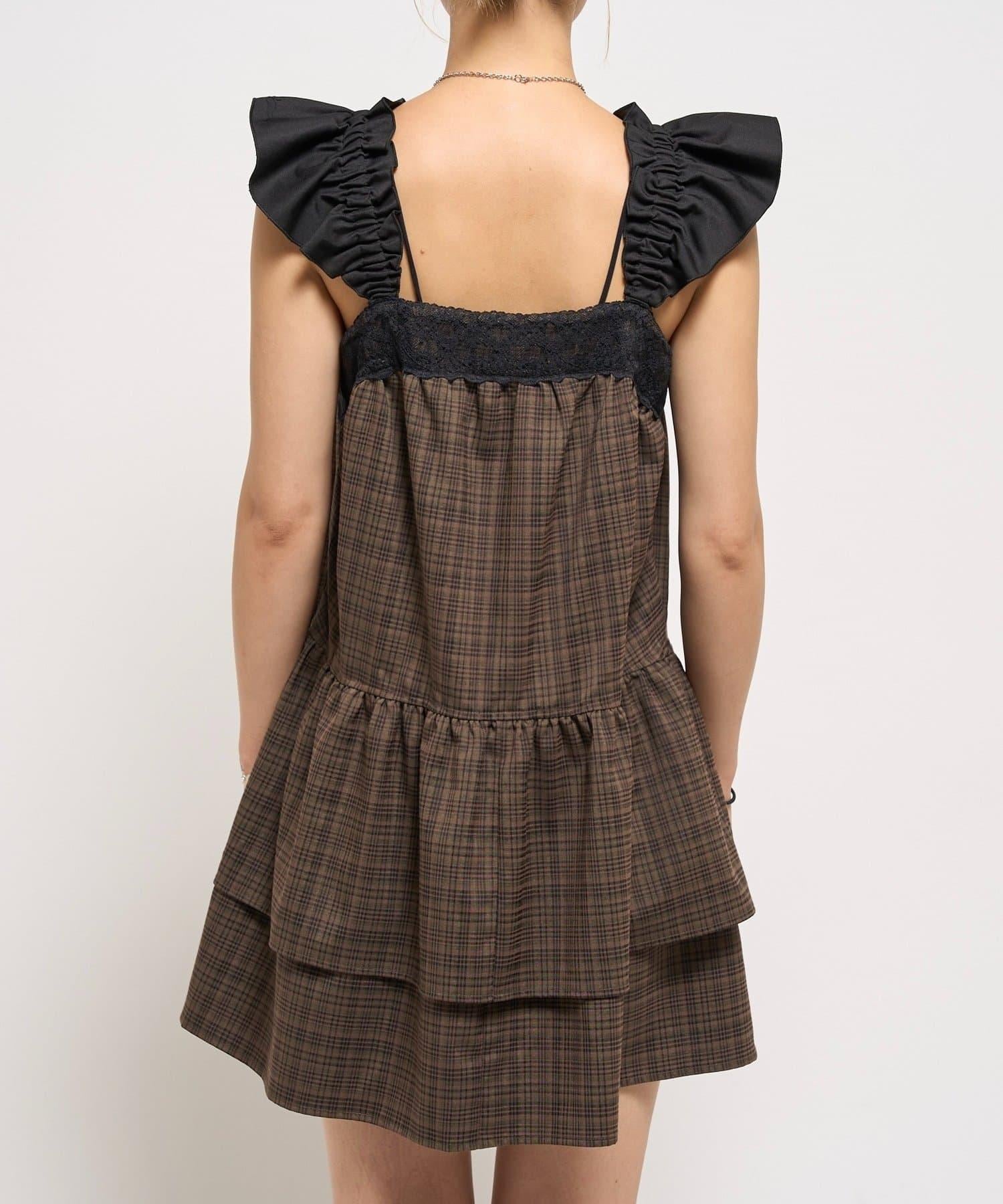 層疊設計的迷你連衣裙,採用少女格紋圖案和醒目的成人可愛黑色花邊。