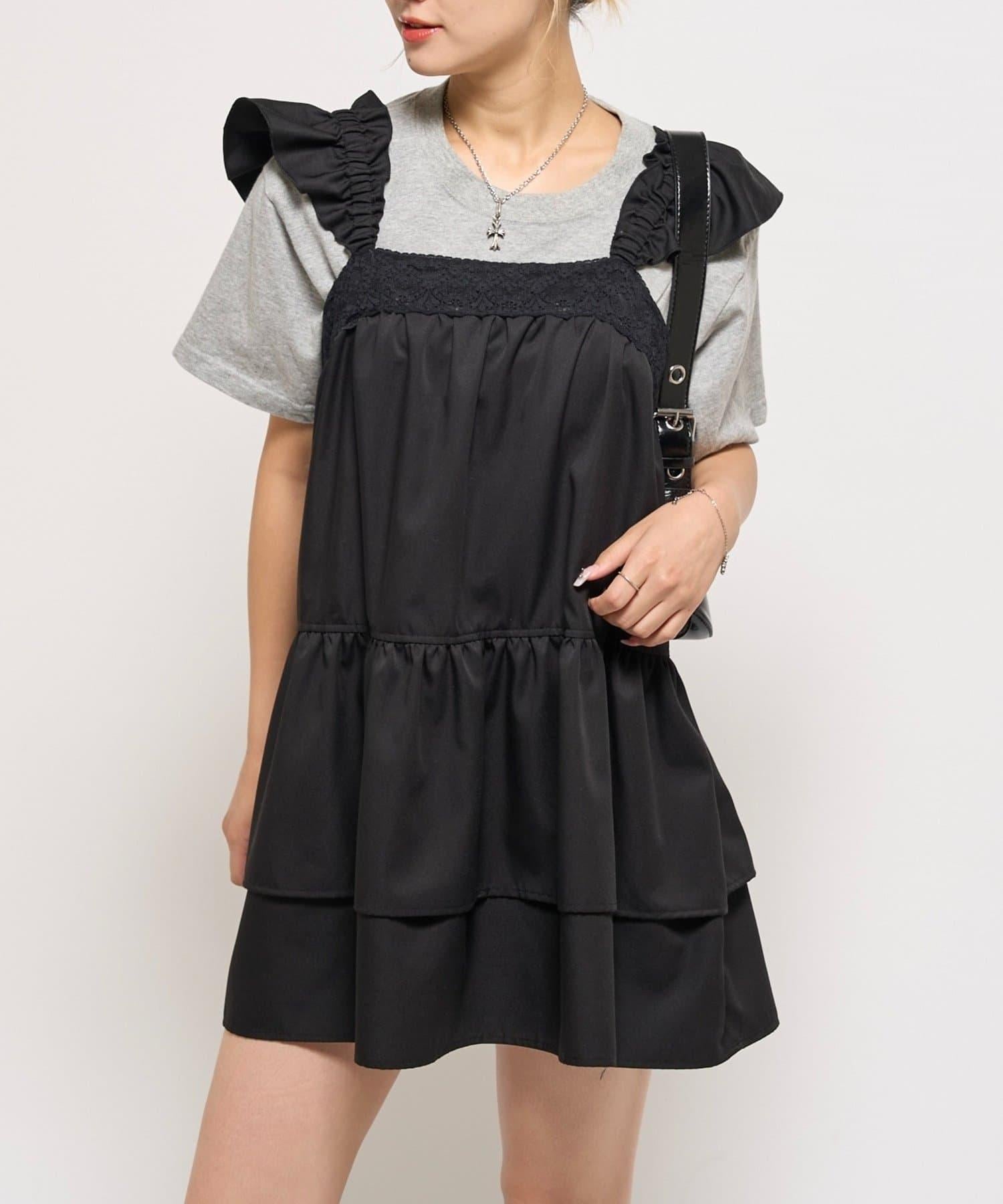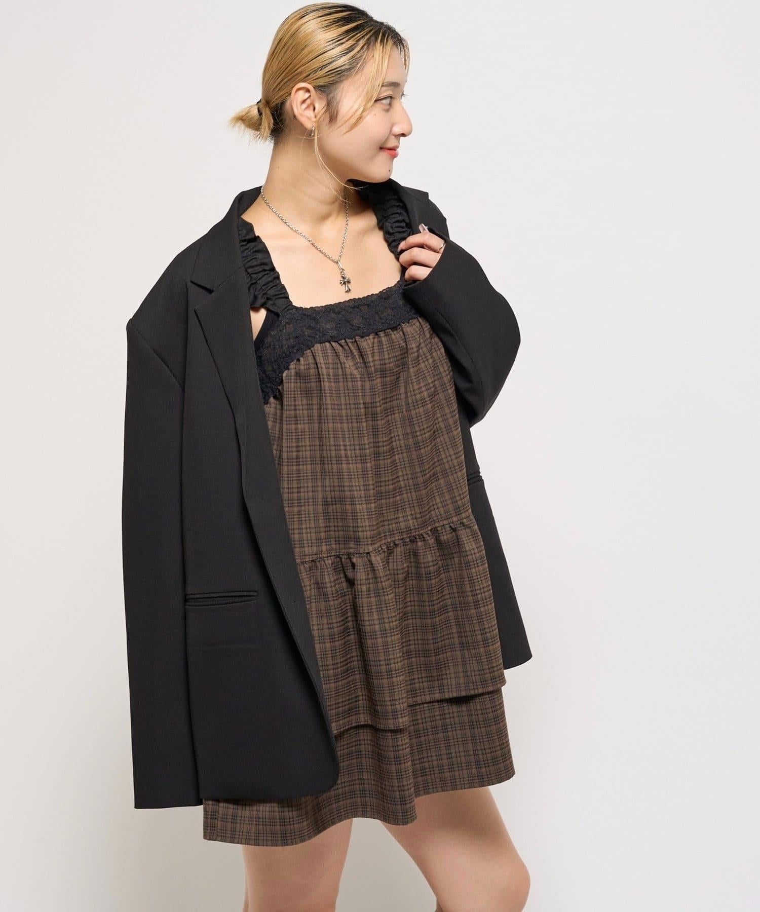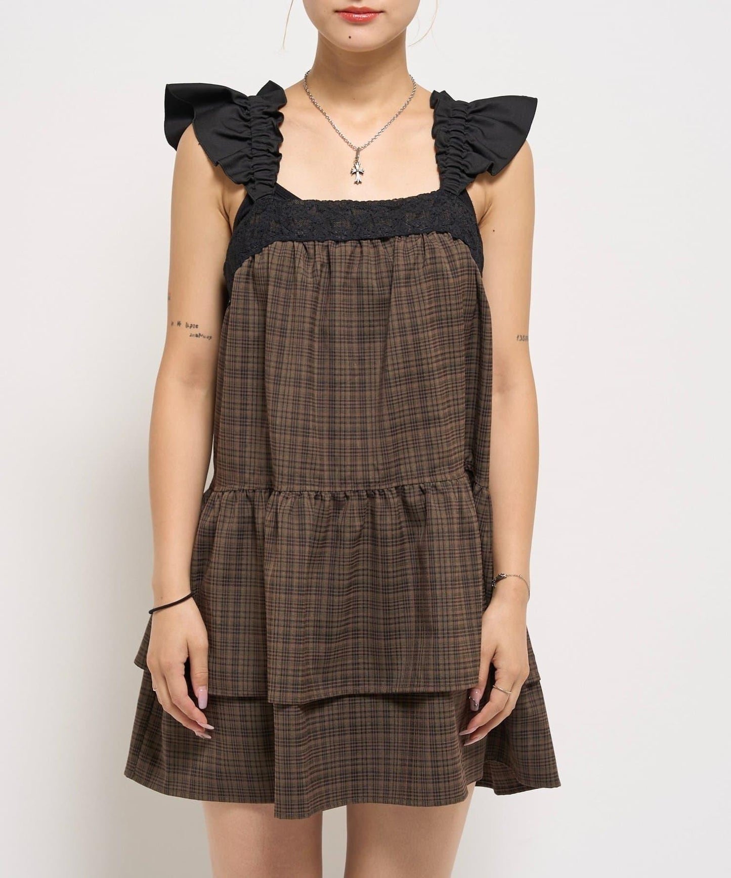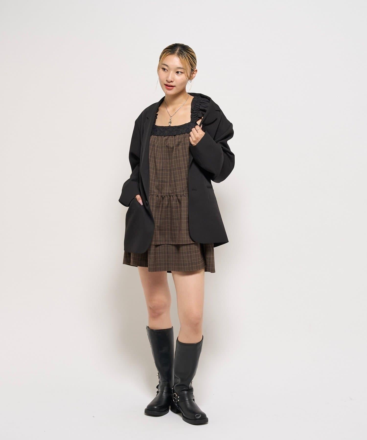 層疊設計的迷你連衣裙,採用少女格紋圖案和醒目的成人可愛黑色花邊。