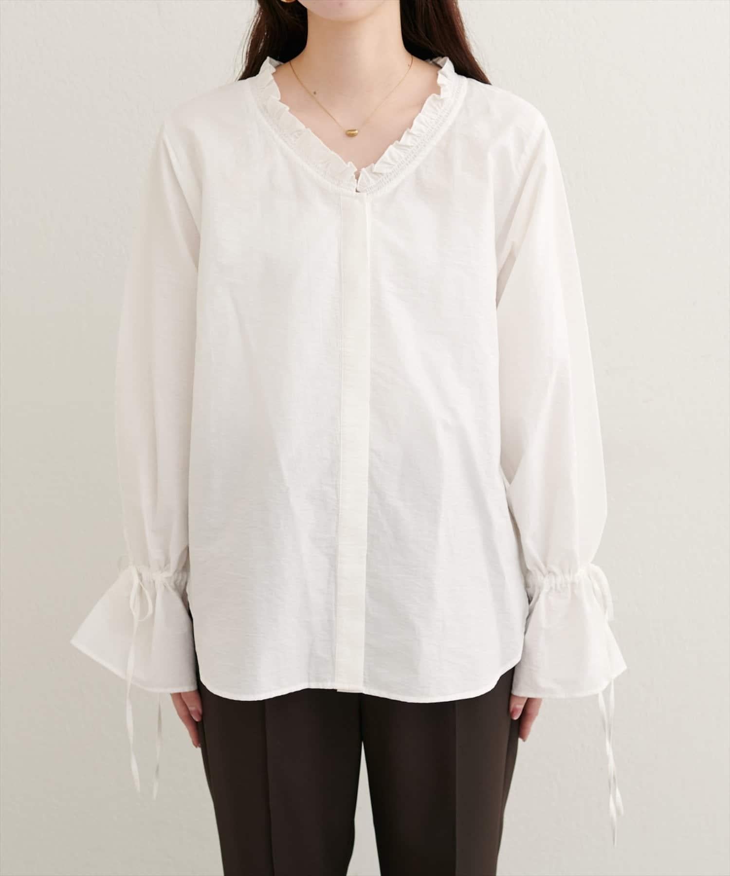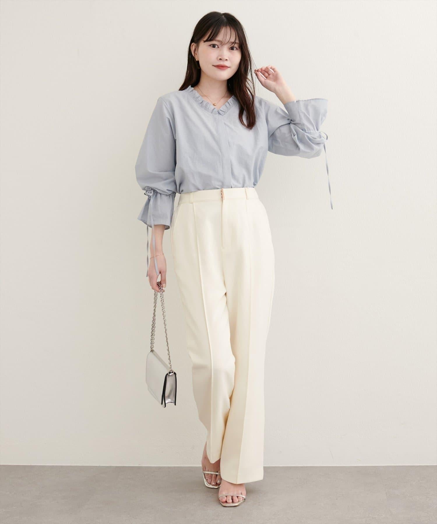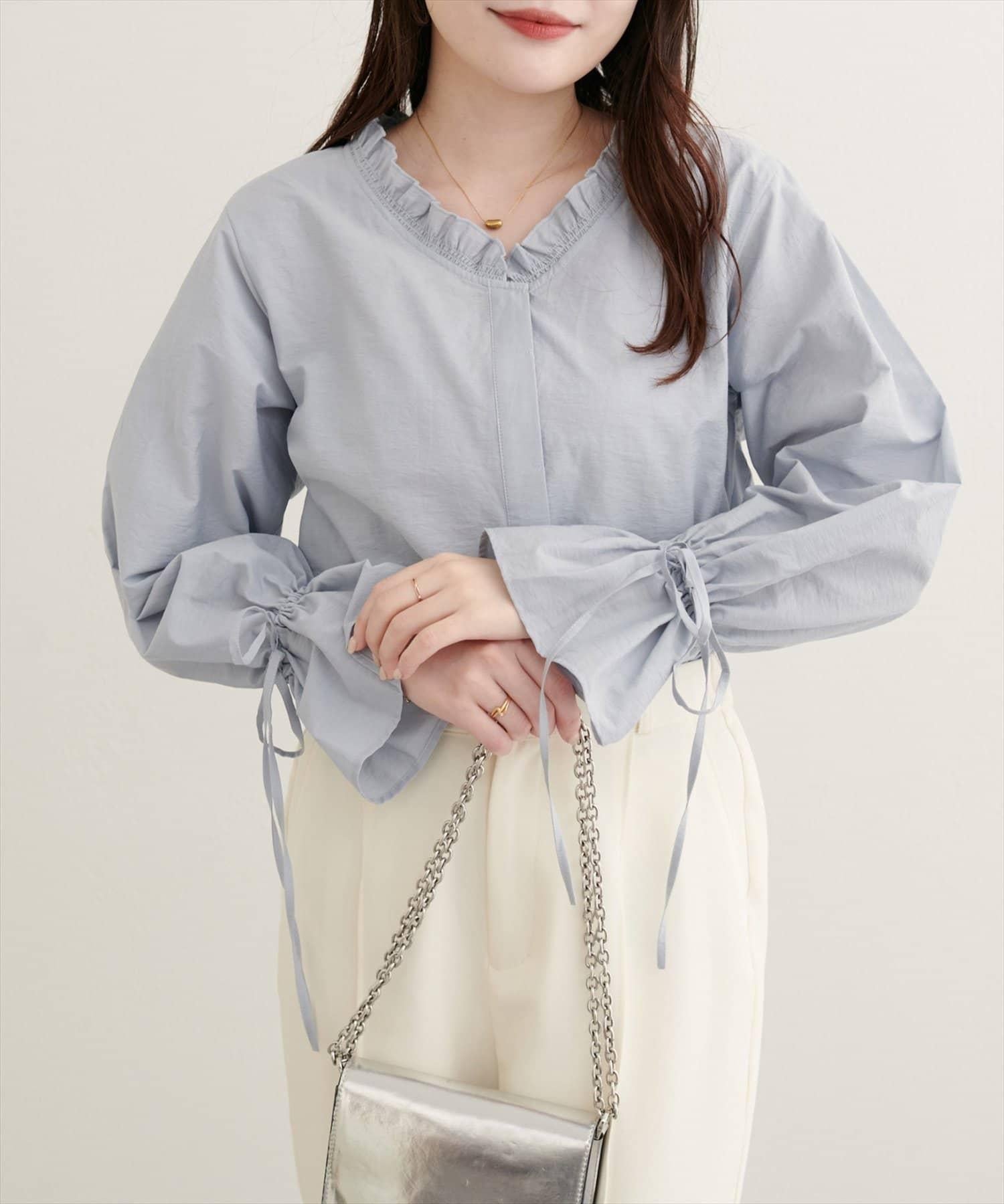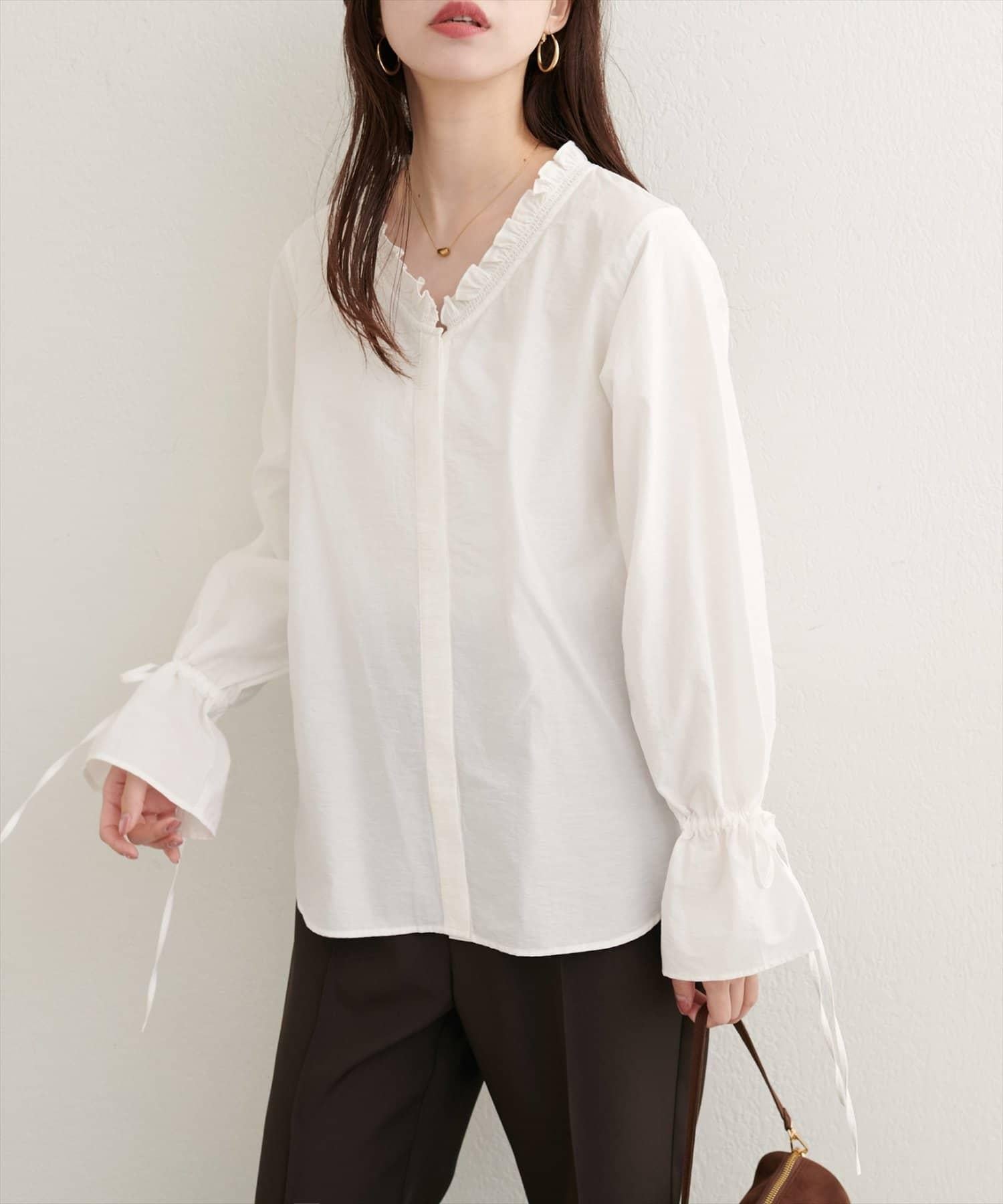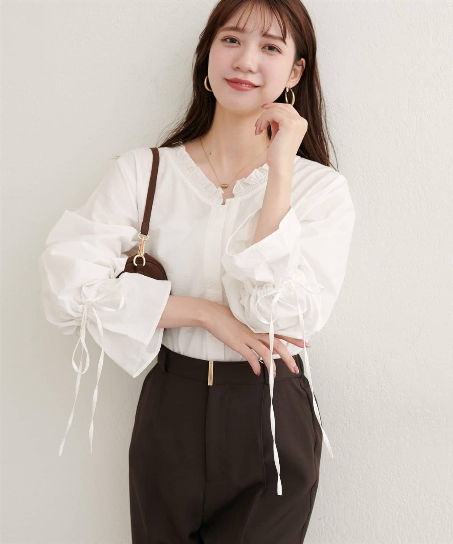 這款荷葉邊 V 領糖果袖上衣輪廓柔美,細節精緻。