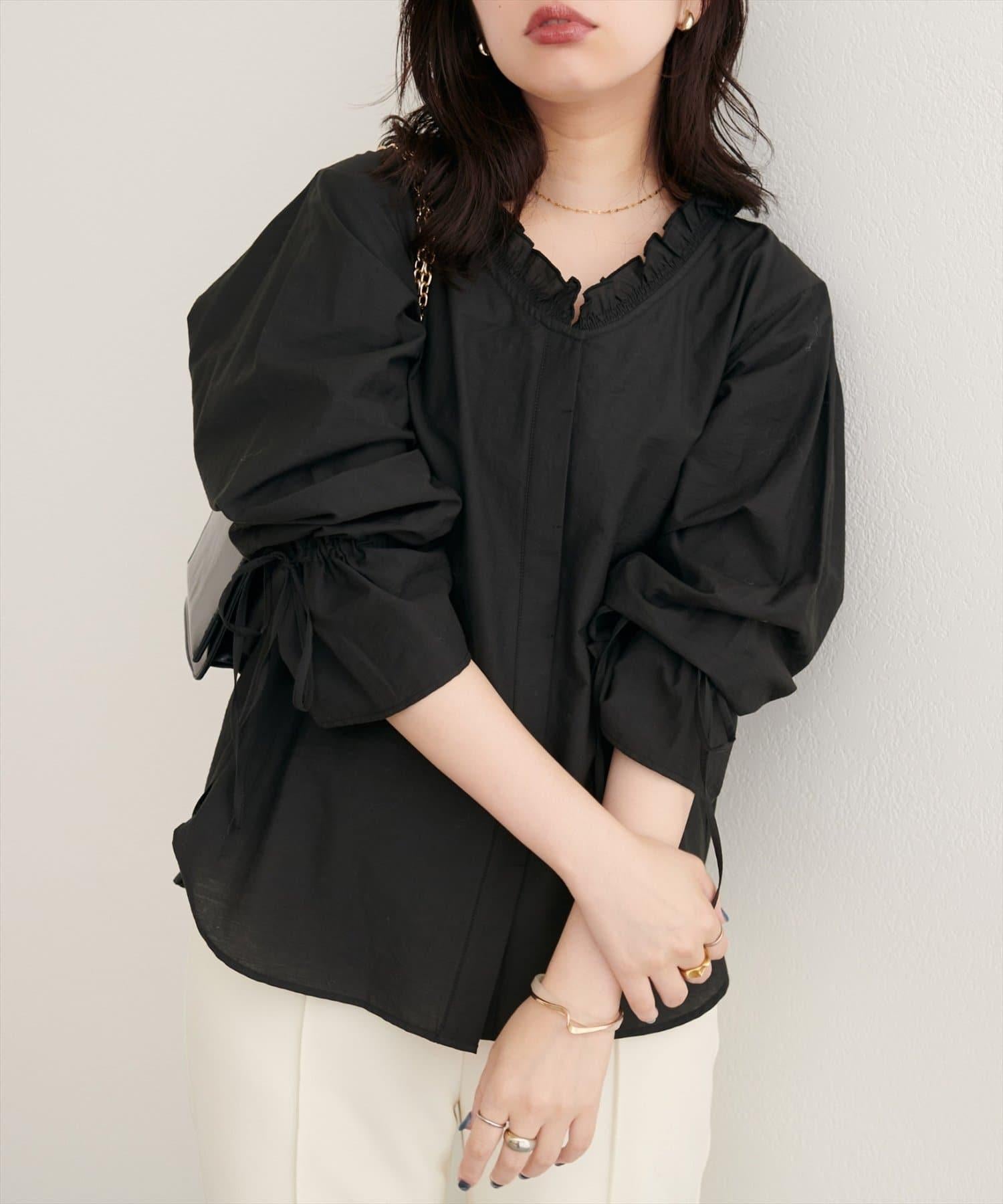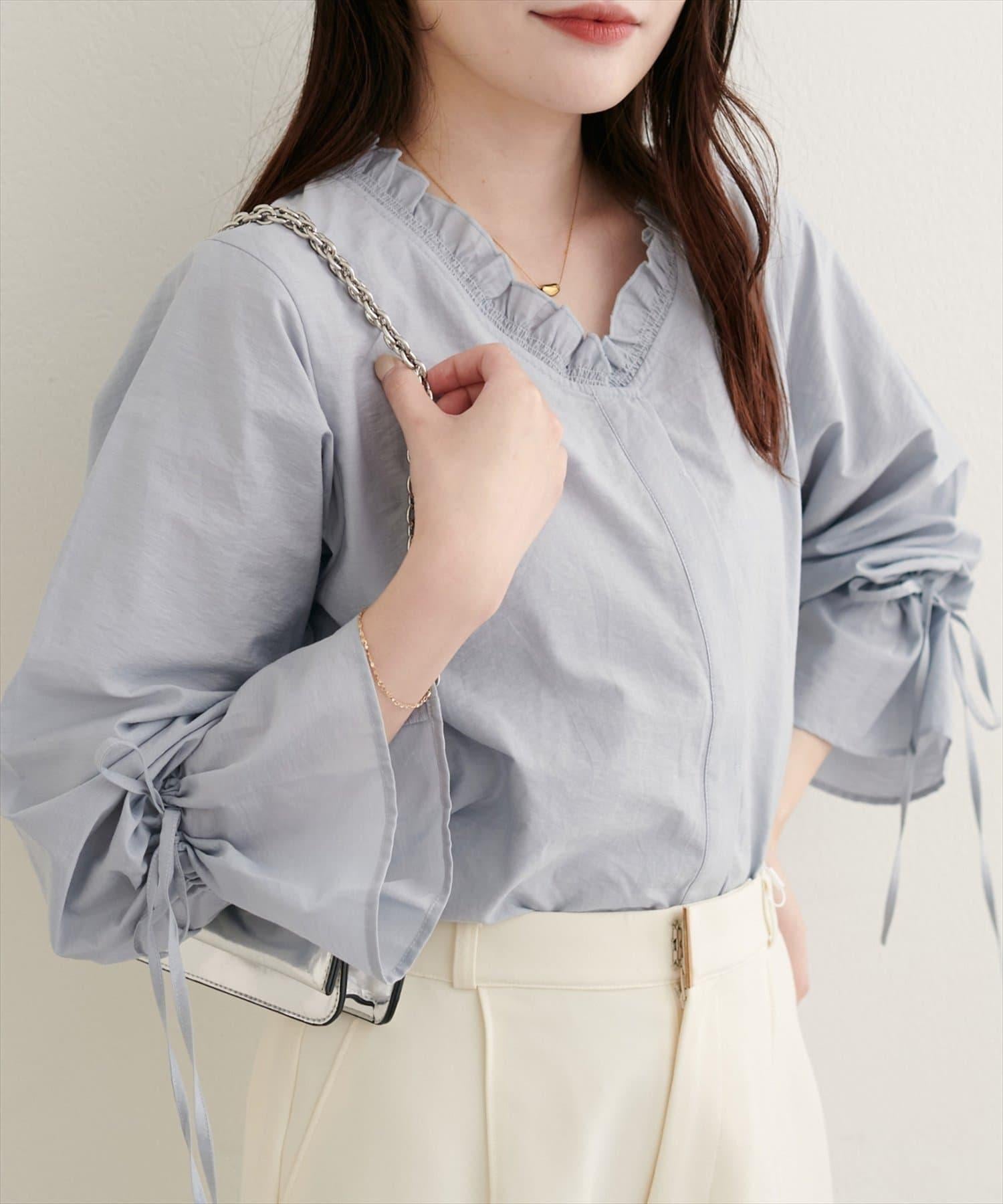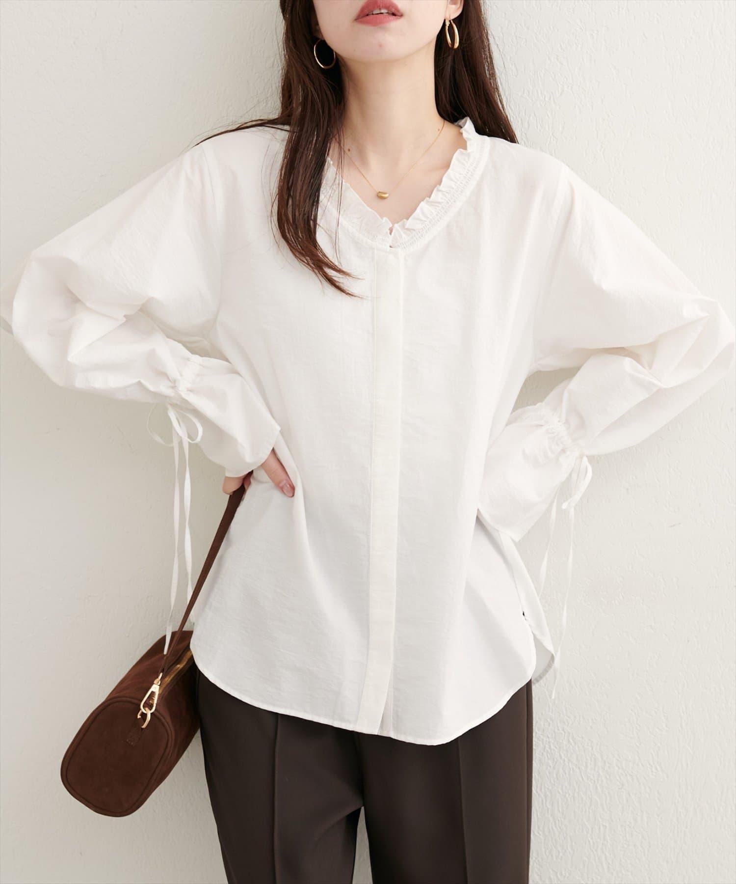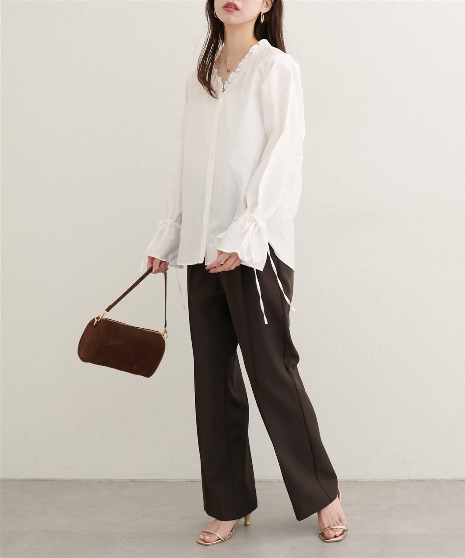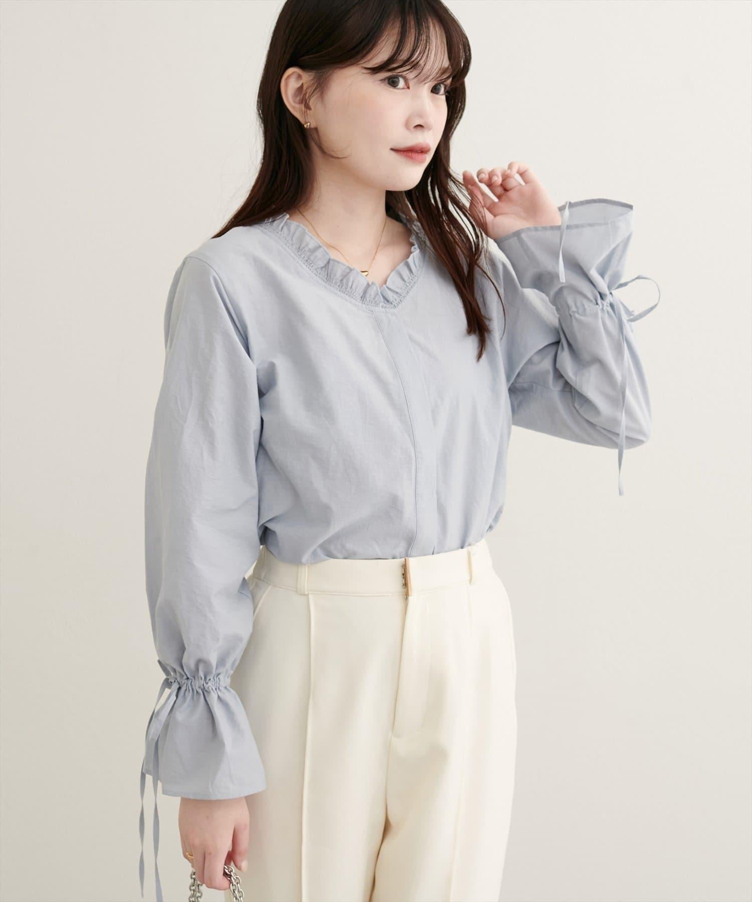 這款荷葉邊 V 領糖果袖上衣輪廓柔美,細節精緻。