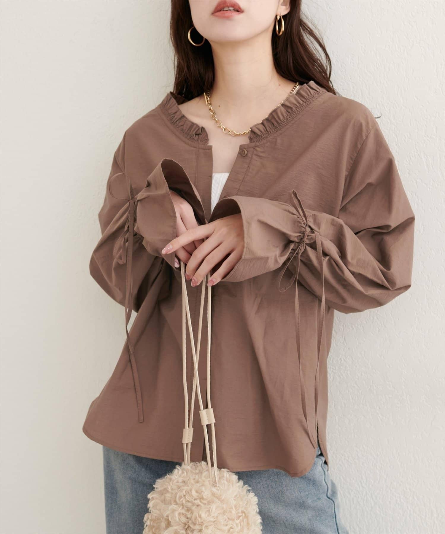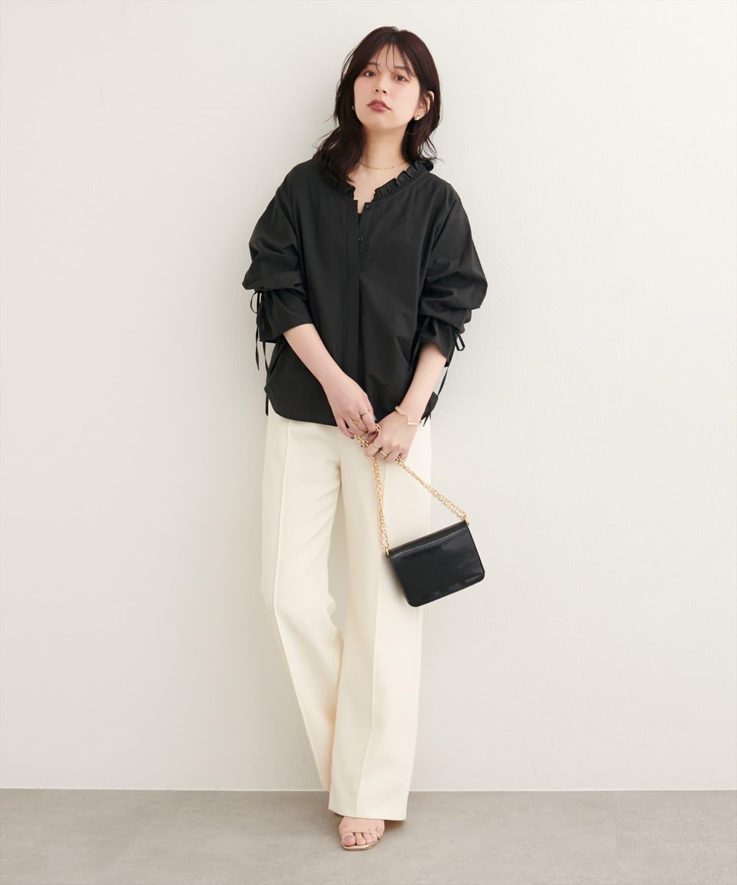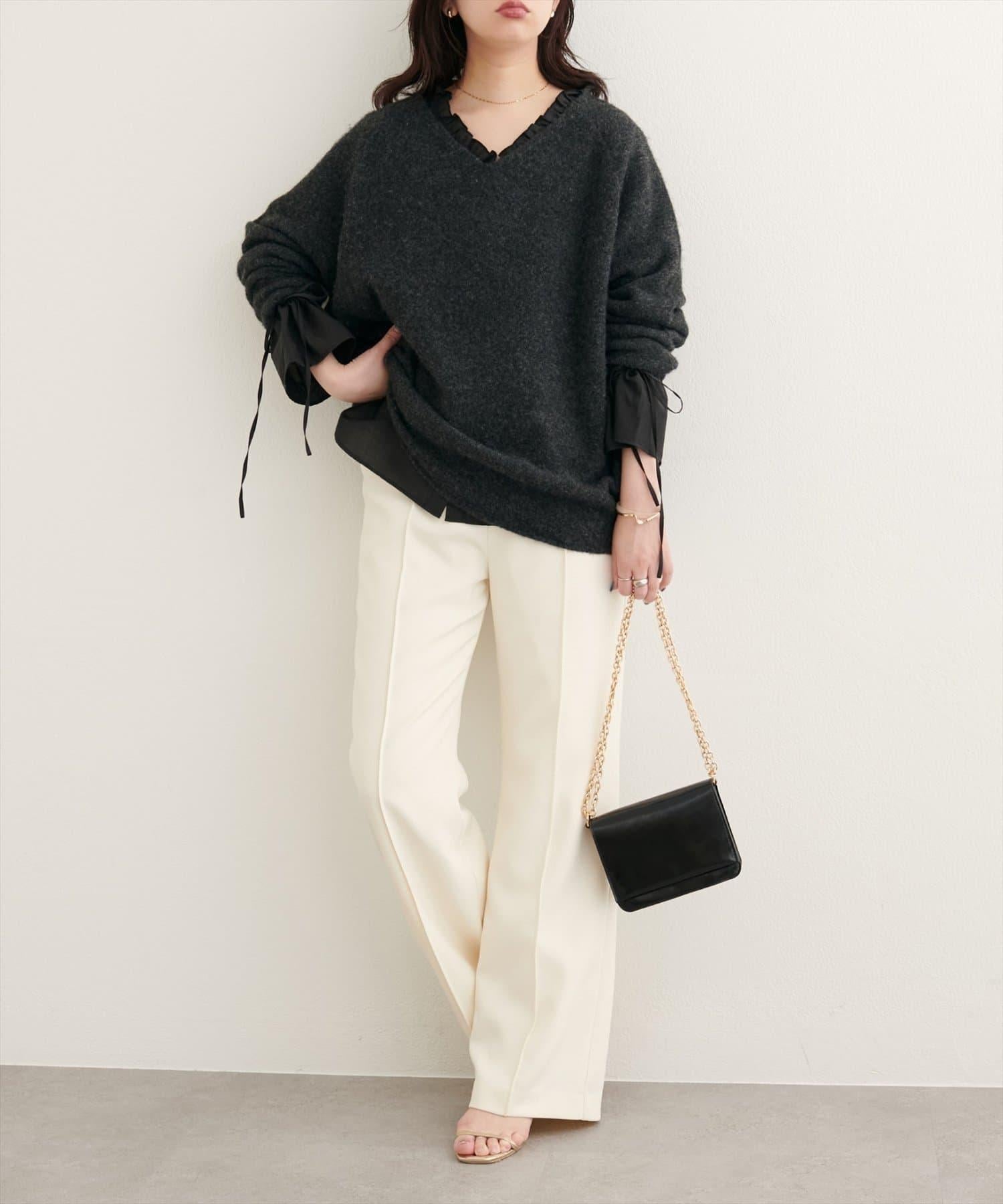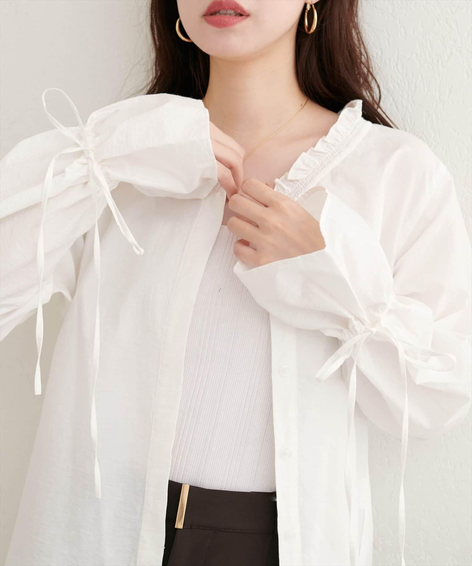 這款荷葉邊 V 領糖果袖上衣輪廓柔美,細節精緻。