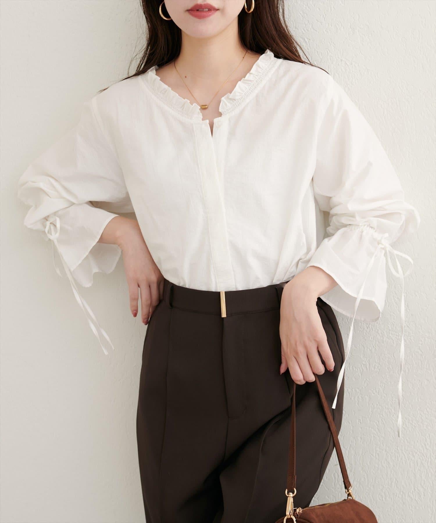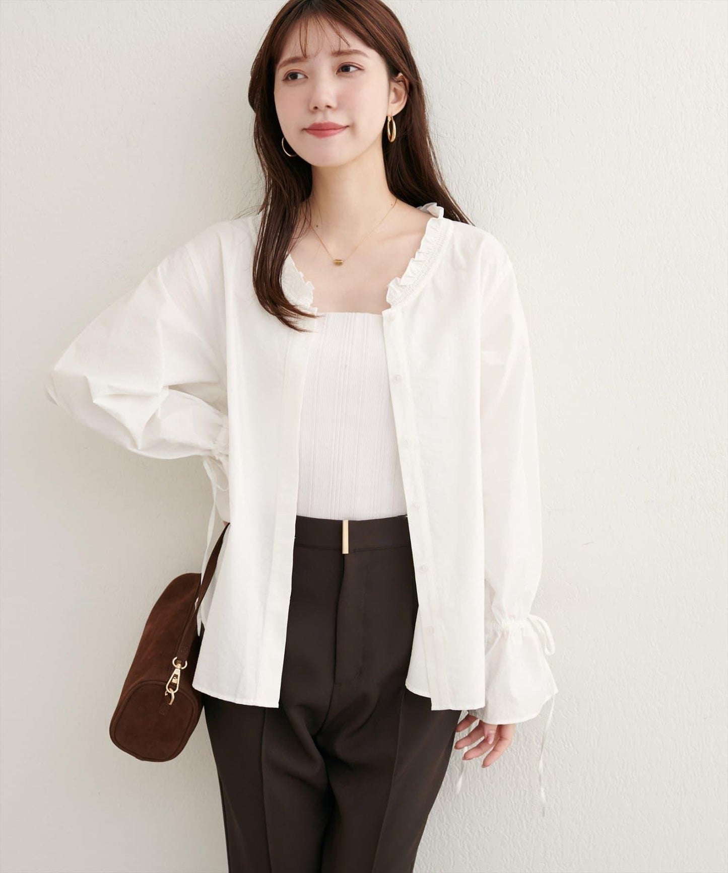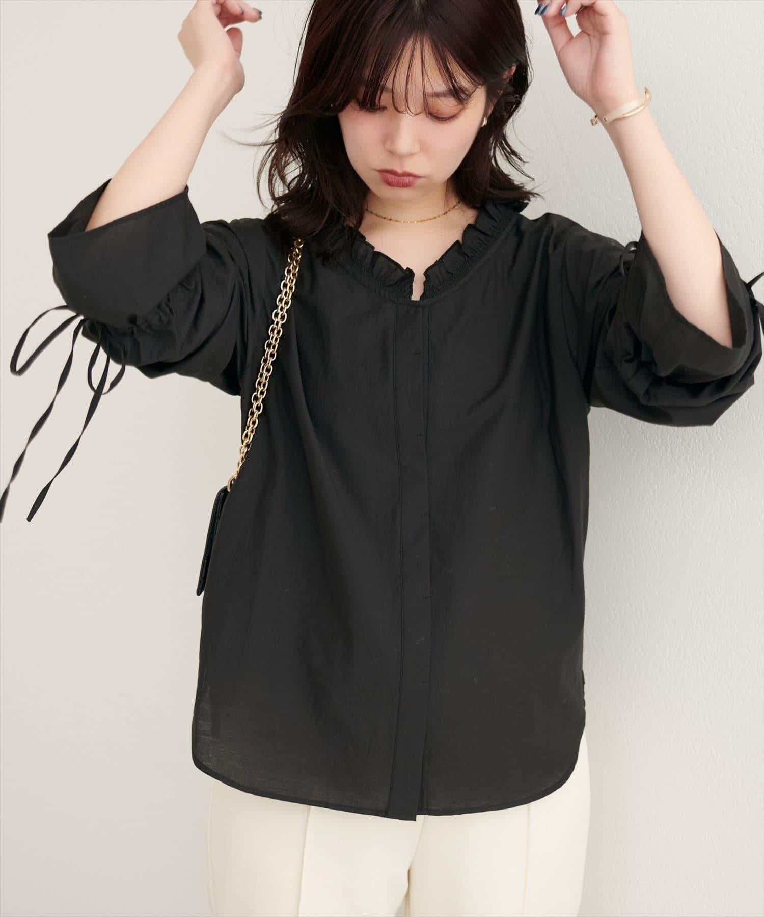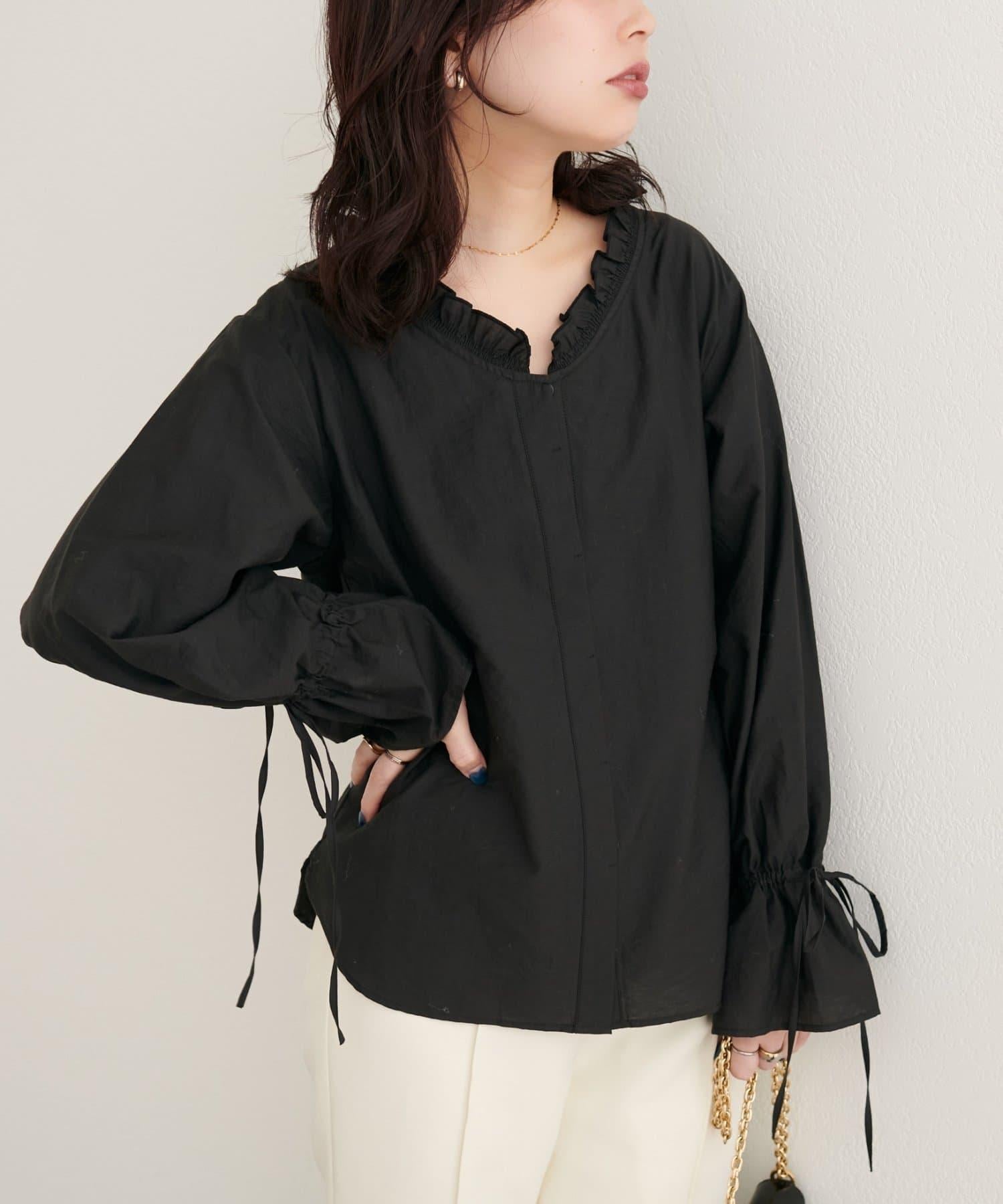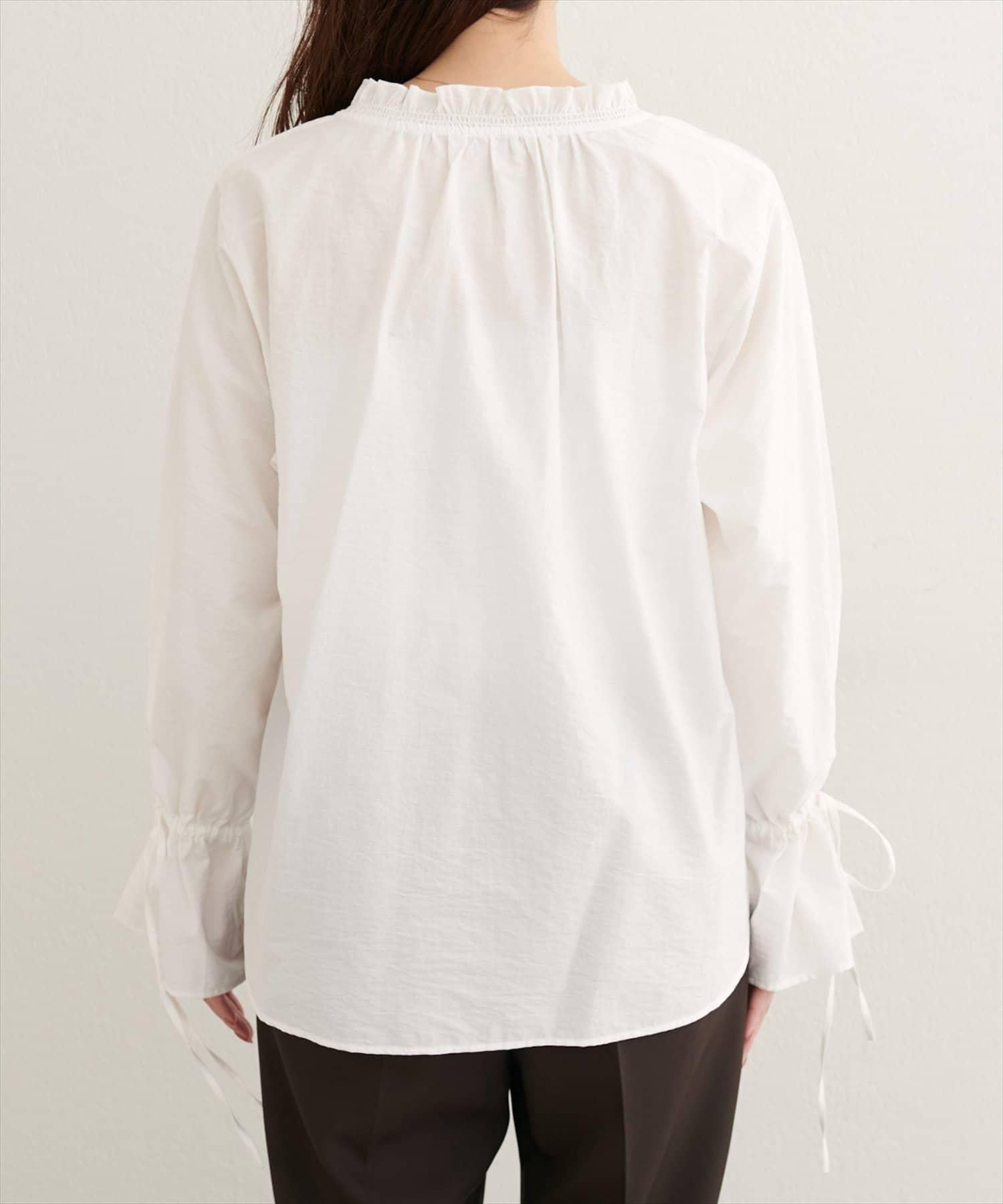 這款荷葉邊 V 領糖果袖上衣輪廓柔美,細節精緻。