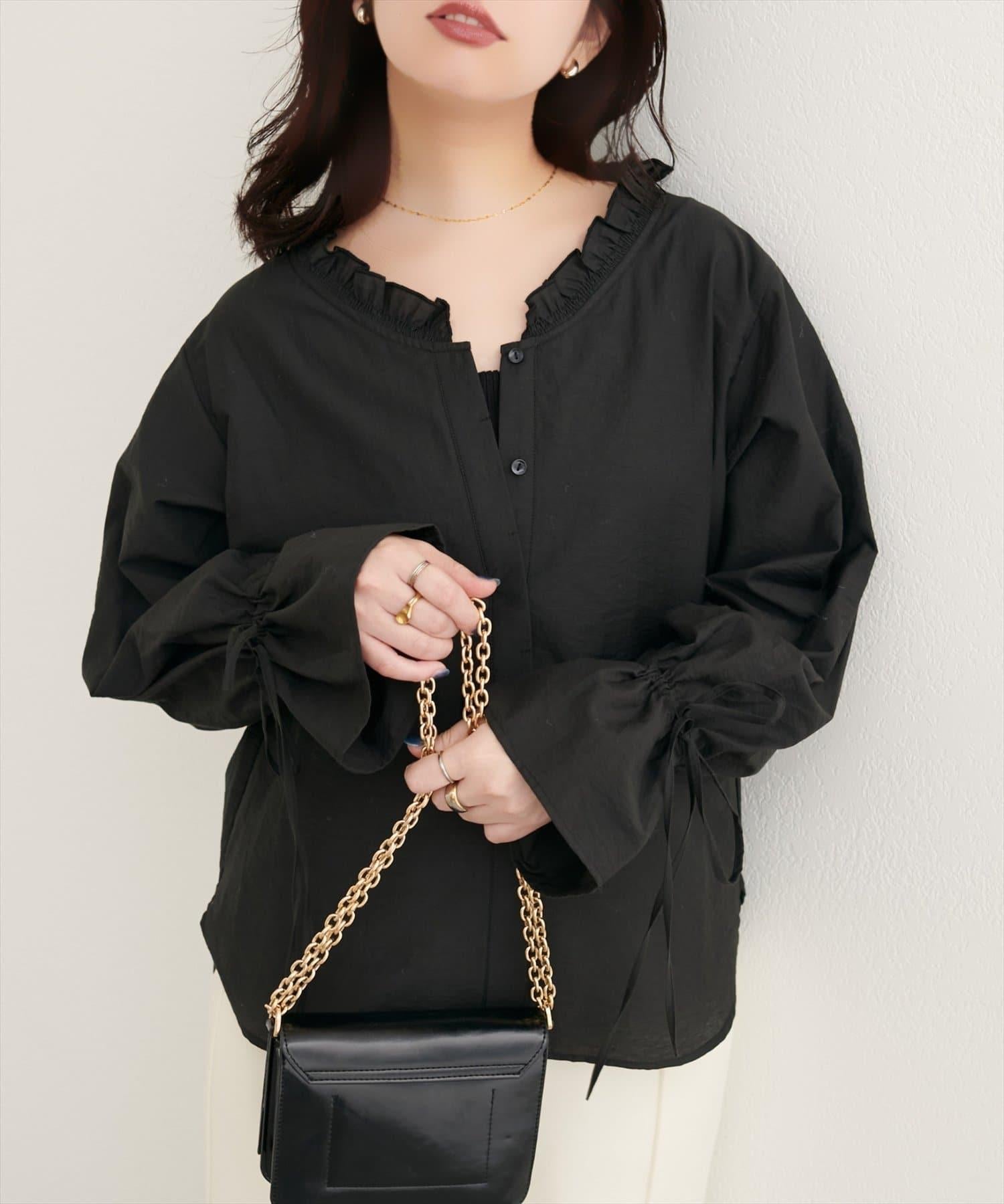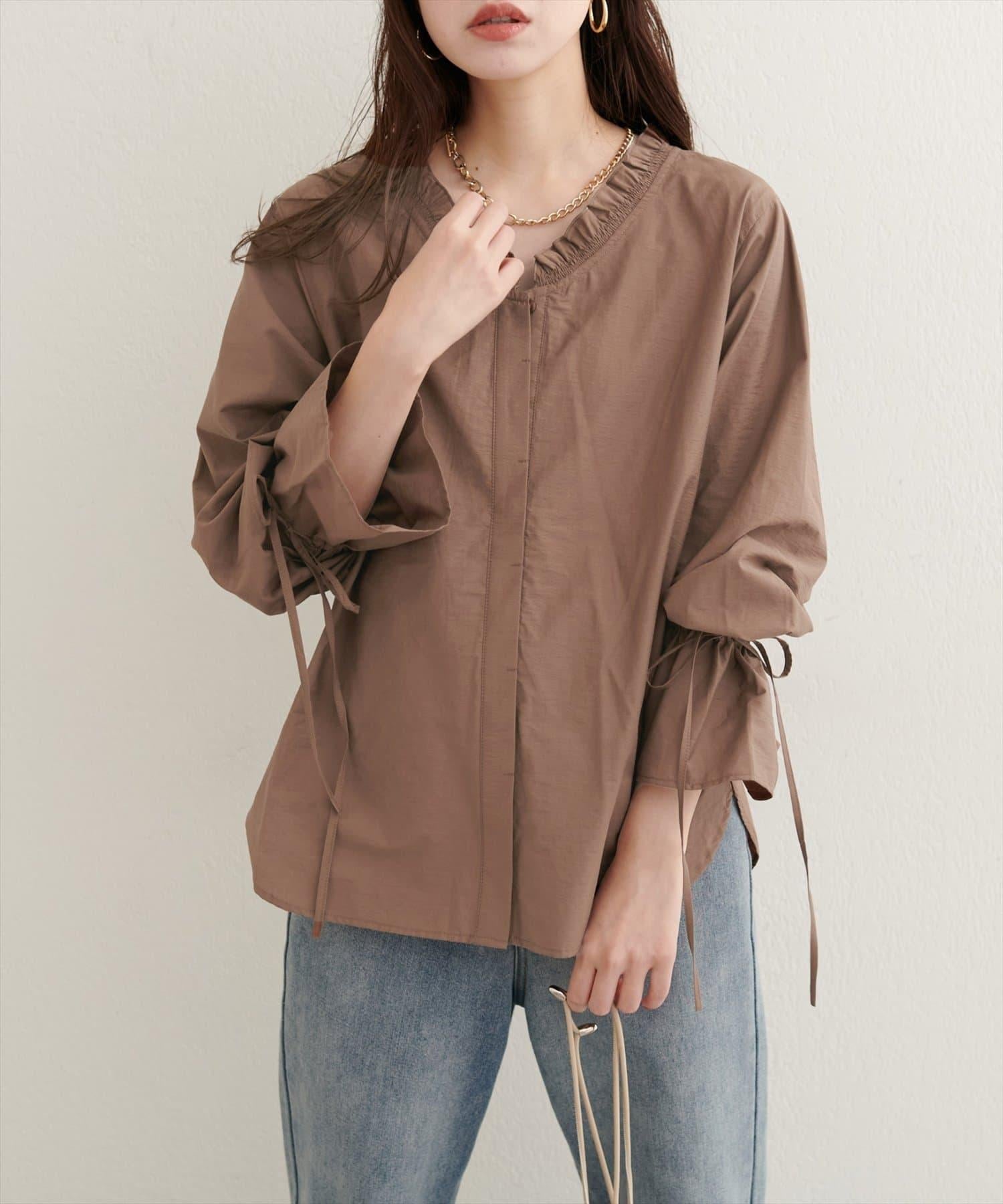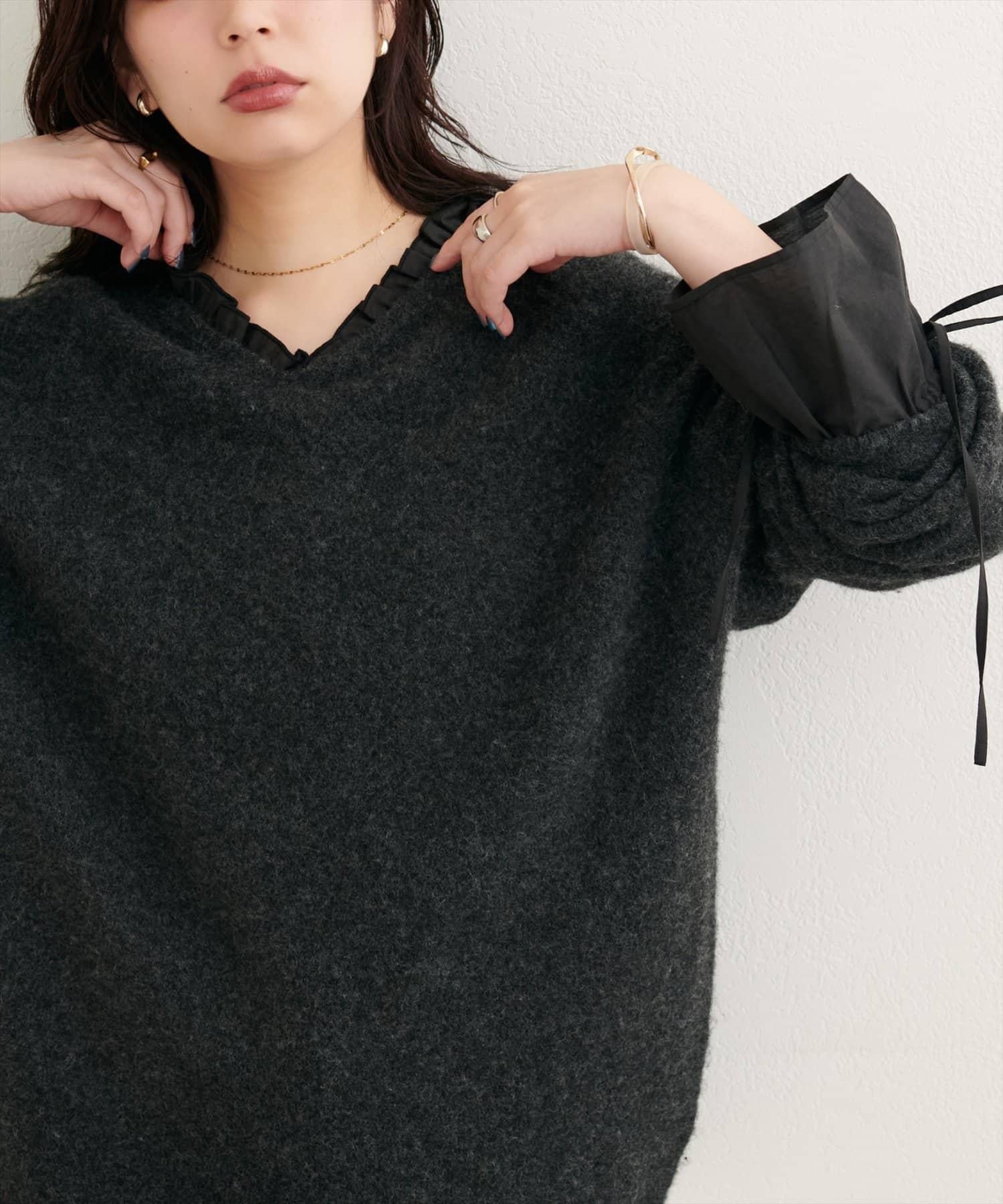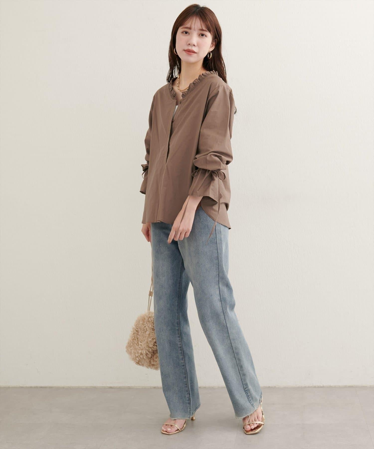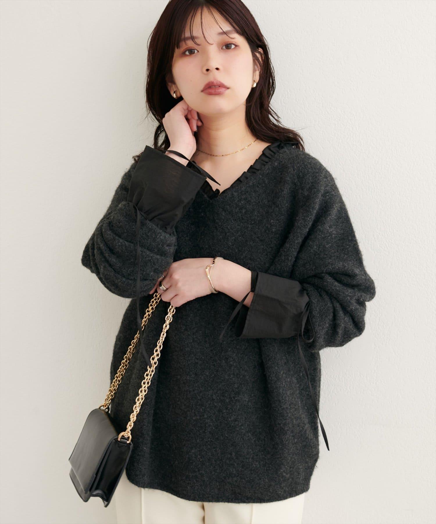 這款荷葉邊 V 領糖果袖上衣輪廓柔美,細節精緻。