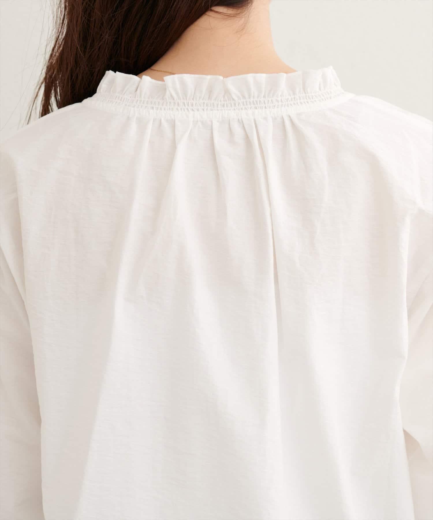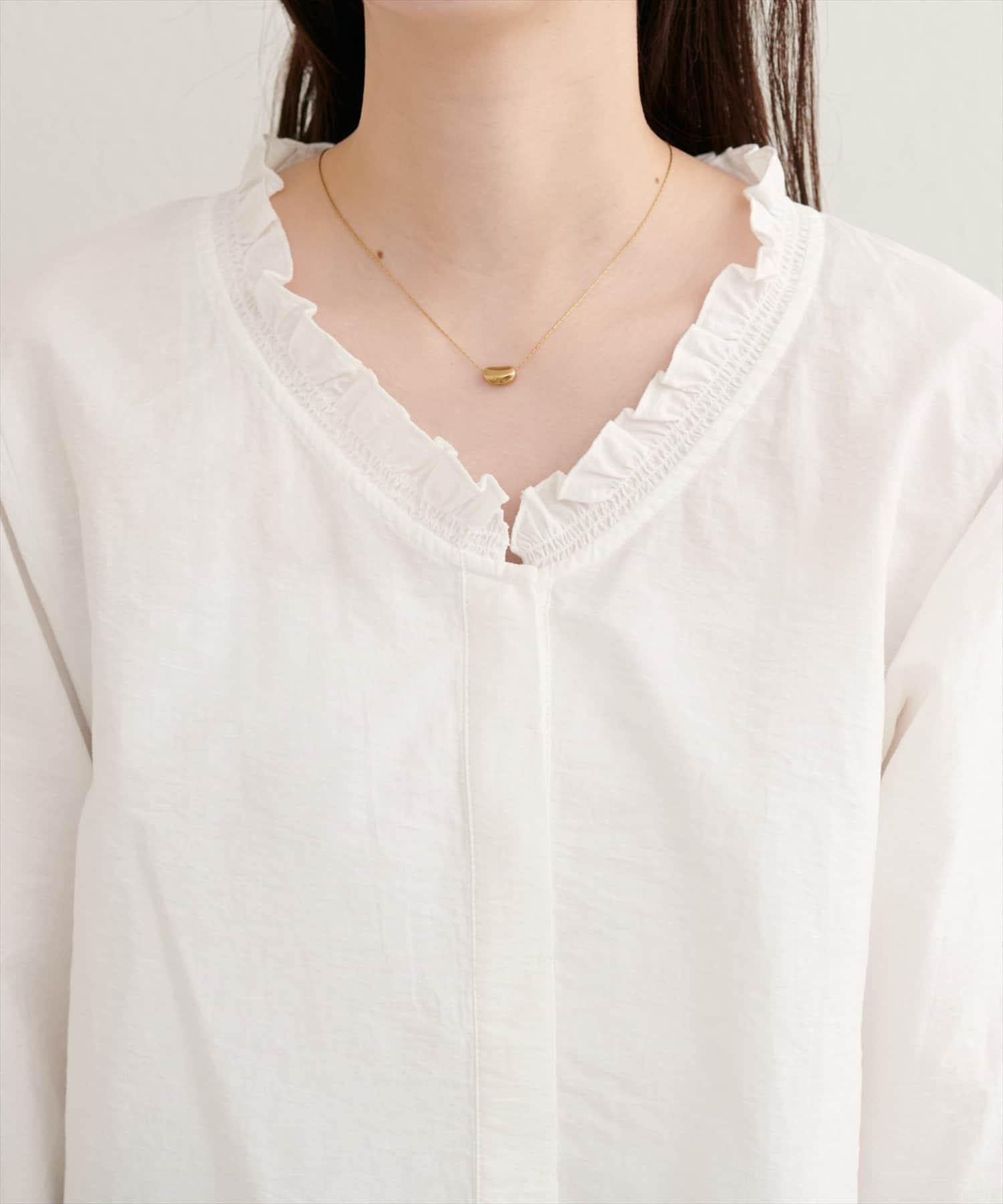 領口處的荷葉邊設計可展現肩部線條,並在臉部周圍營造出迷人的視覺效果。
