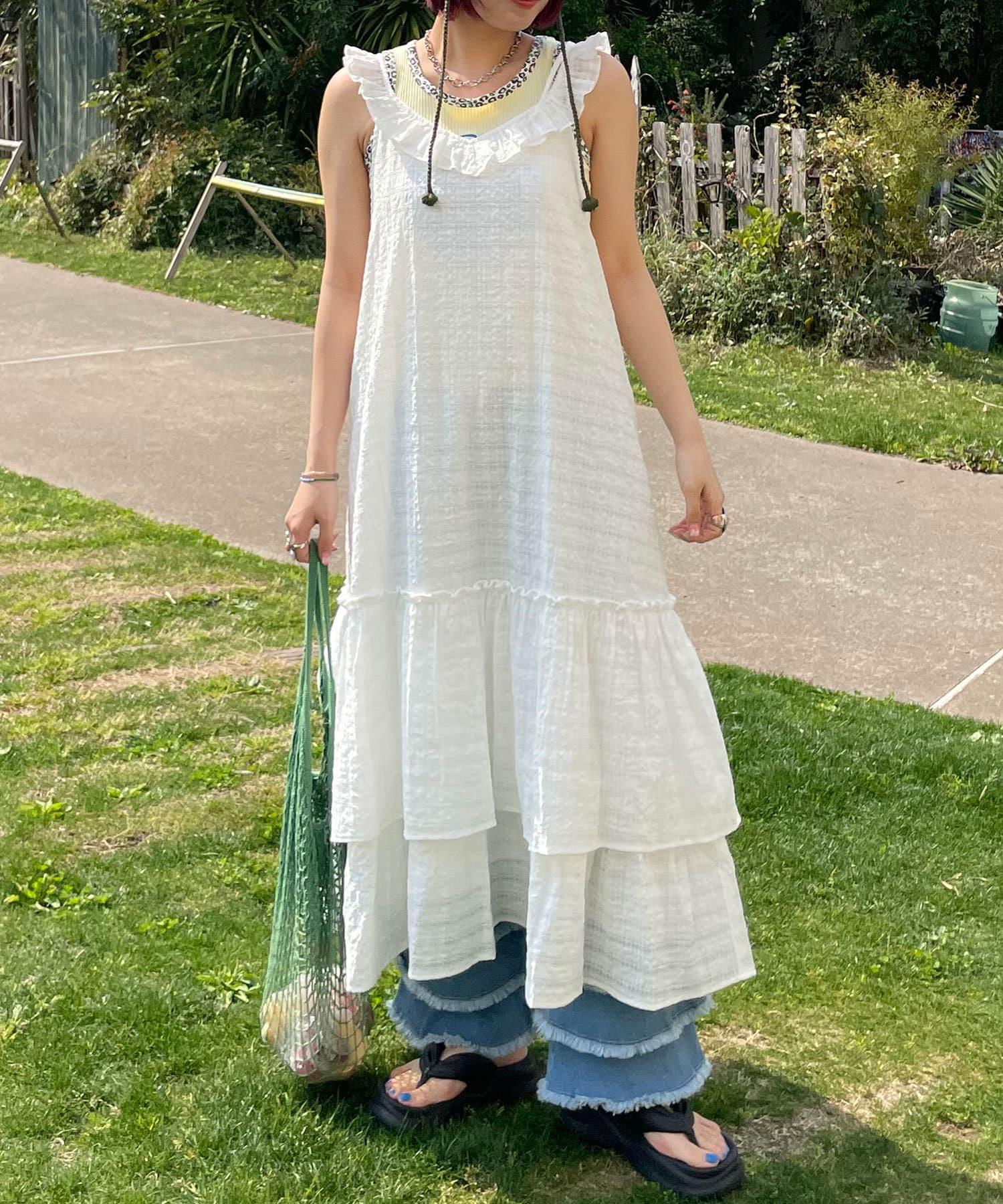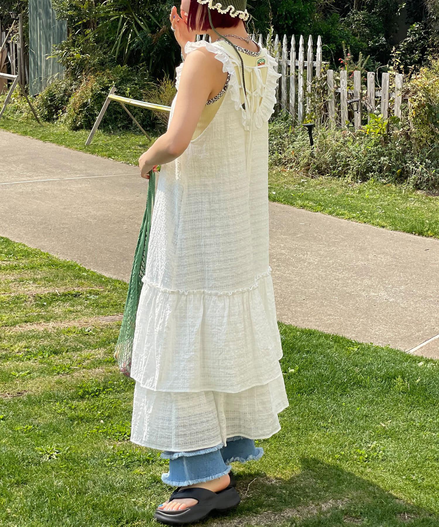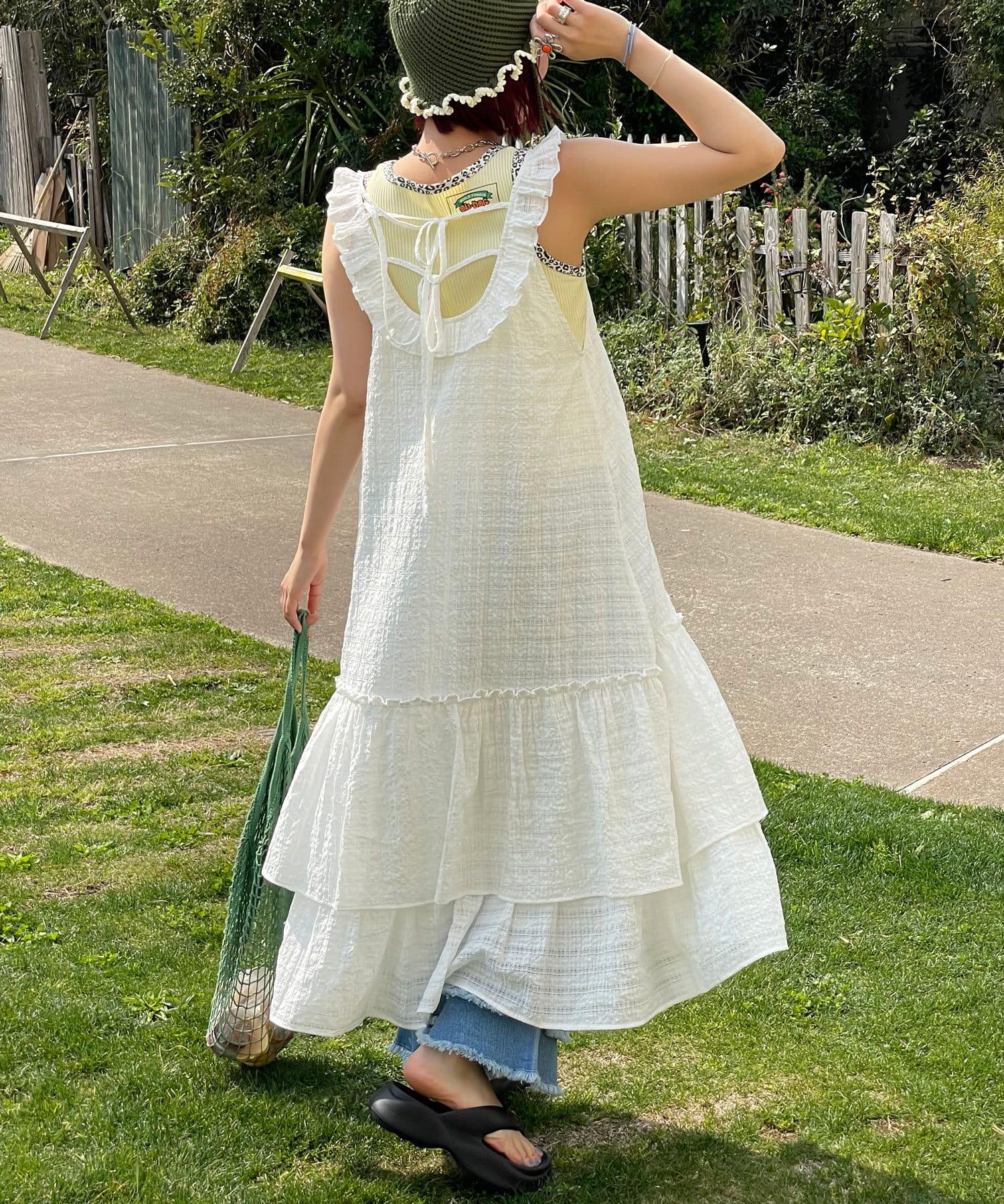 甜美的吊帶連衣裙,天然紋理面料上飾有大量流蘇。