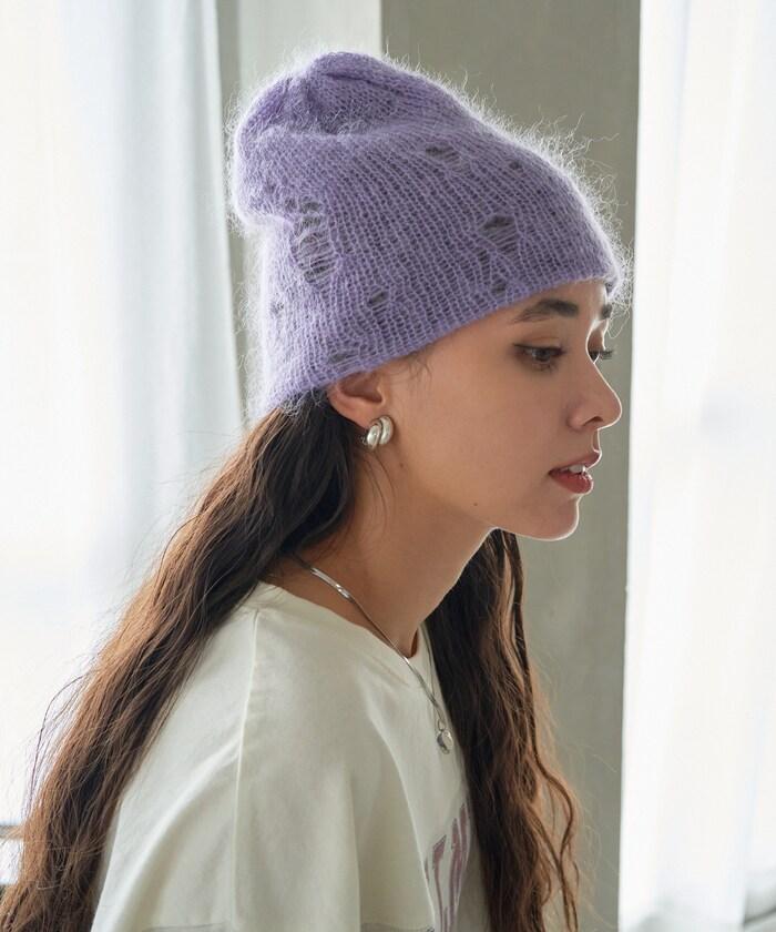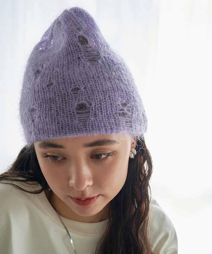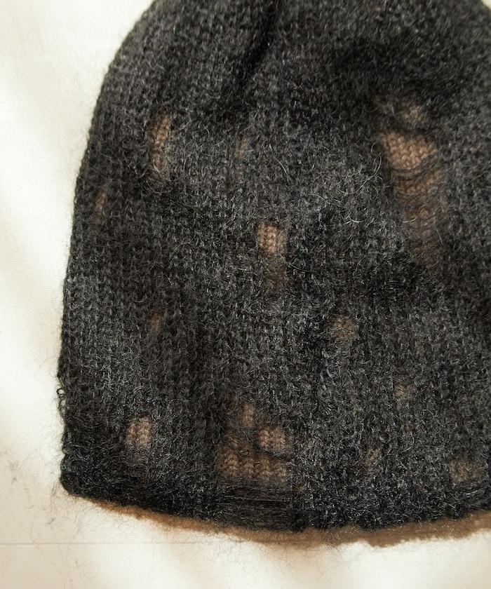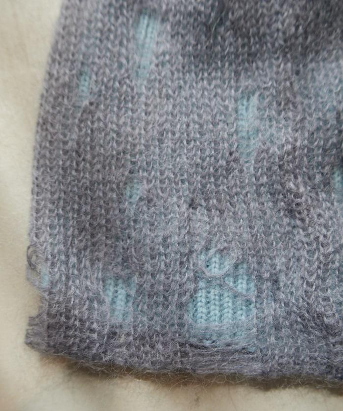 正面由蓬鬆的馬海毛紗線製成,具有拉絲感,並已損壞。