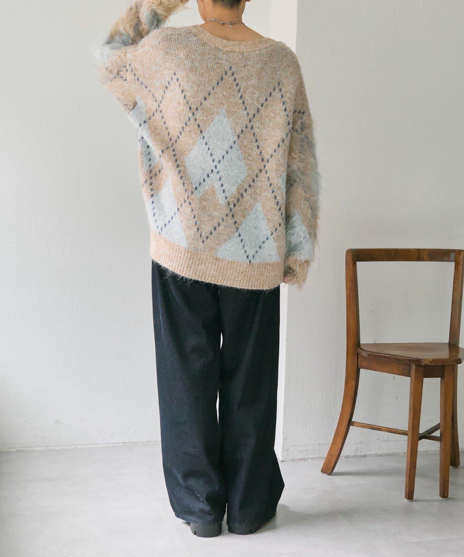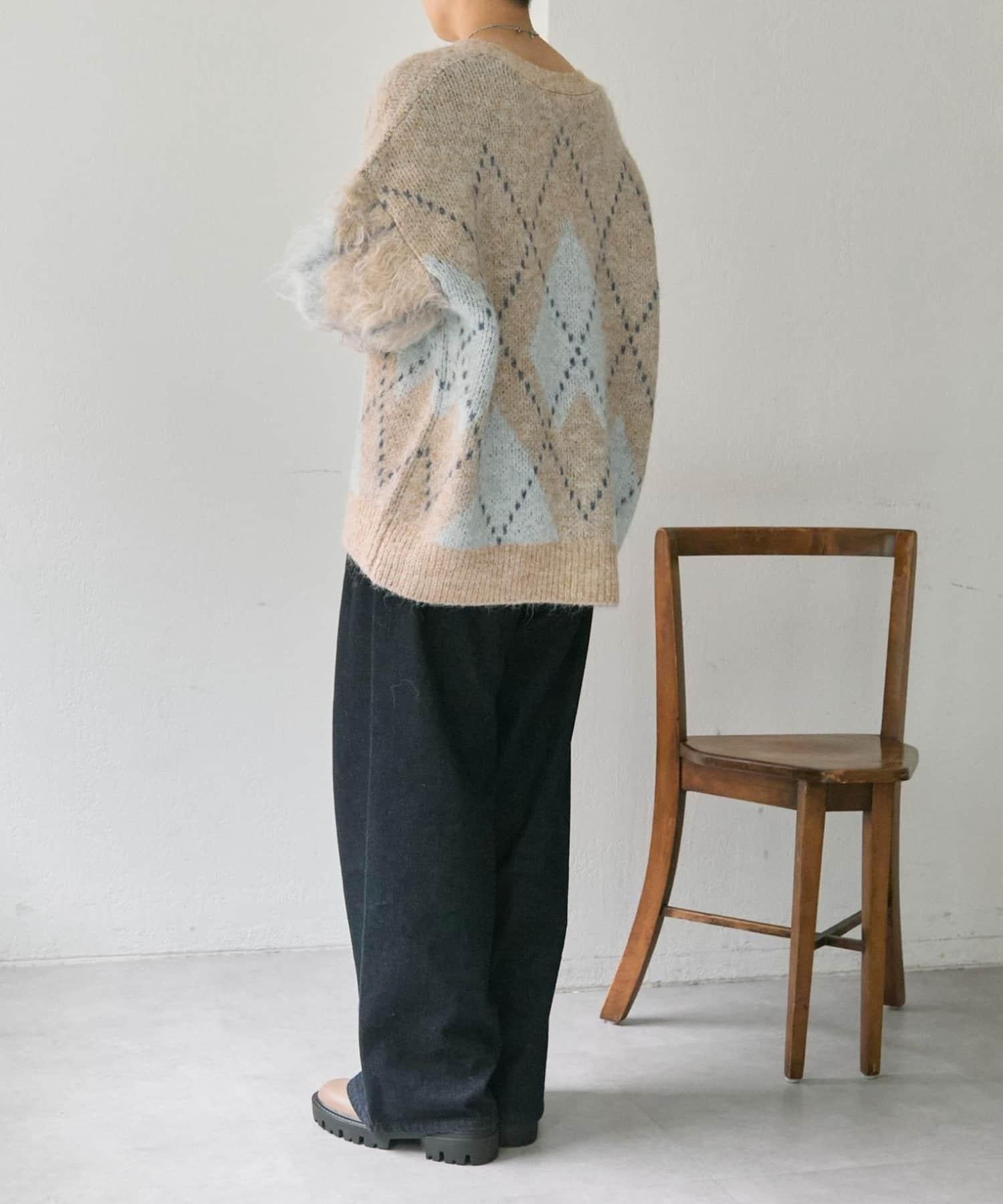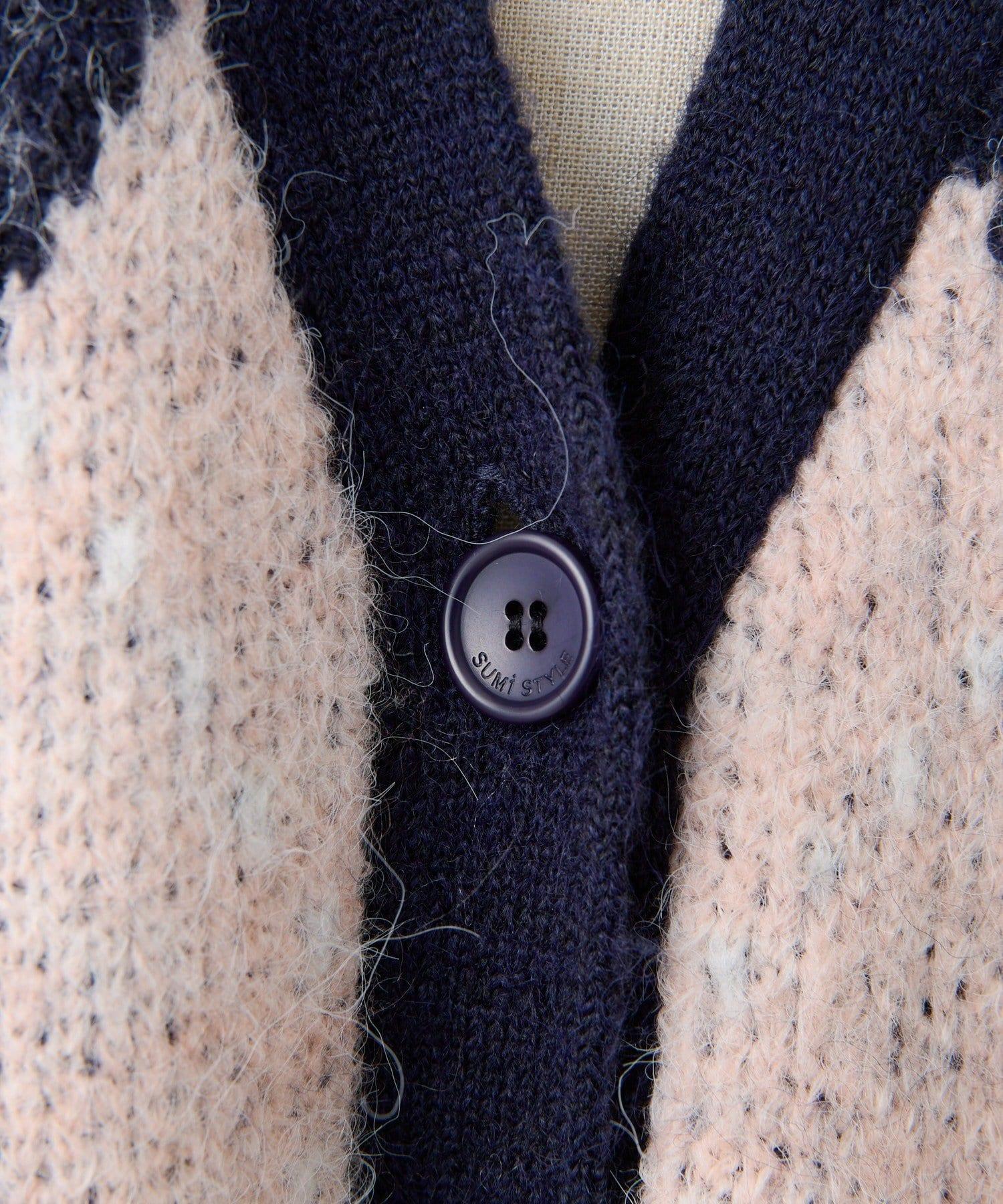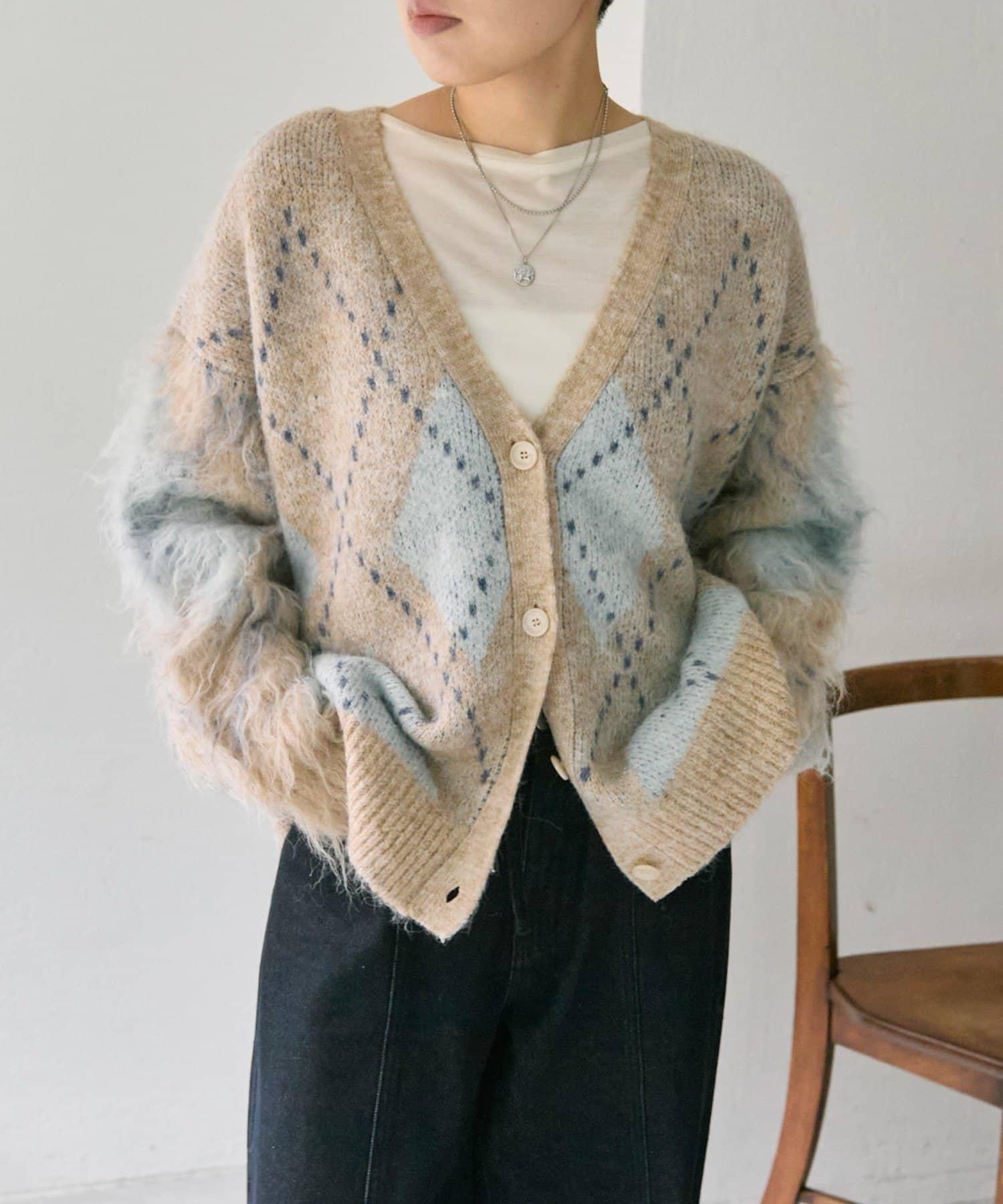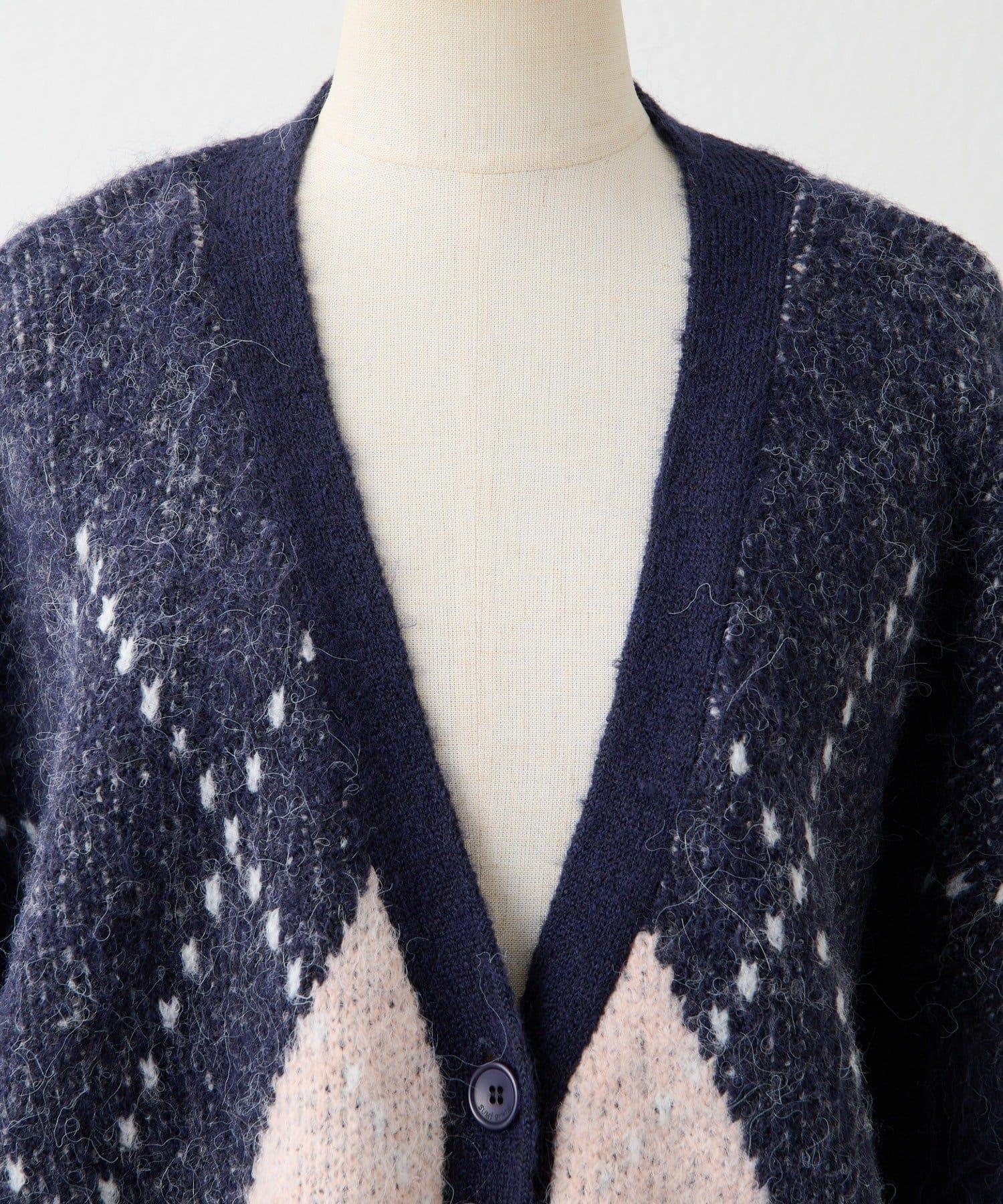 這款針織開衫帶有大面積的菱形圖案,引人注目,營造出一種季節氛圍。