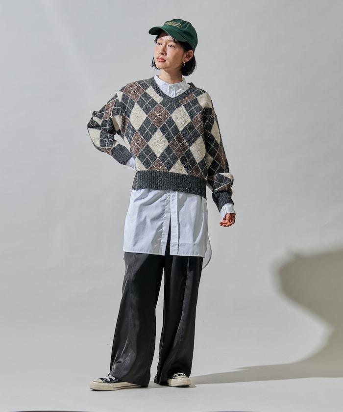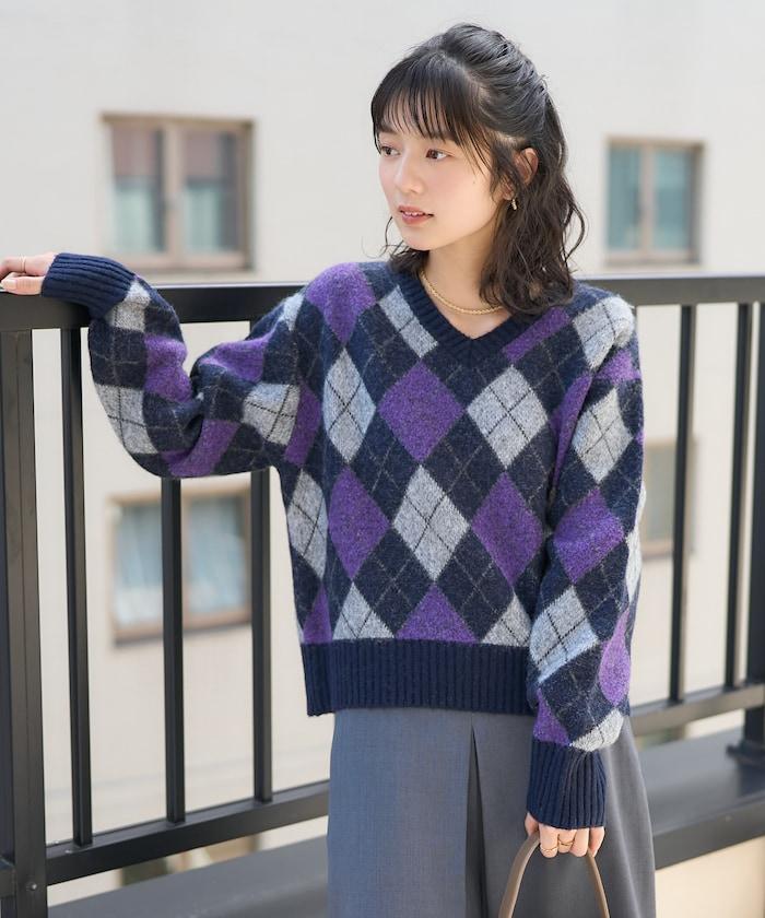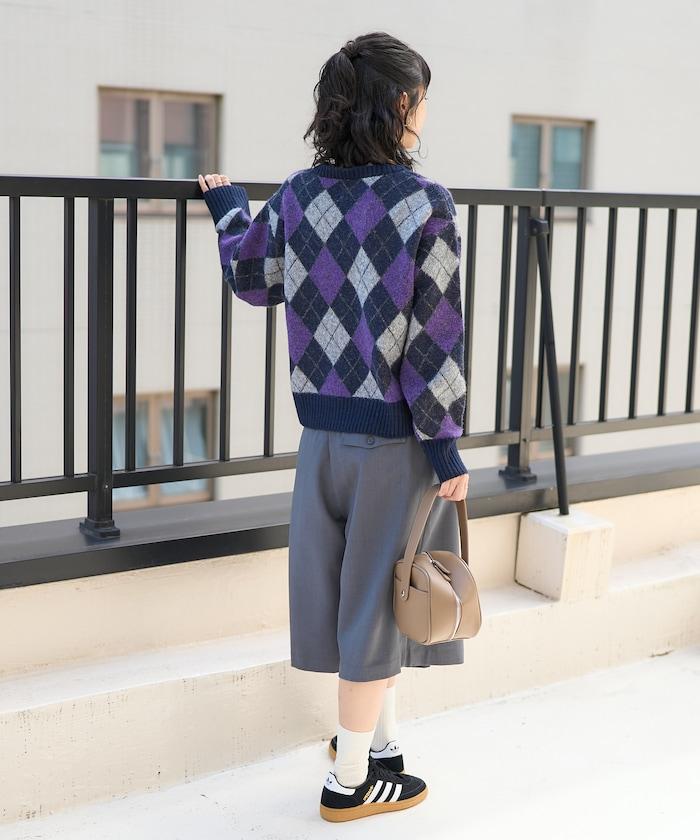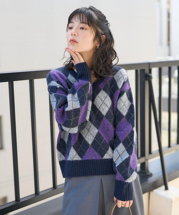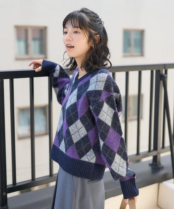 菱格紋針織衫,深沉的色彩營造出本季的氛圍。