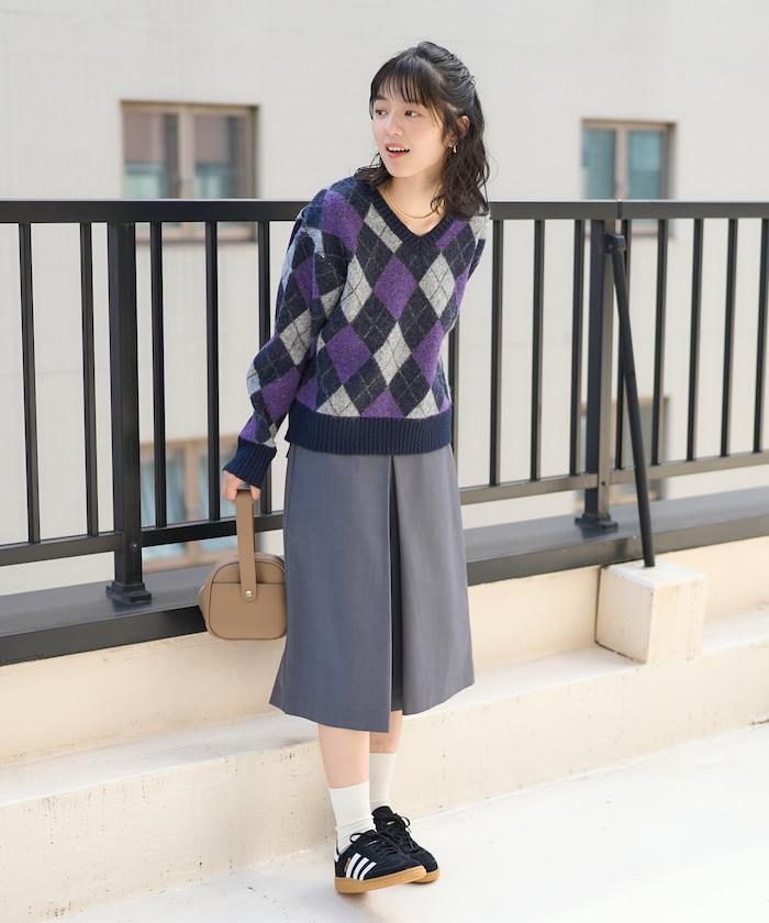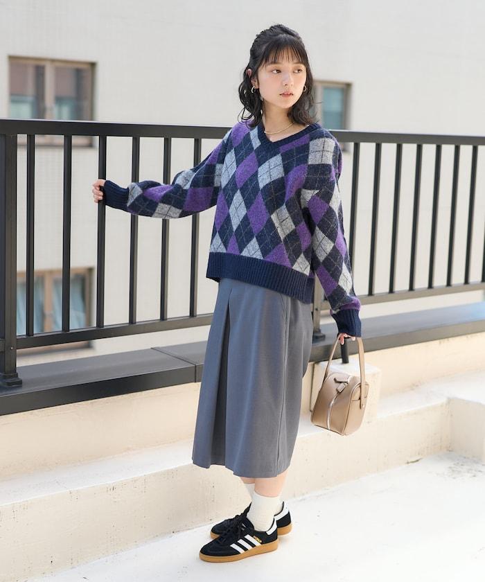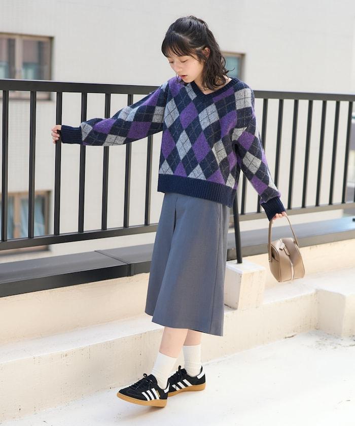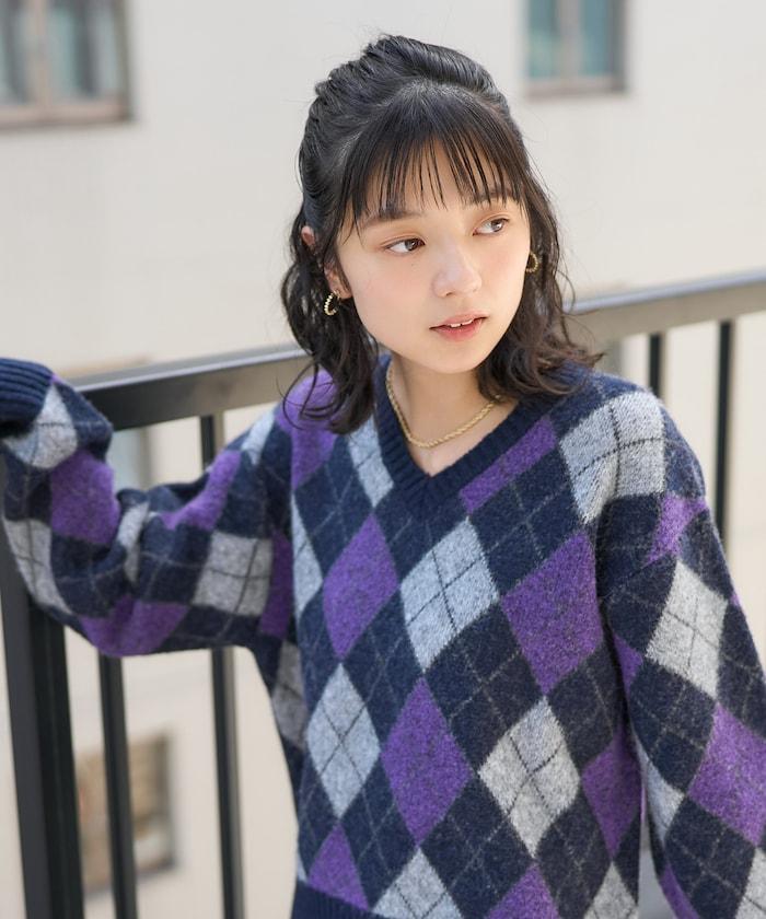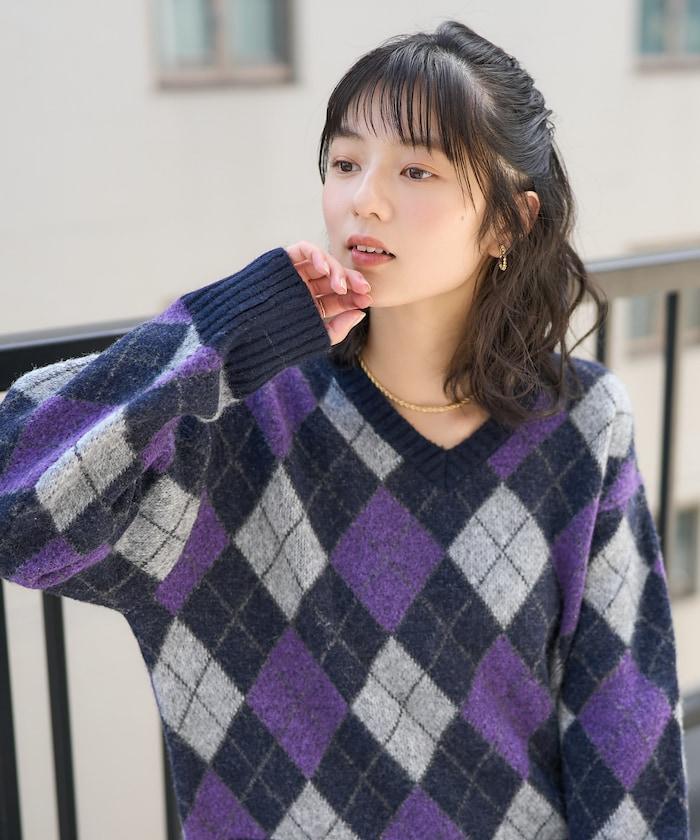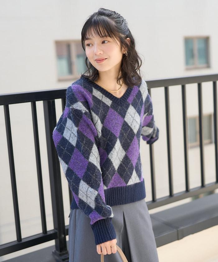 菱格紋針織衫,深沉的色彩營造出本季的氛圍。