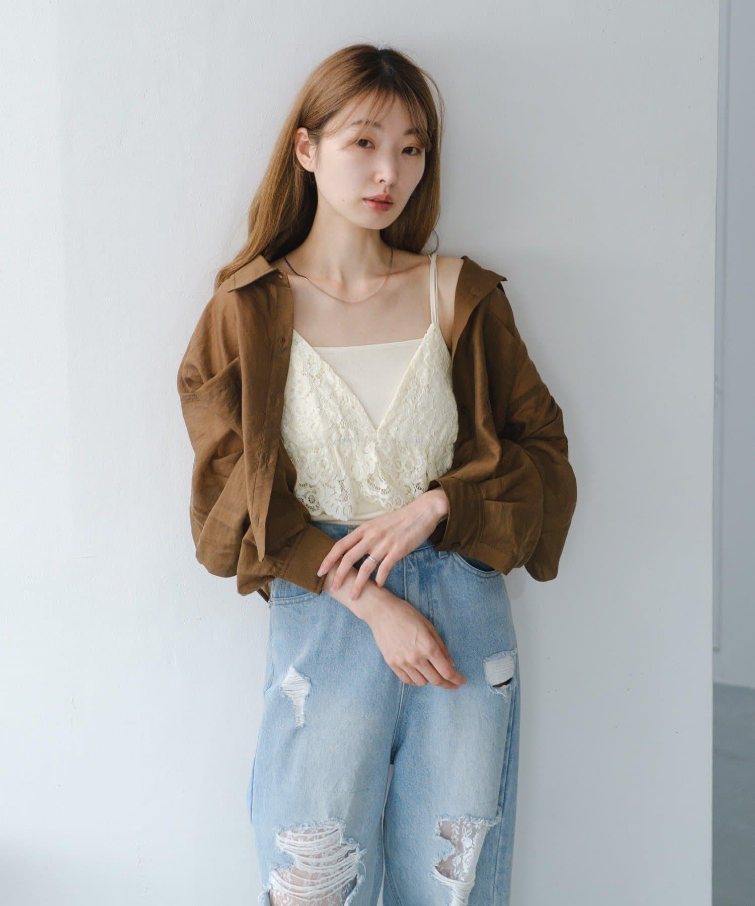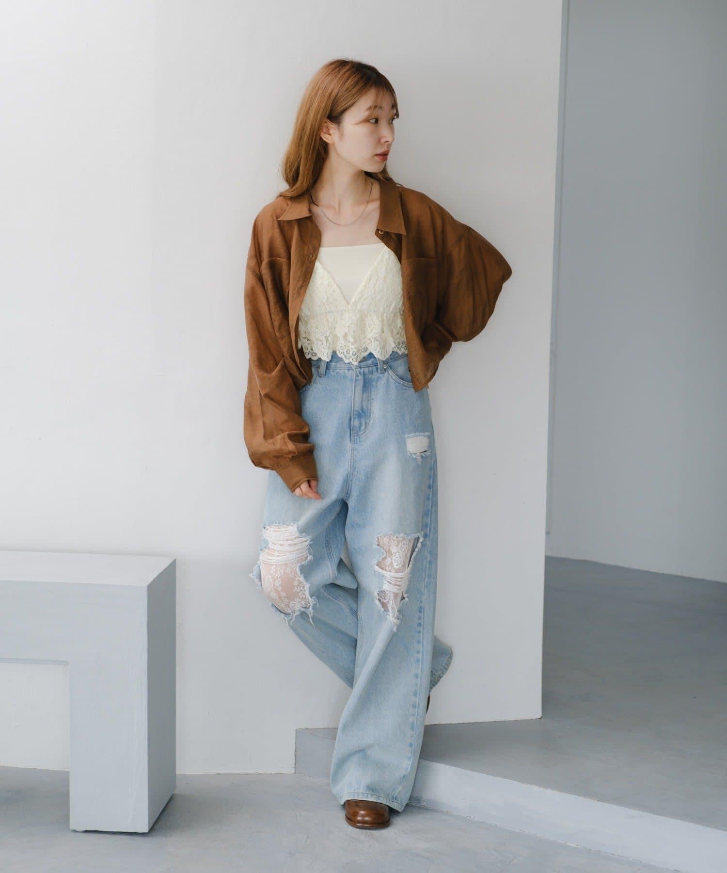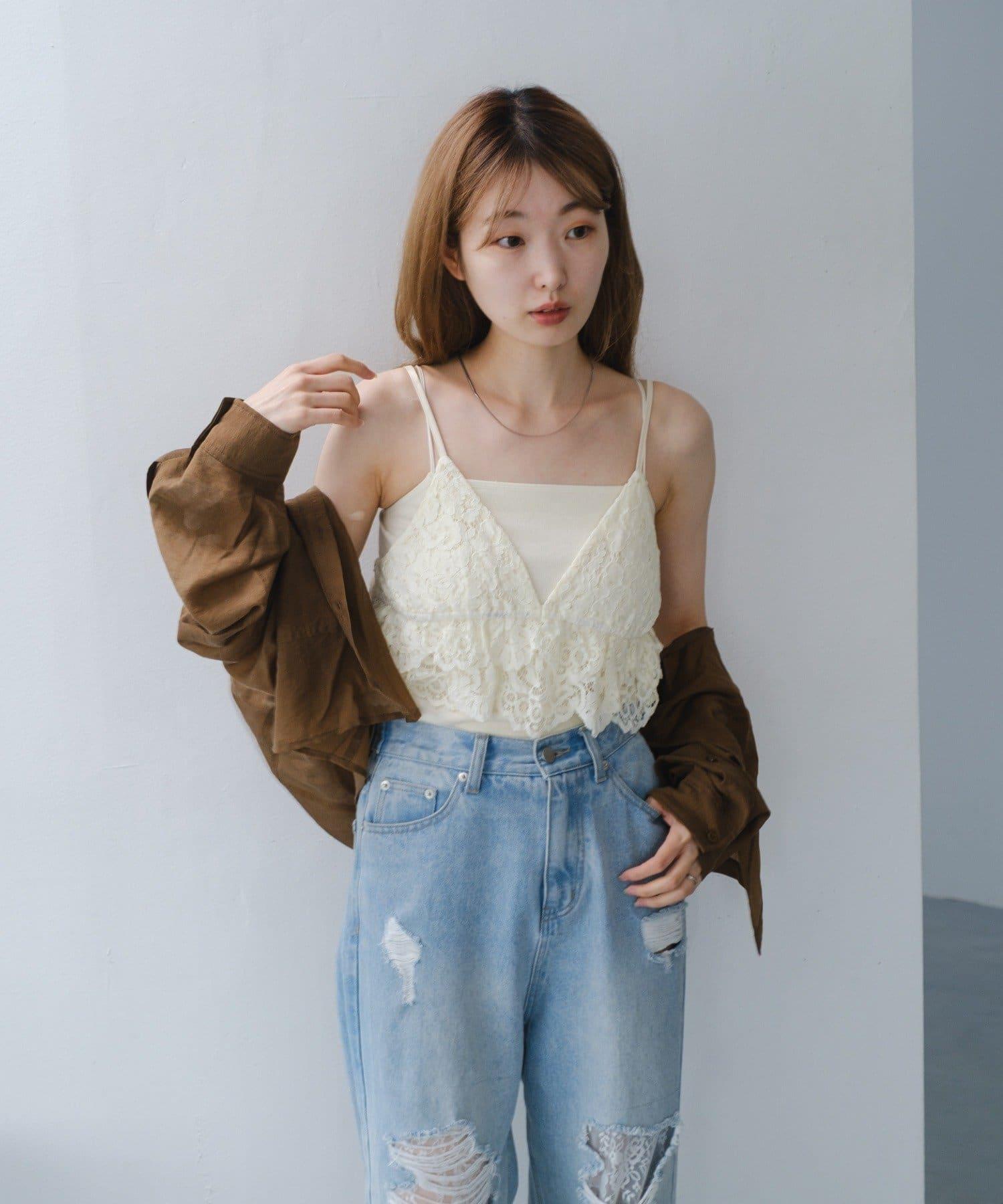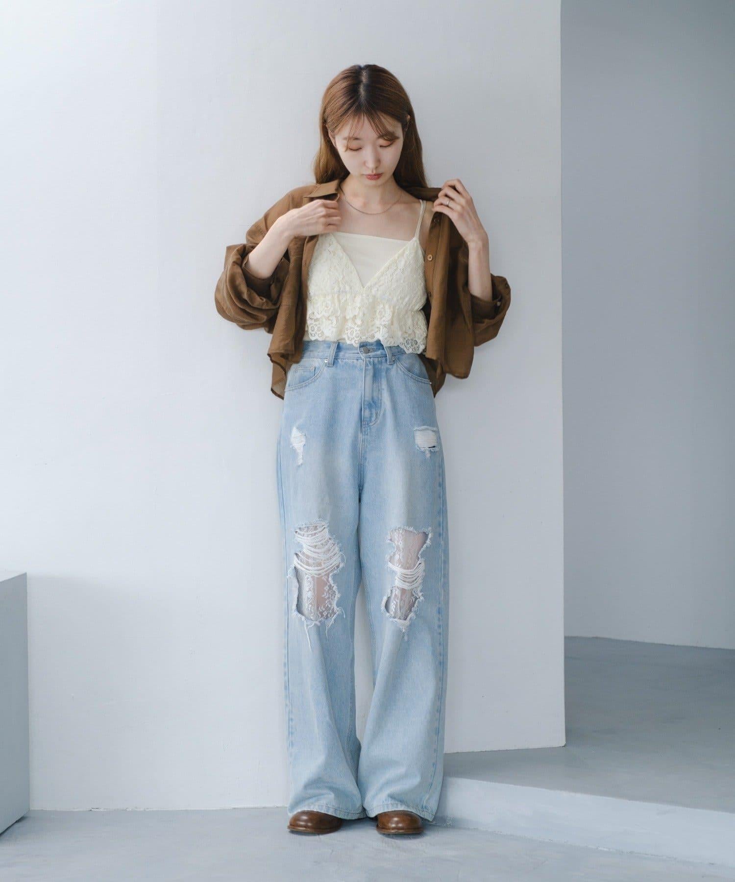 蕾絲的甜美搭配牛仔褲,適度休閒。