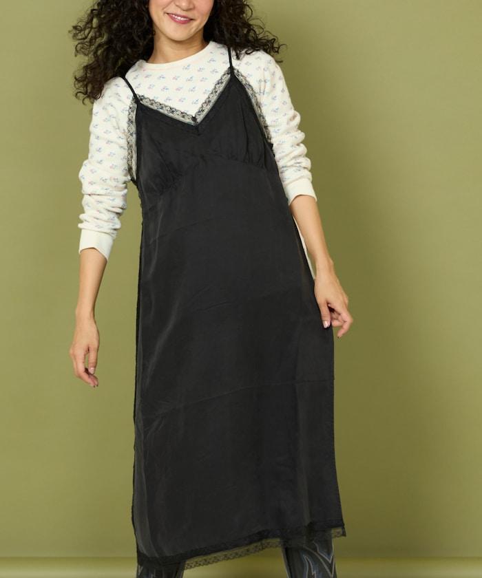 當這款連衣裙疊穿在男裝風格的牛仔褲或休閒燈芯絨打底褲上時,因為融入了淑女的細節,所以有一種精緻的混合味道。