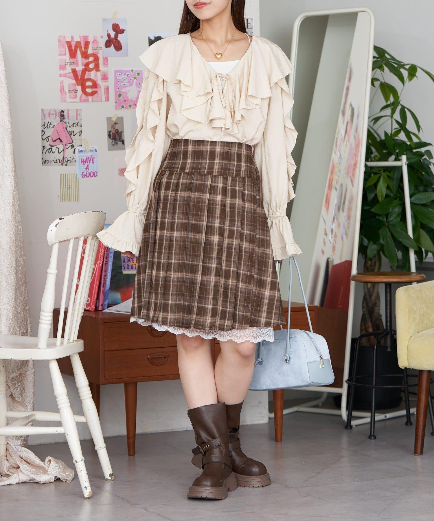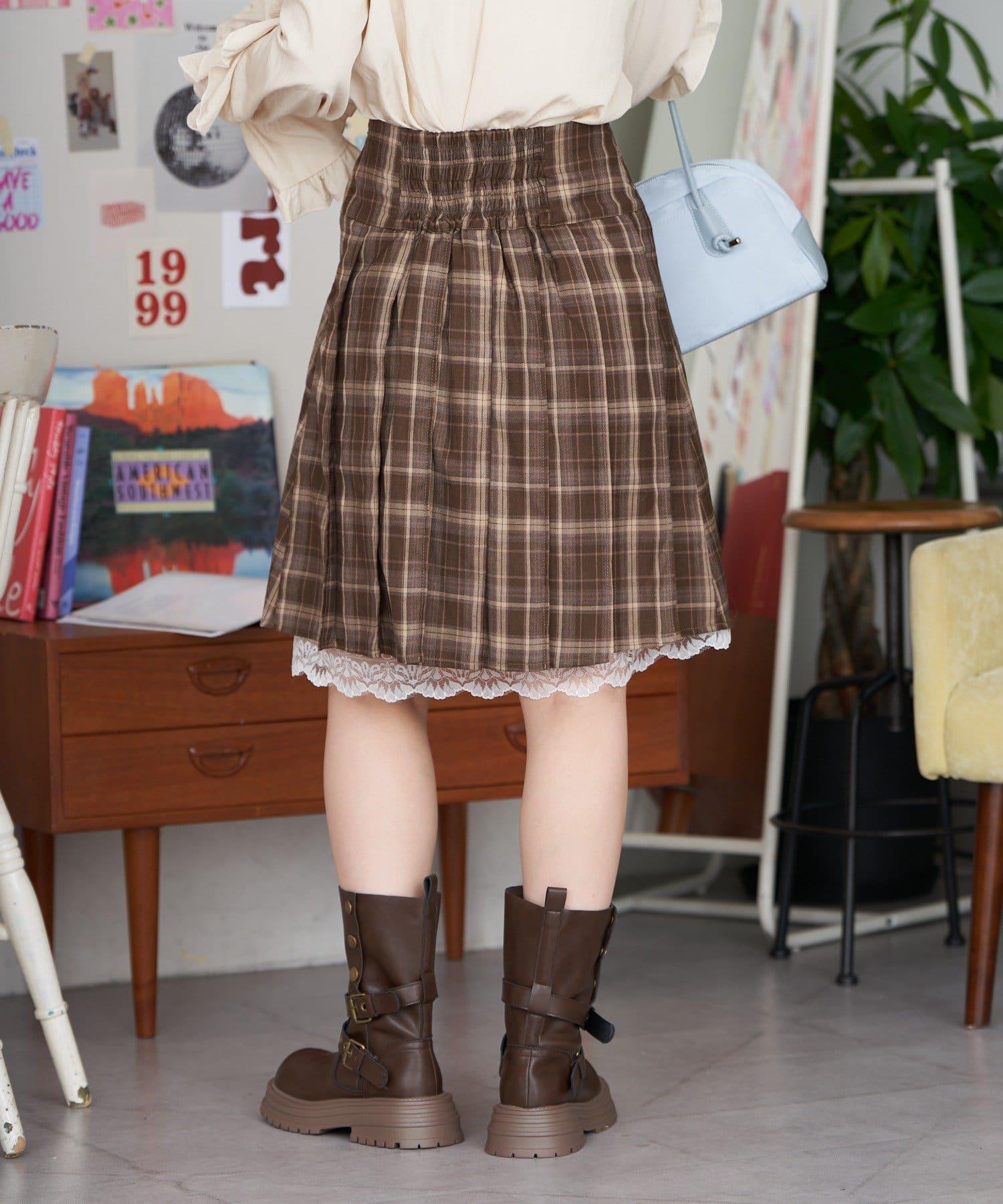 格紋百褶裙,下襬飾有蕾絲花邊,集華麗與優雅於一身。