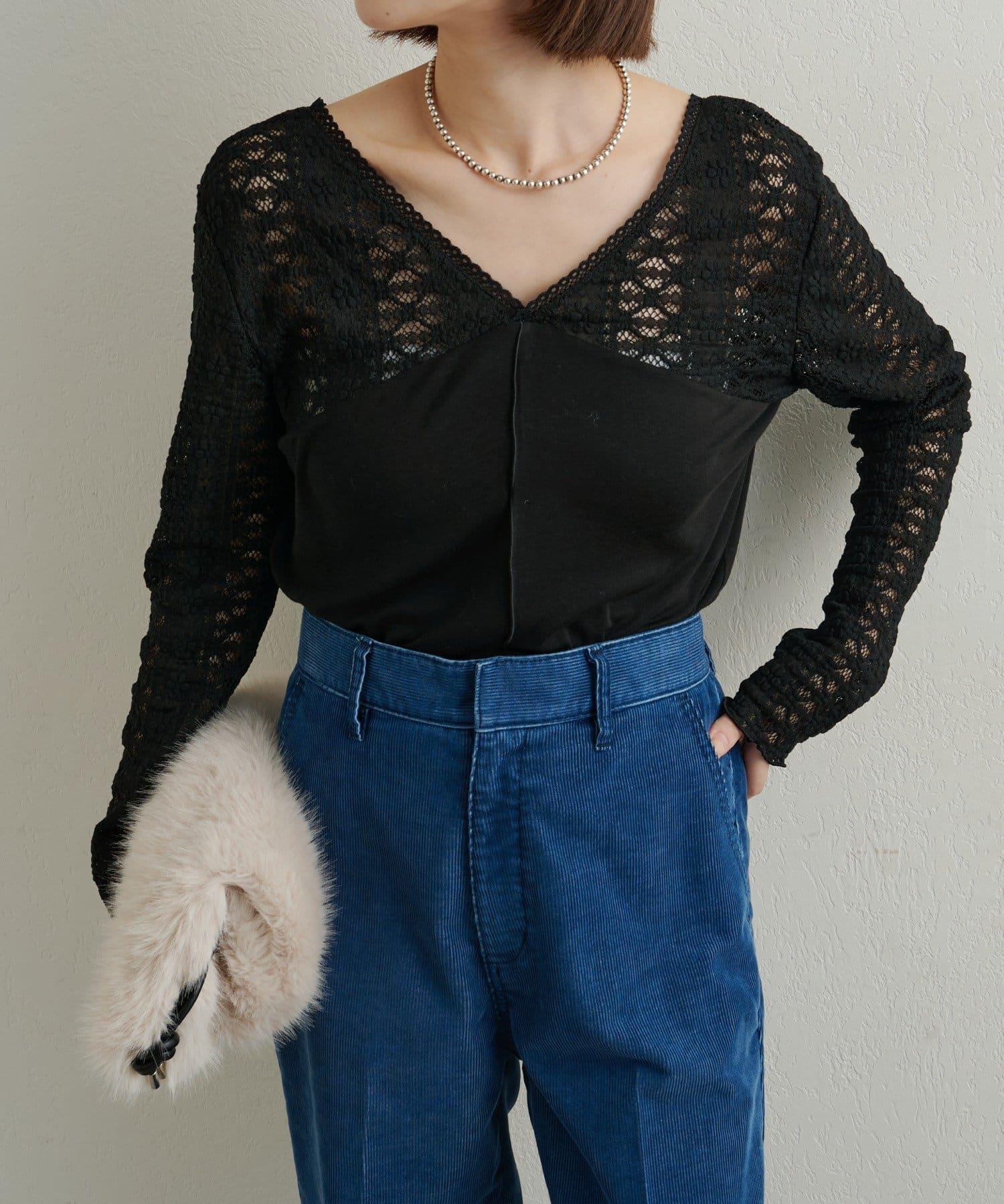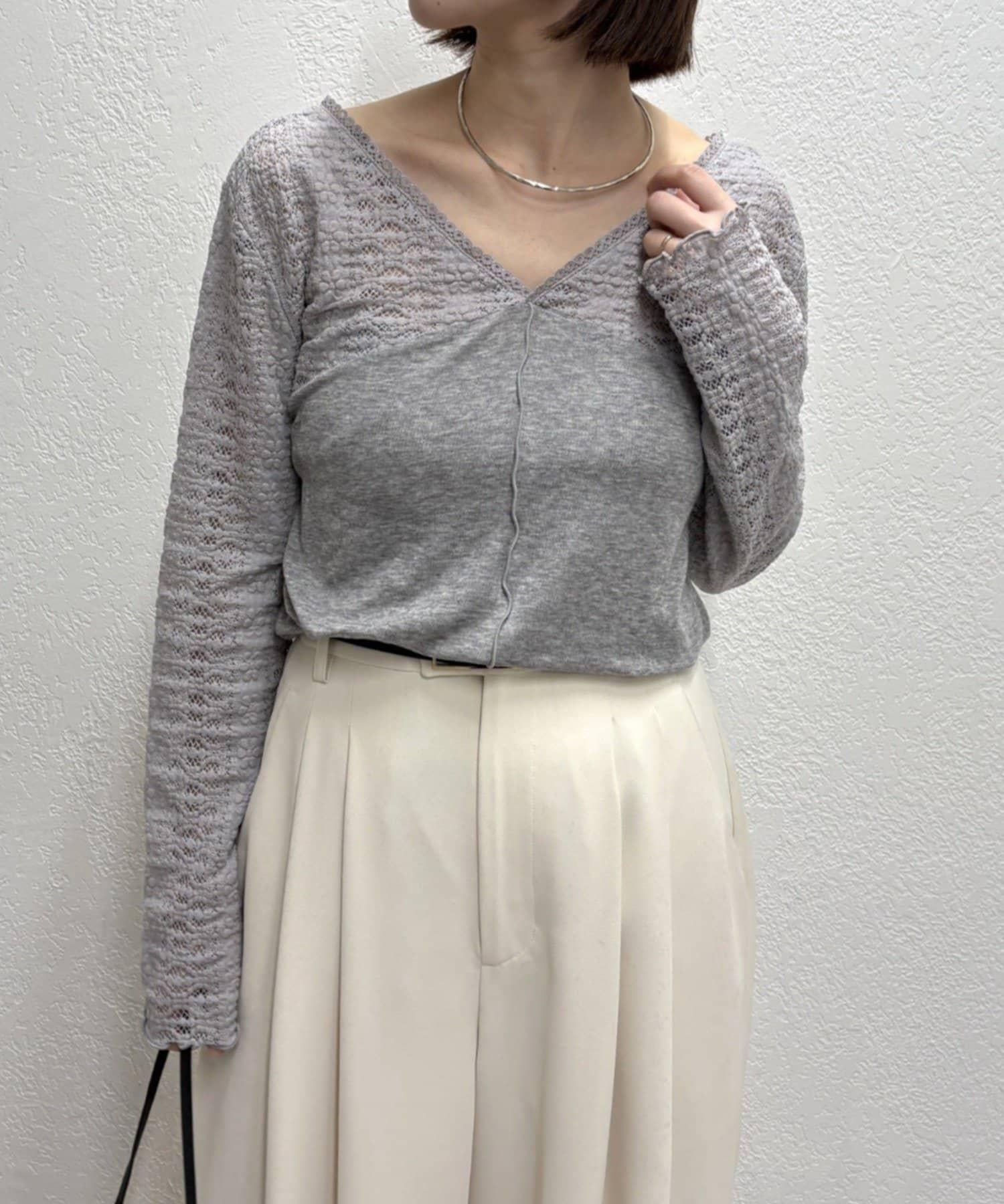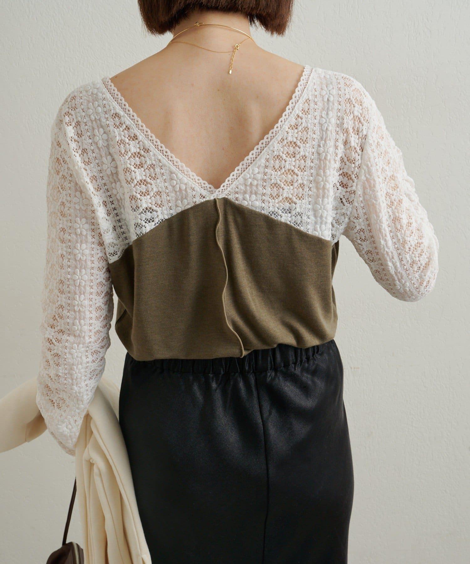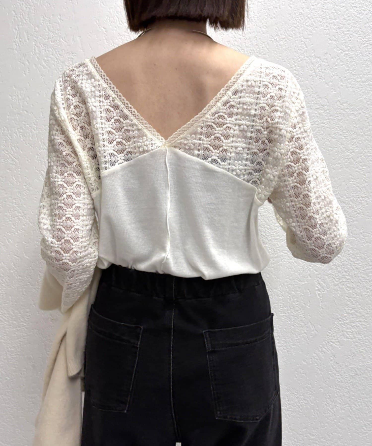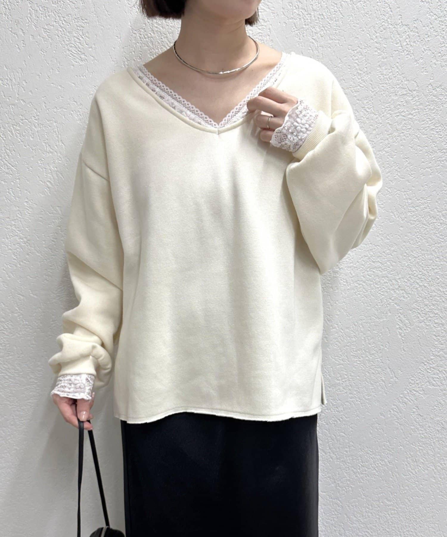 頸部的蕾絲材質為這款針織縫製的針織衫增添了女性氣息。