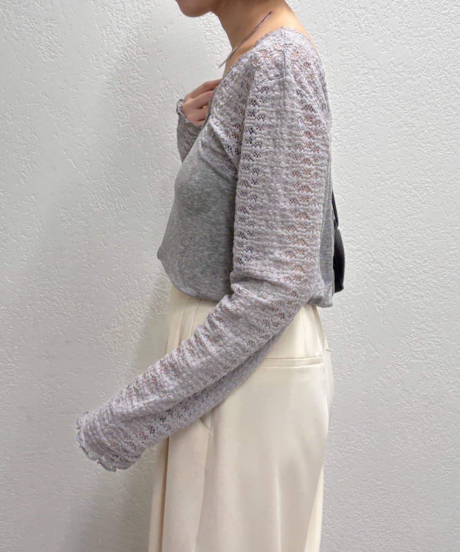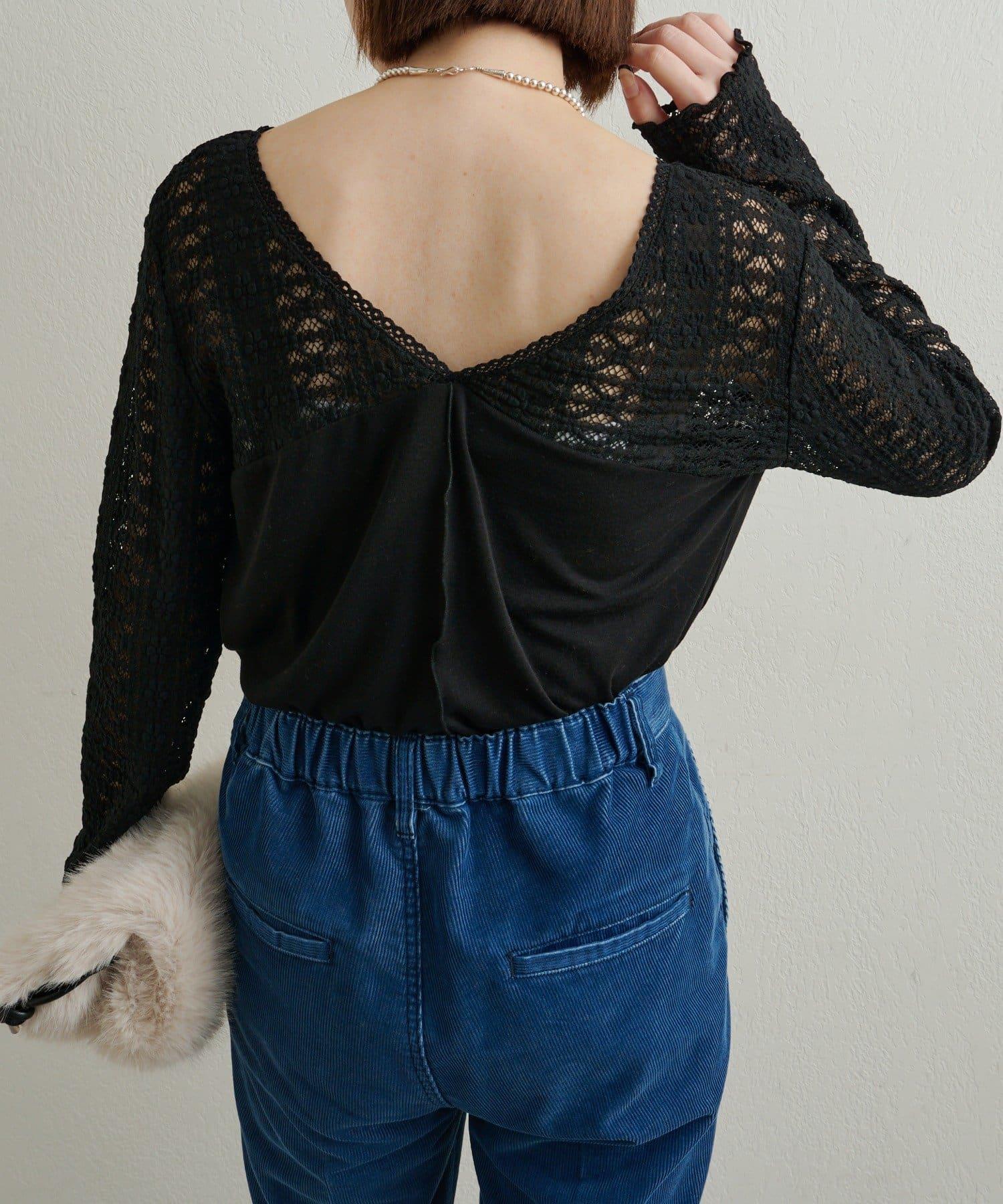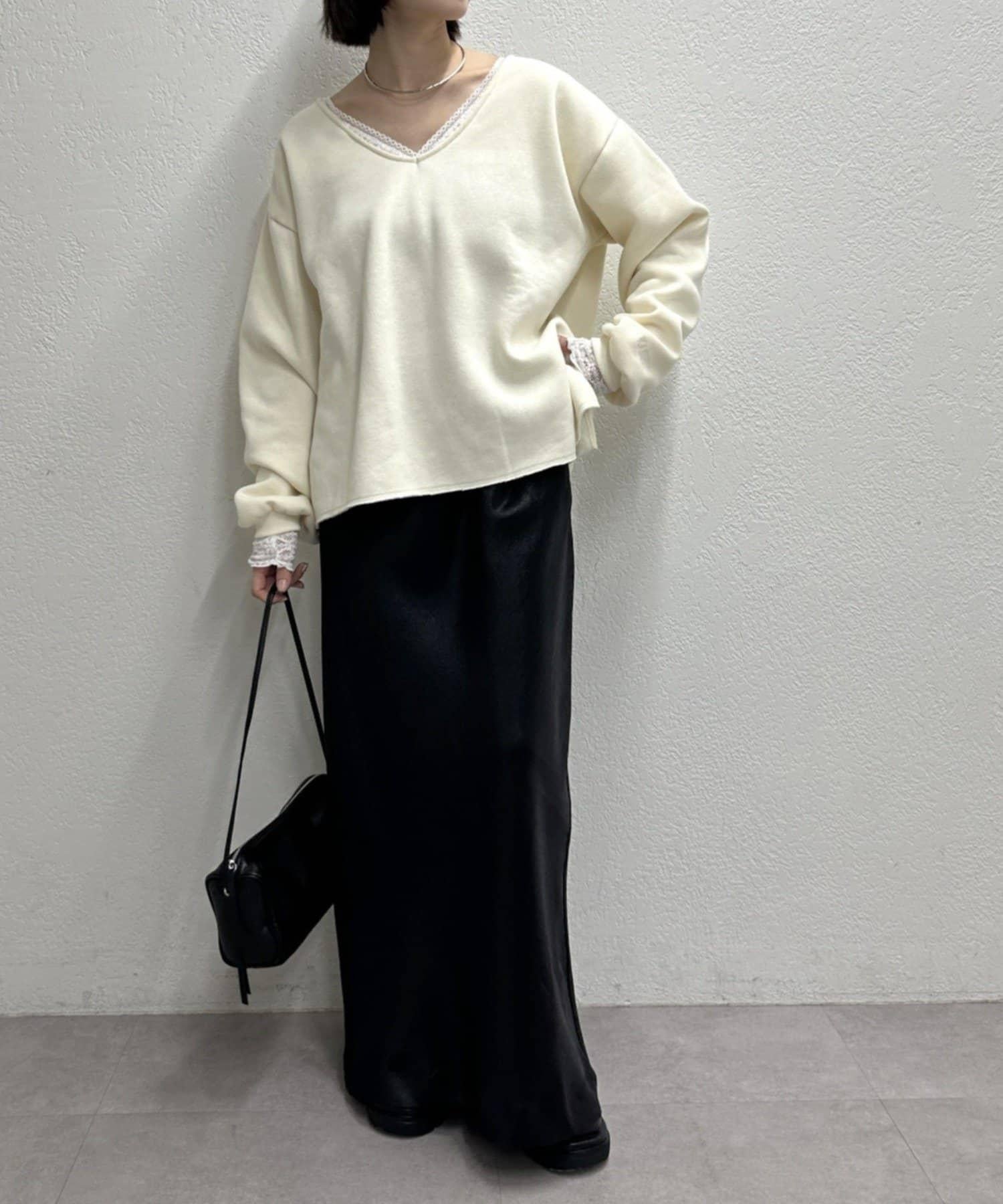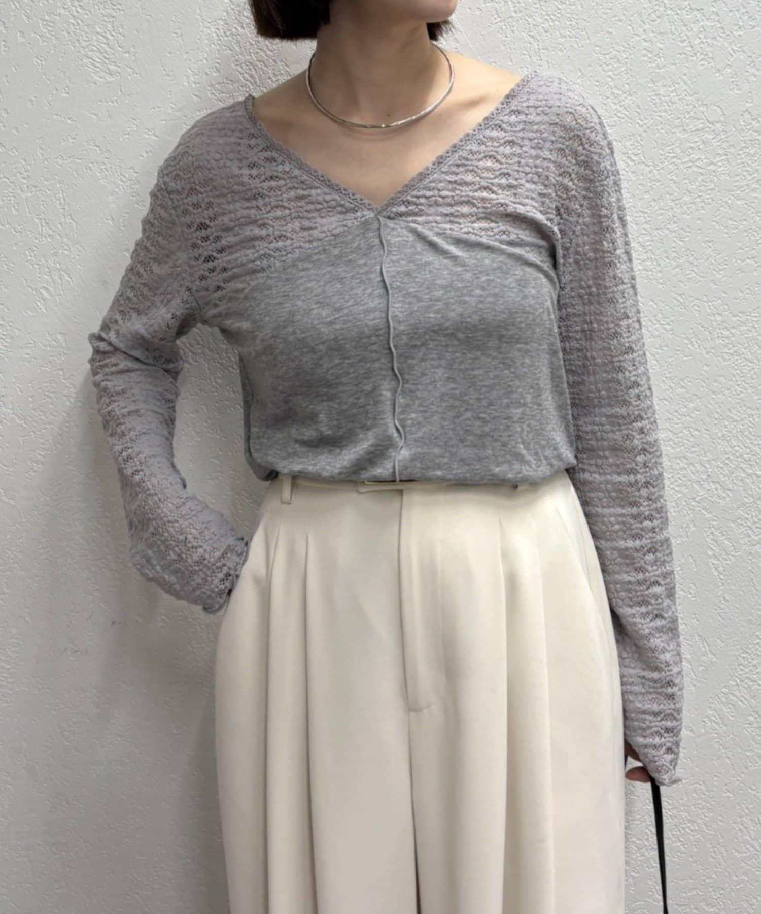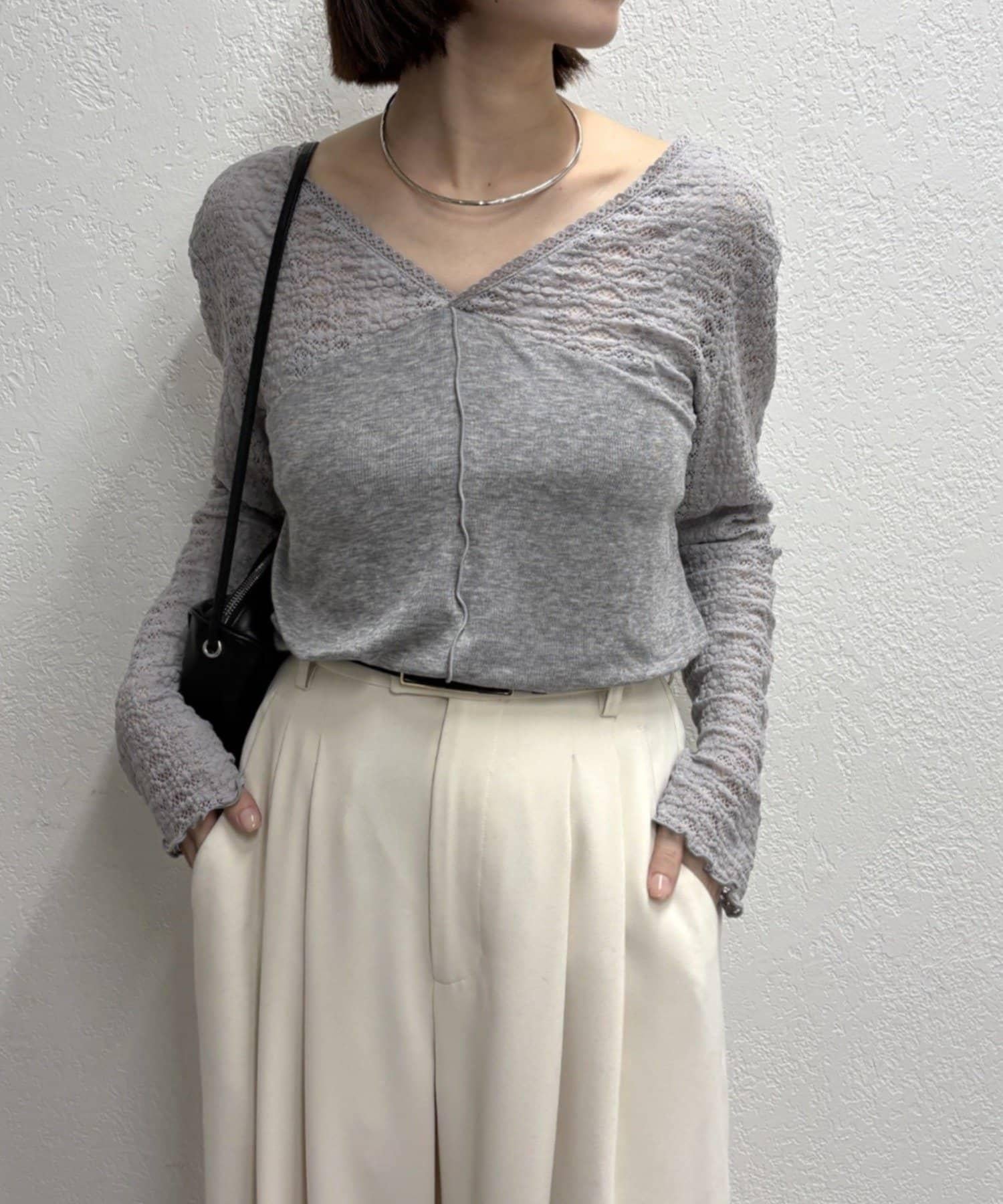 頸部的蕾絲材質為這款針織縫製的針織衫增添了女性氣息。