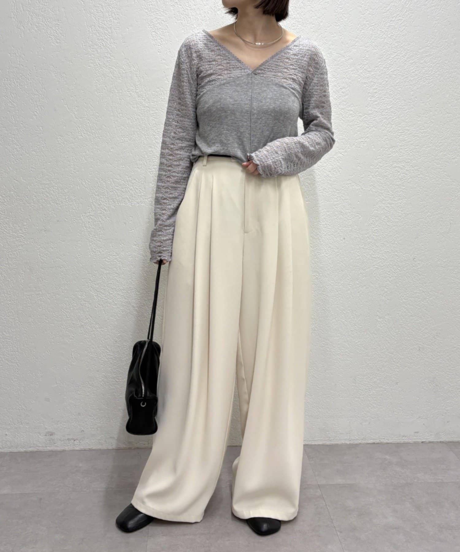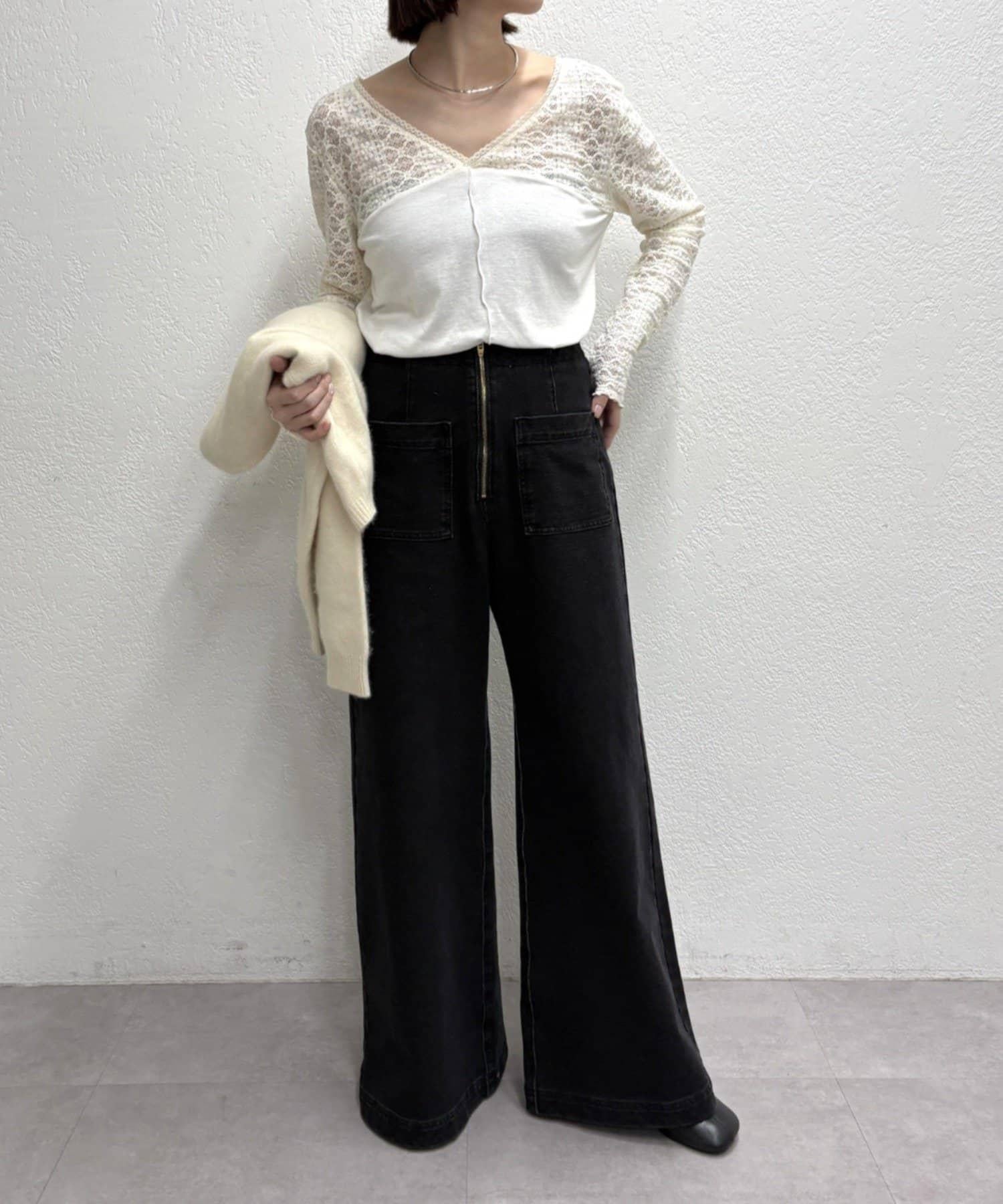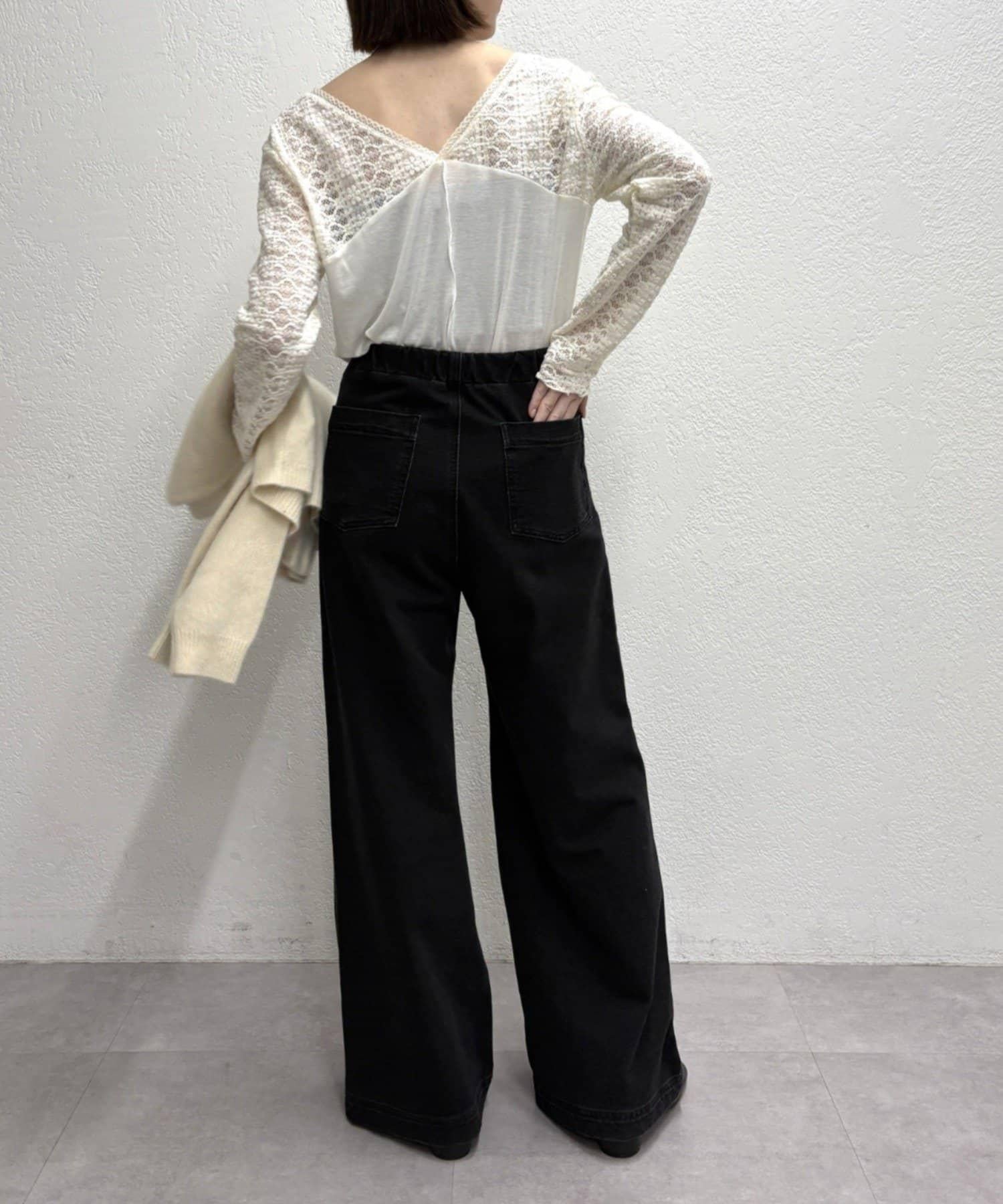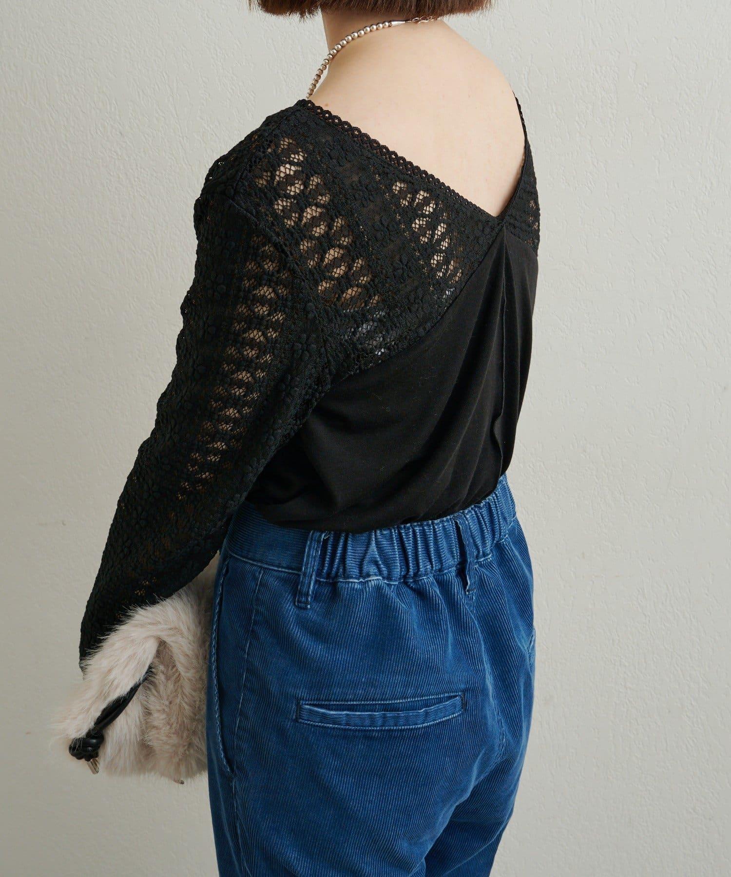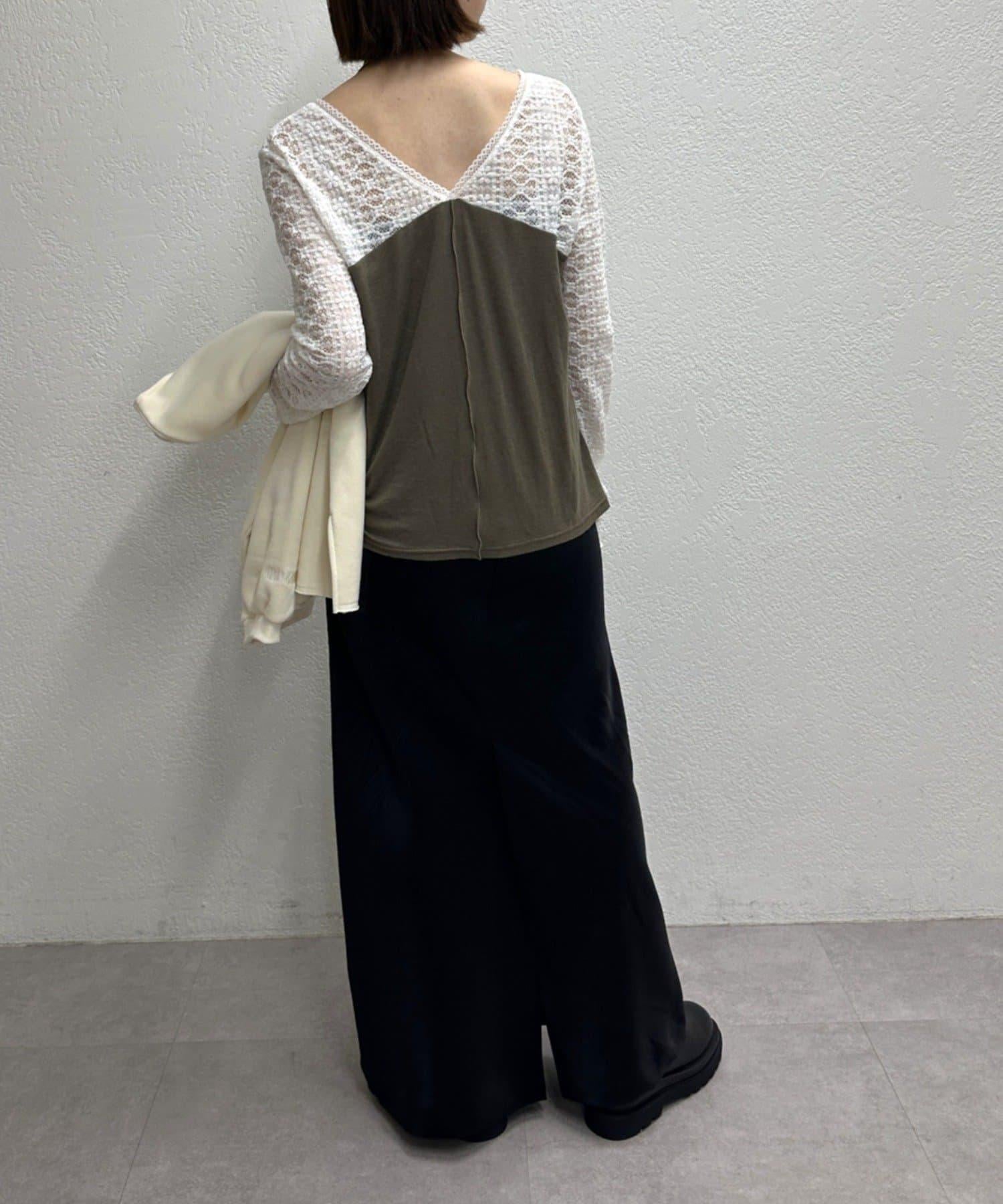 頸部的蕾絲材質為這款針織縫製的針織衫增添了女性氣息。