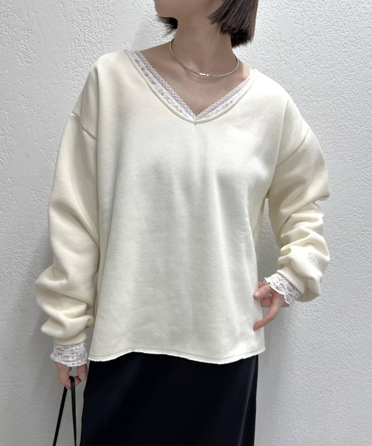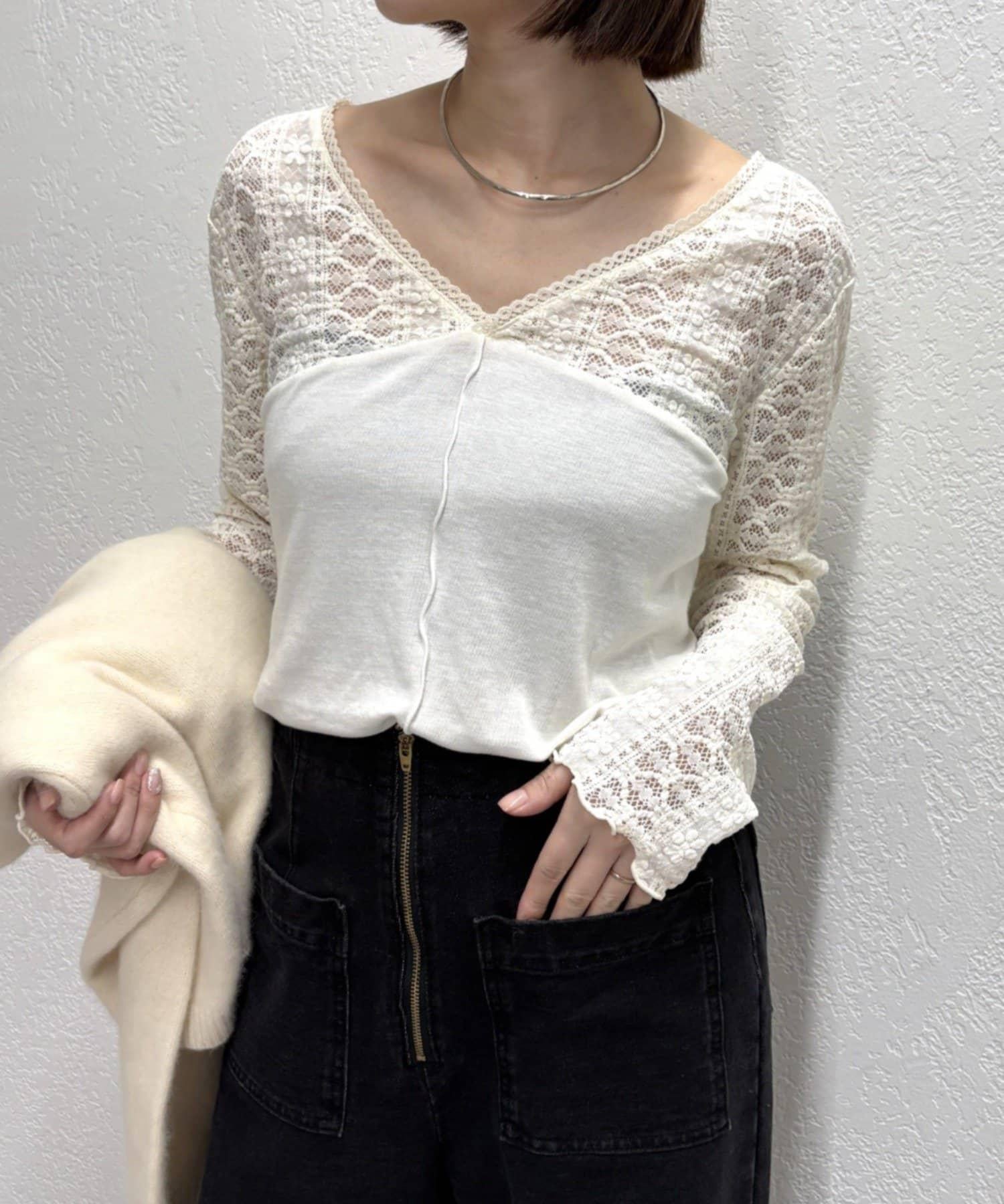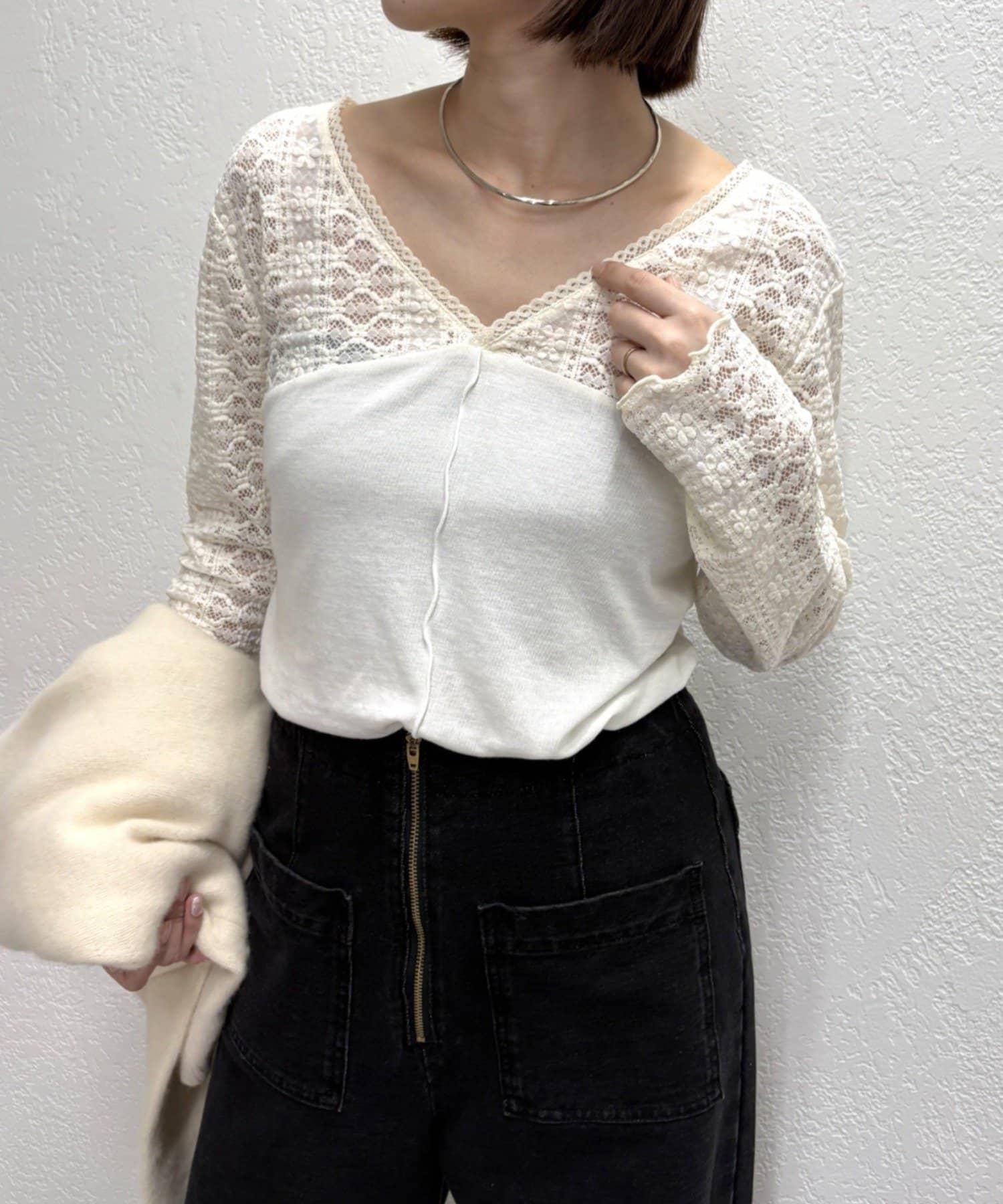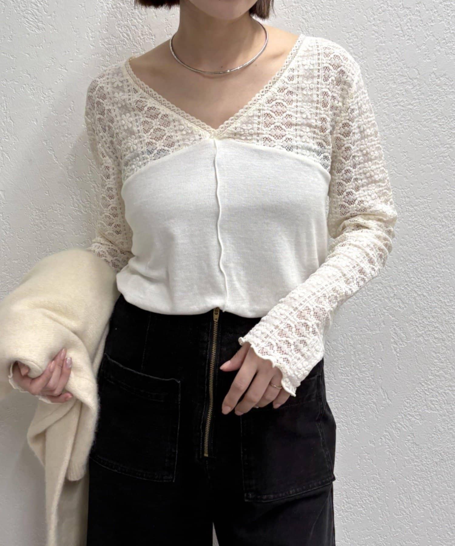 頸部的蕾絲材質為這款針織縫紉衫增添了女性氣息。
