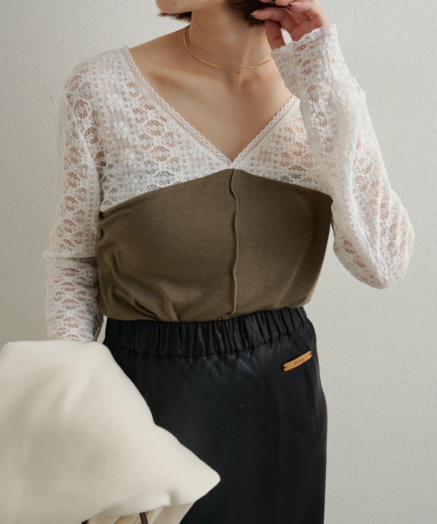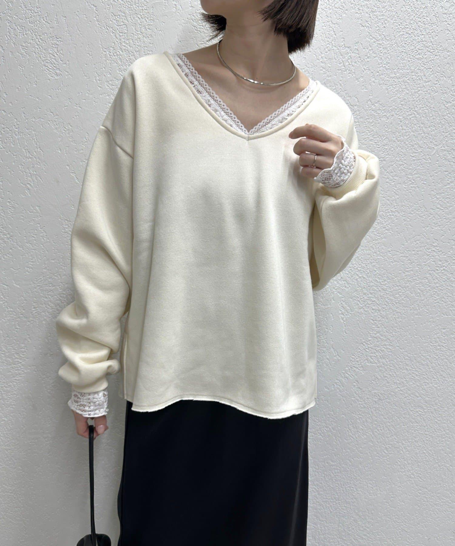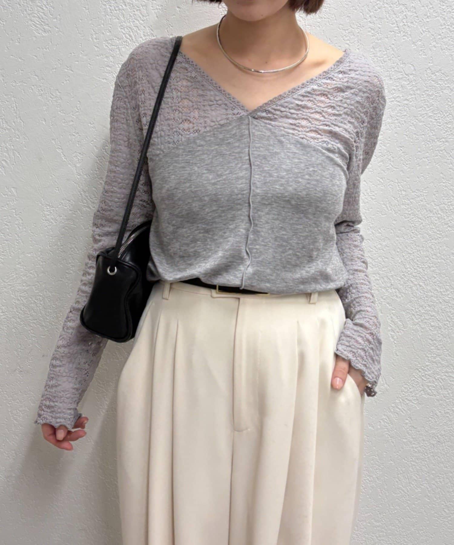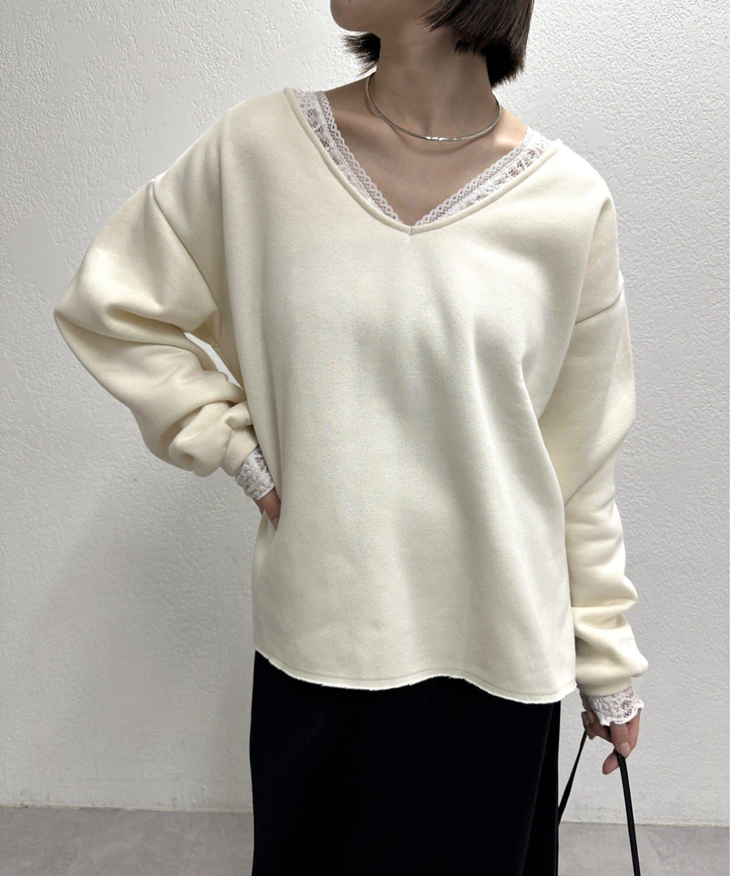 頸部的蕾絲材質為這款針織縫紉衫增添了女性氣息。