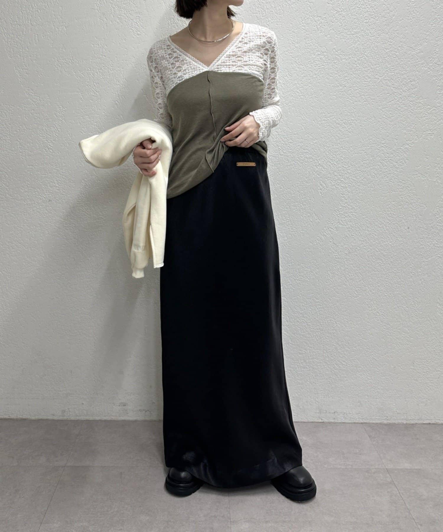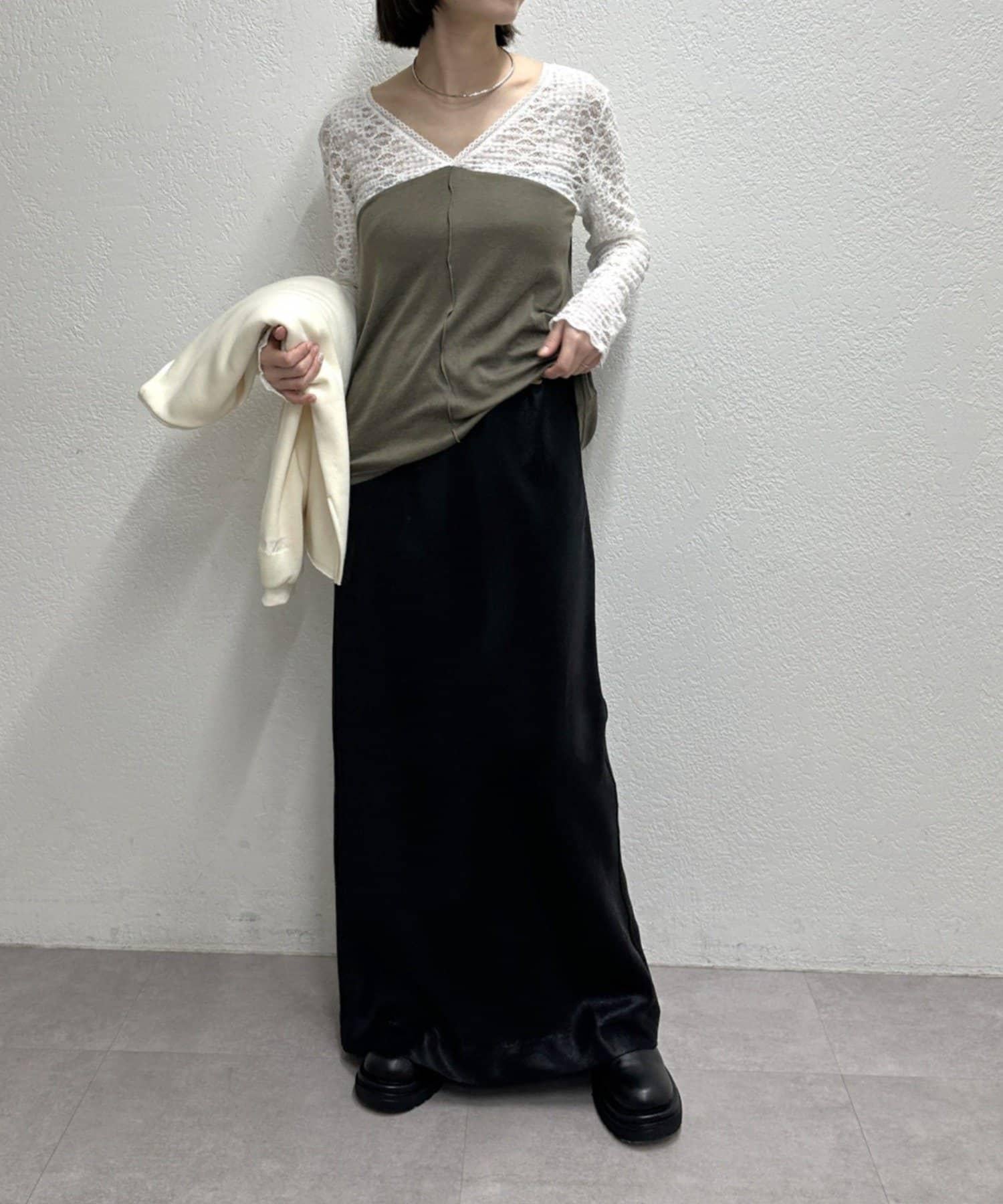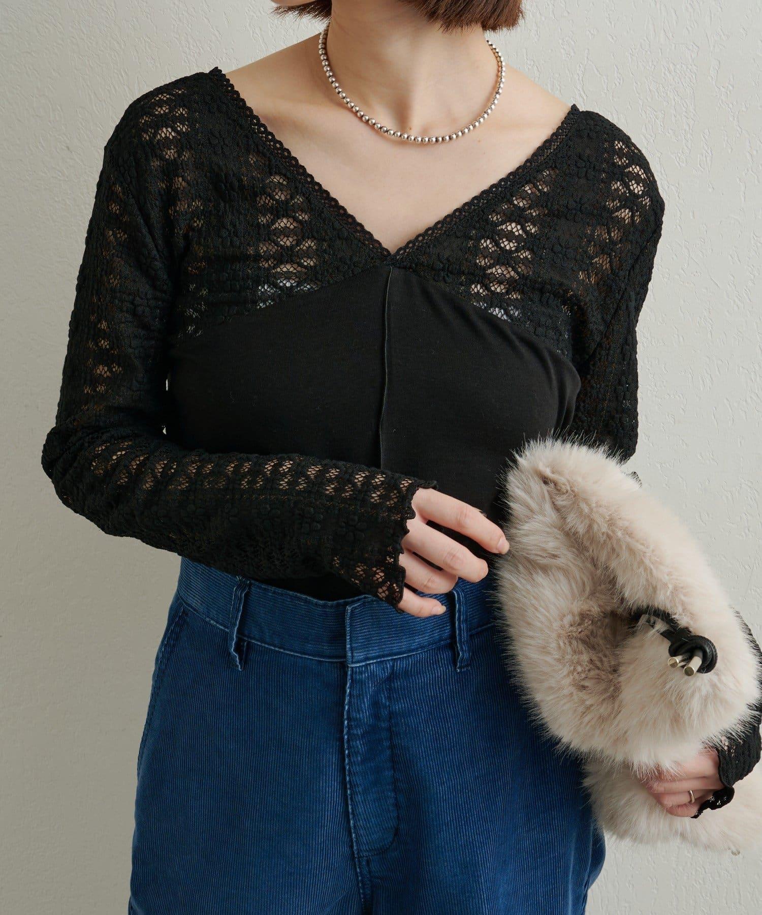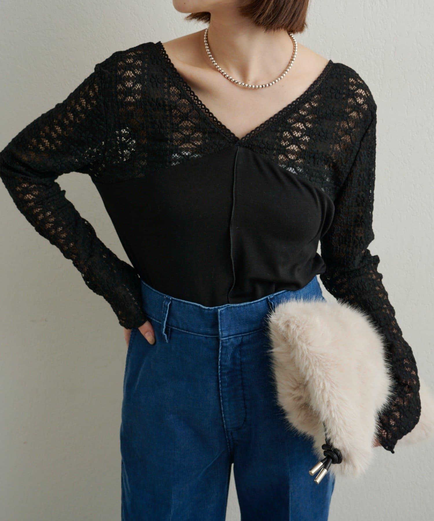 頸部的蕾絲材質為這款針織縫紉衫增添了女性氣息。