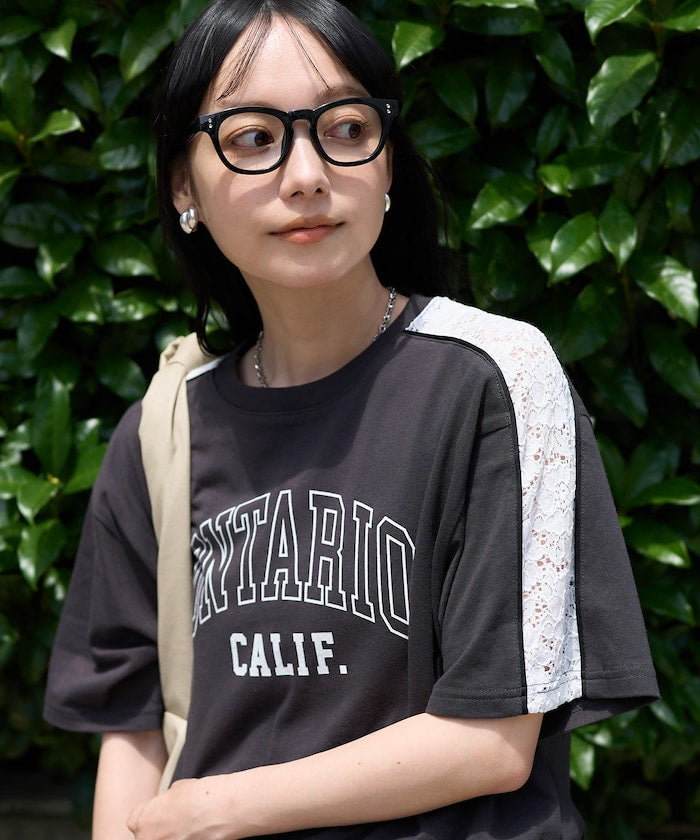休閒剪裁縫製的 T 恤,袖子上的蕾絲花邊彰顯時尚氣息。