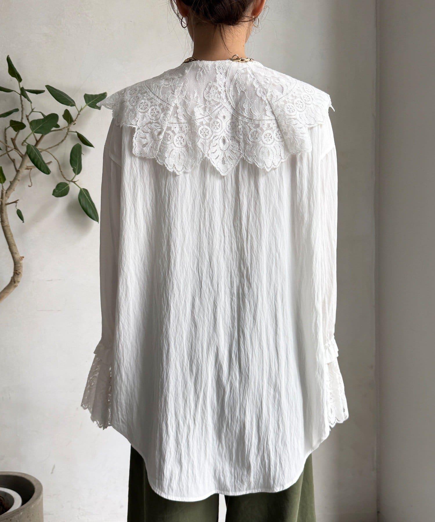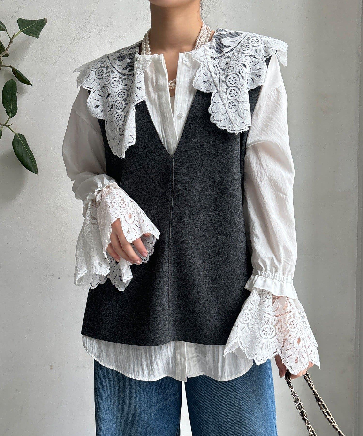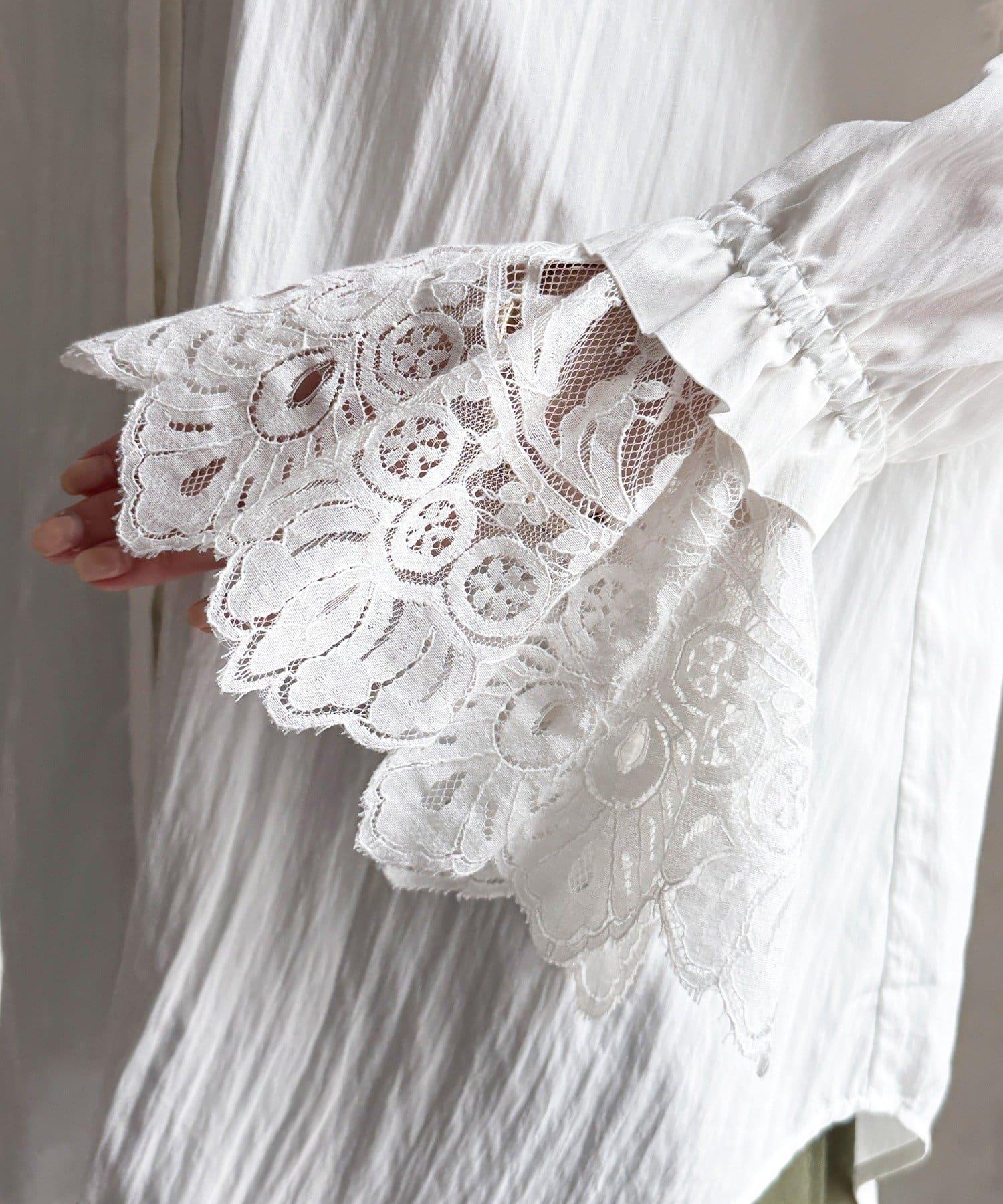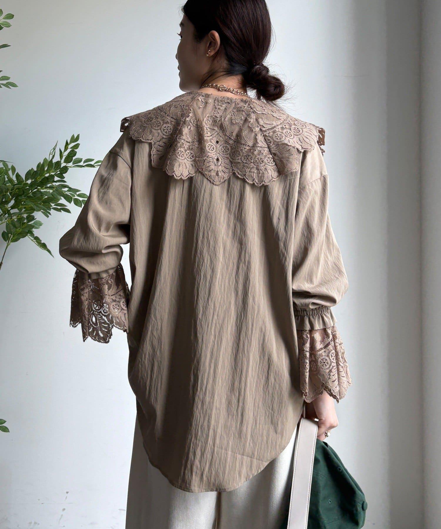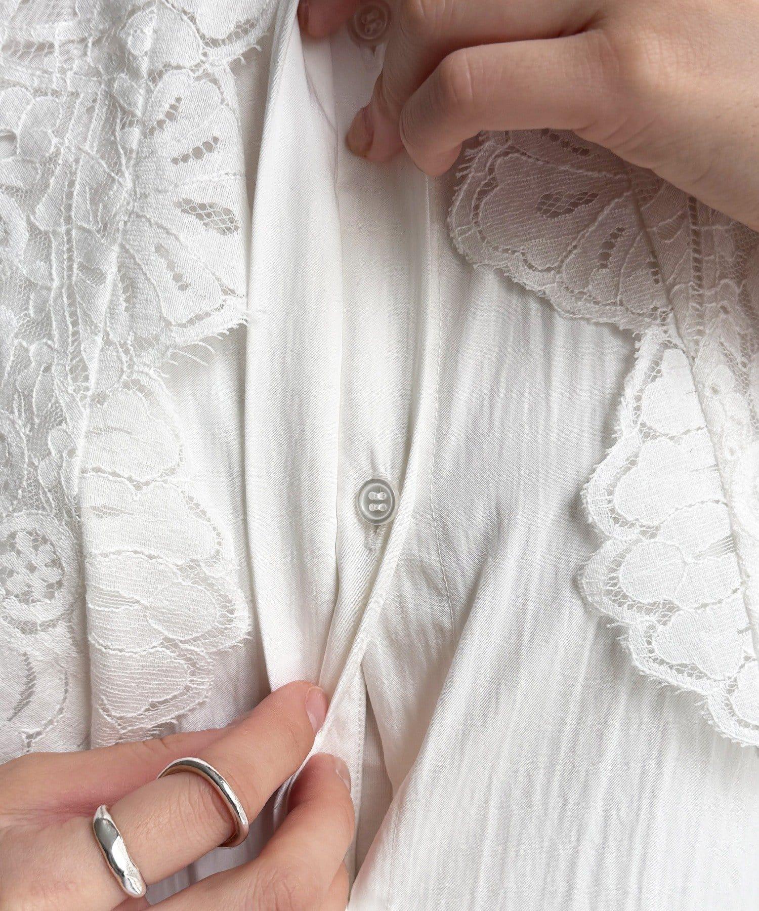 這款襯衫的衣領和衣袖均採用蕾絲設計。
