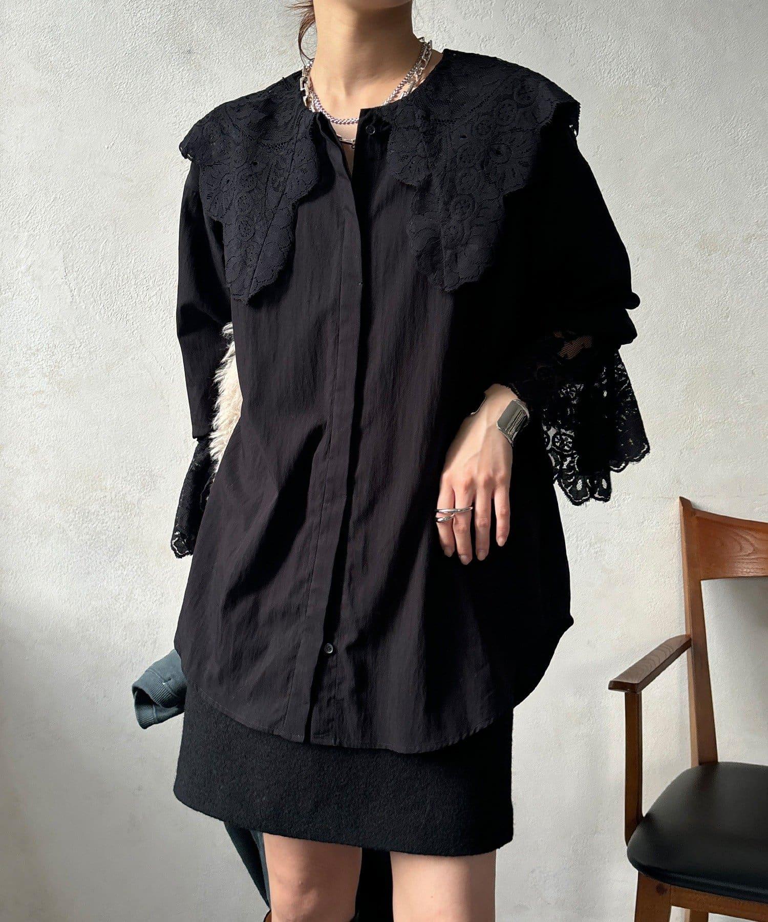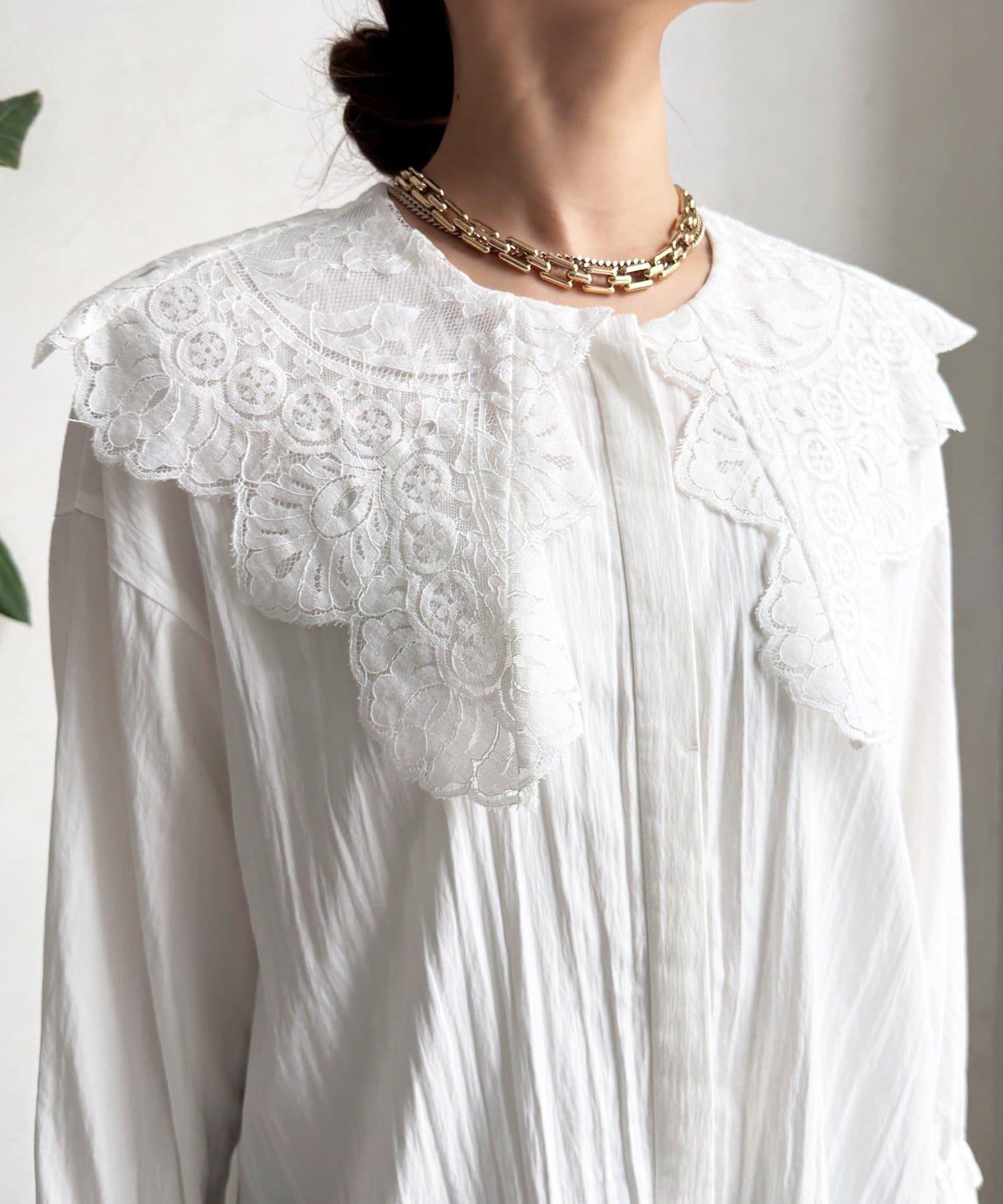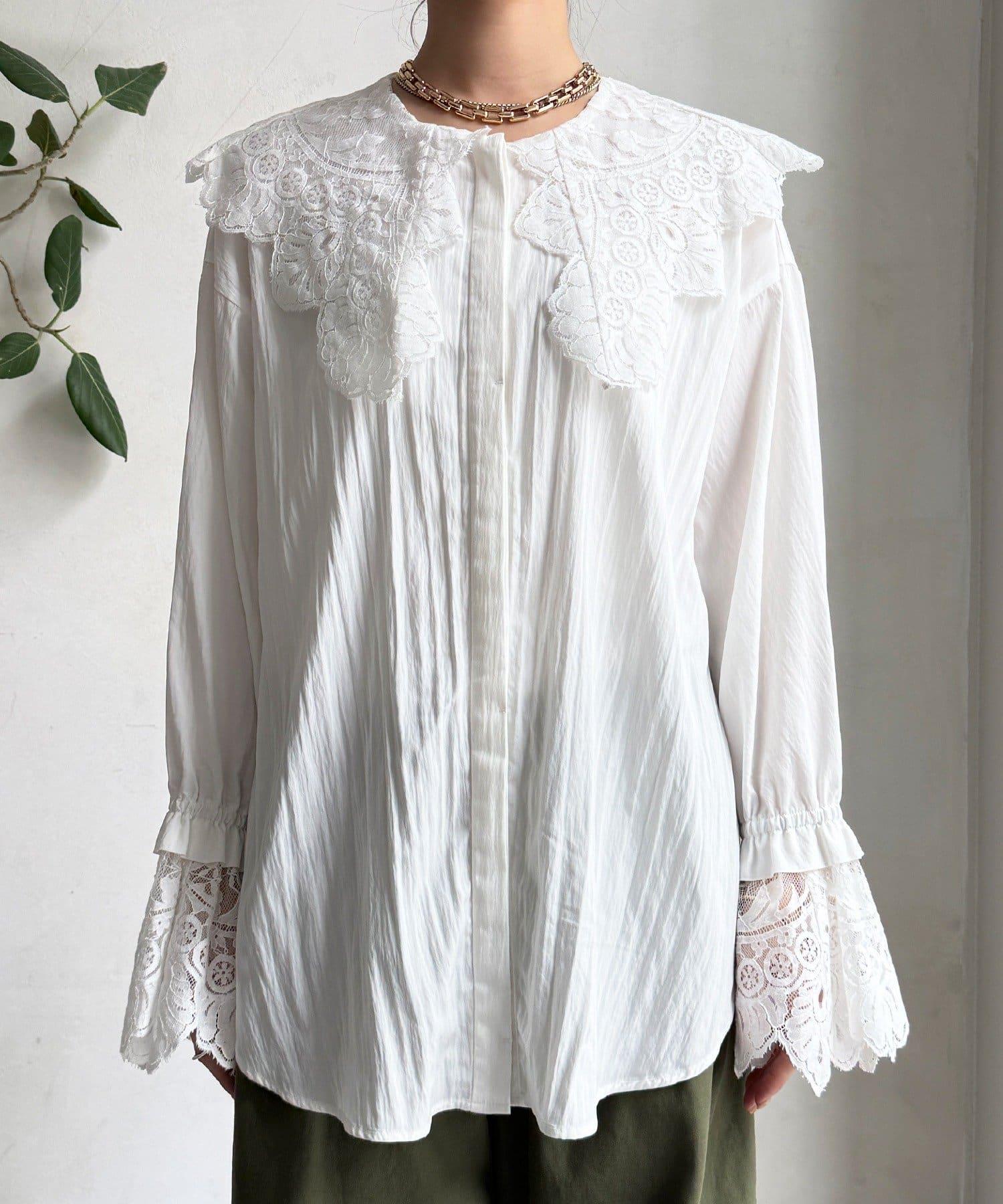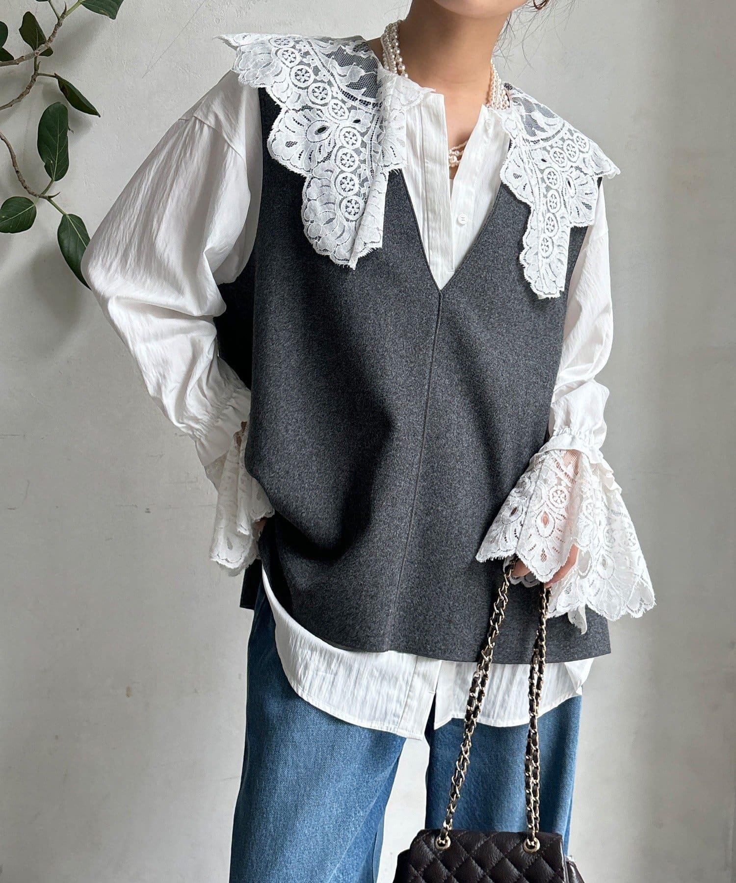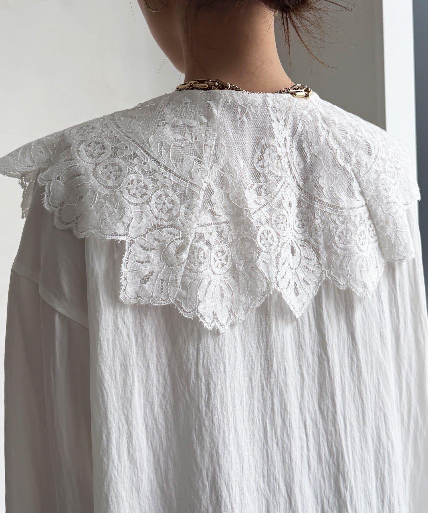 這款襯衫的衣領和衣袖均採用蕾絲設計。