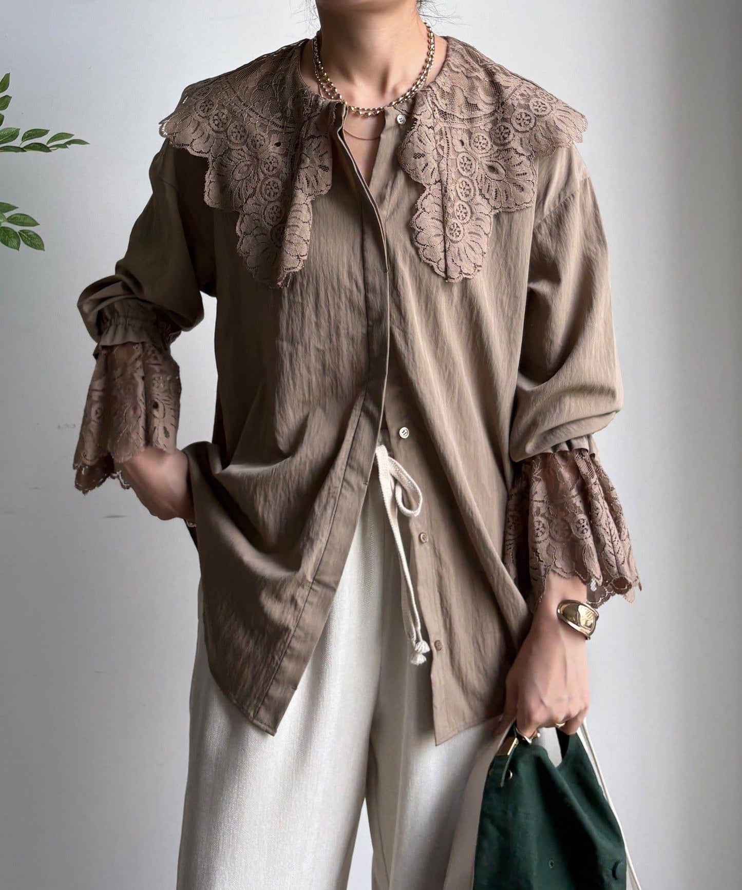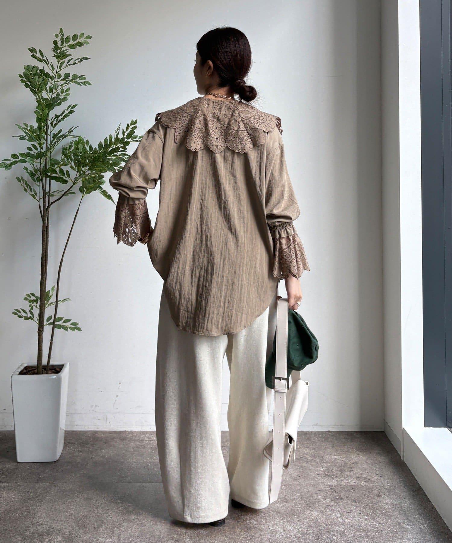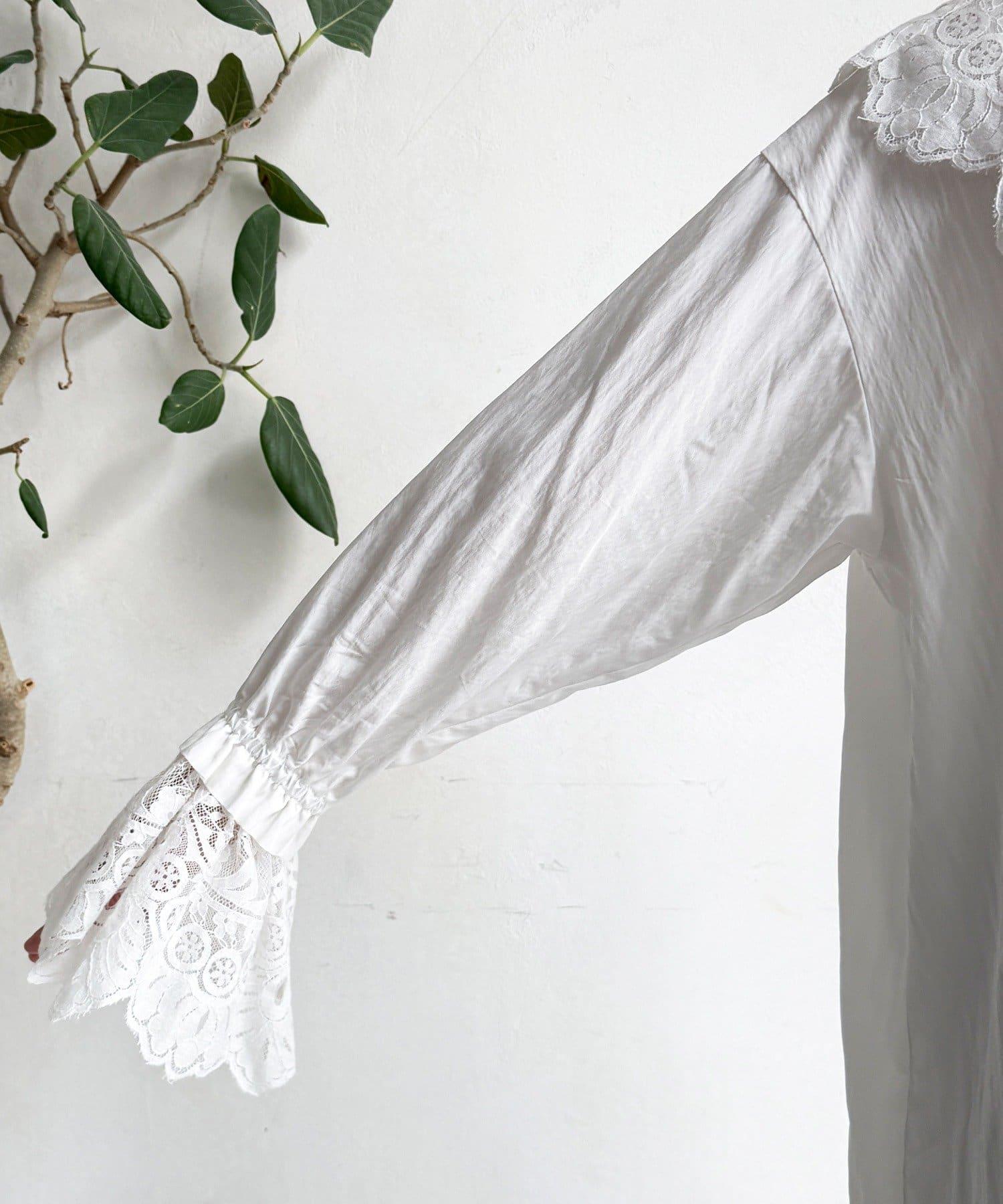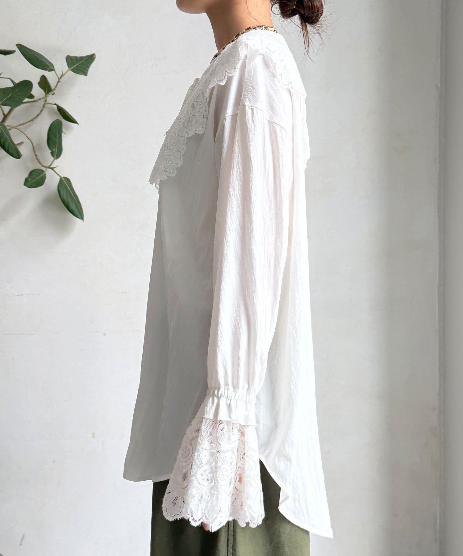 這款襯衫的衣領和衣袖均採用蕾絲設計。