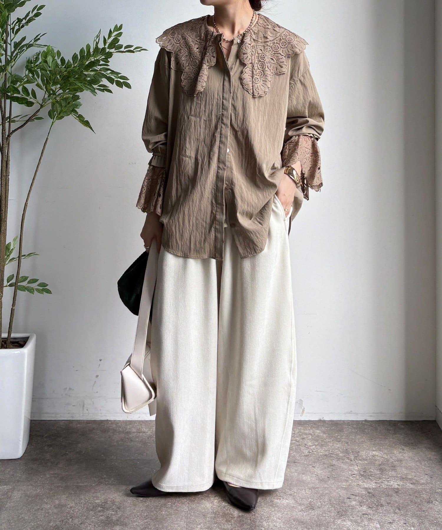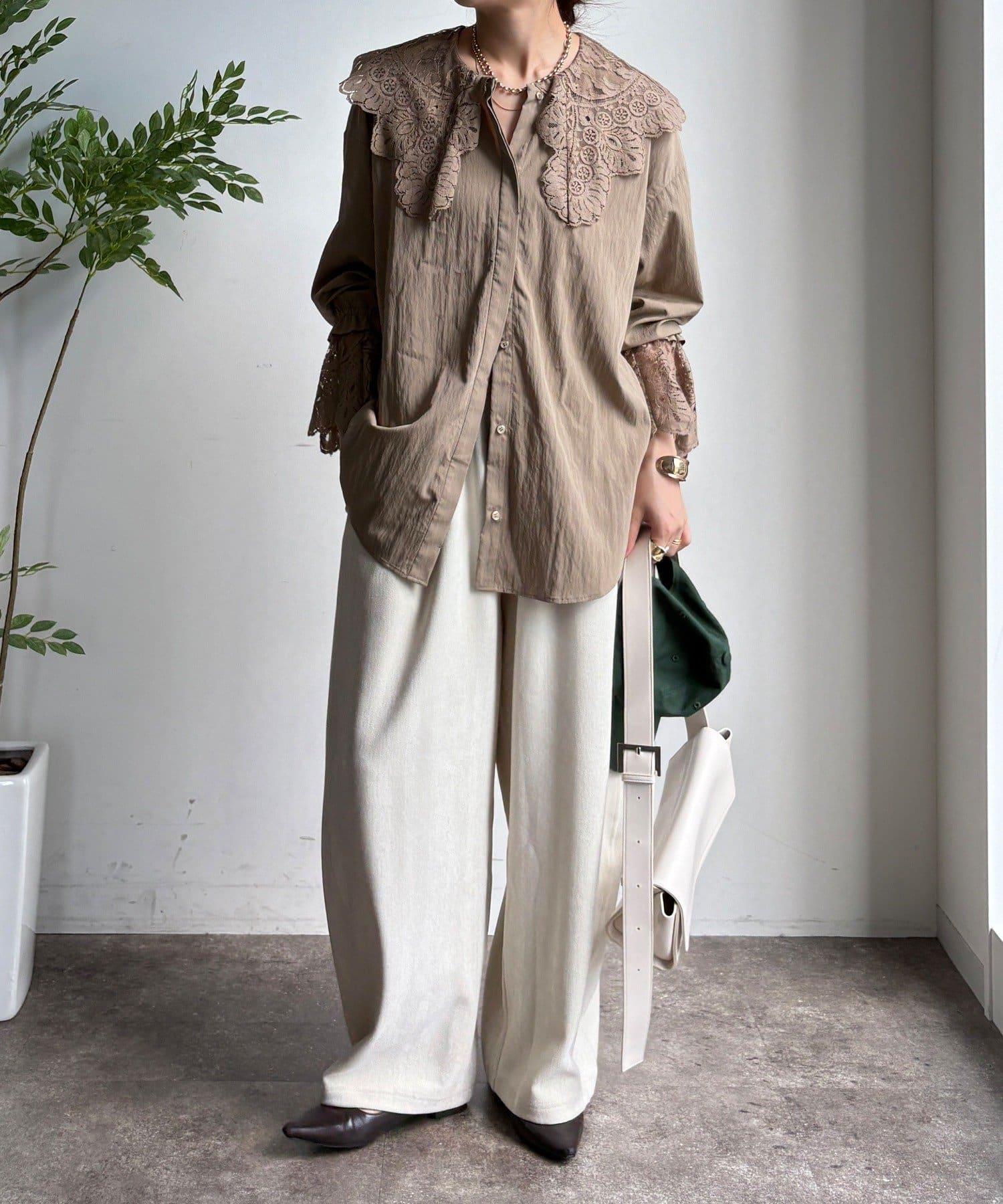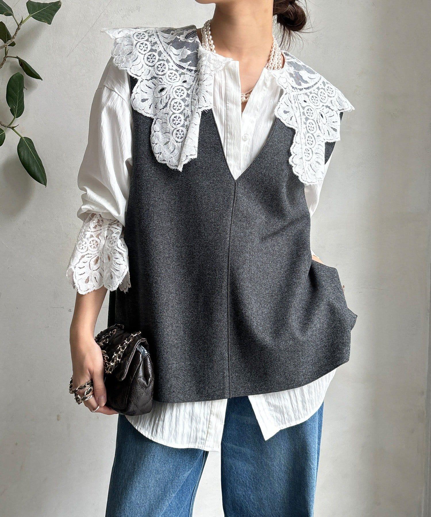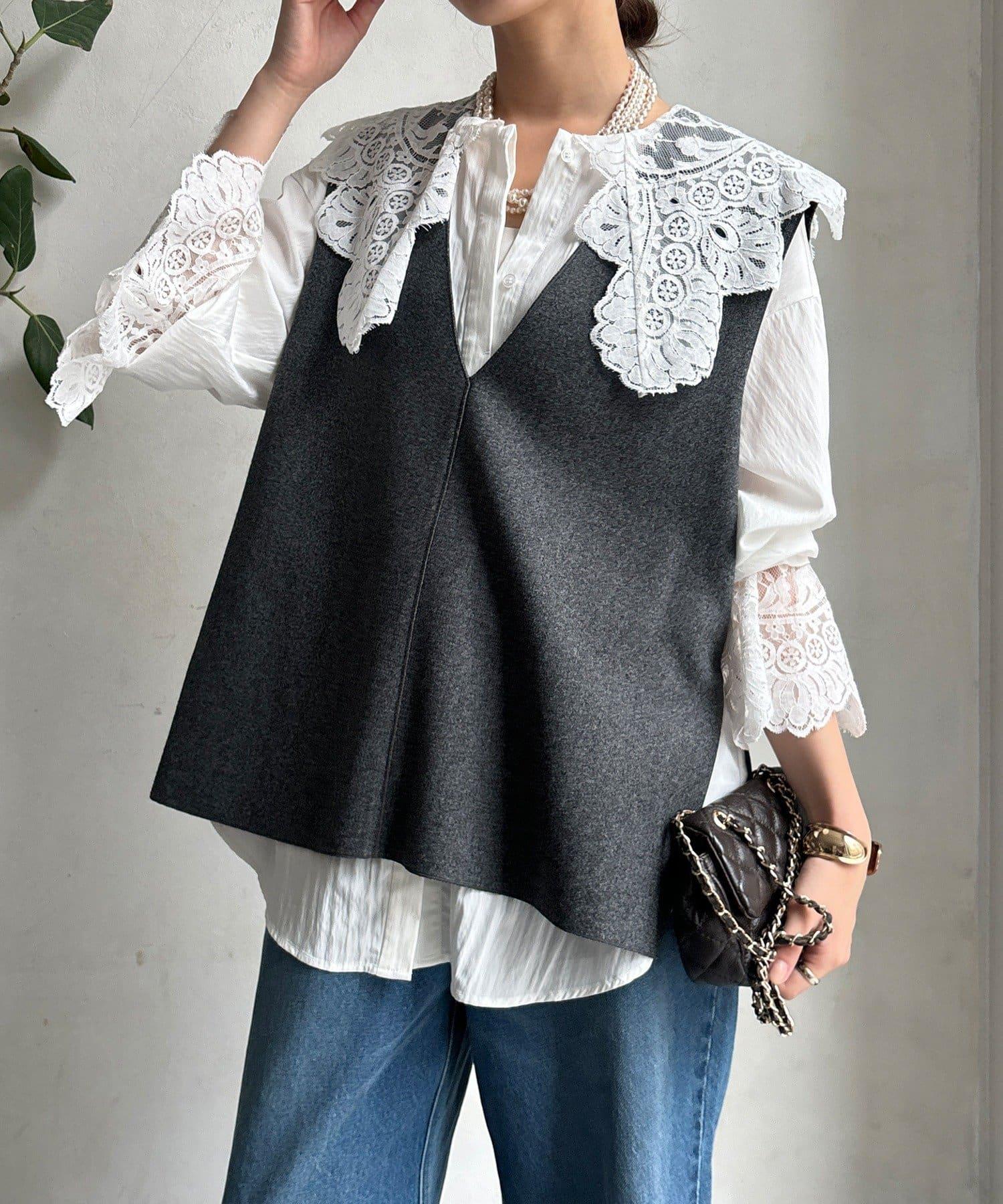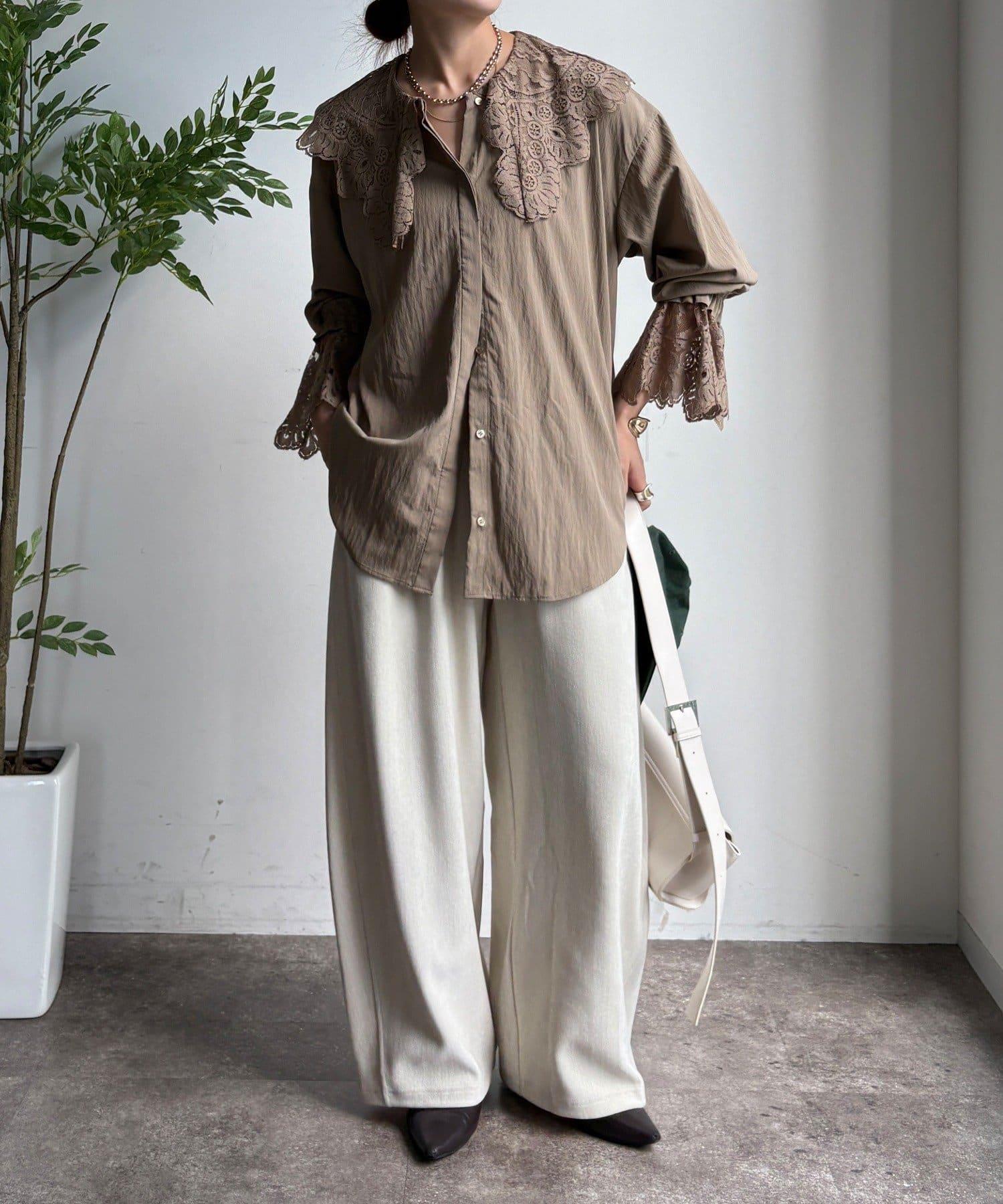 這款襯衫的衣領和衣袖均採用蕾絲設計。