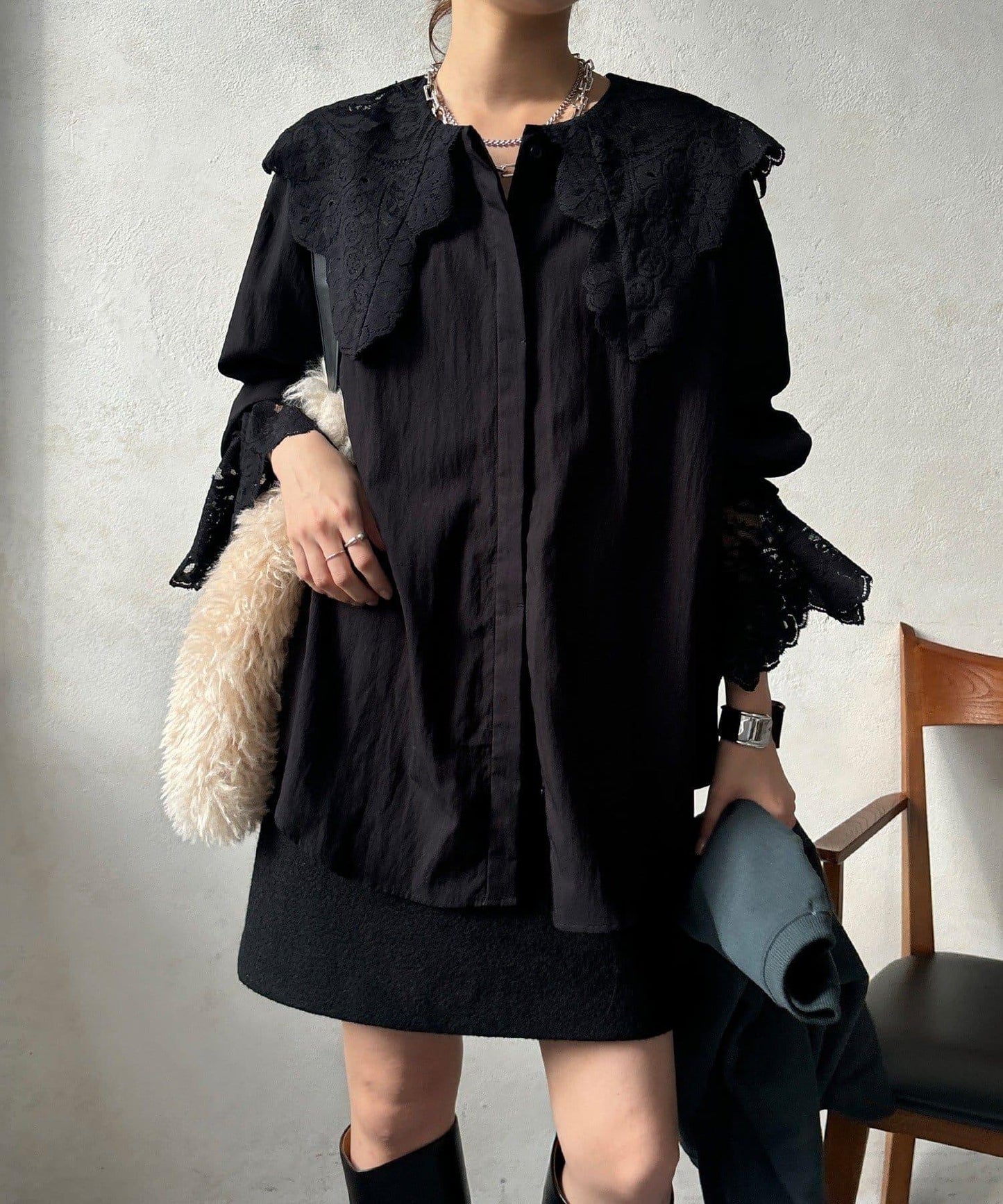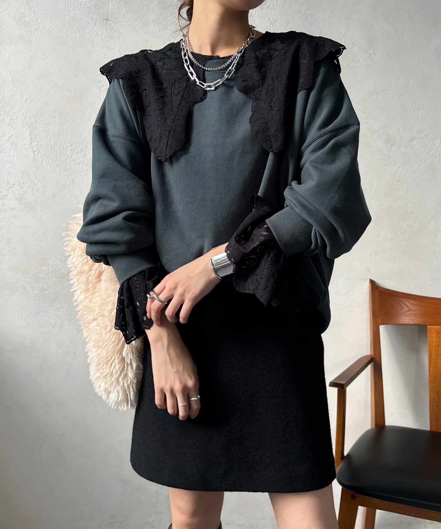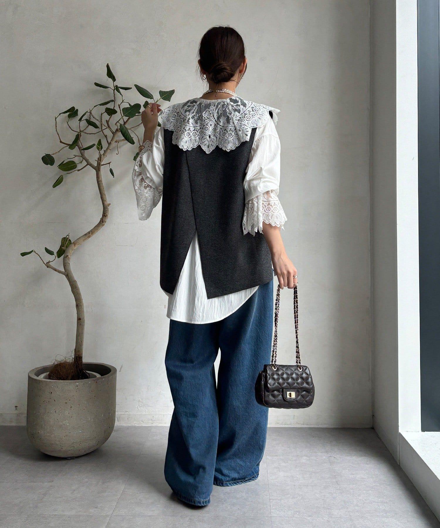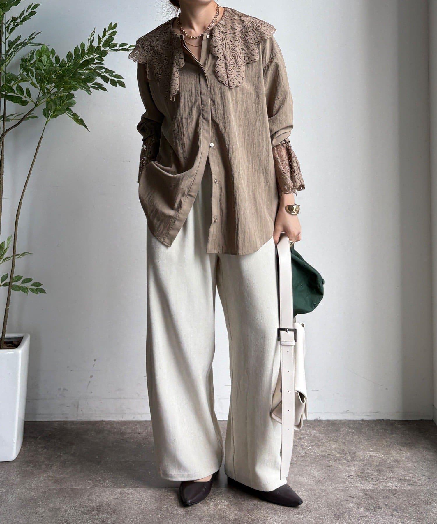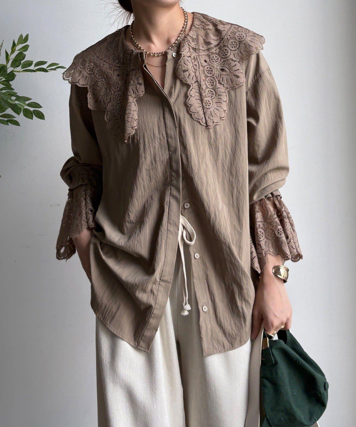 這款襯衫的衣領和衣袖均採用蕾絲設計。
