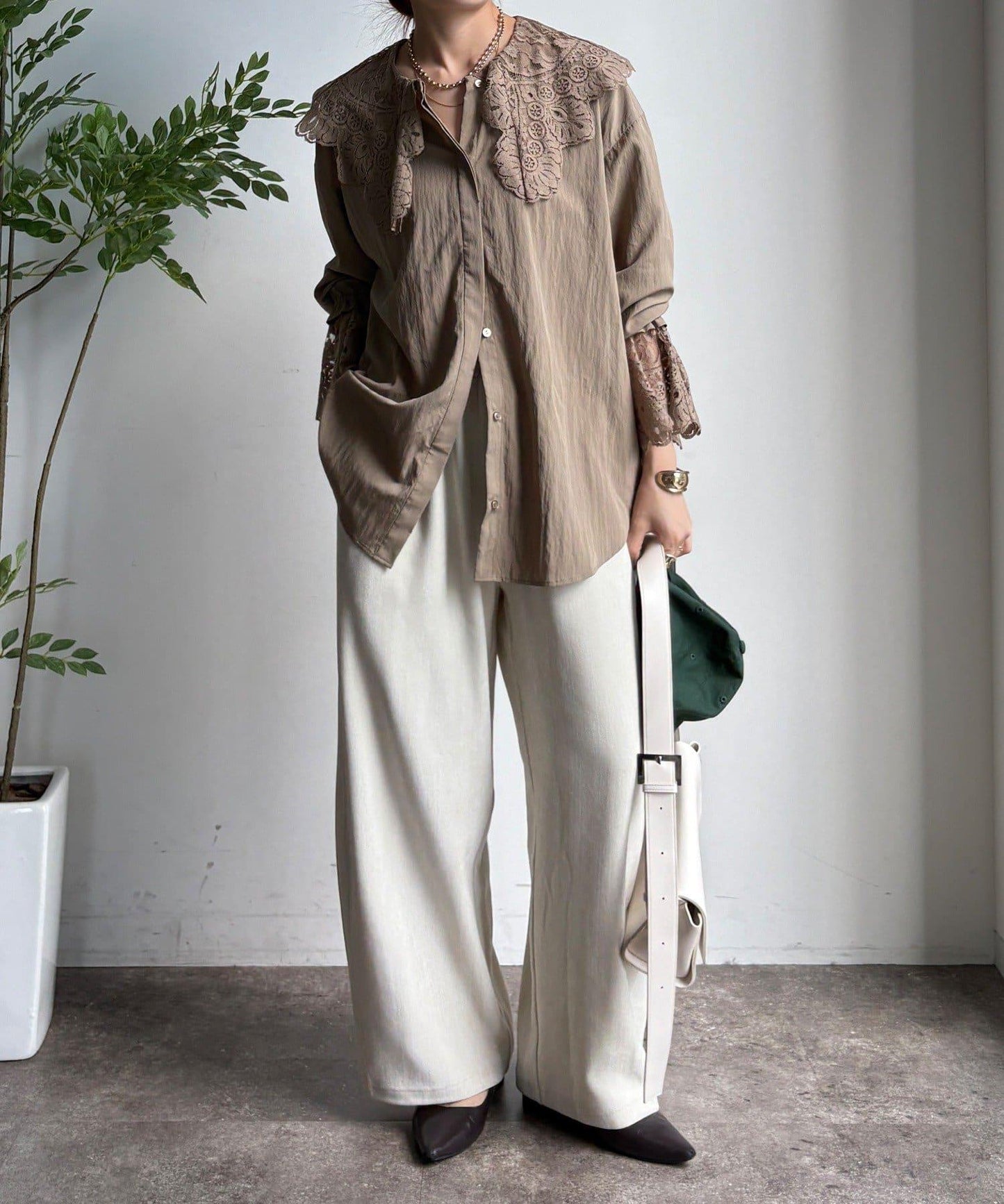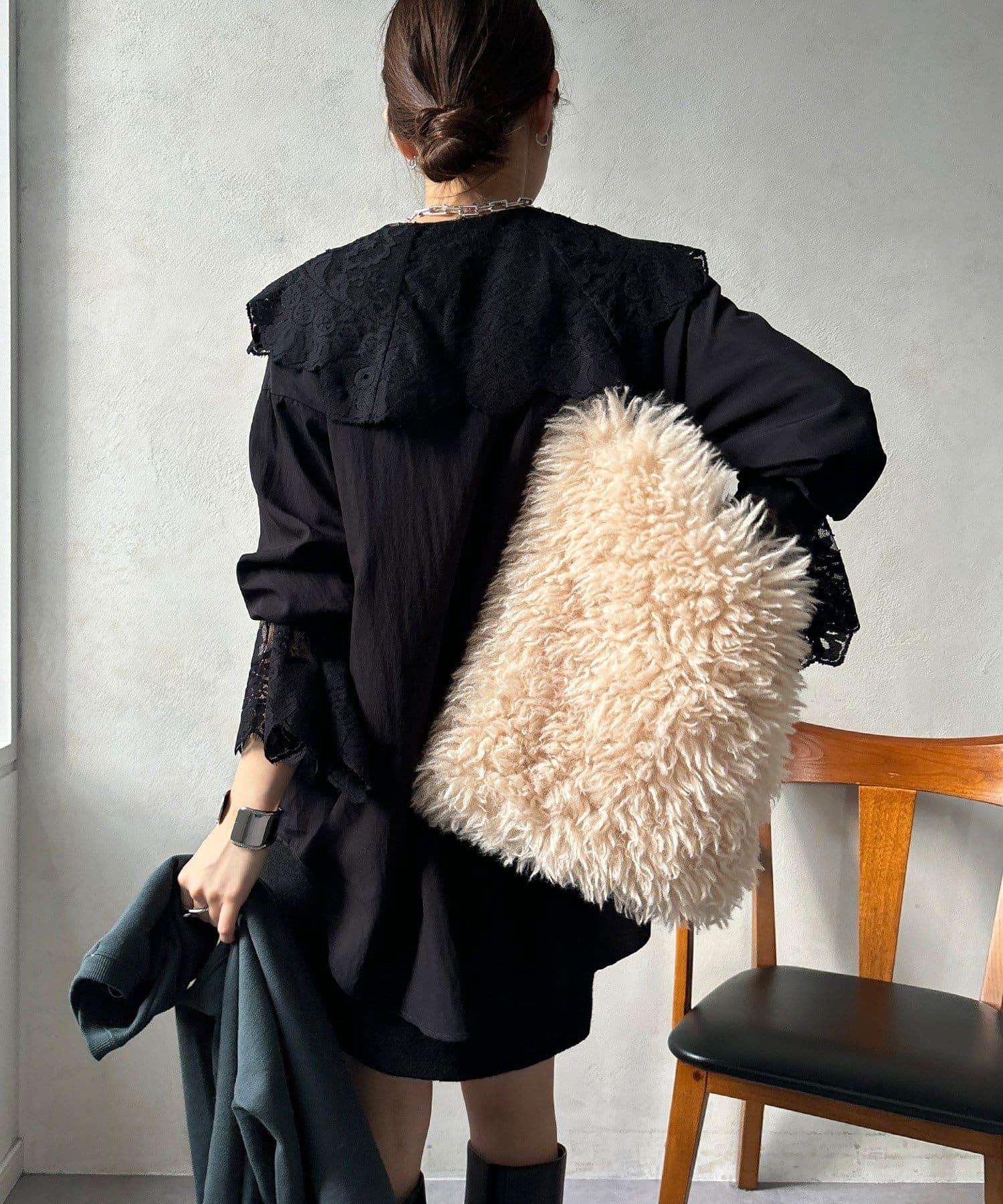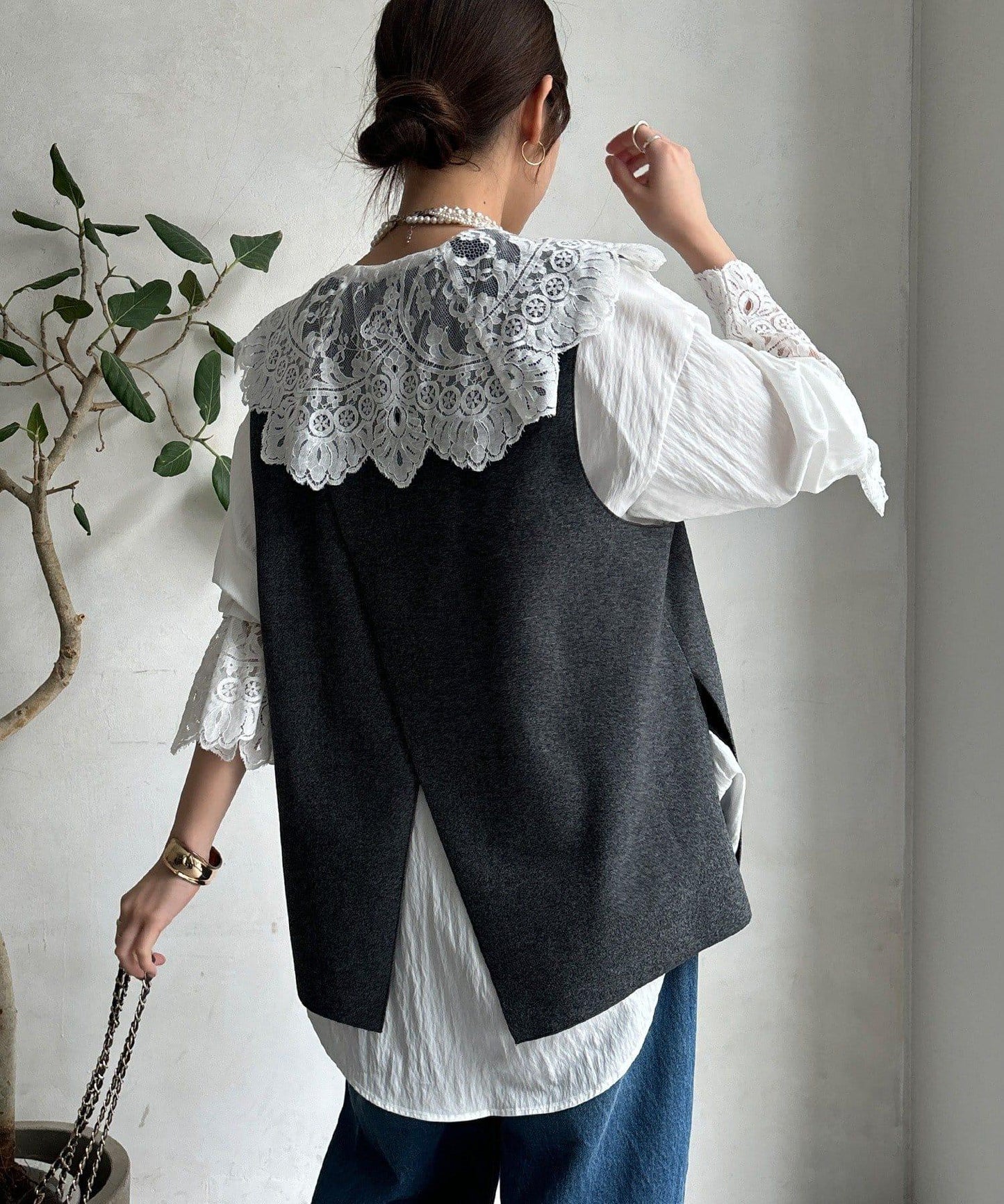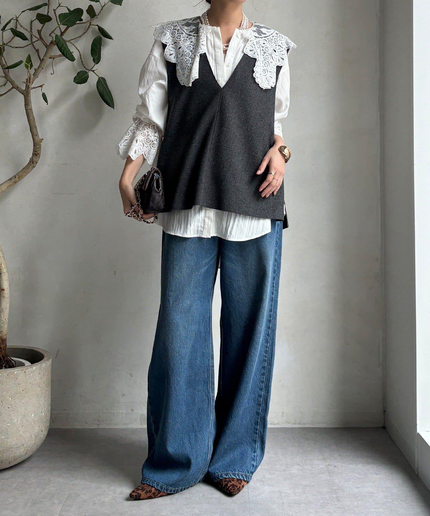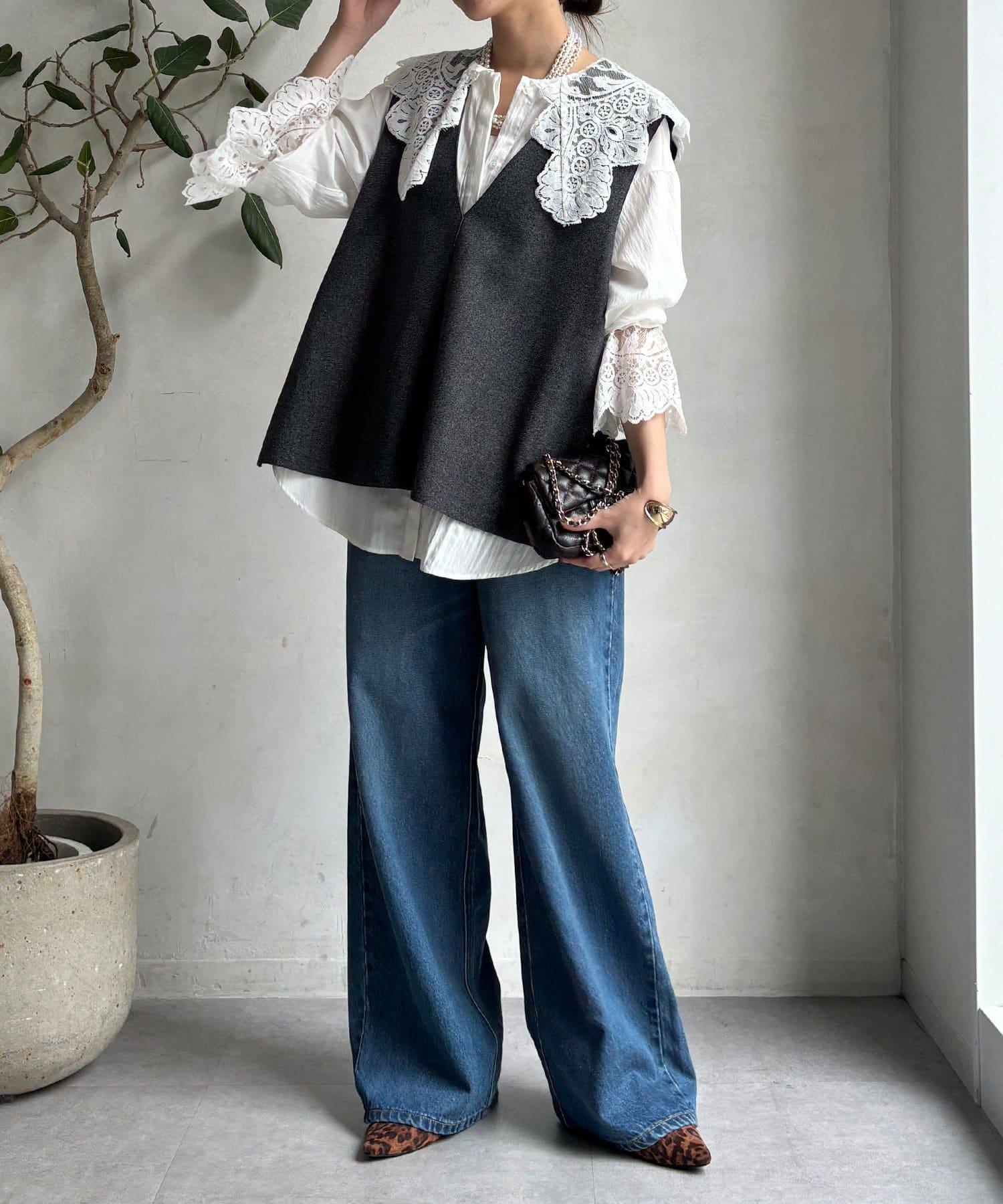 這款襯衫的衣領和衣袖均採用蕾絲設計。