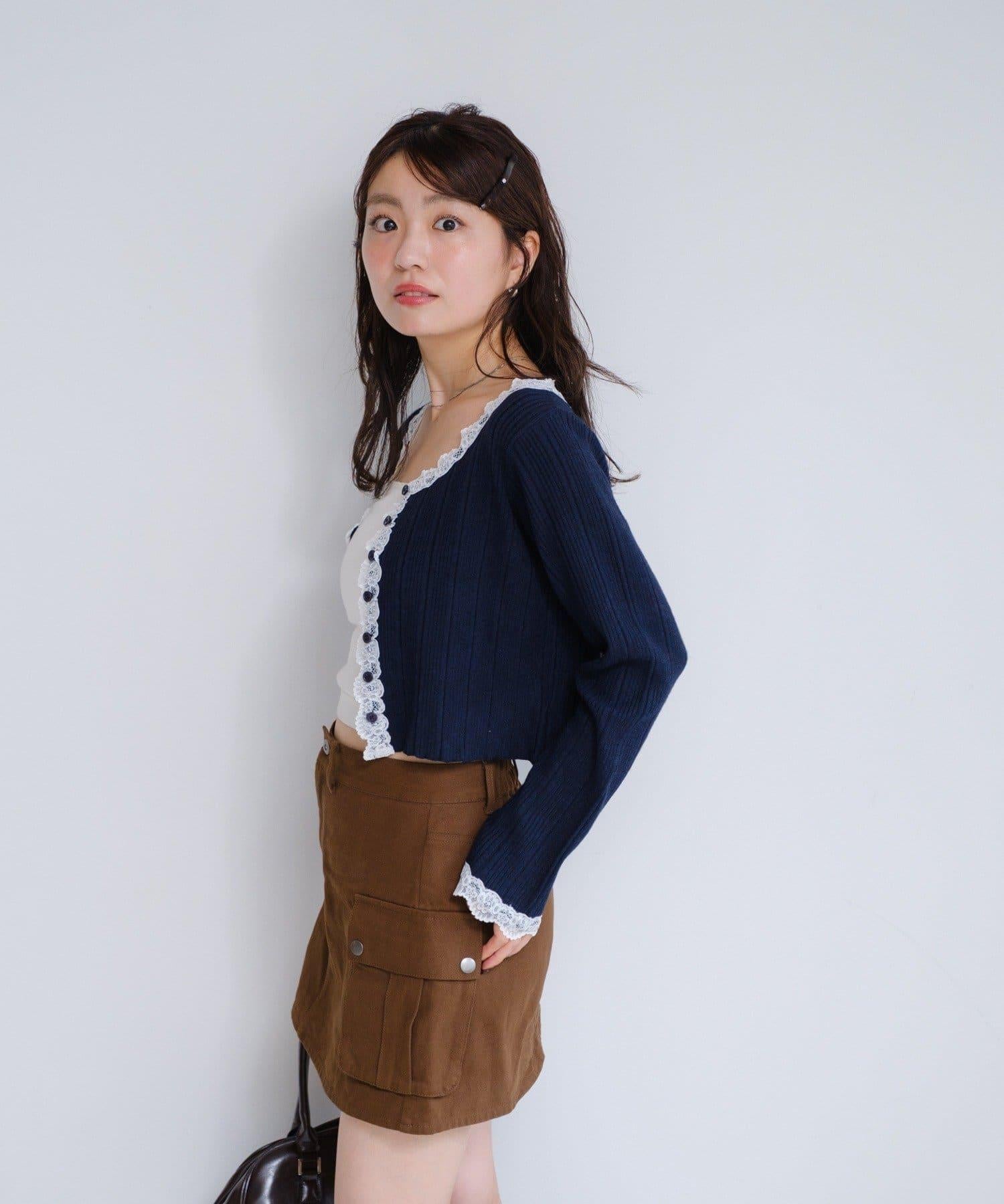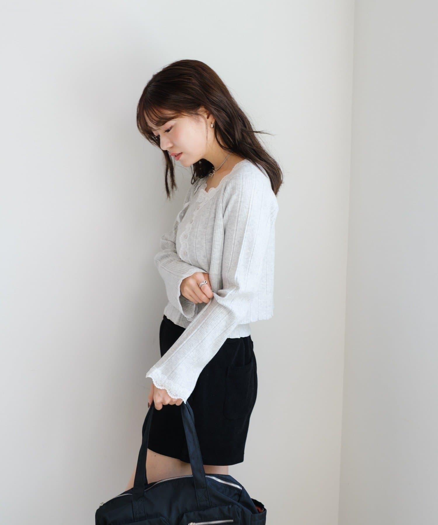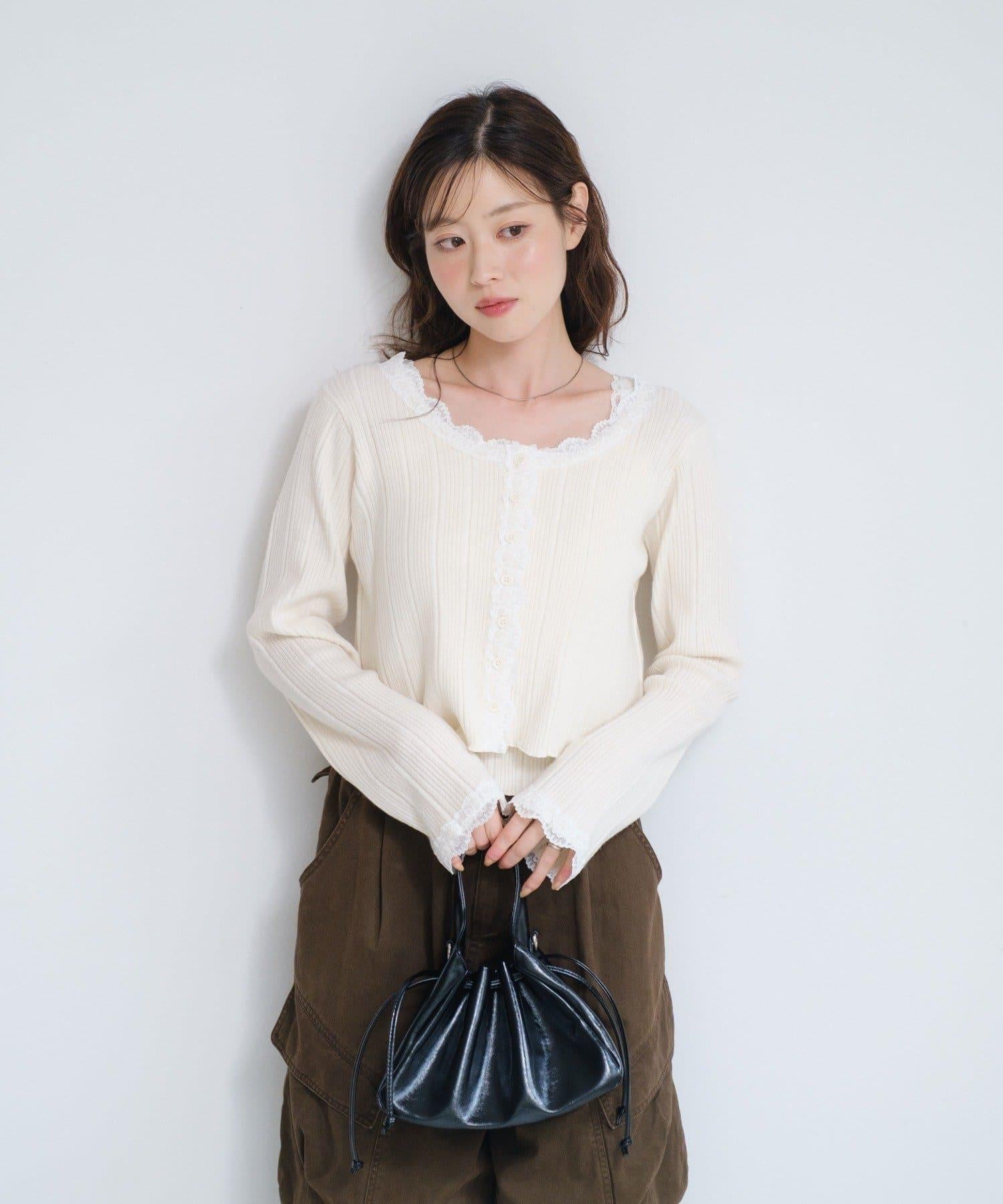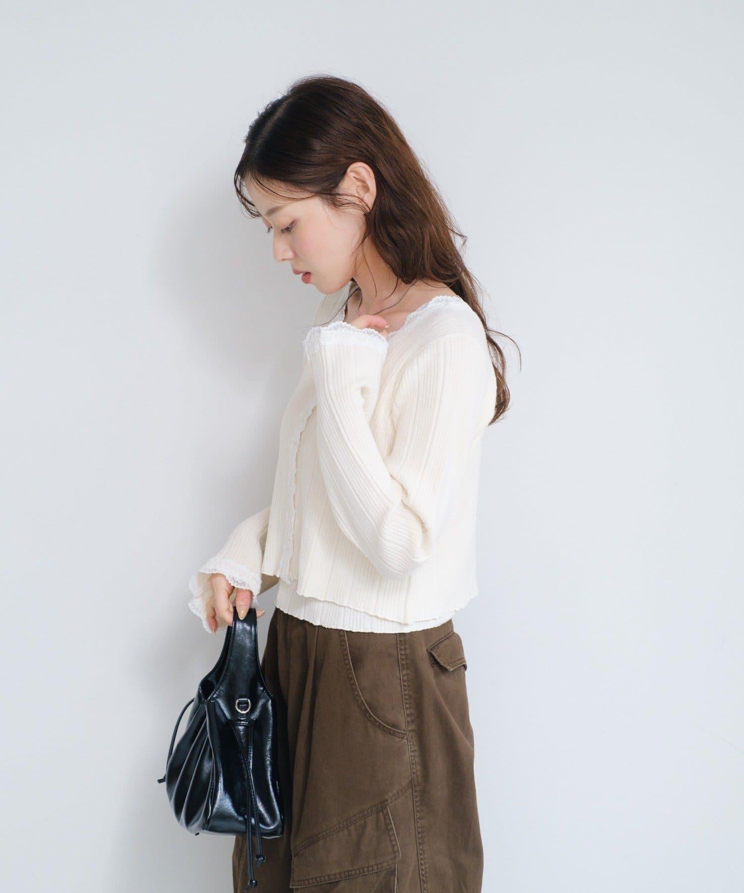 使用了精緻的蕾絲材料。如果與粗糙的表面摩擦,或被包、皮帶或尖銳的物品夾住,很容易飄起縷線,可能會被剪斷。請小心處理。