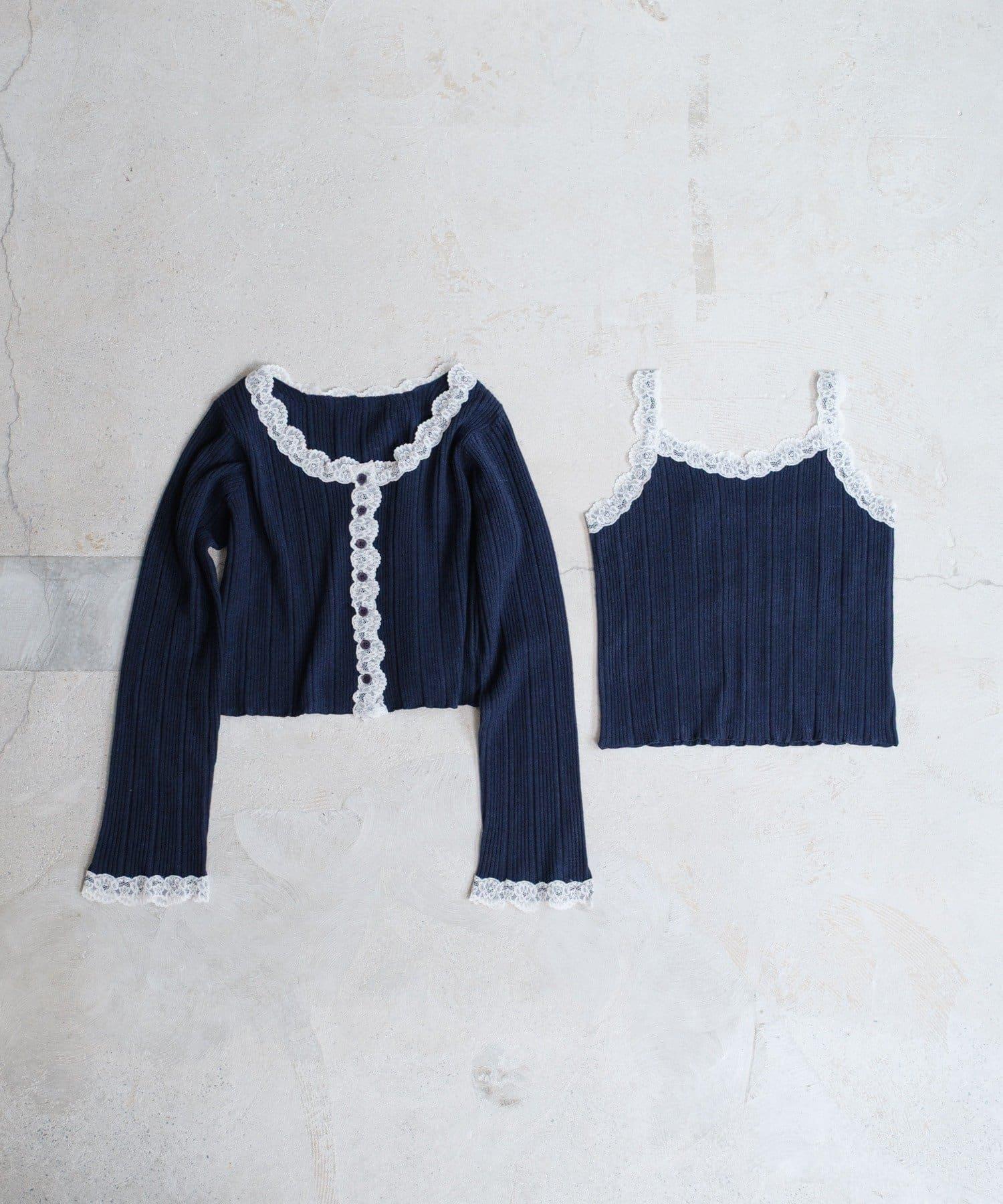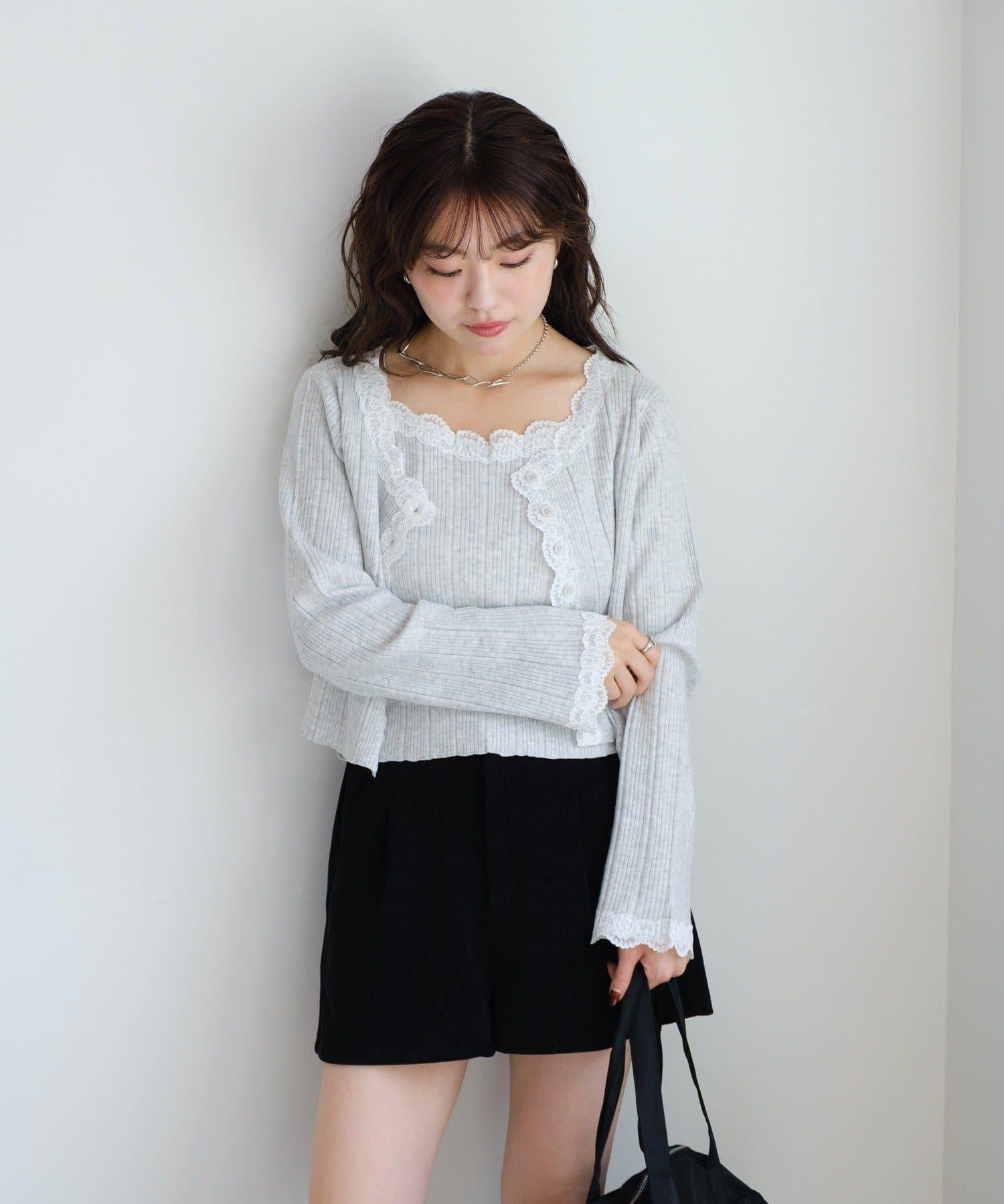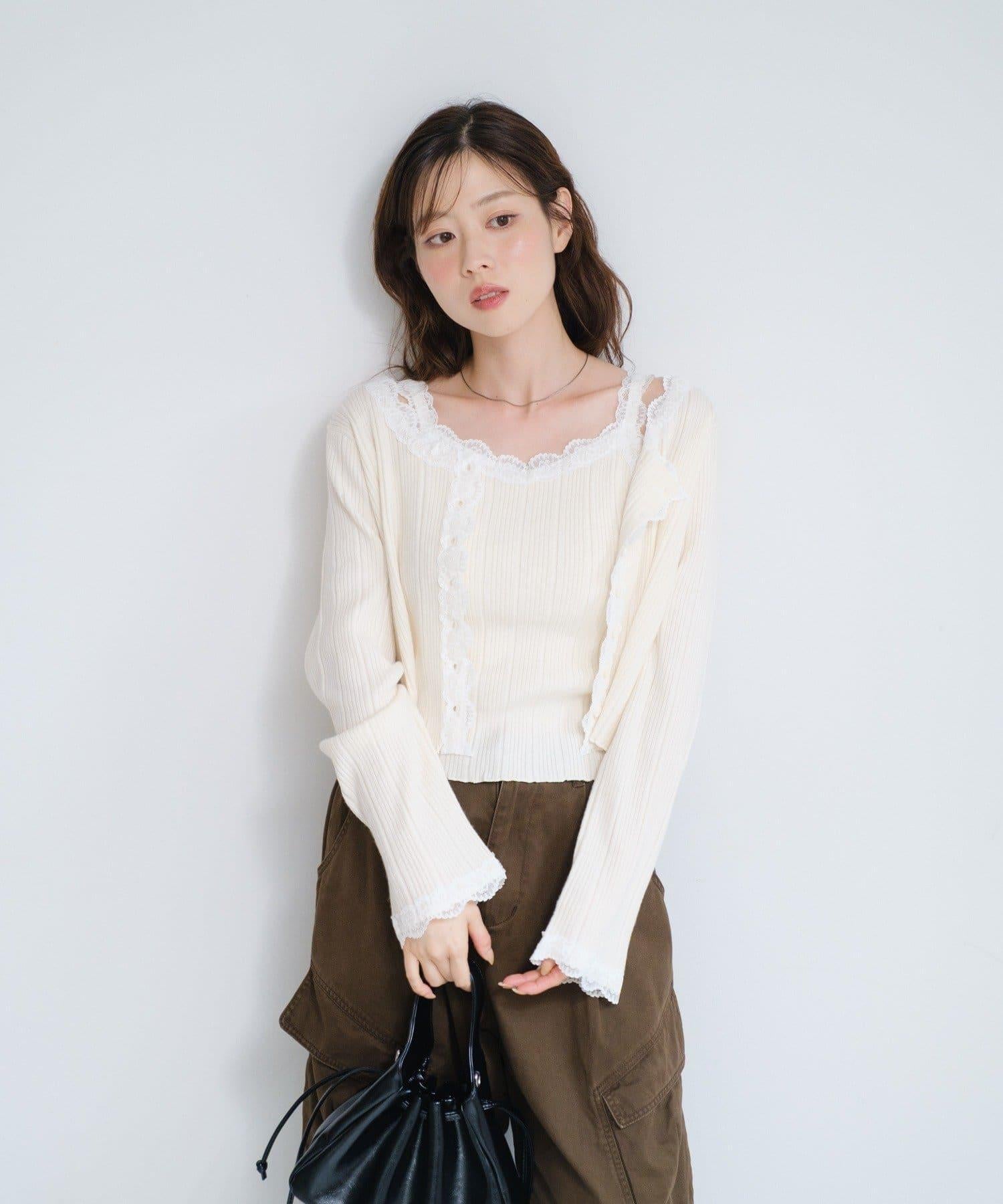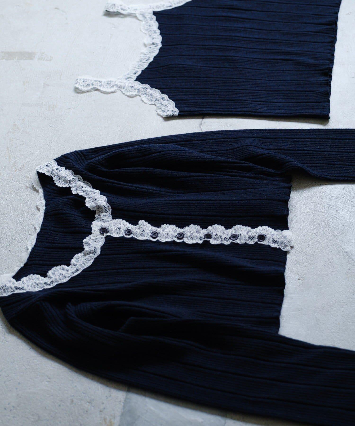 羅紋針織套裝帶有女性化的蕾絲外觀。