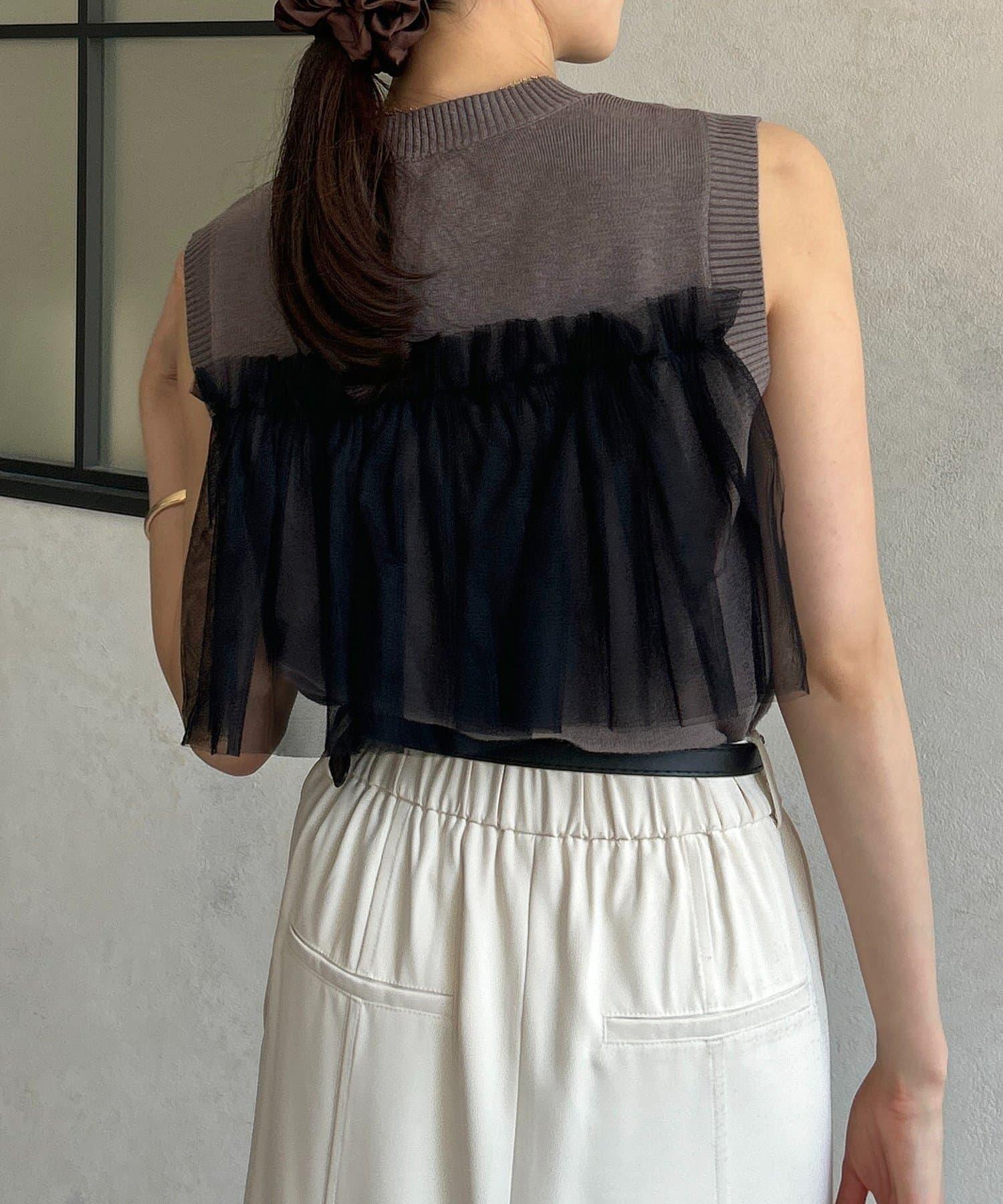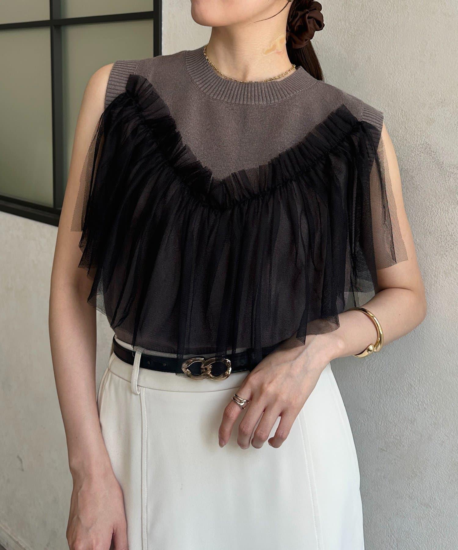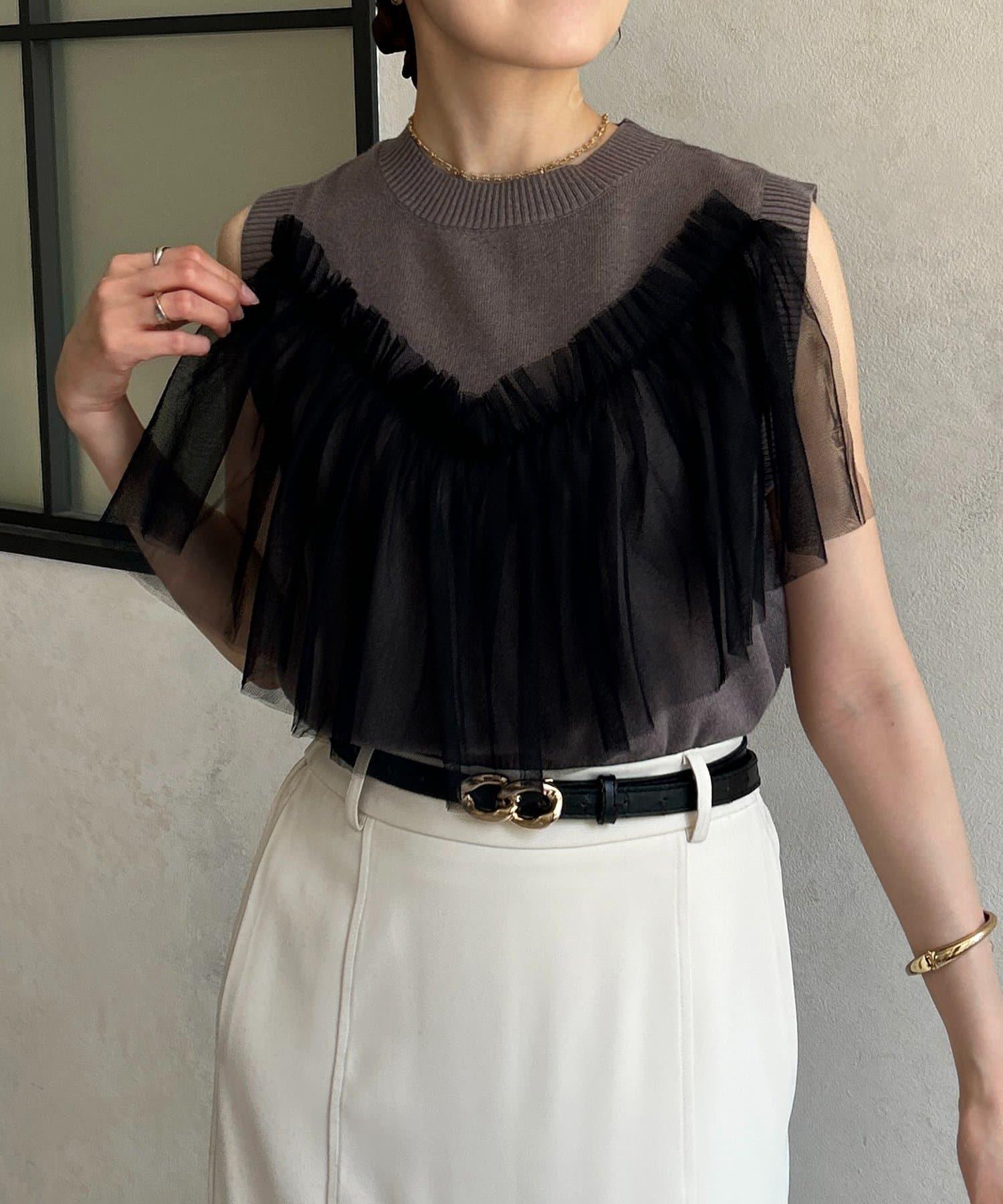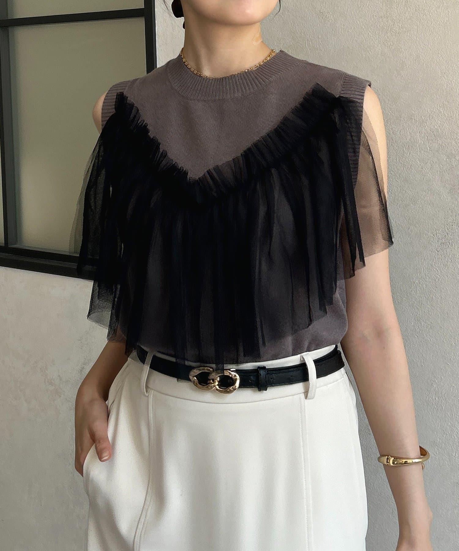 多層次針織搭配醒目的薄紗半身裙。