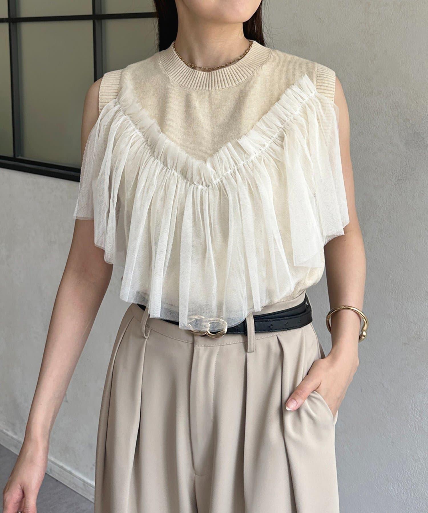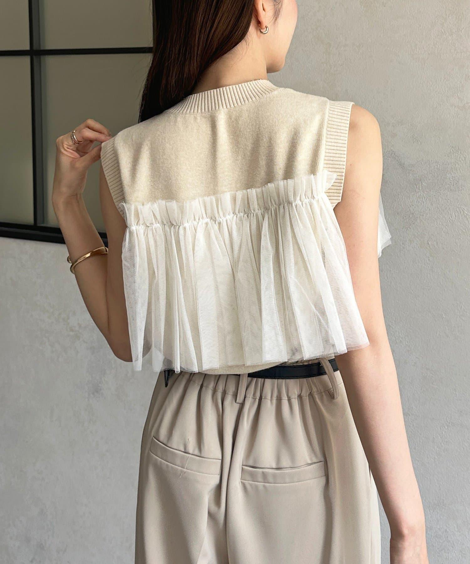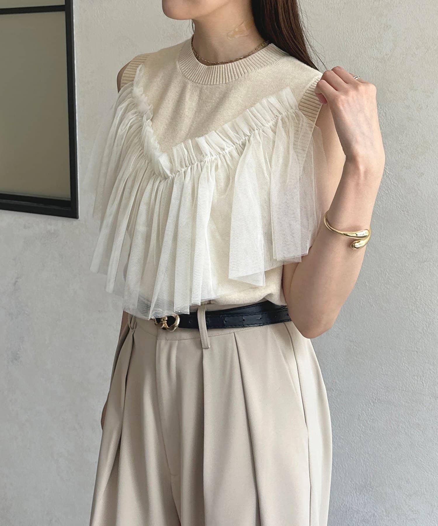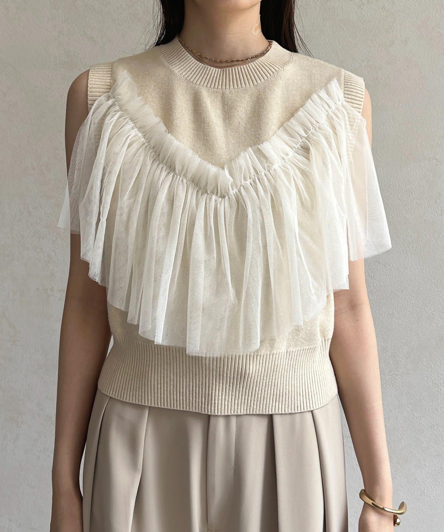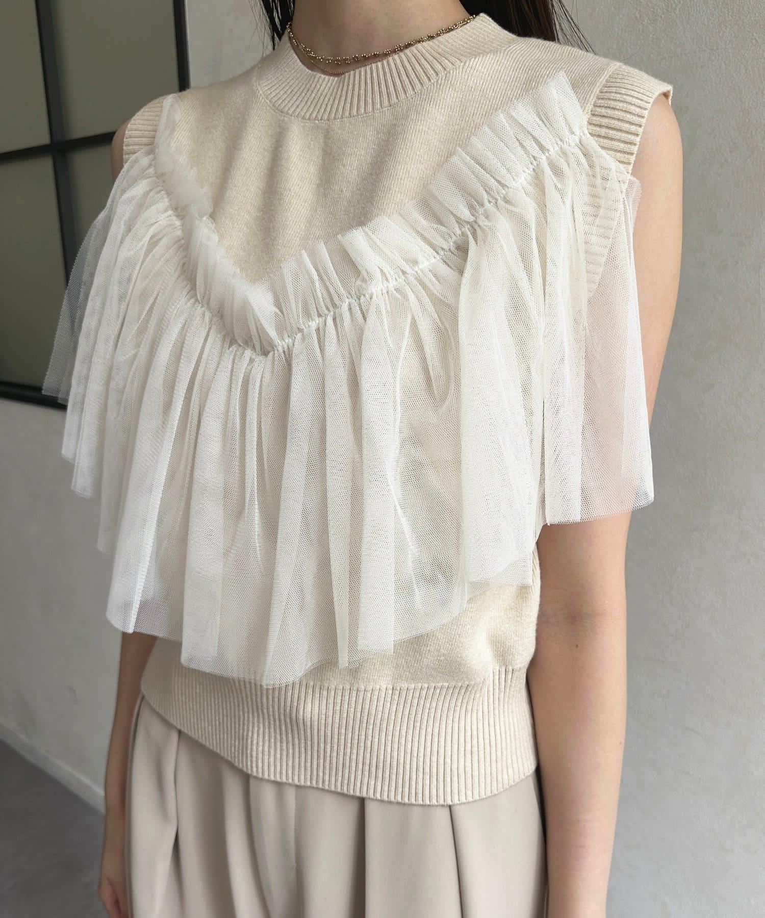 多層次針織搭配醒目的薄紗半身裙。