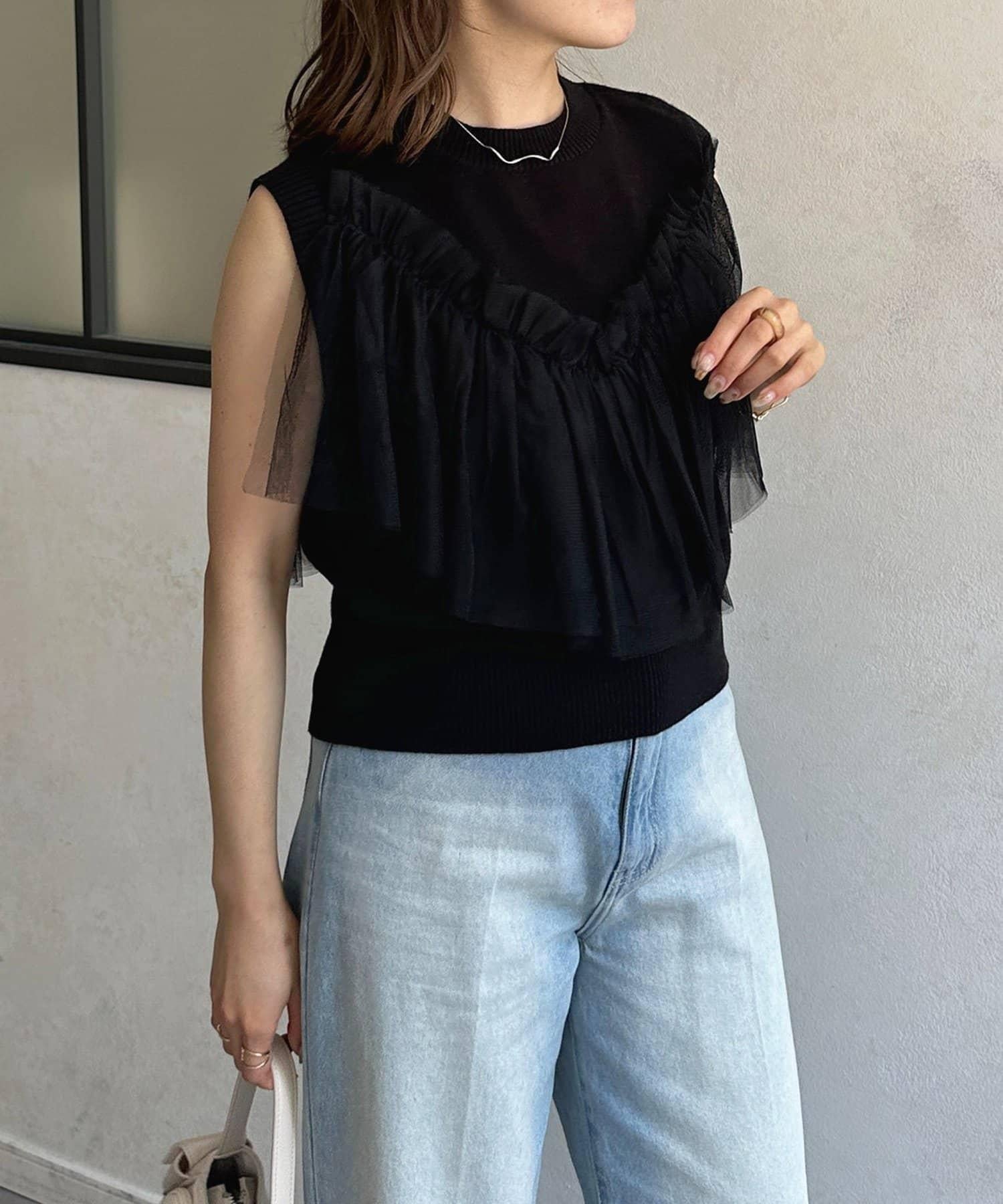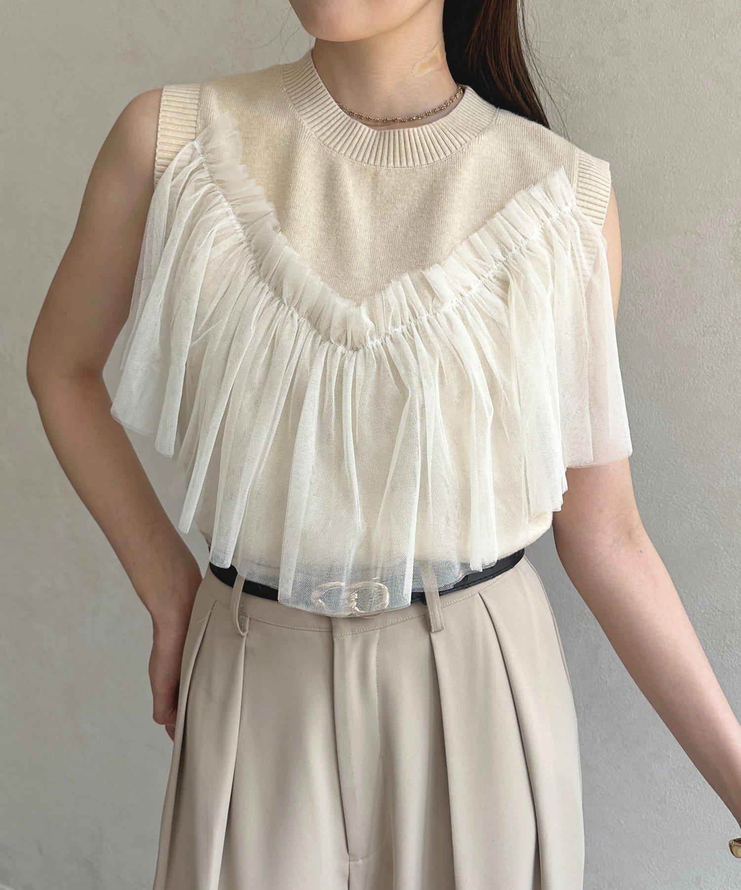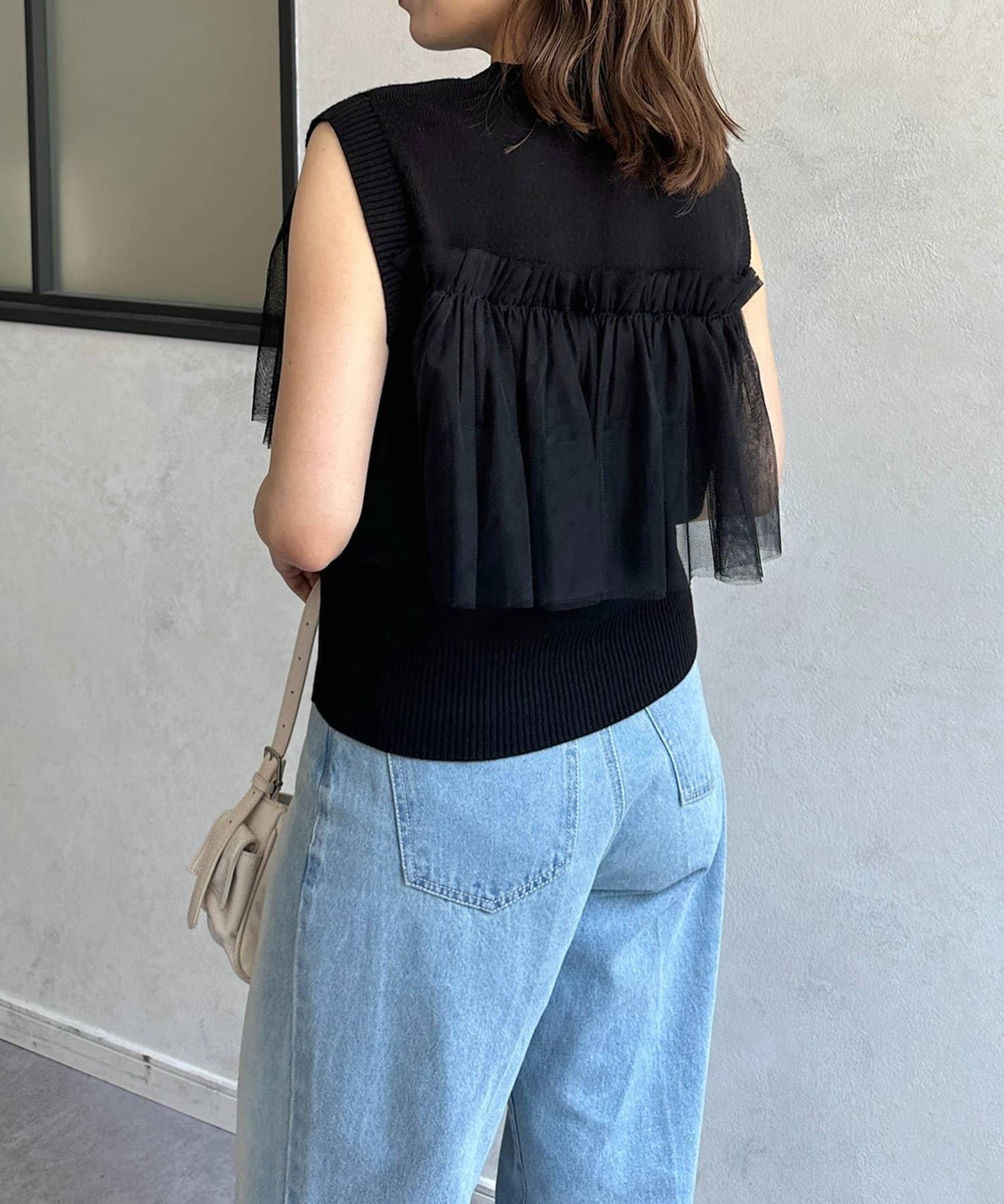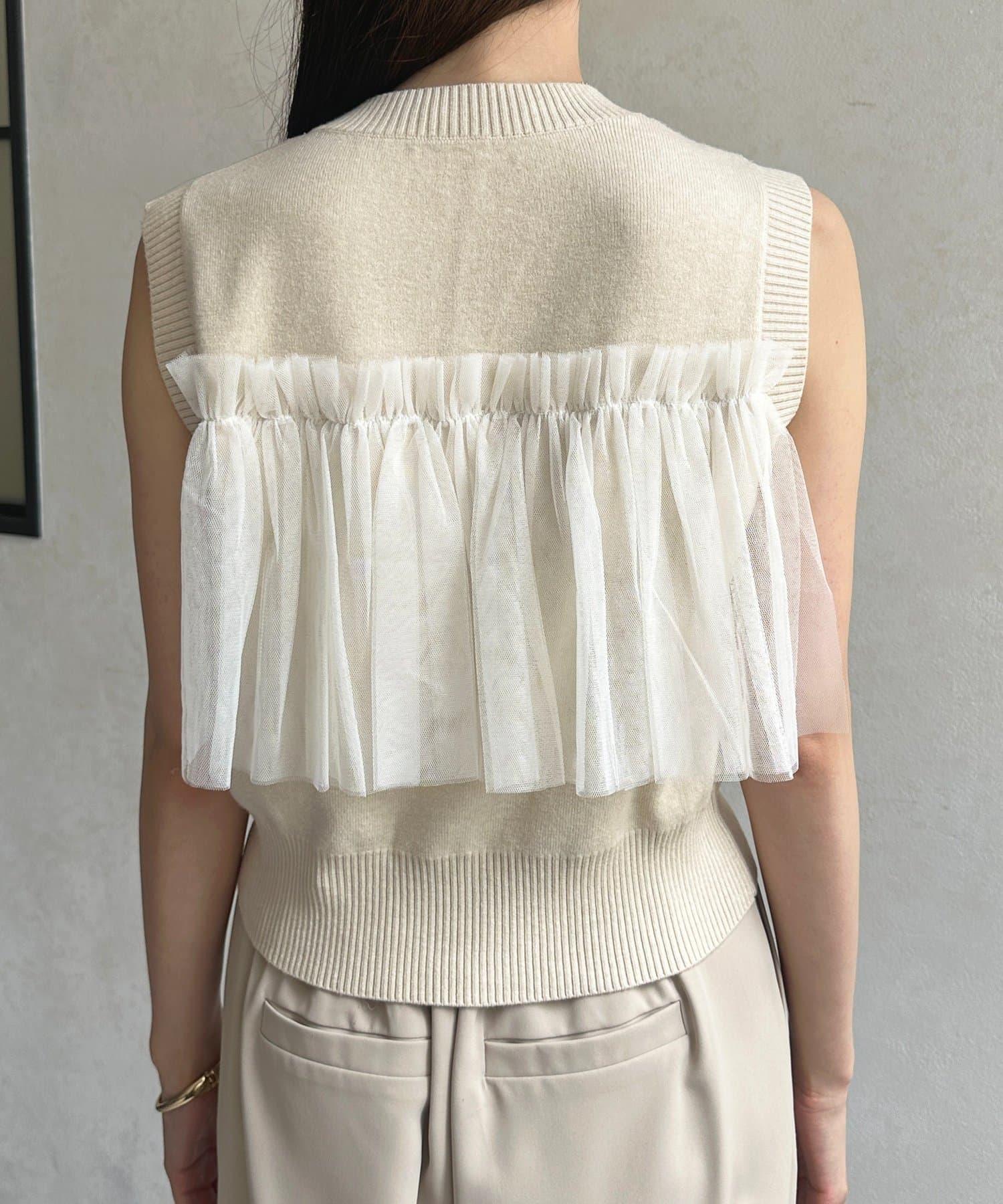 多層次針織搭配醒目的薄紗半身裙。