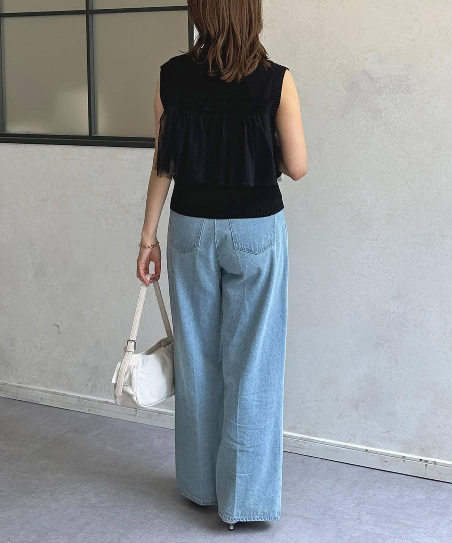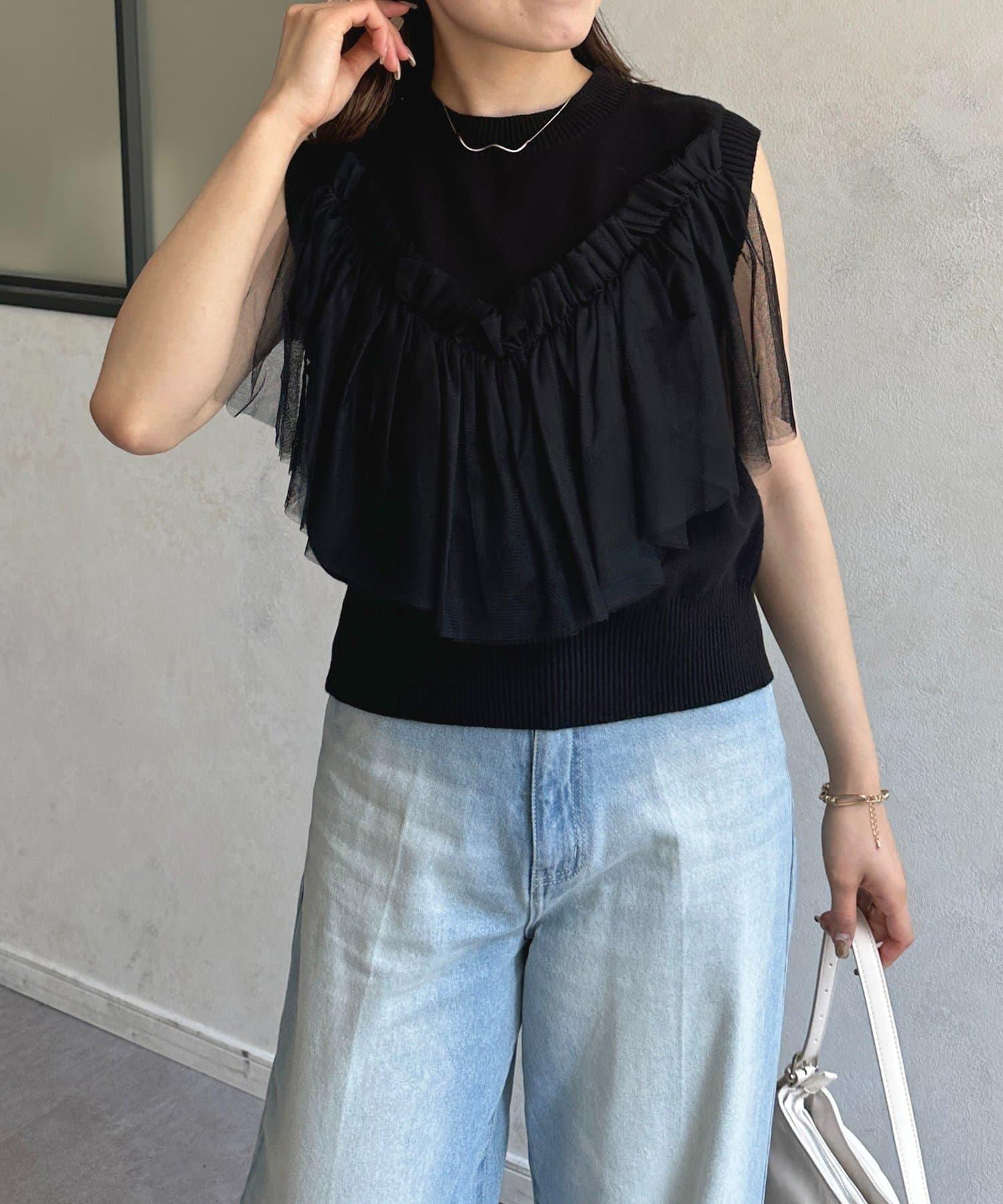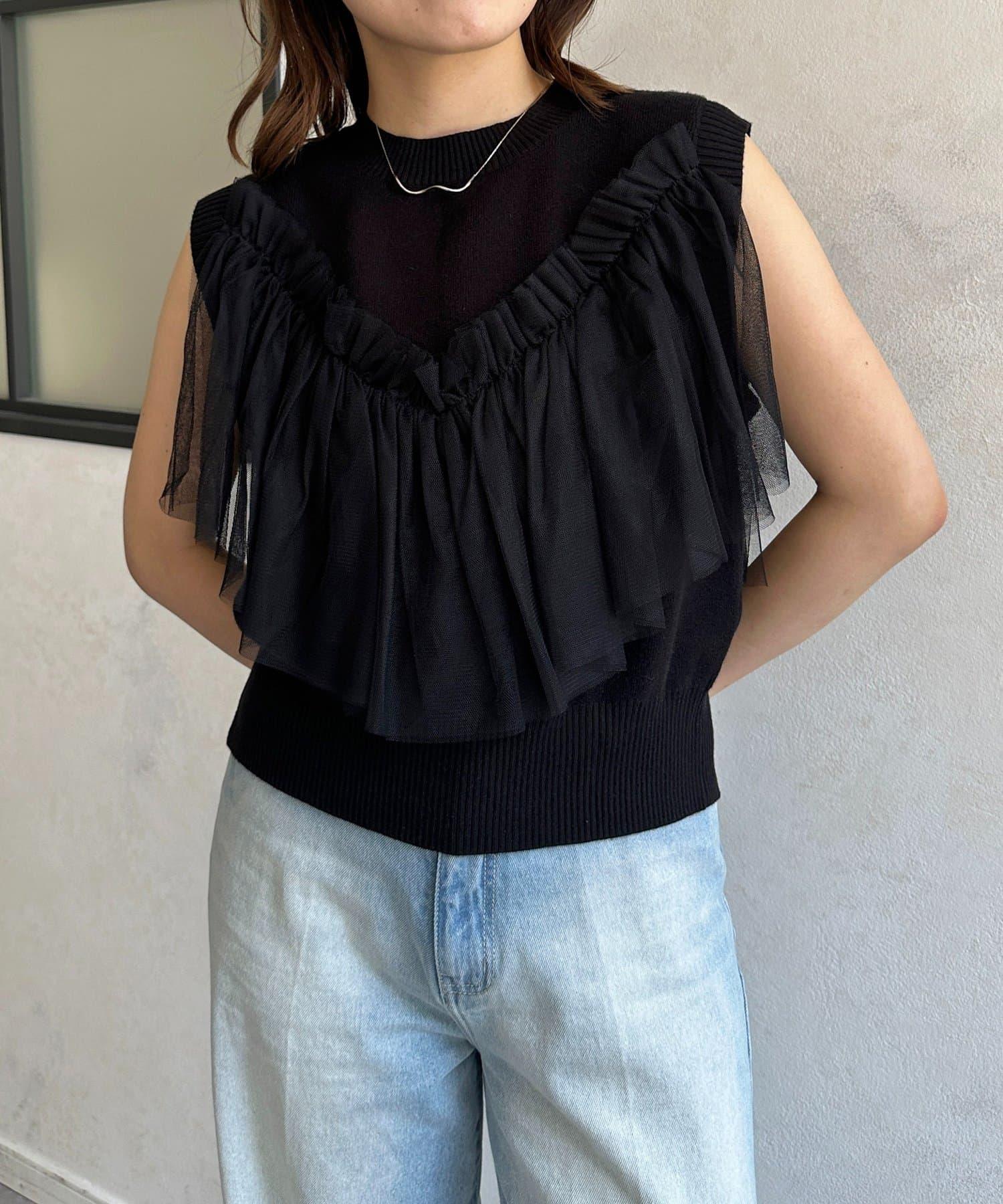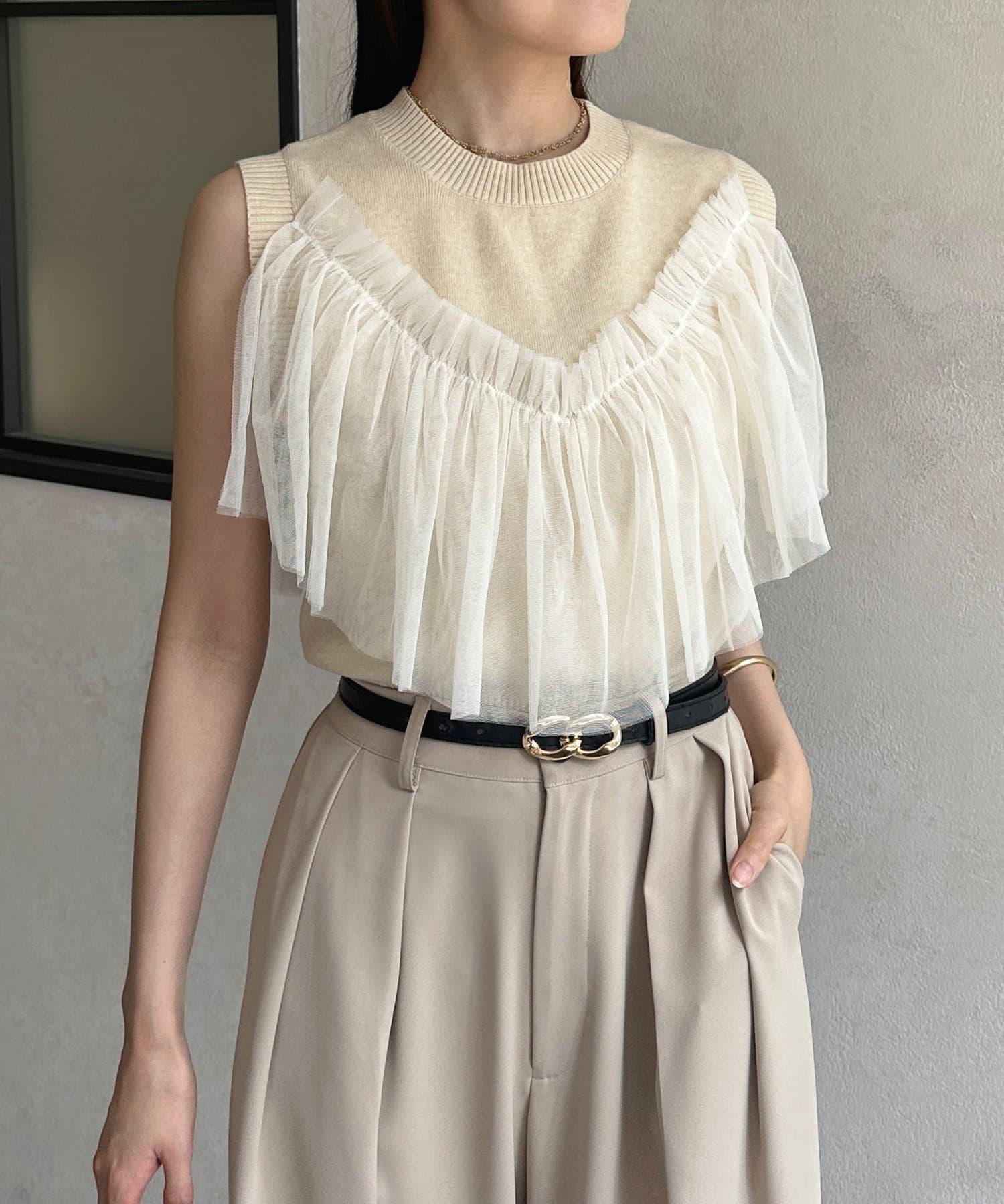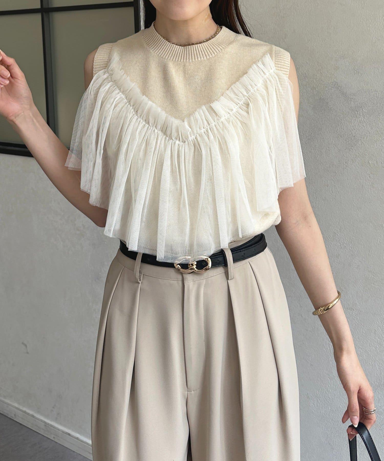 多層次針織搭配醒目的薄紗半身裙。