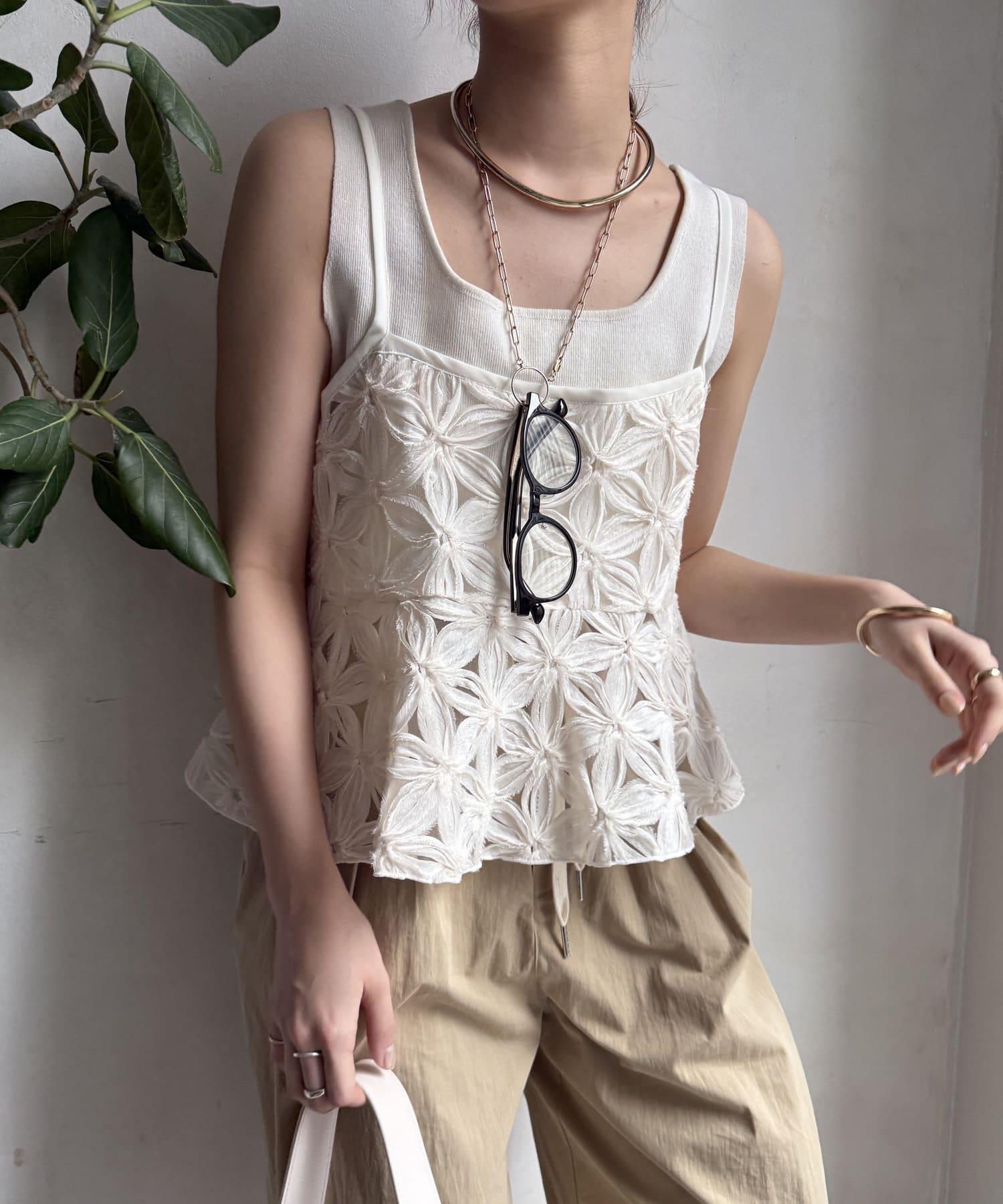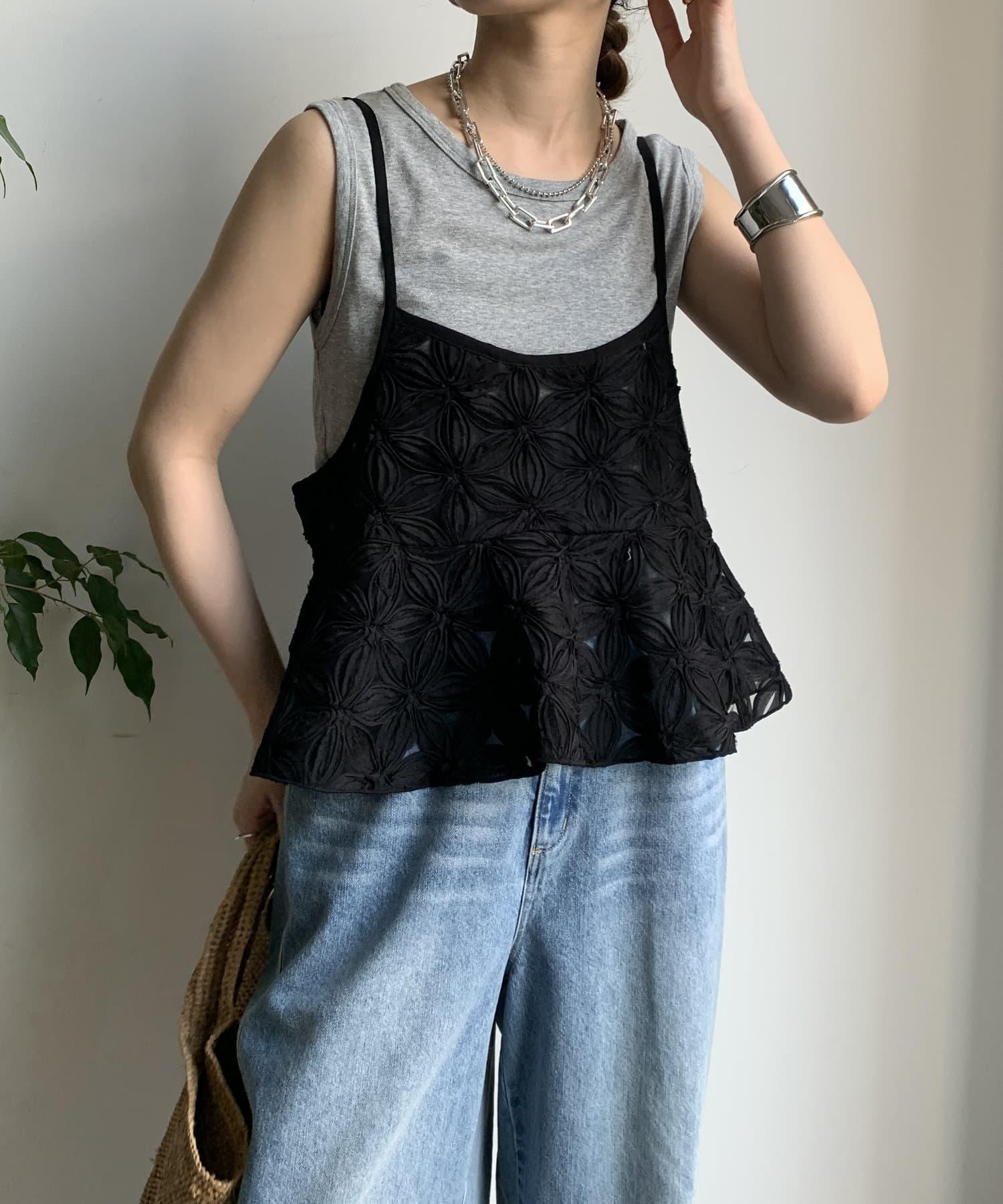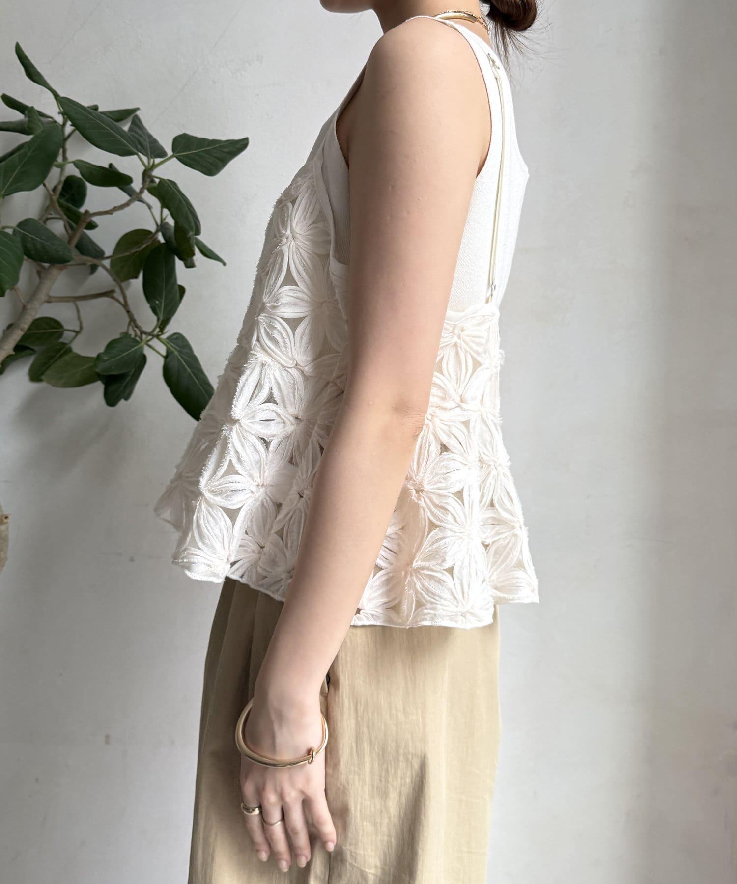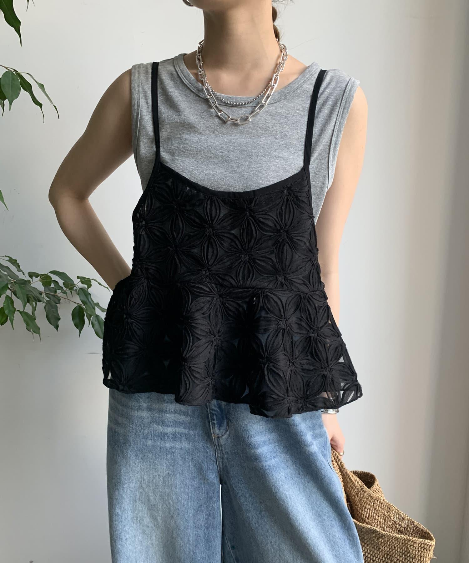 華麗精緻的吊帶背心,薄紗上有花朵圖案。