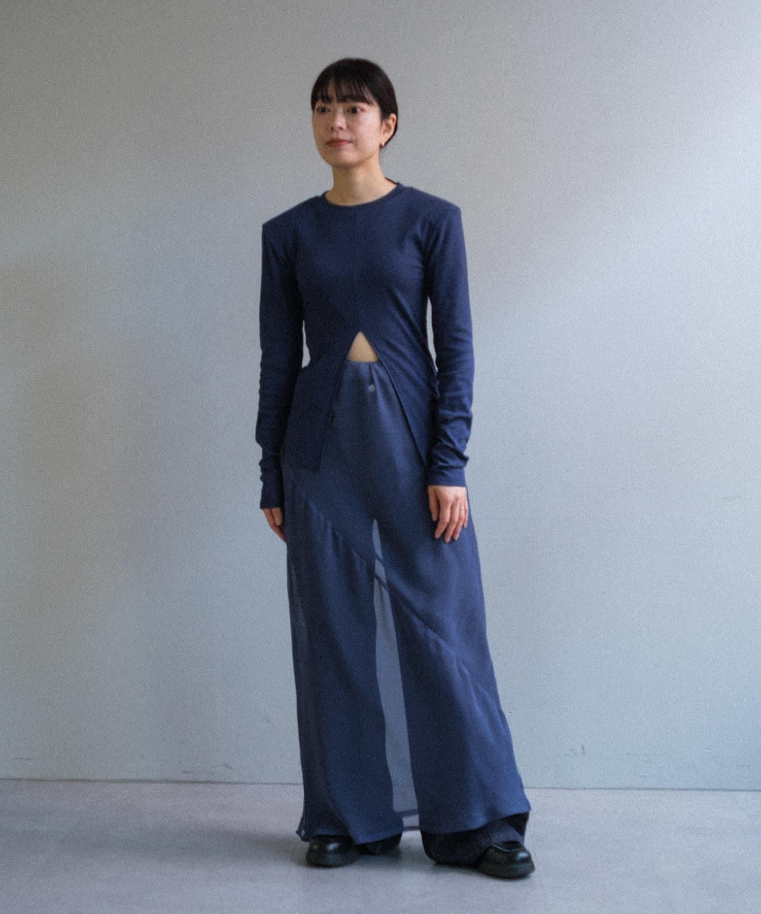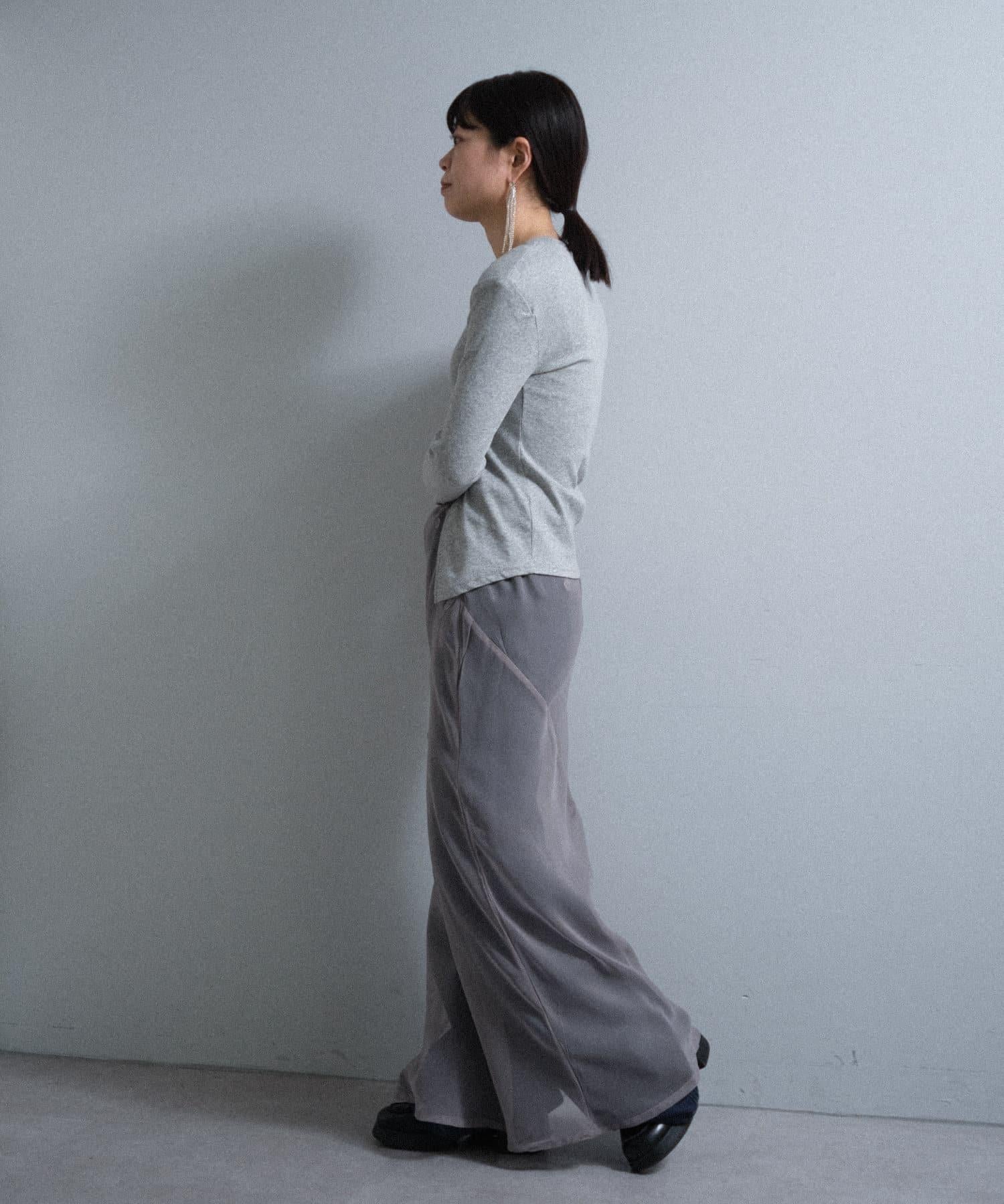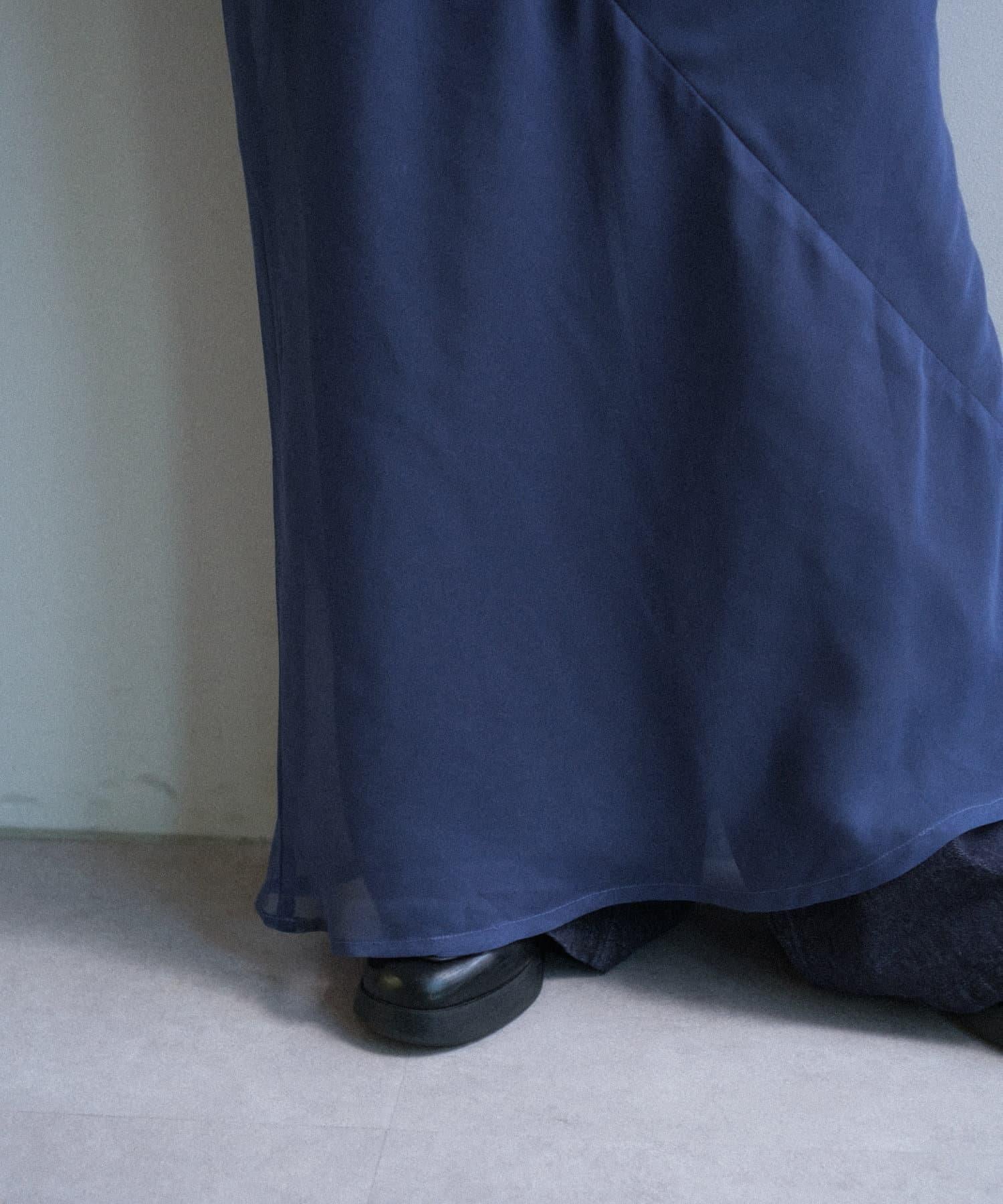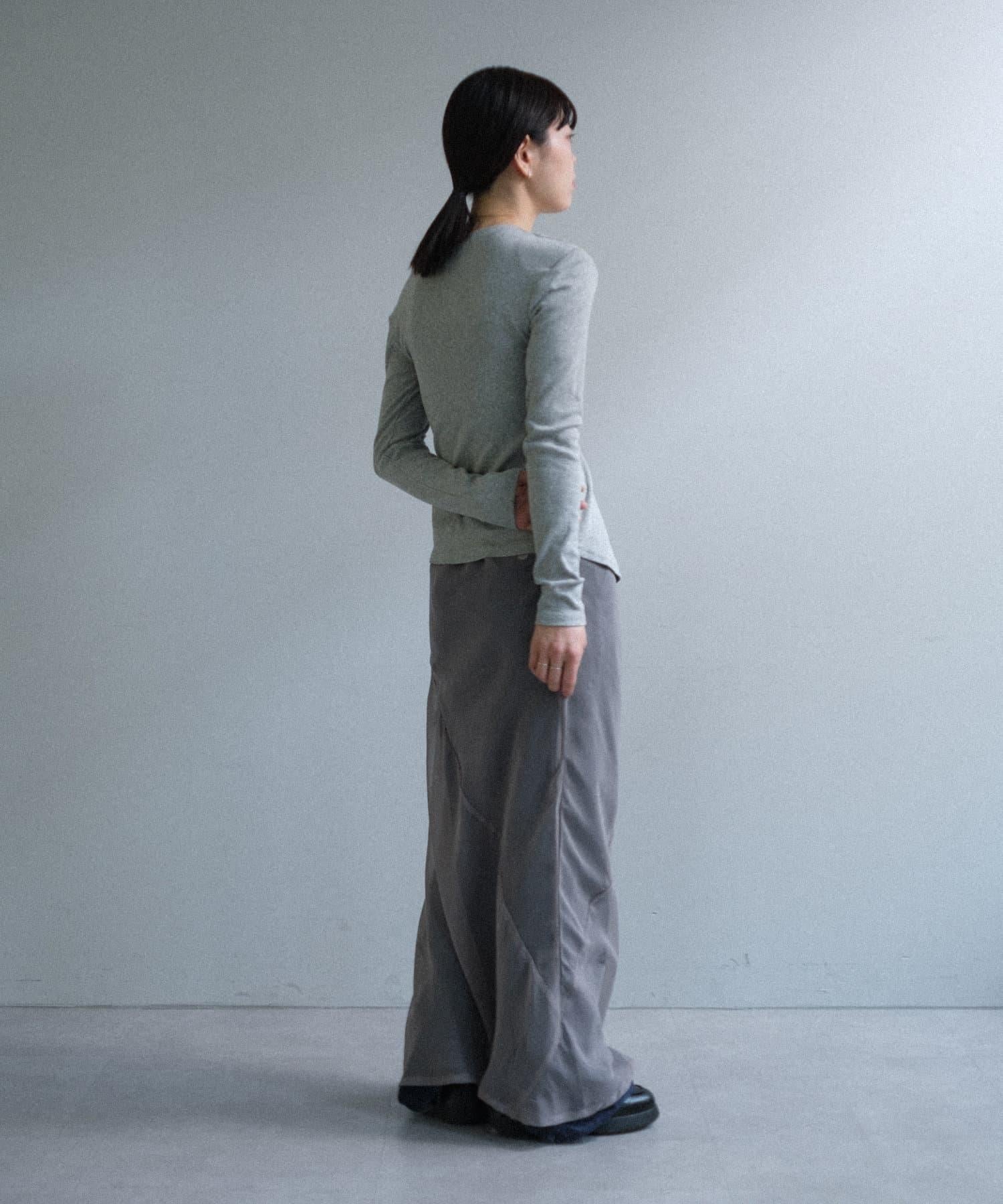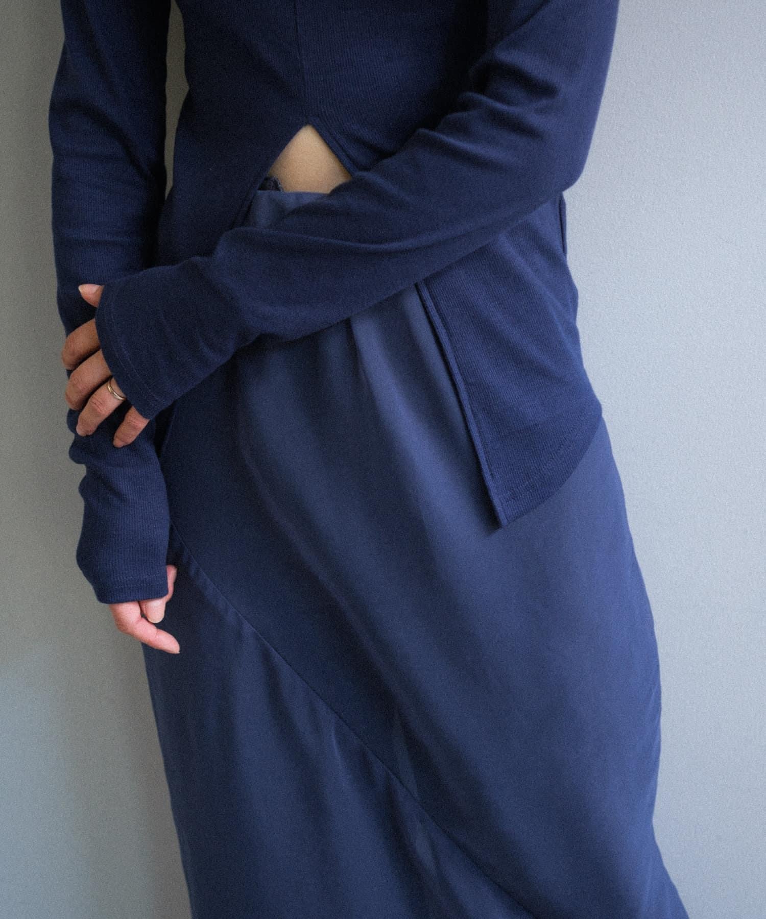 我喜歡這條裙子的原因是它穿著時優美的廓形。通過使用與面料成一定角度過渡的下方面料,一側的下襬輕輕落下,形成自然的喇叭形。與形成人魚廓形相比,它不會變得過分優雅,動感細膩,閃閃發光。僅憑這一點,就能讓腿部線條變得優美,給人眼前一亮的感覺,所以這是一個適度但不可改變的推薦點。