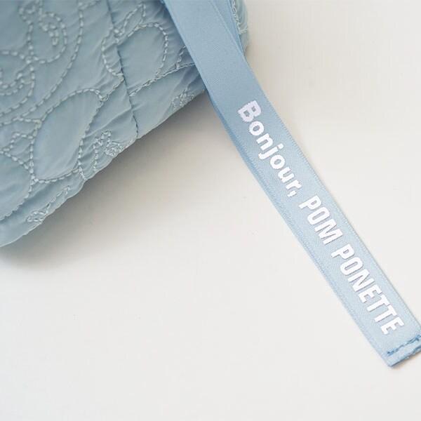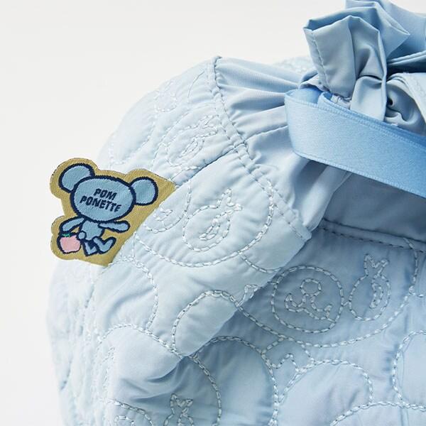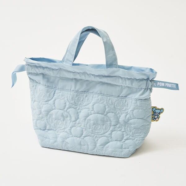 清新藍色的迷你手提包,帶有可愛的抽繩設計。可愛的設計上印有薄荷君和薄荷君👍喜歡的食物--蘋果的絎縫圖案。