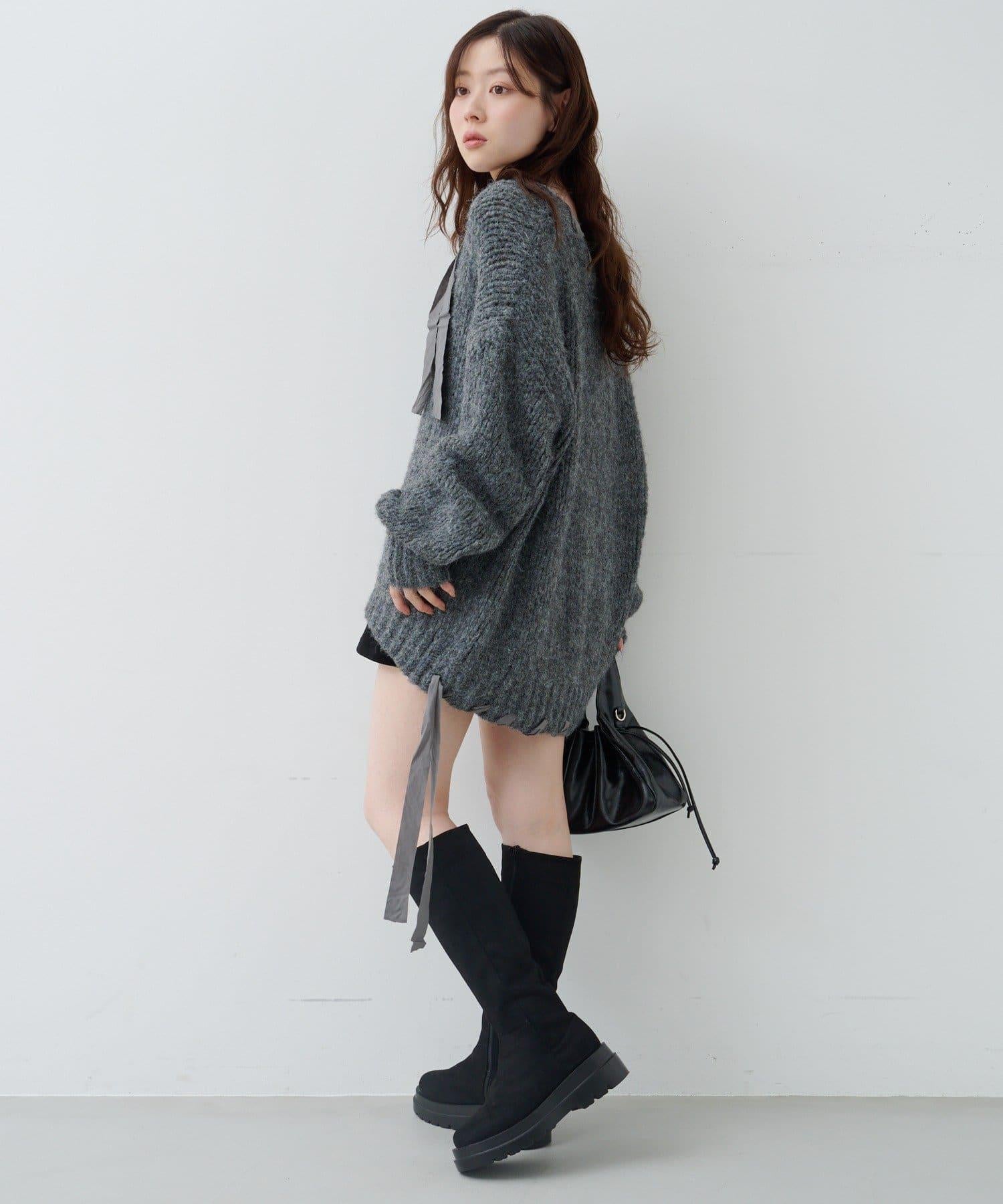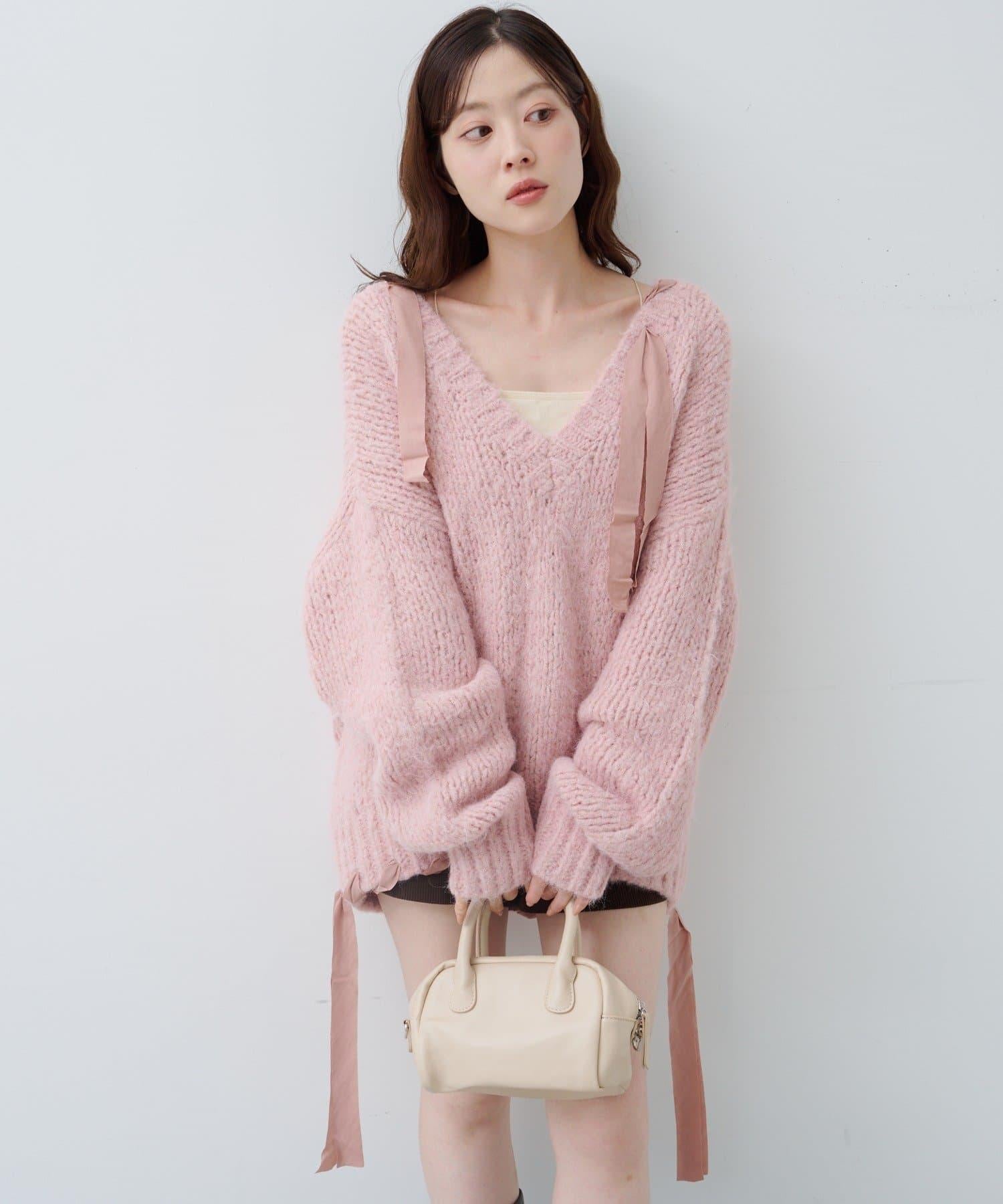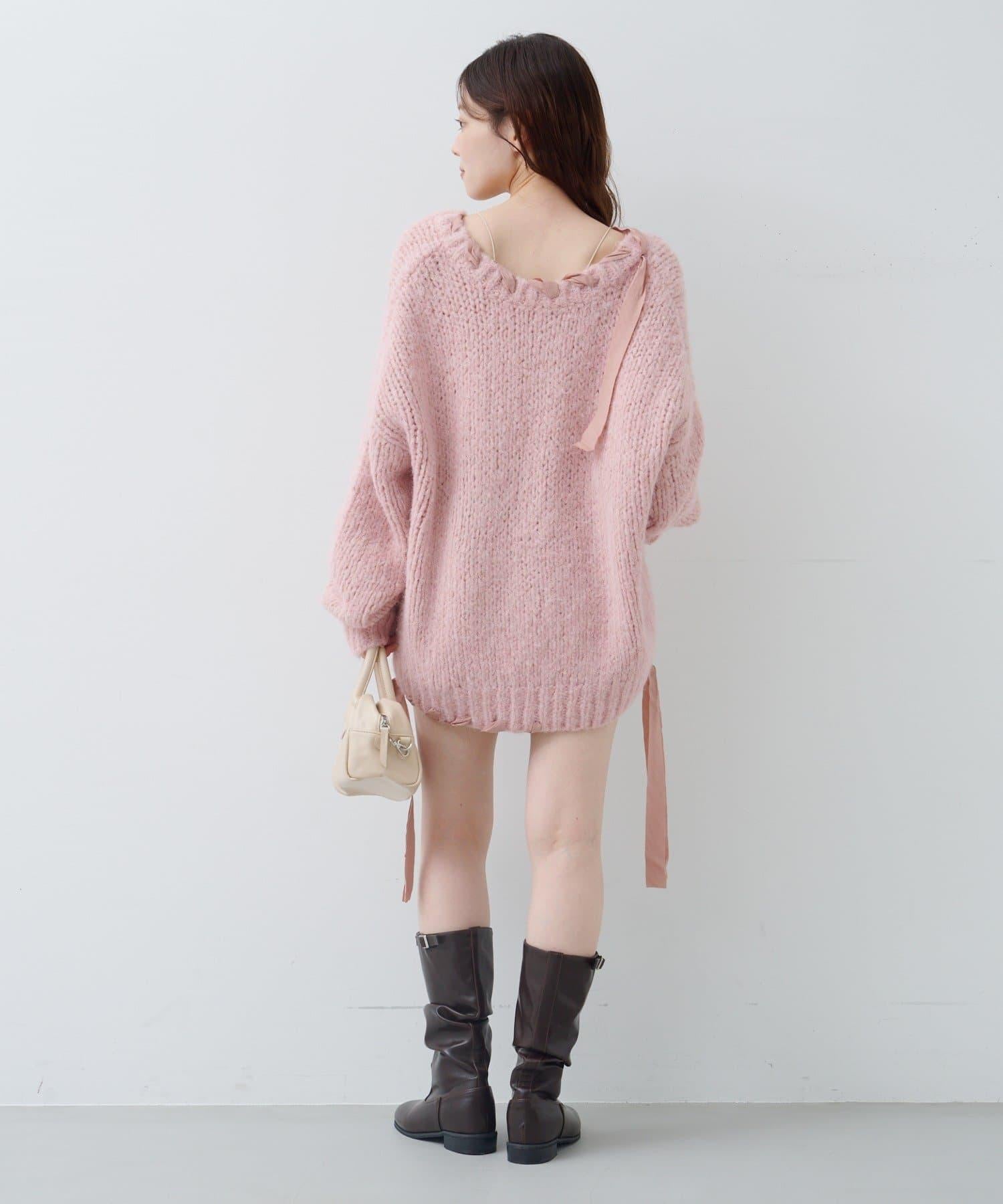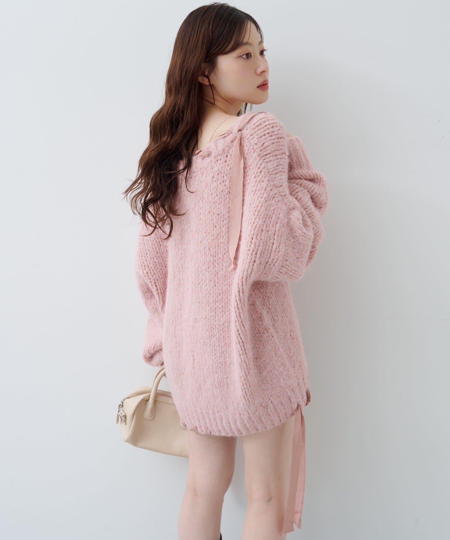 低針距針織衫,寬鬆剪裁,緞帶裝飾細節。
