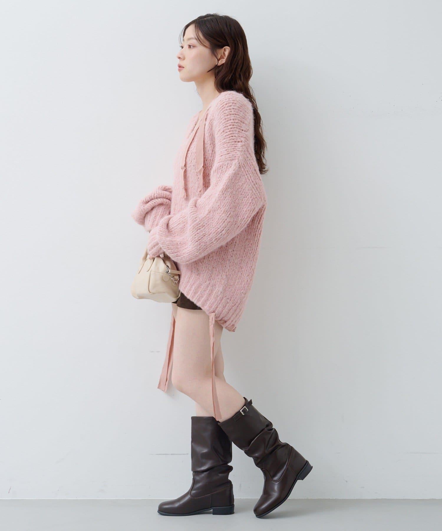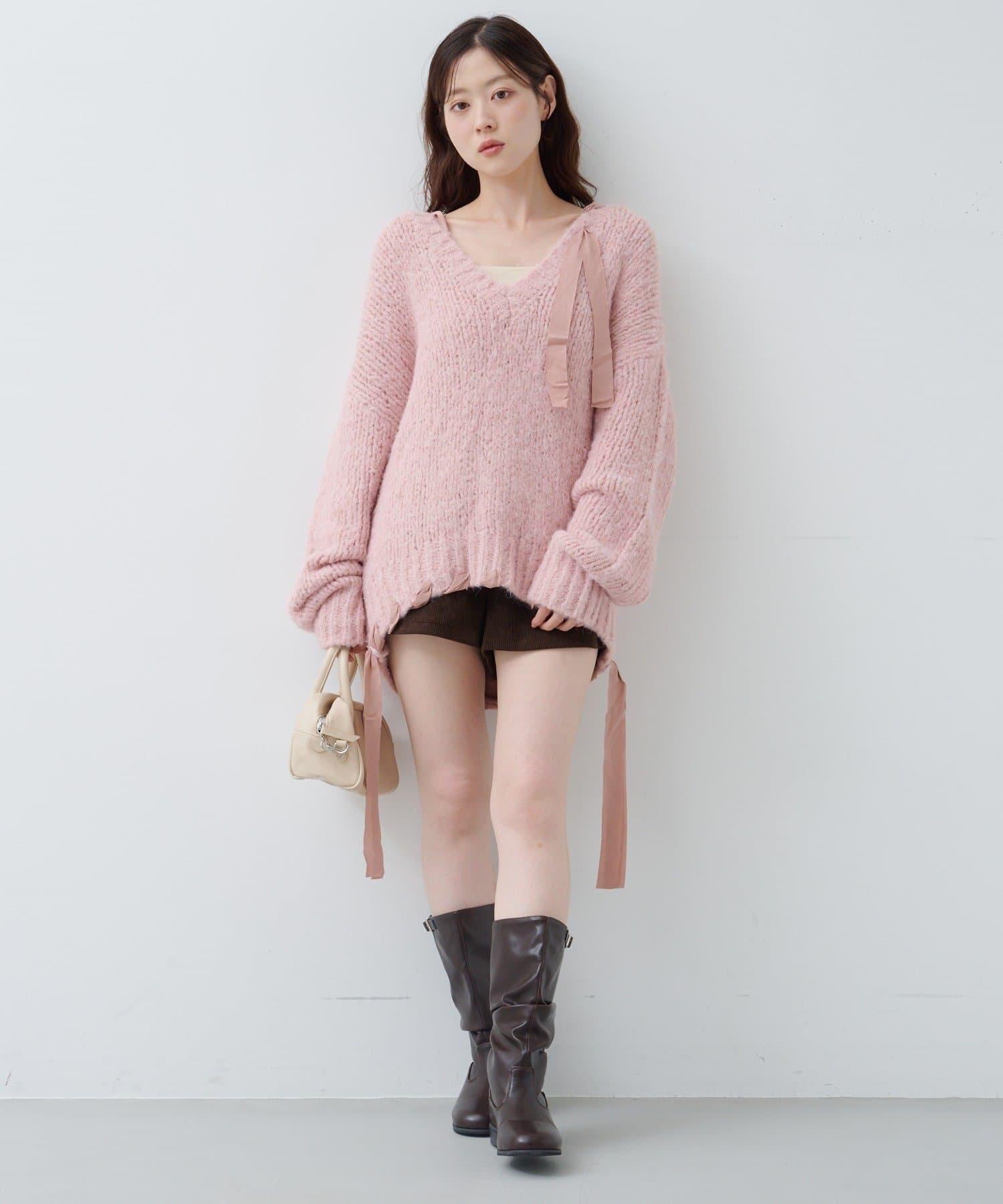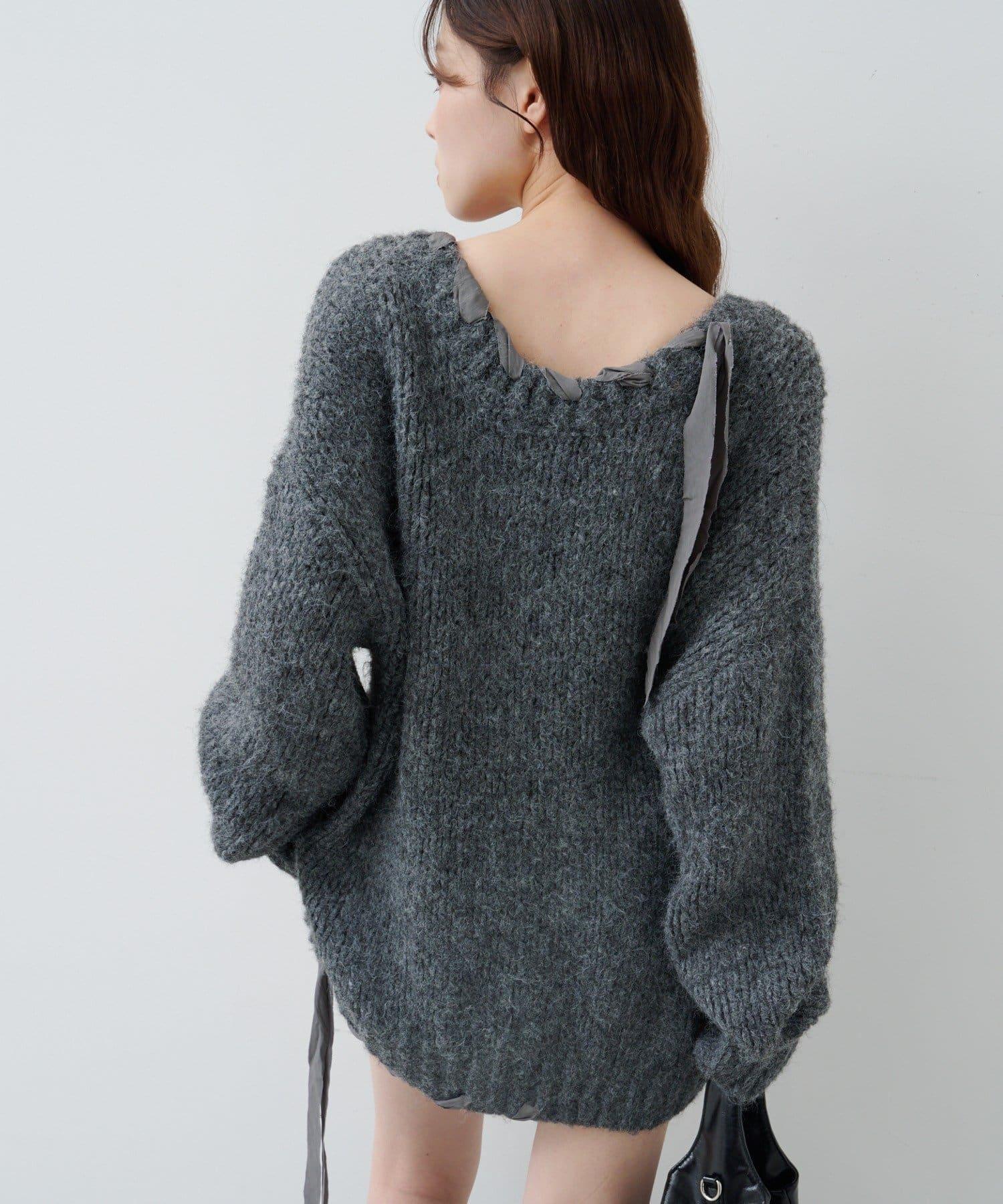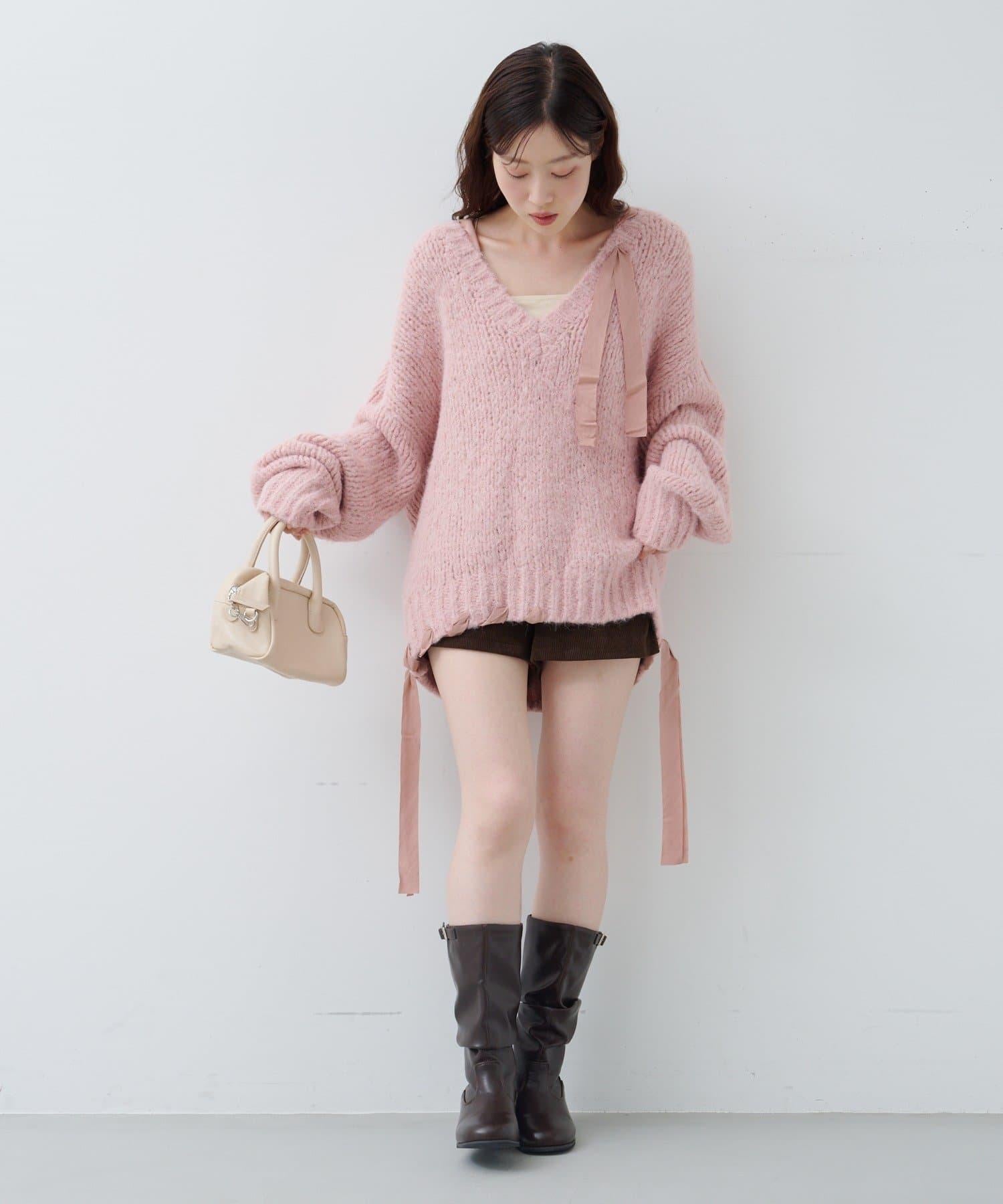 低針距針織衫,寬鬆剪裁,緞帶裝飾細節。