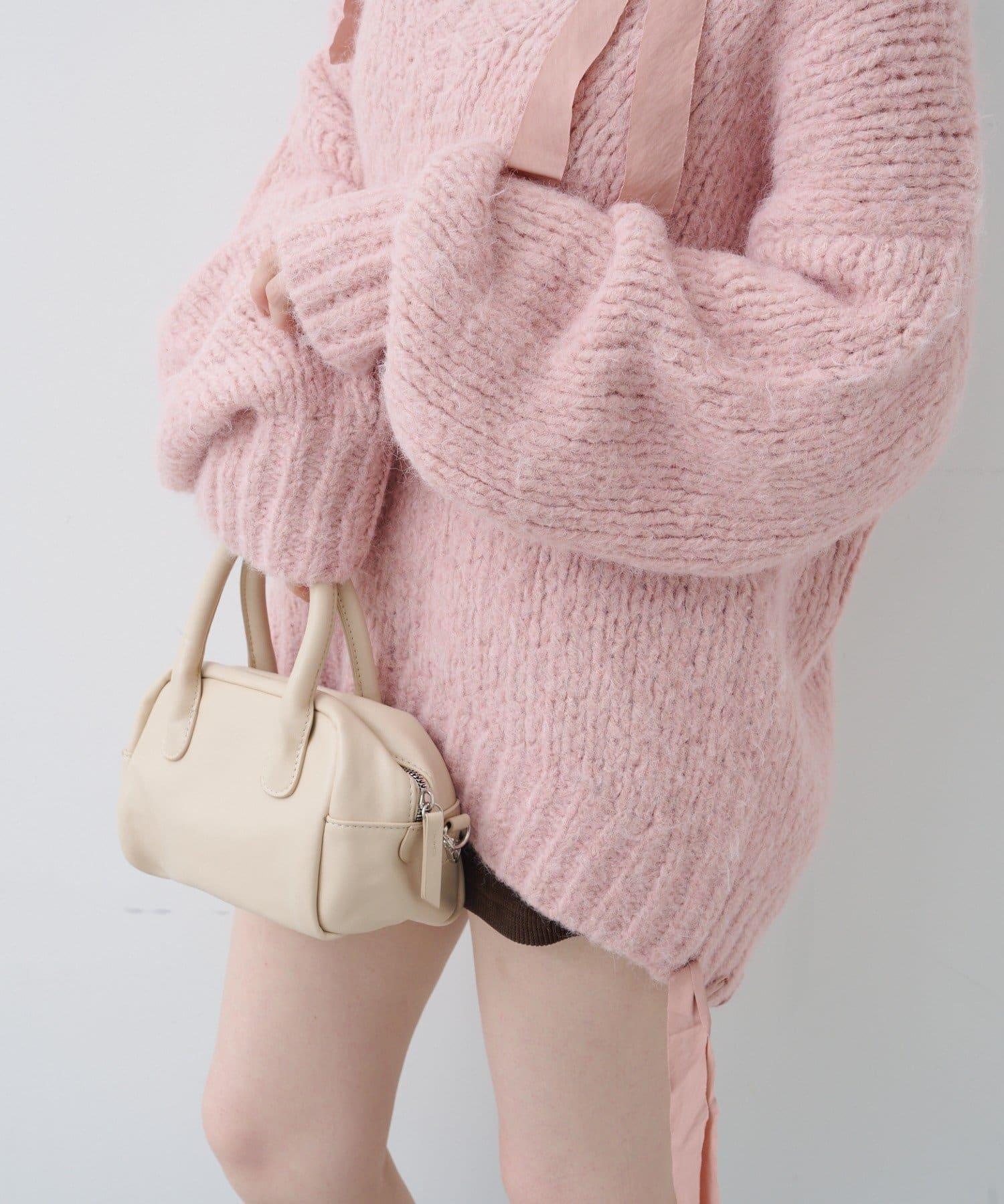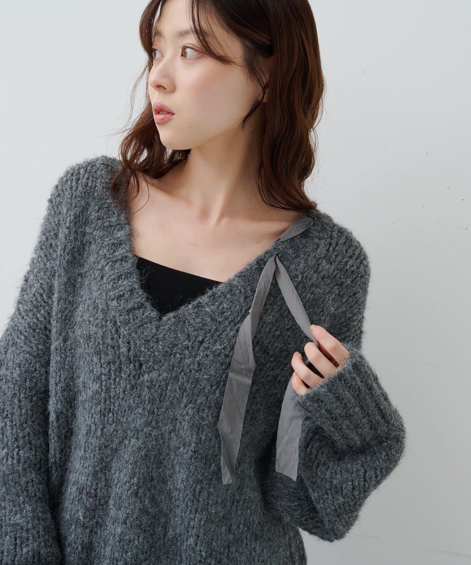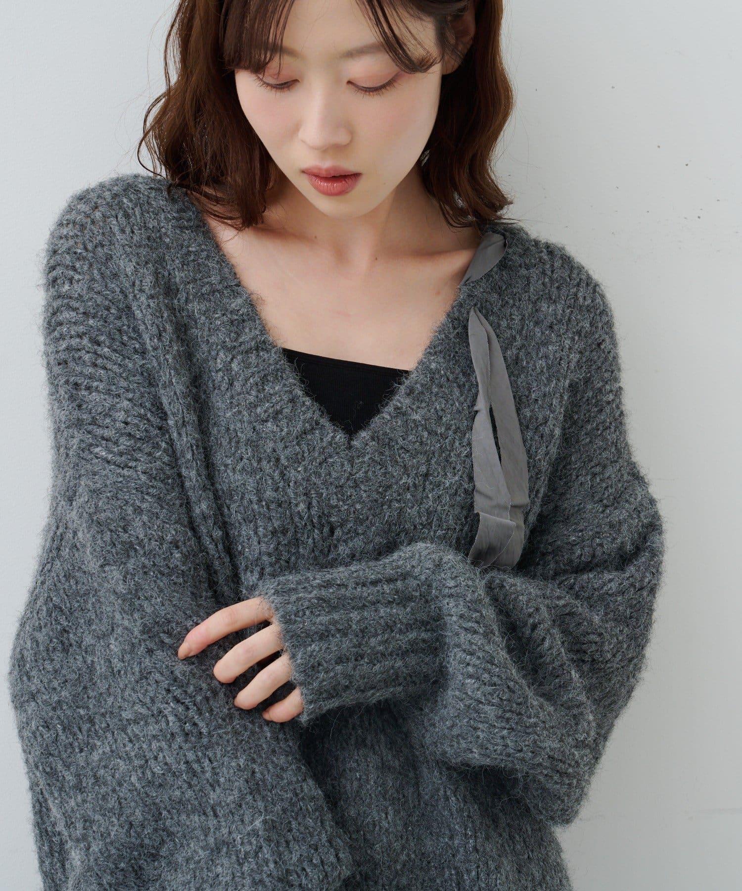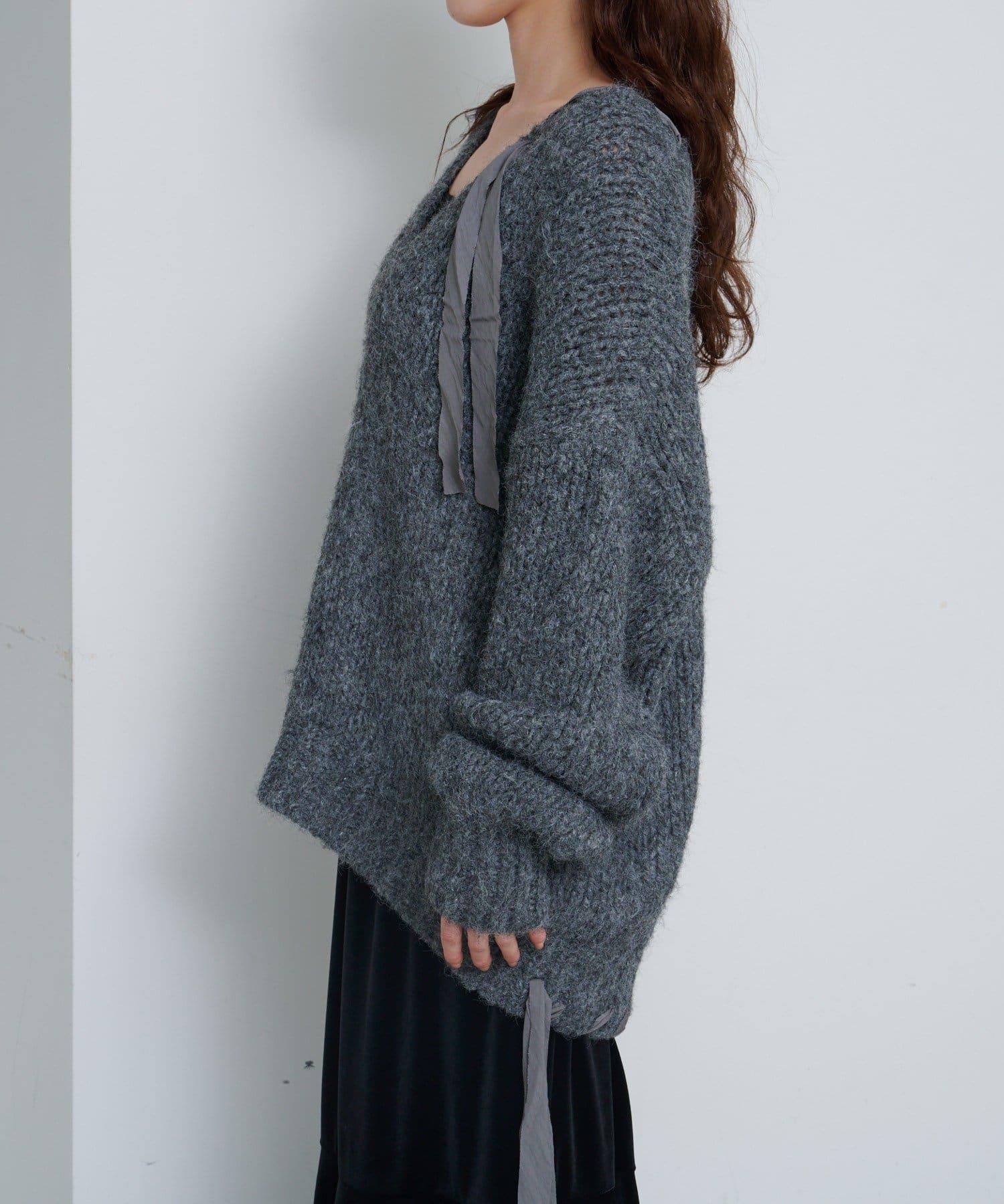 低針距針織衫,寬鬆剪裁,緞帶裝飾細節。