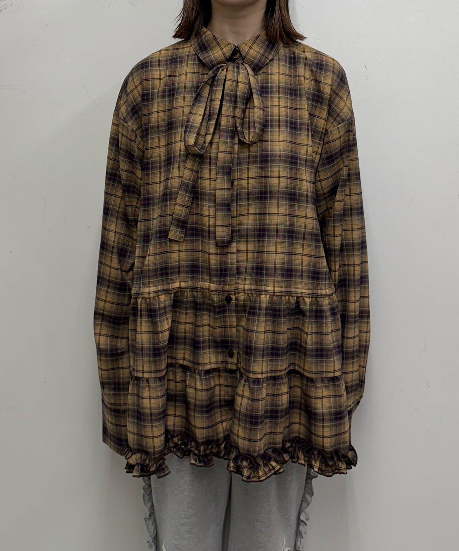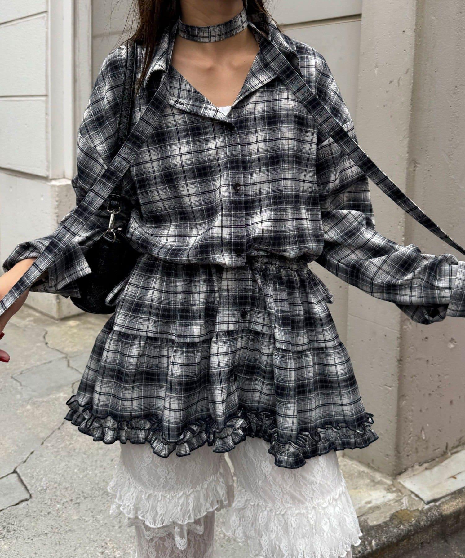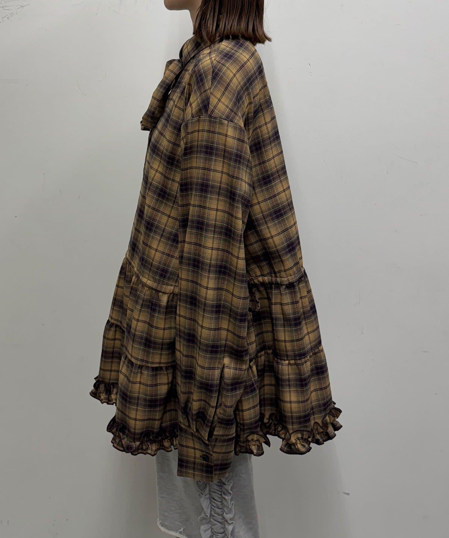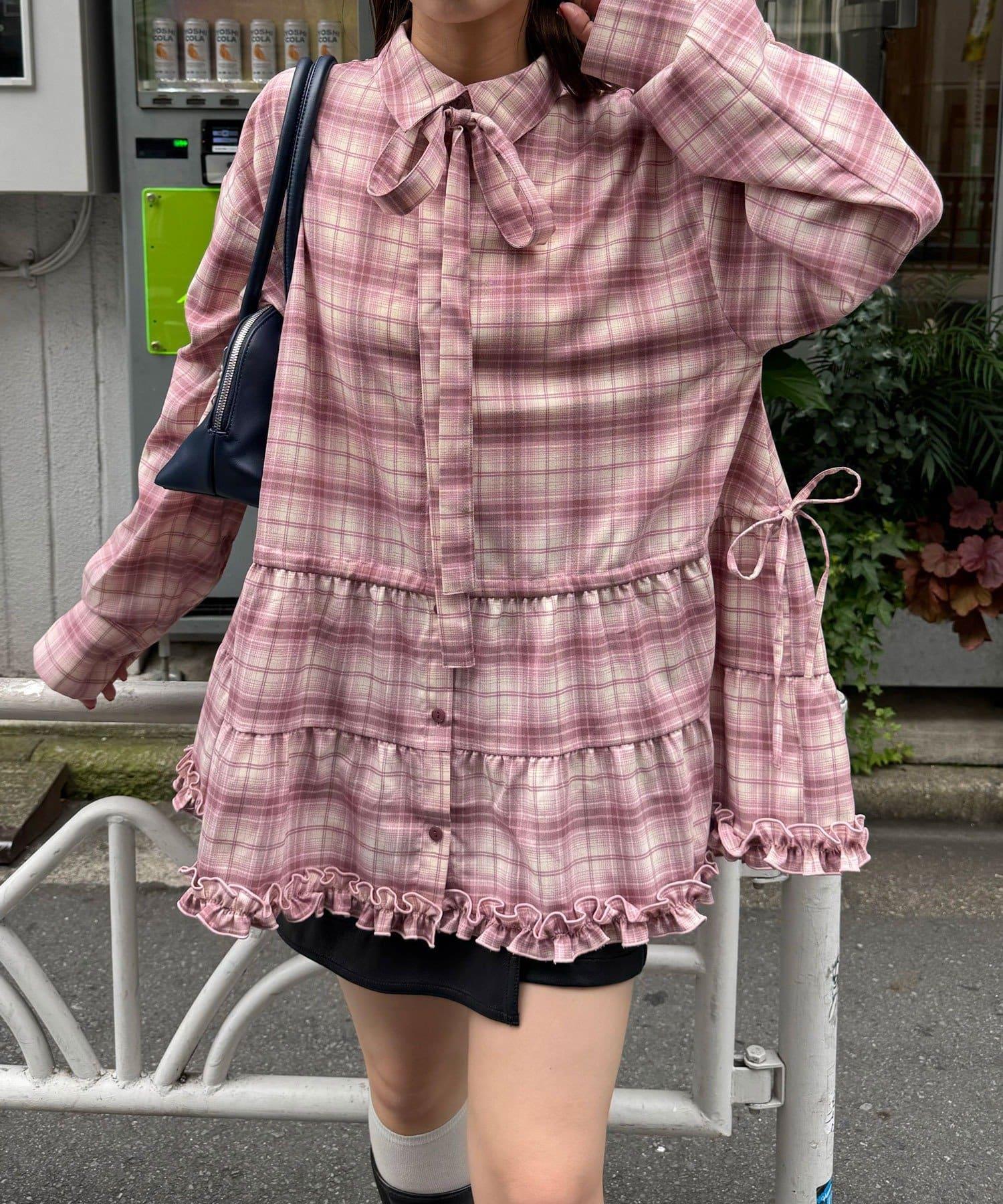 蝴蝶結領下襬層疊格子襯衫連衣裙