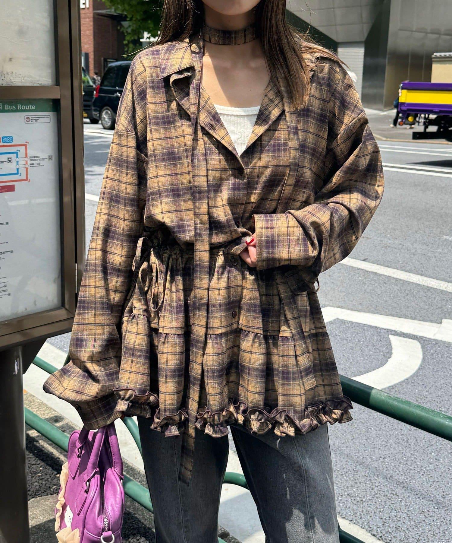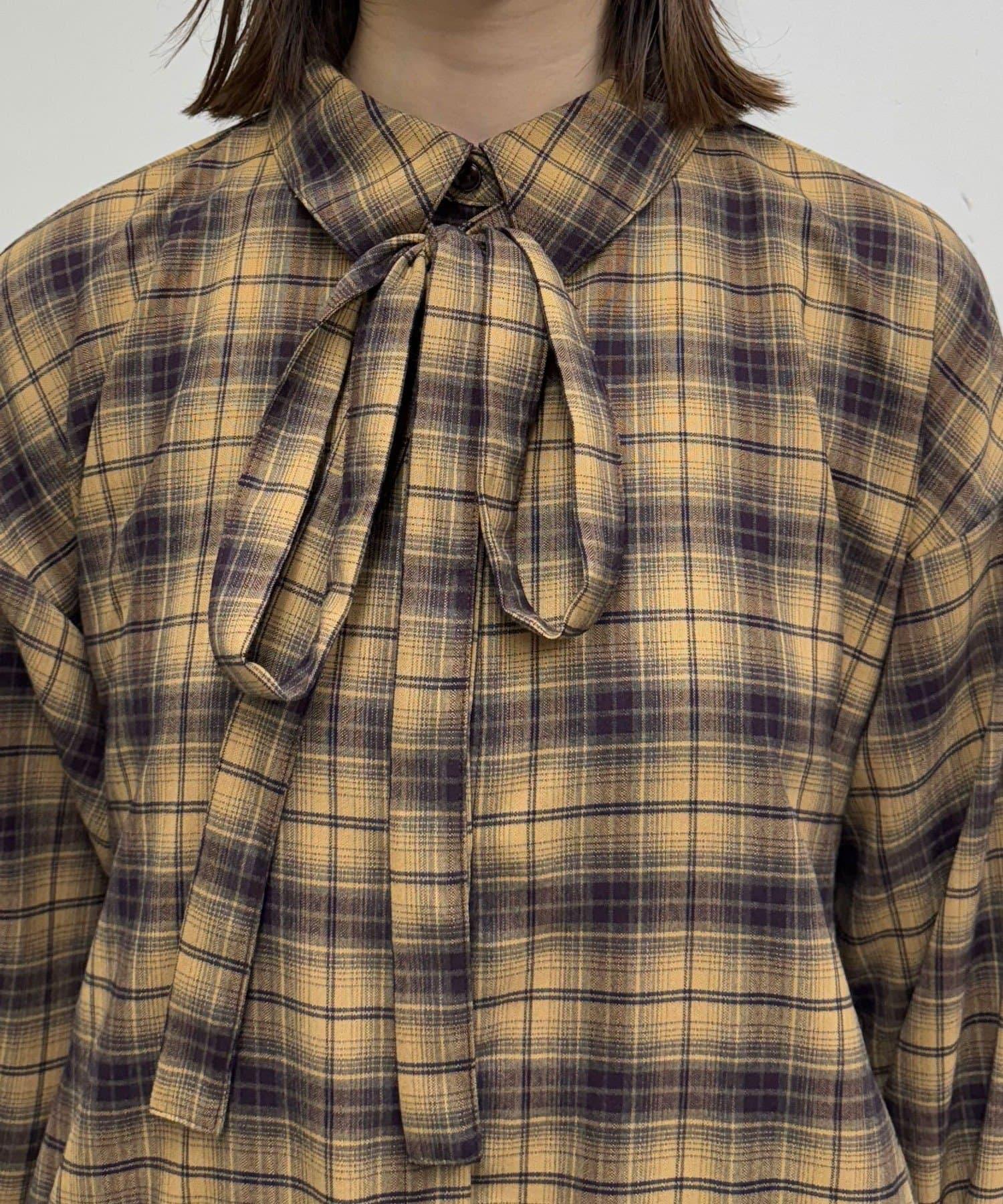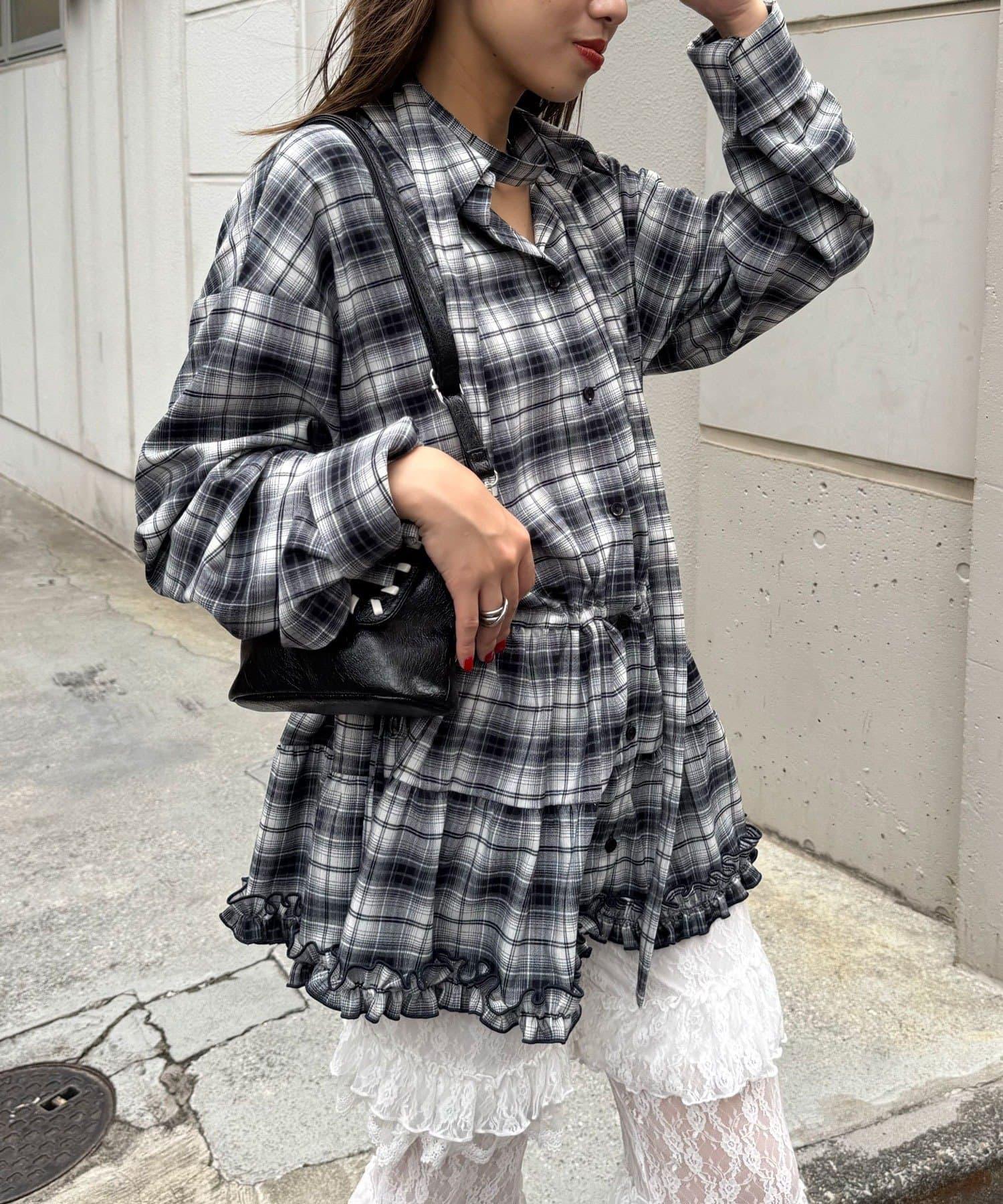 蝴蝶結領下襬層疊格子襯衫連衣裙