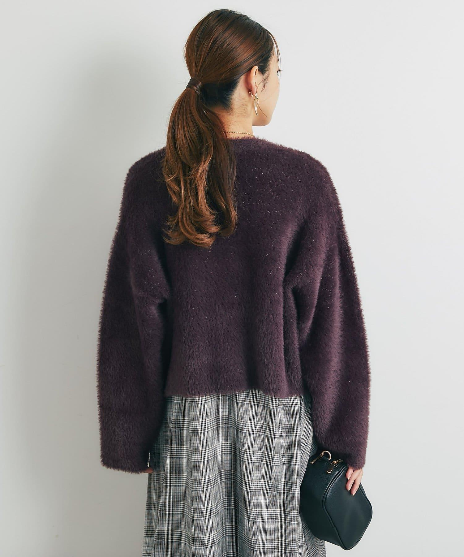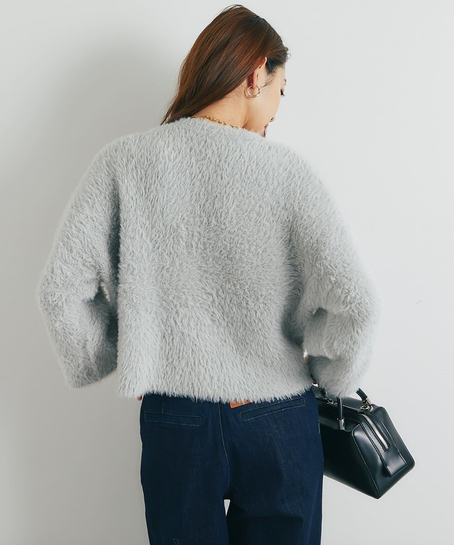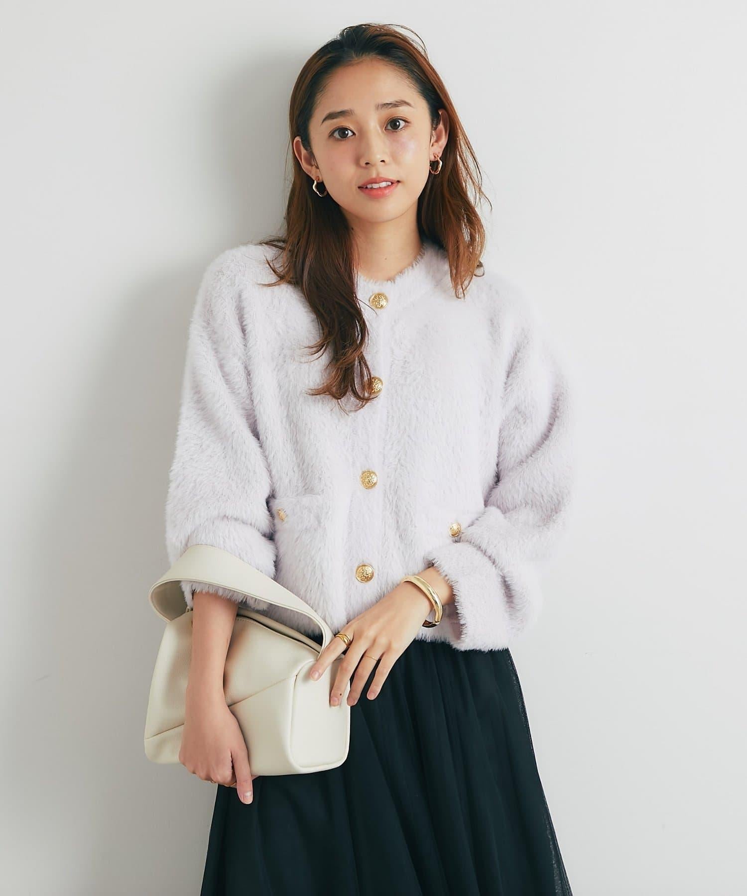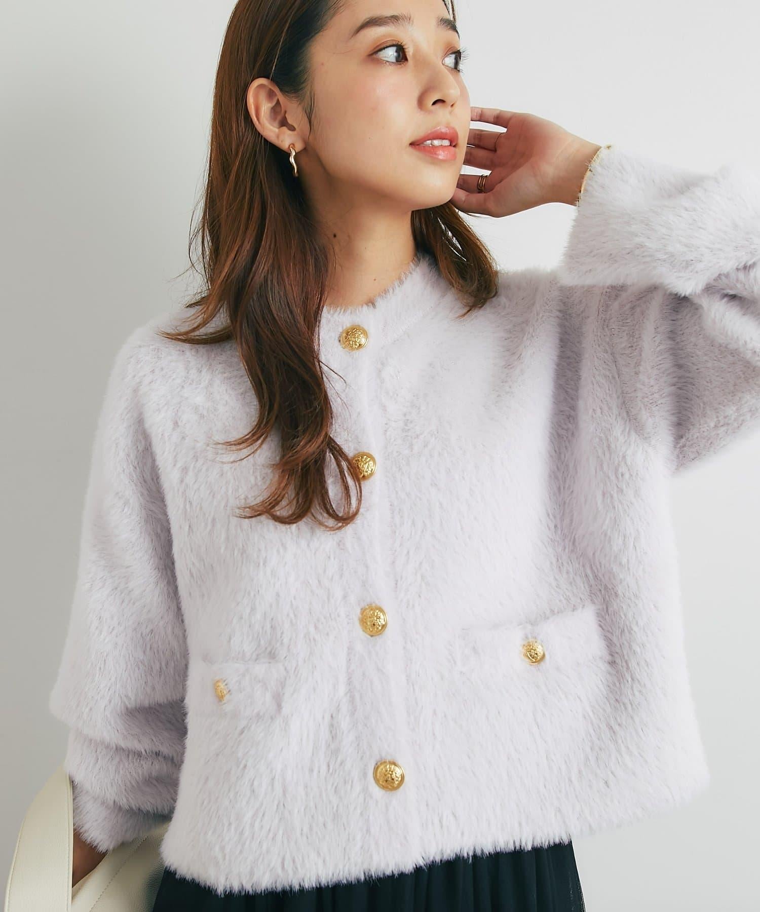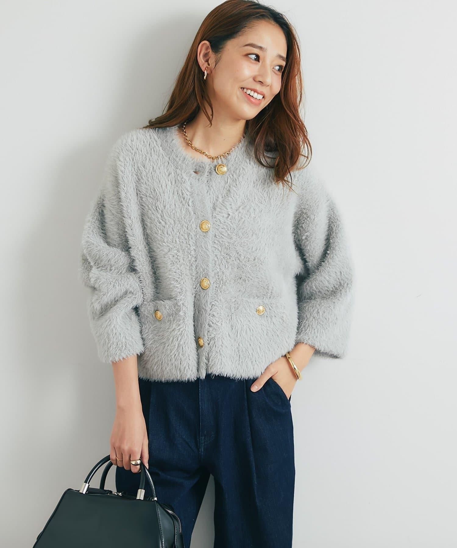 這款開襟羊毛衫採用柔軟蓬鬆的絨毛面料,質感奢華,給人以優雅的印象。