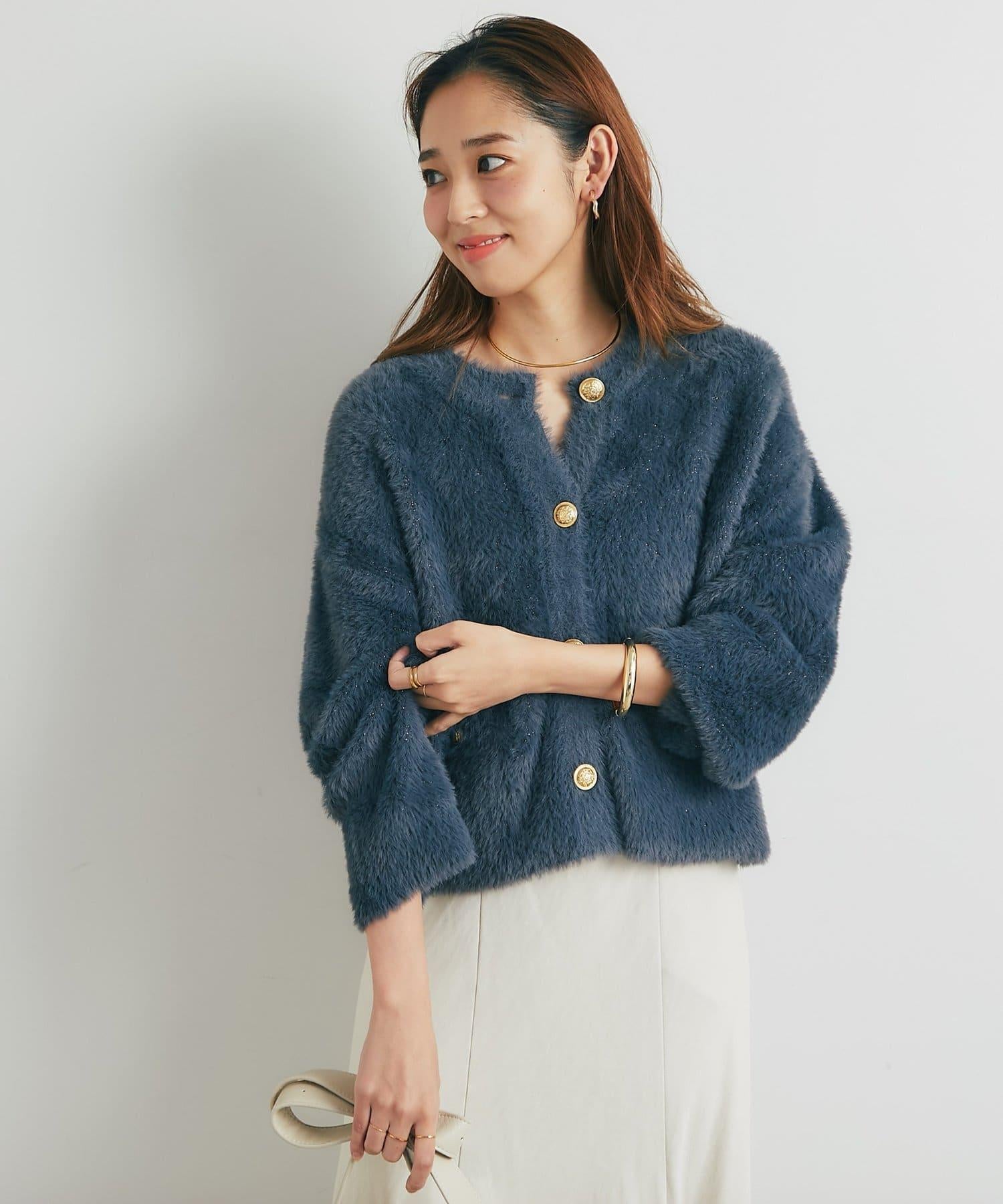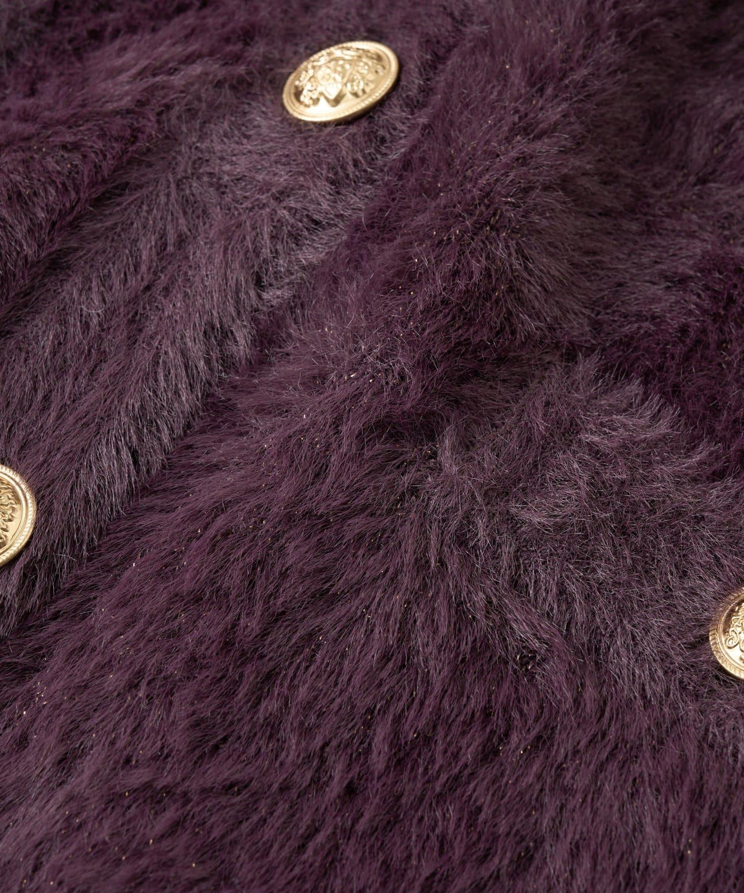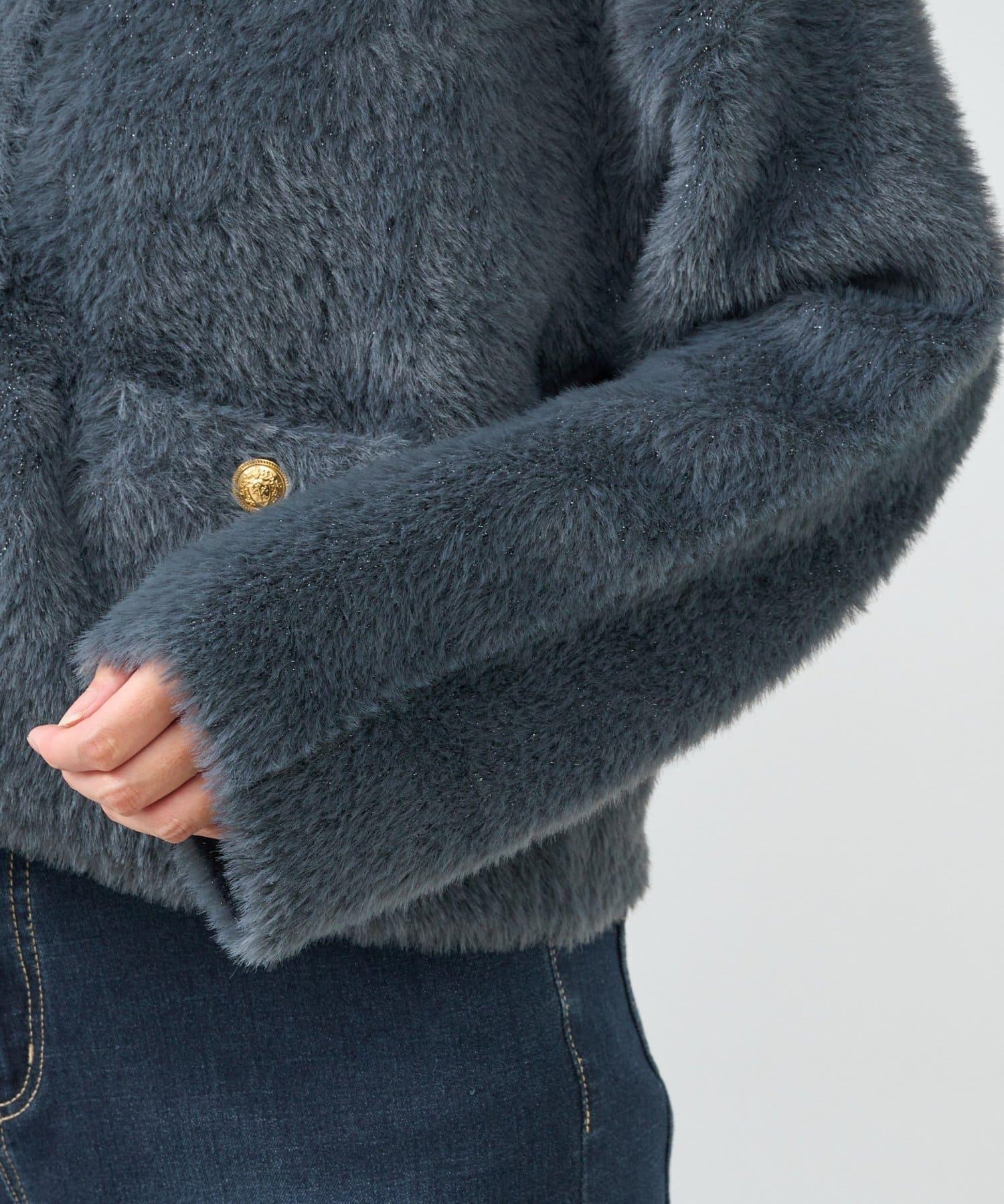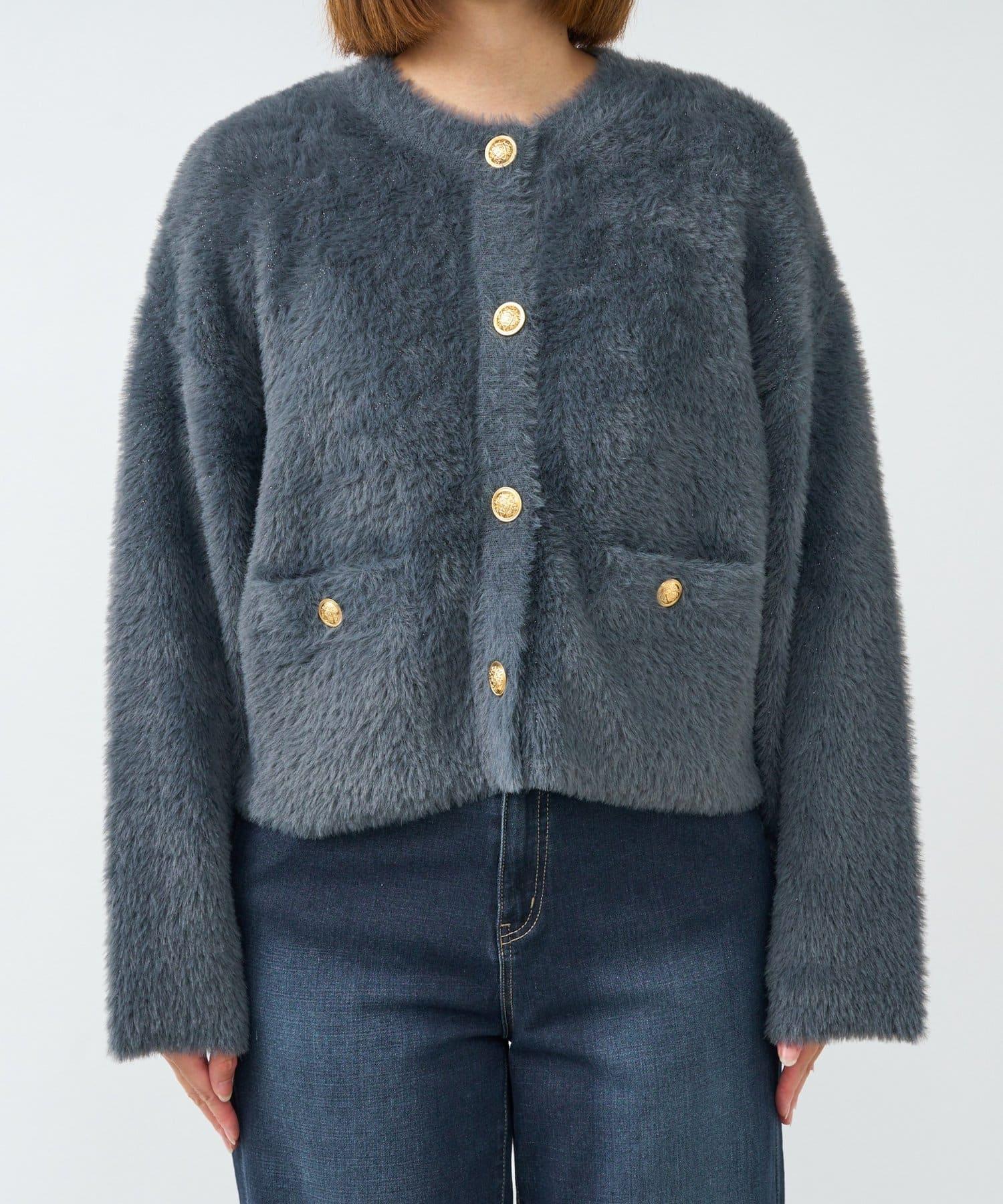 表情豐富優雅針織面料亮絲長毛金色紐扣開衫
