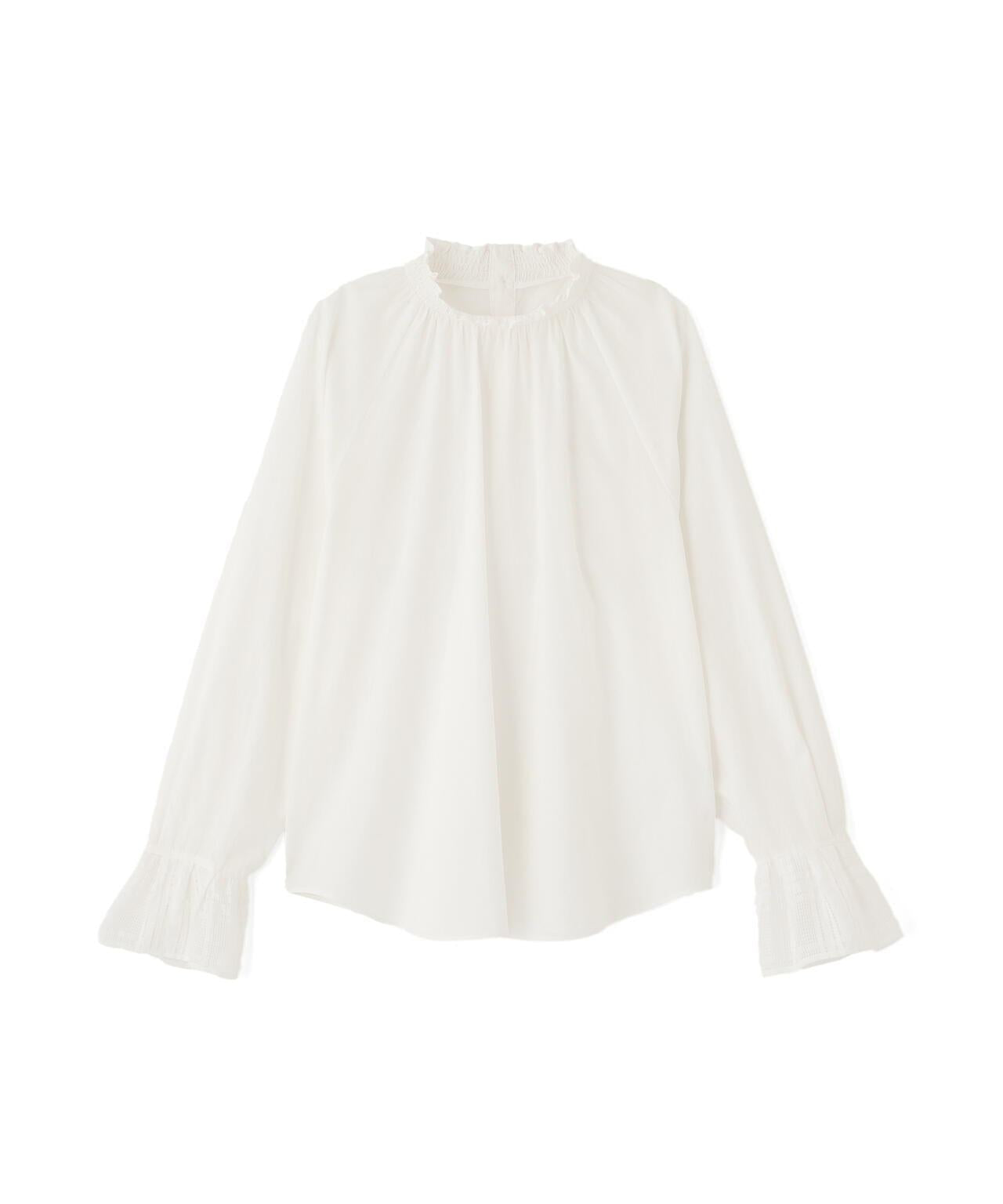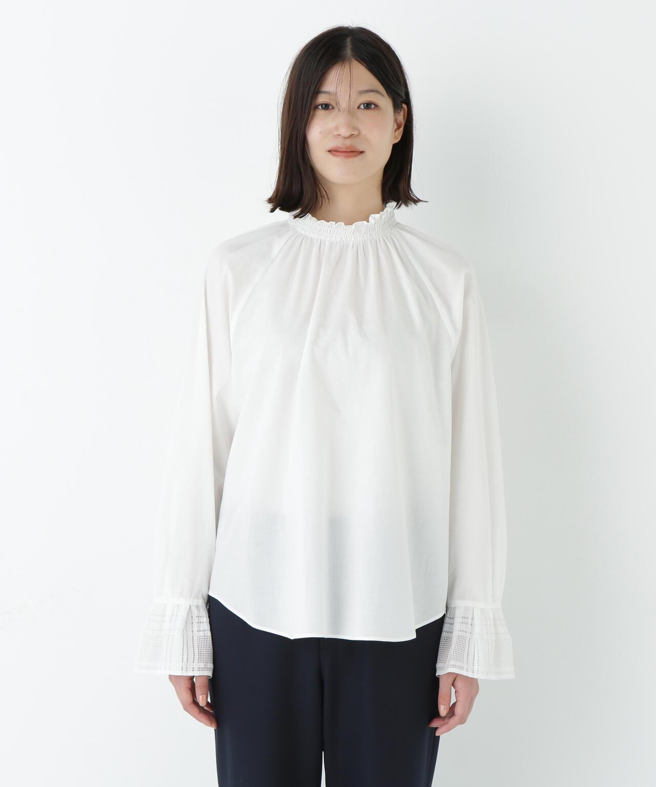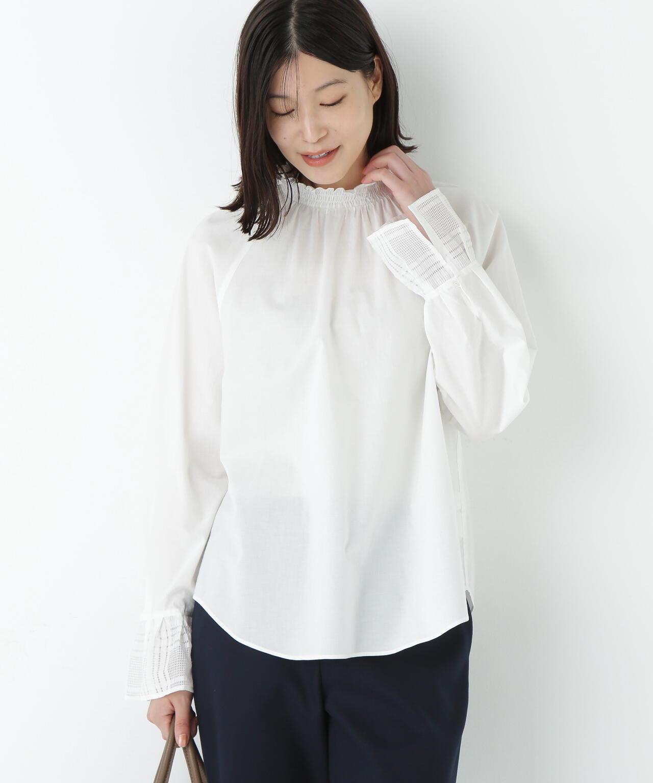 為多層款式增添魅力的設計上衣 [設計要點] 這款上衣單穿魅力十足,也建議用於多層搭配。衣領採用了波浪形設計,細密的褶皺給人一種不甜膩的感覺。袖口採用透視格紋面料。[材質要點] 雖然採用的是 100%純棉面料,但面料具有柔韌的彈性,輕薄但易於打理。袖子採用價值不菲的日本製造格紋提花面料。推薦搭配] 與針織套頭衫或開衫疊穿時,這款設計襯衫的領子和袖子都很可愛。長短搭配都很方便。