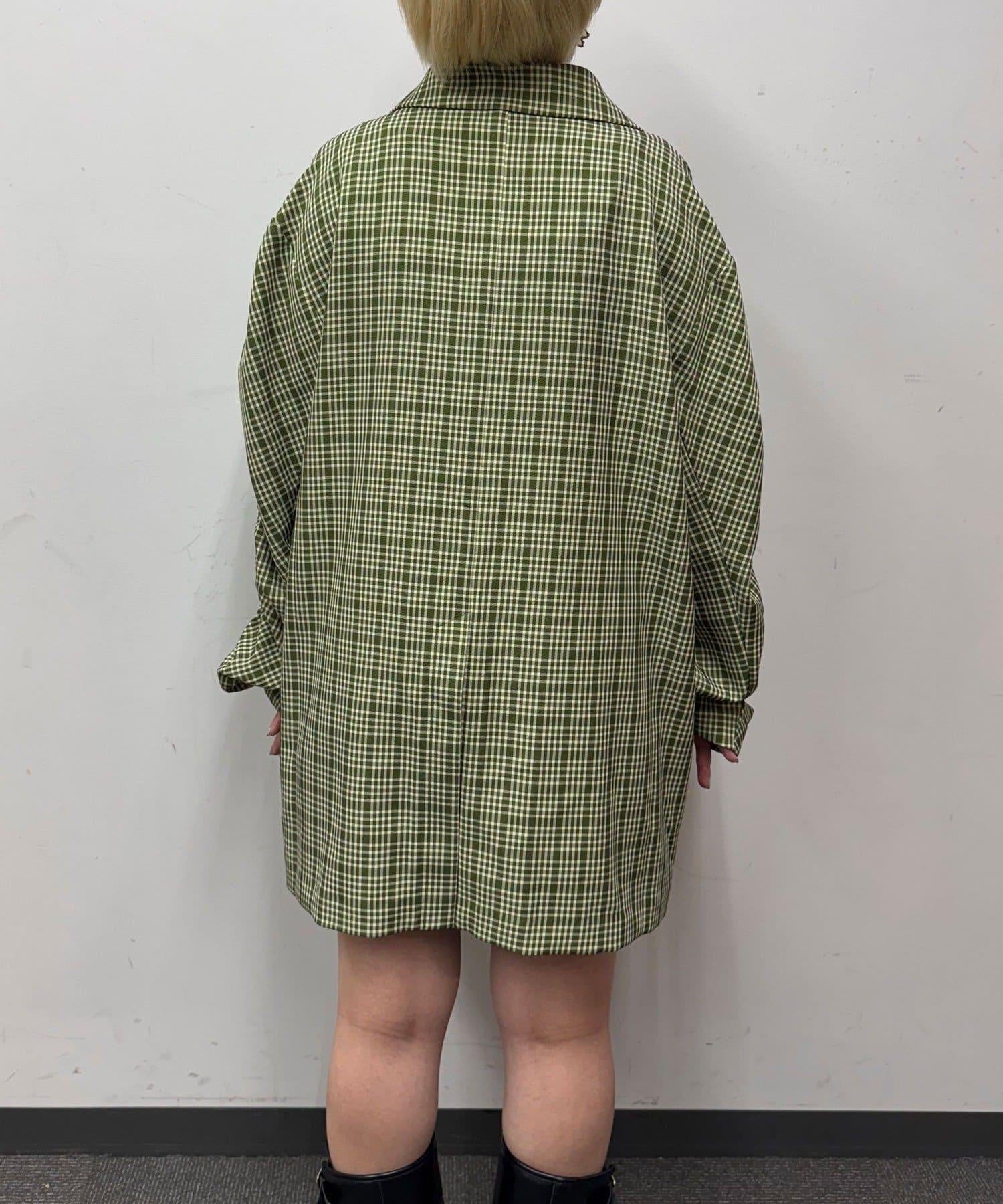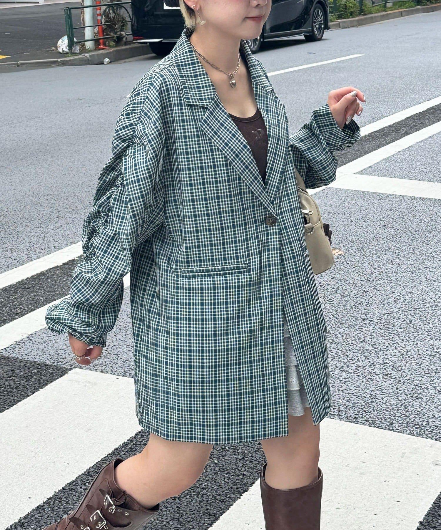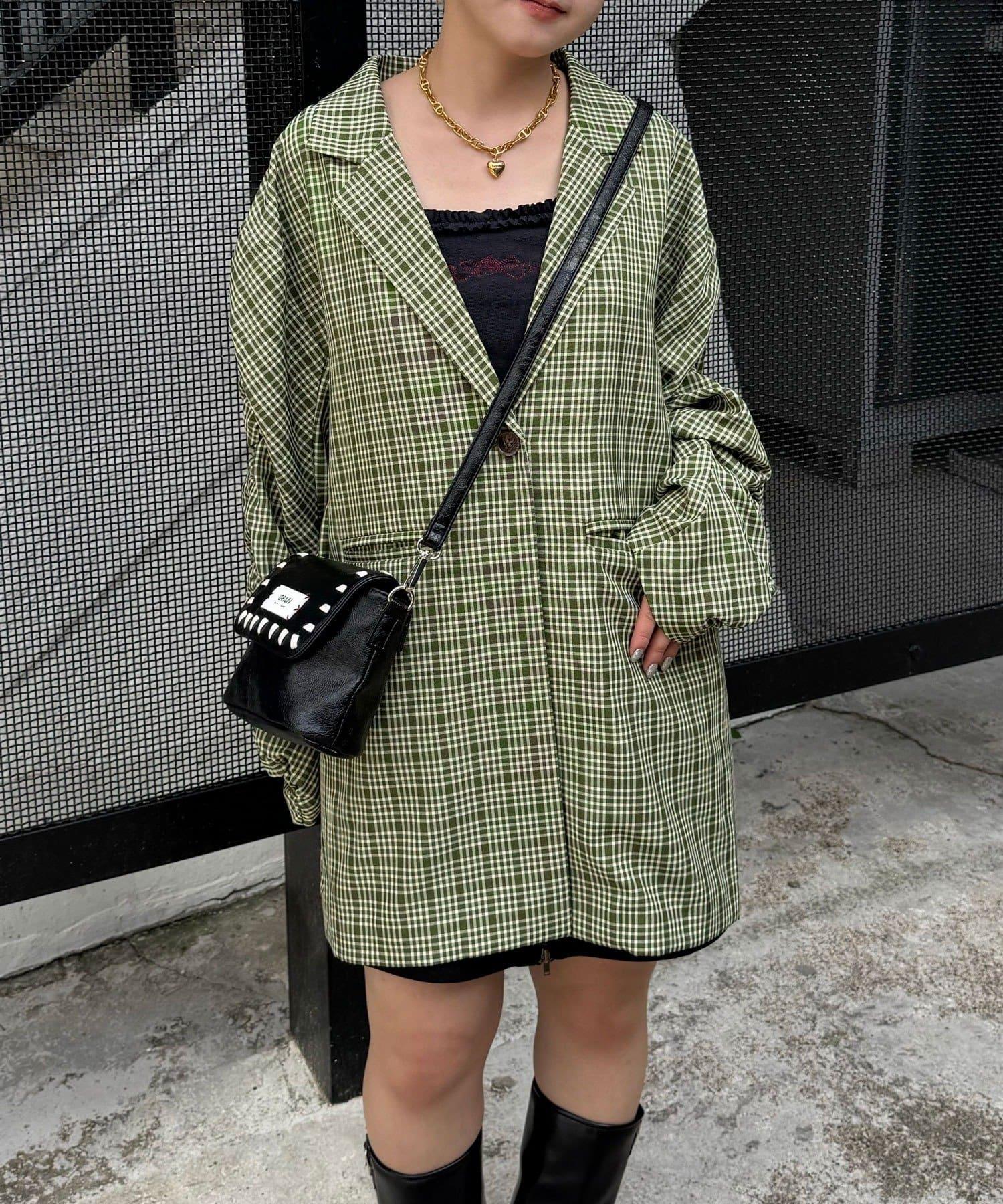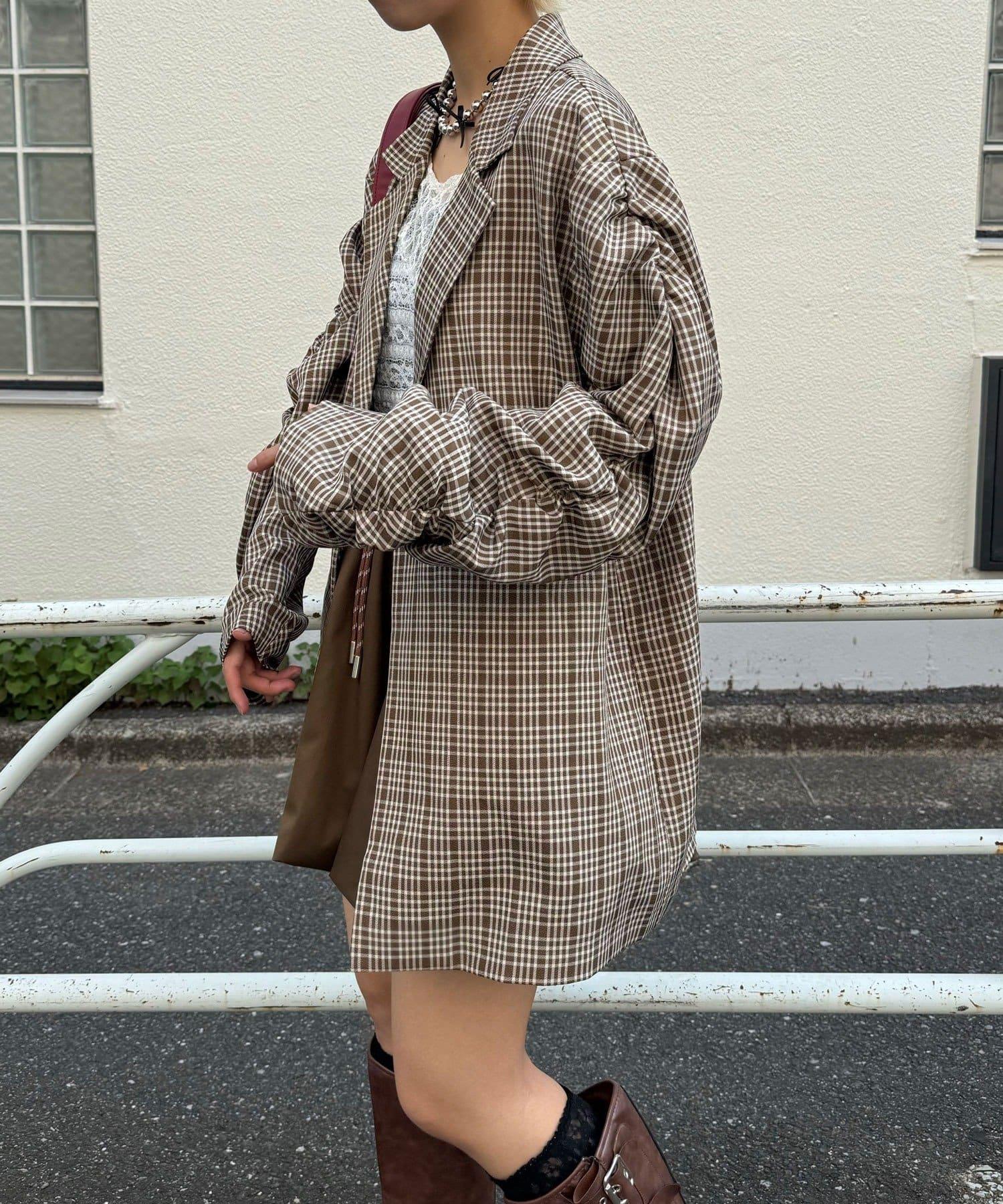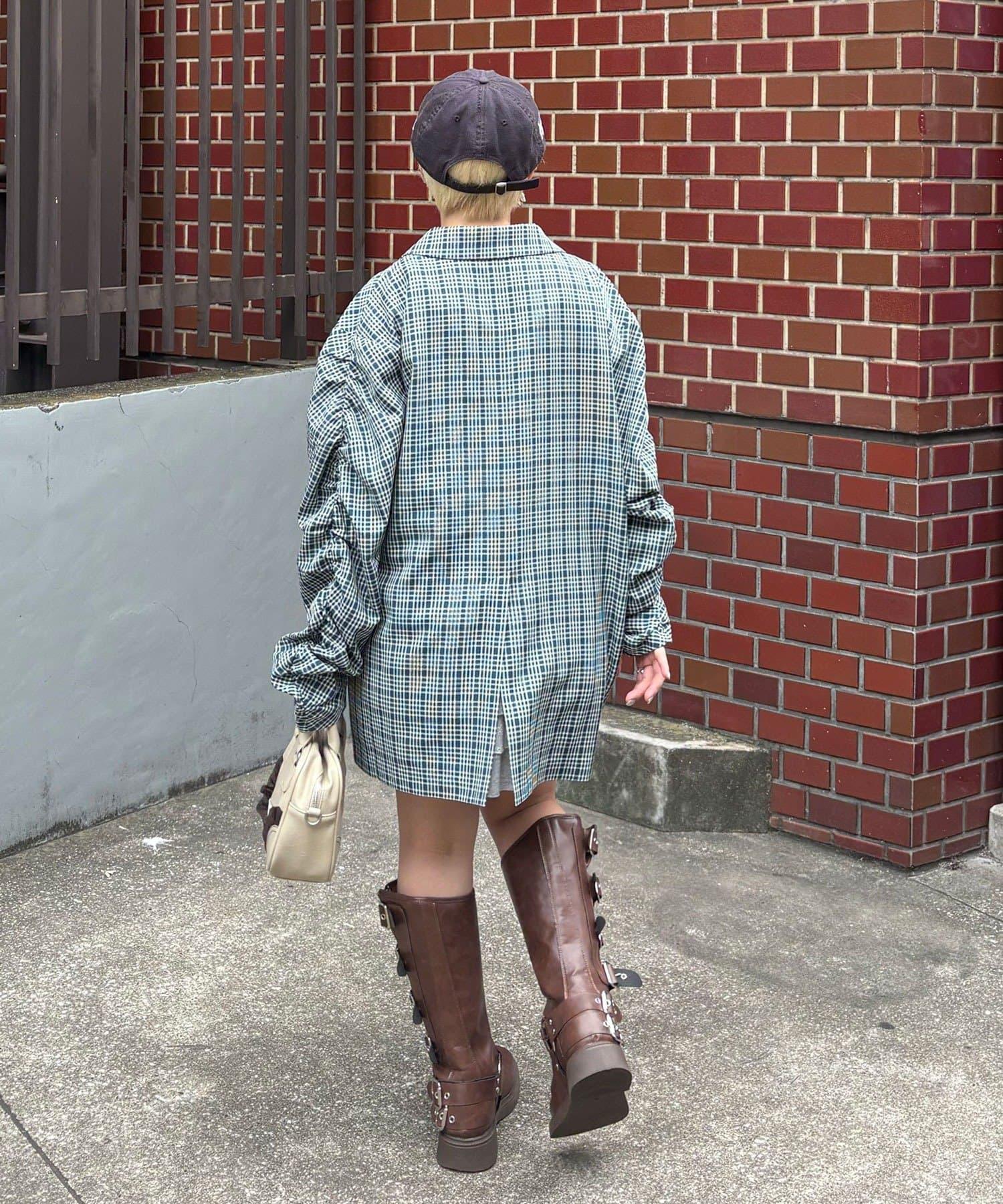寬鬆廓形的 "老爺爺 "式夾克,肩部平放,飾有棋盤格圖案。