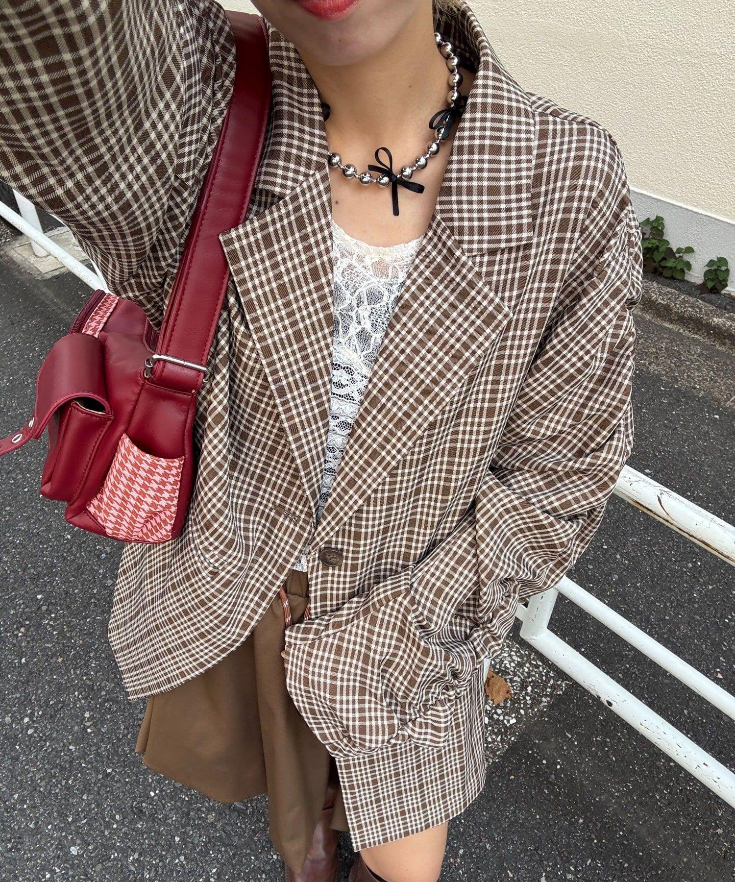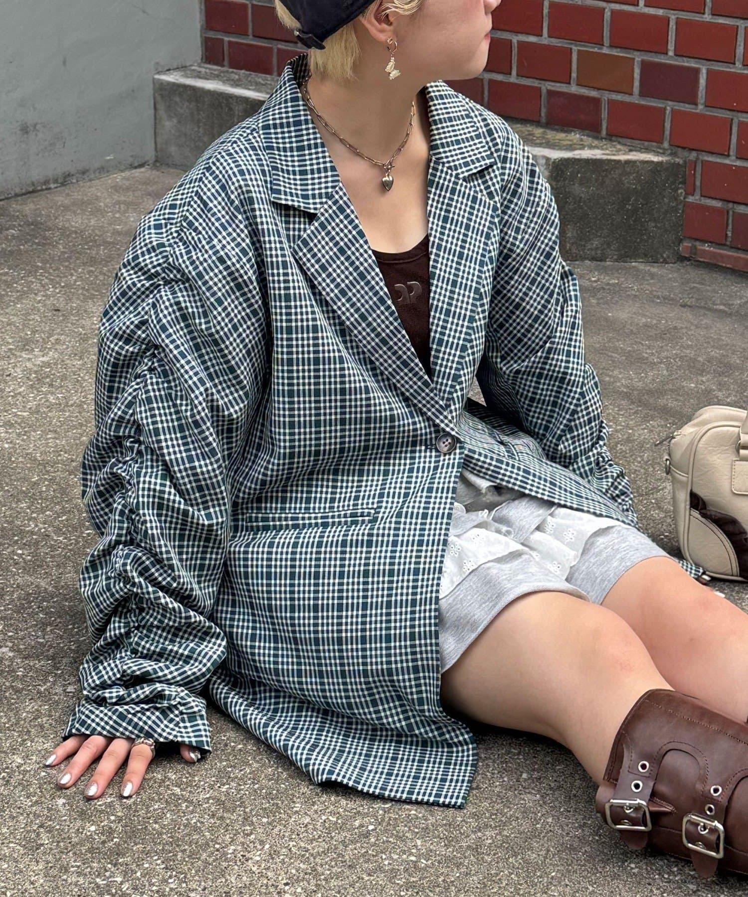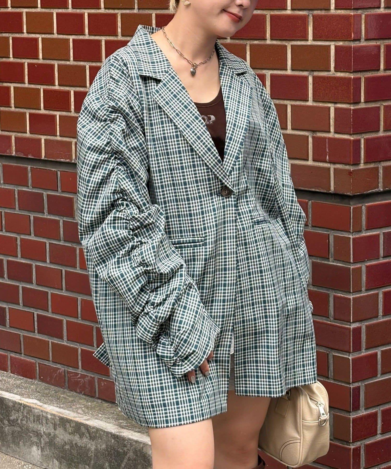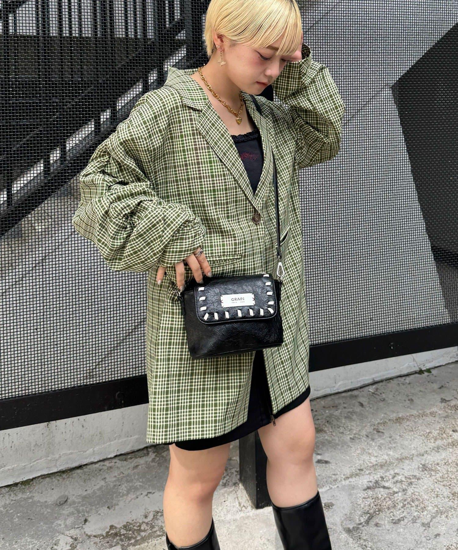 寬鬆廓形的 "老爺爺 "式夾克,肩部平放,飾有棋盤格圖案。