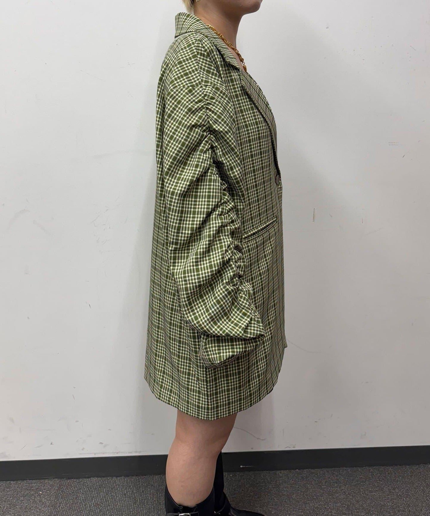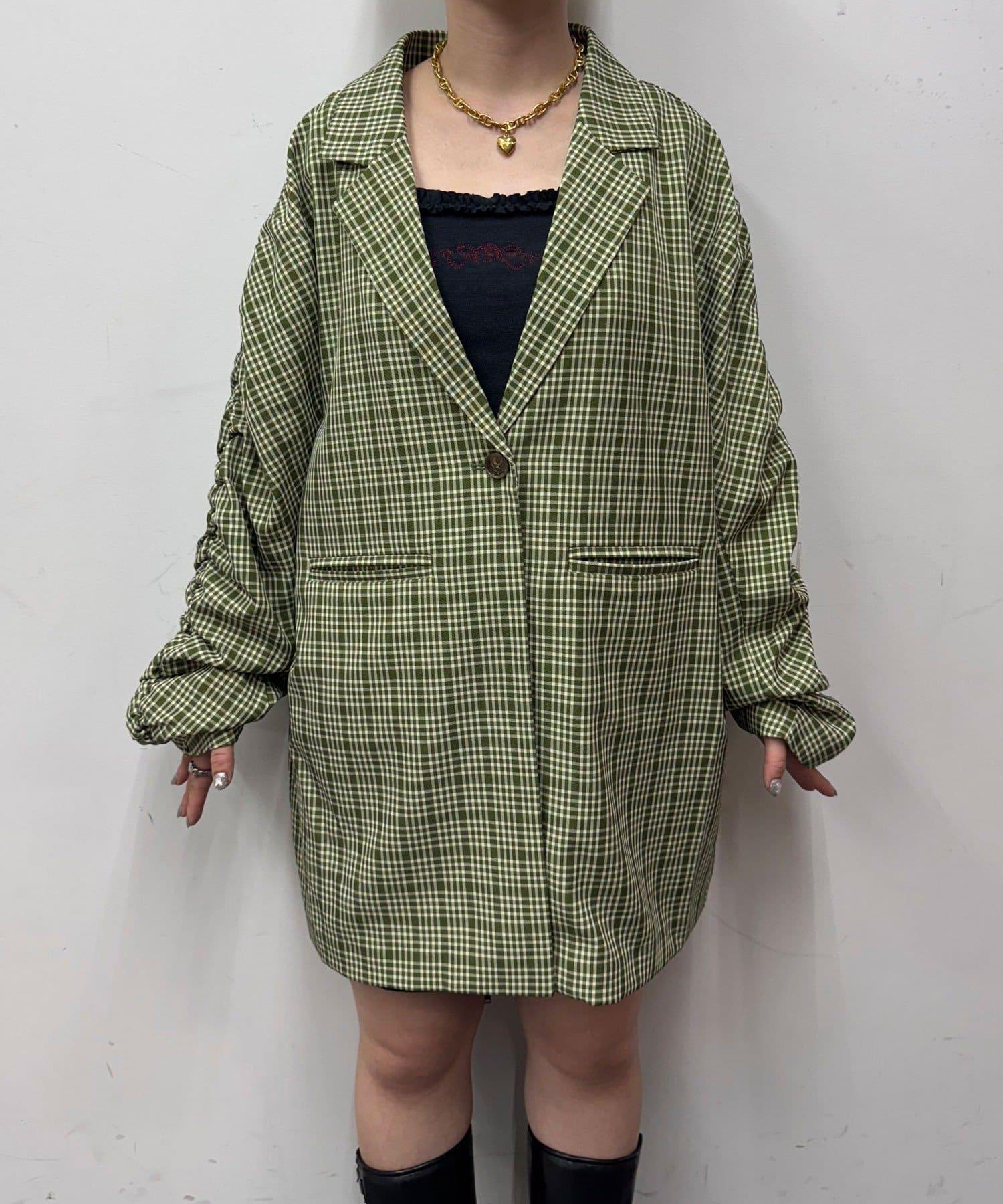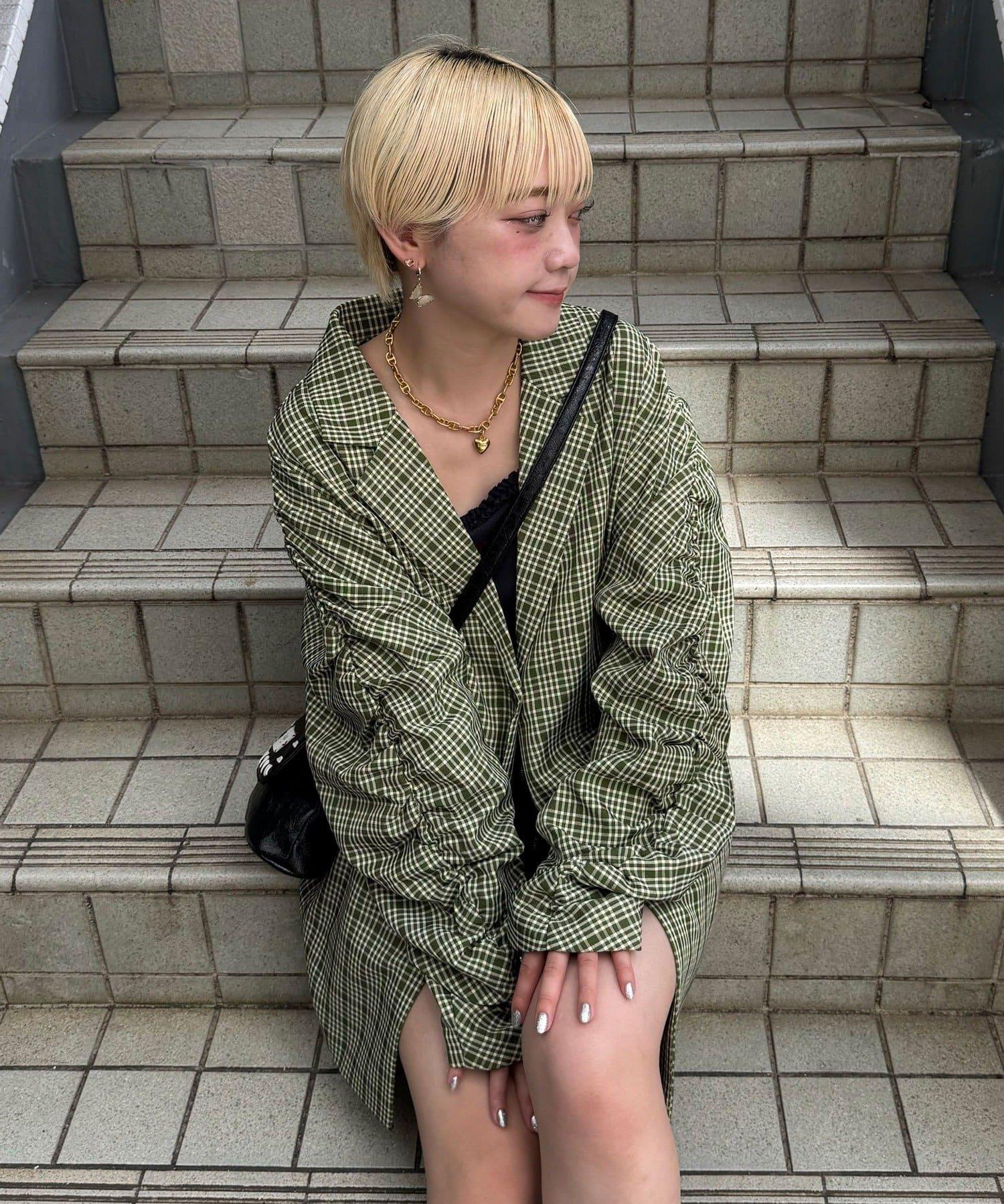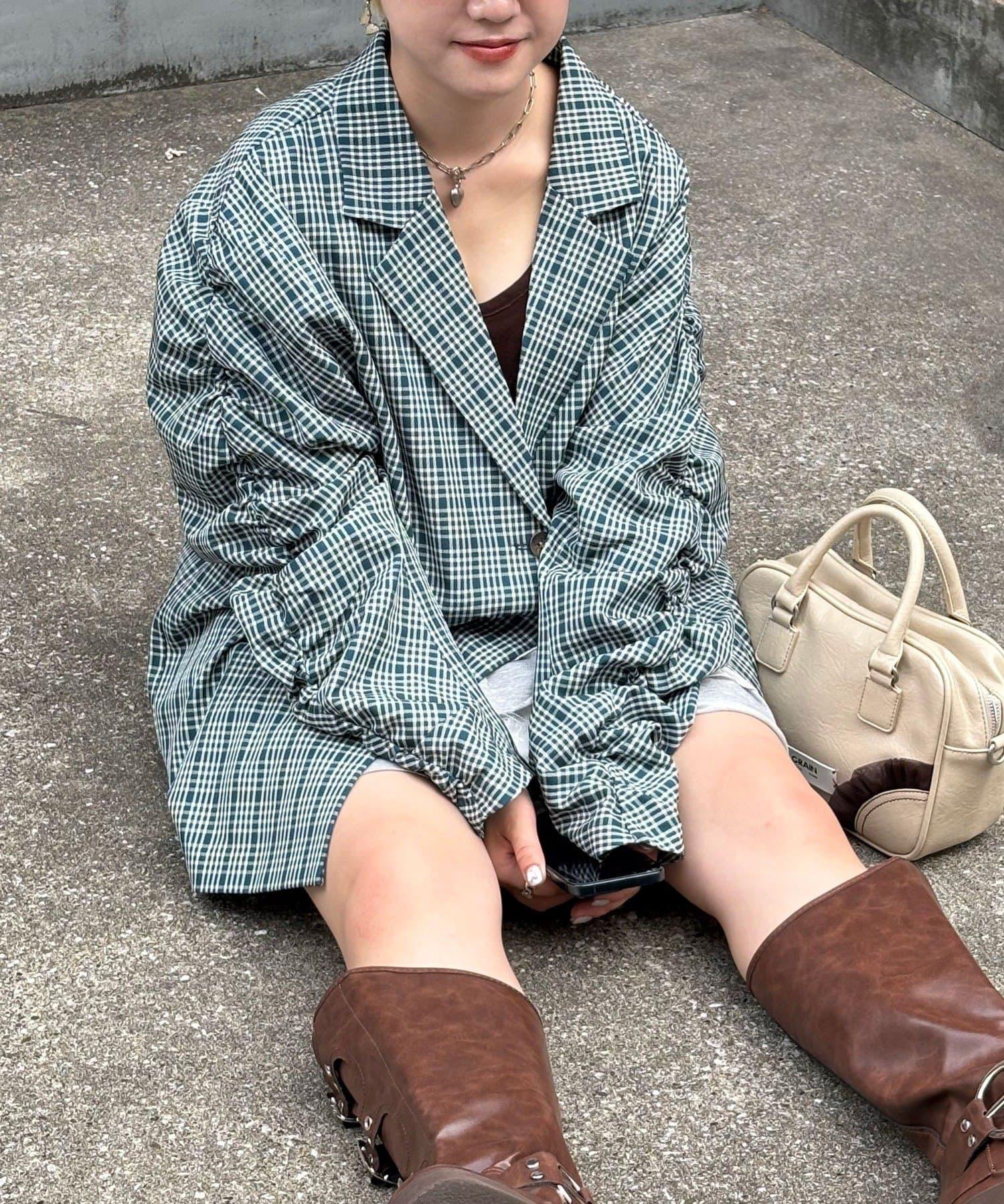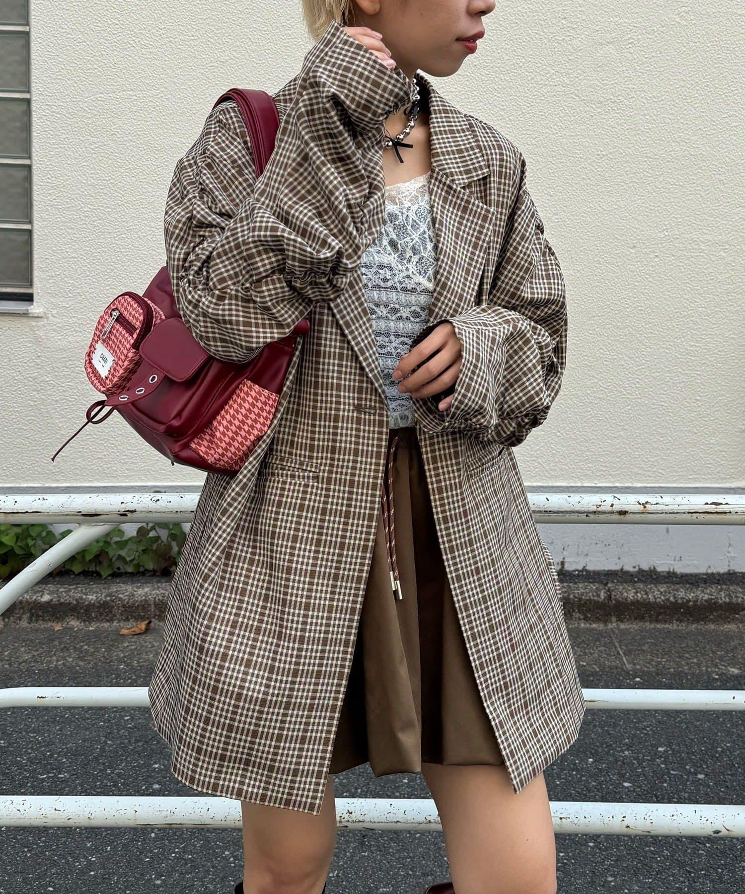 寬鬆廓形的 "老爺爺 "式夾克,肩部平放,飾有棋盤格圖案。