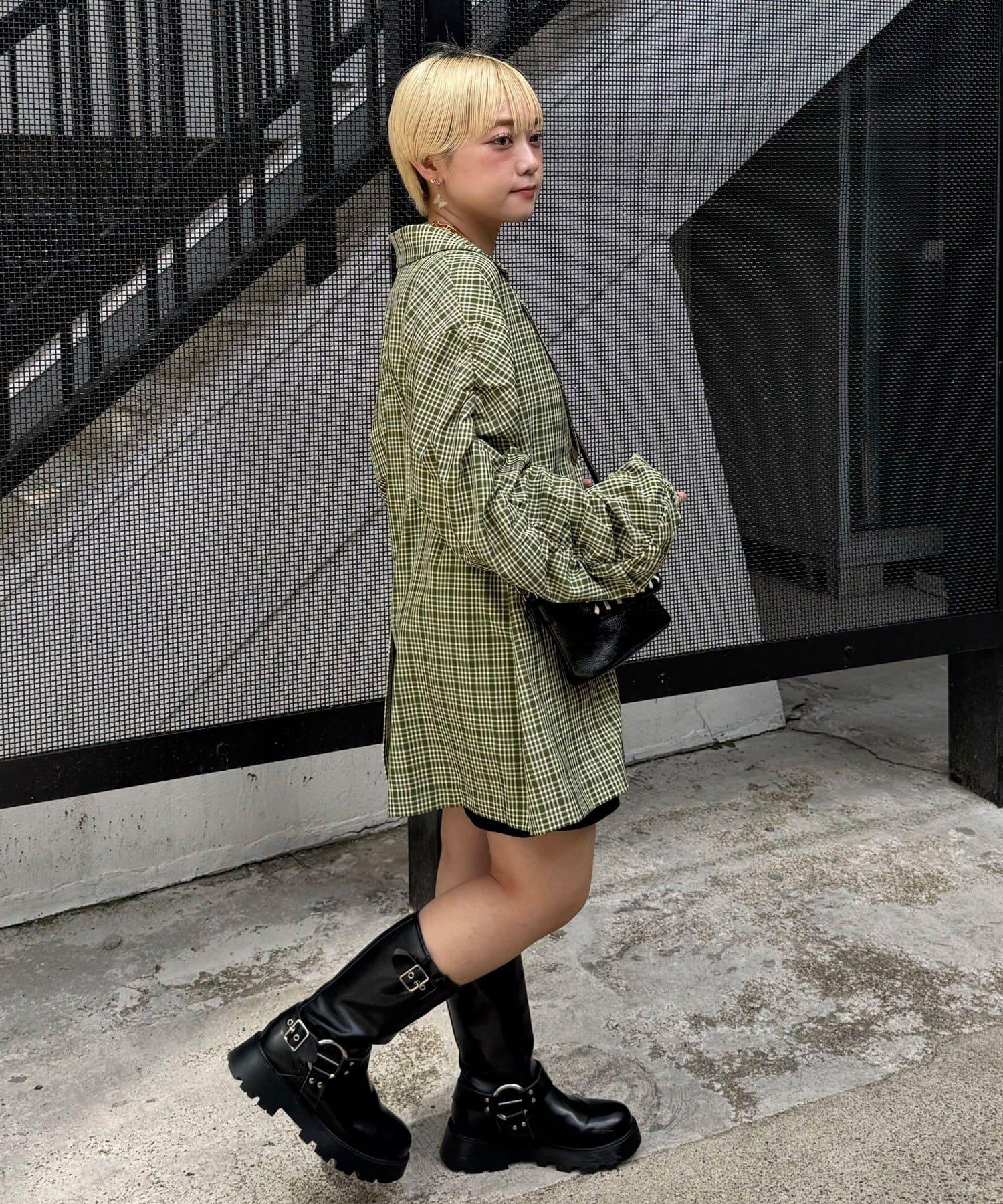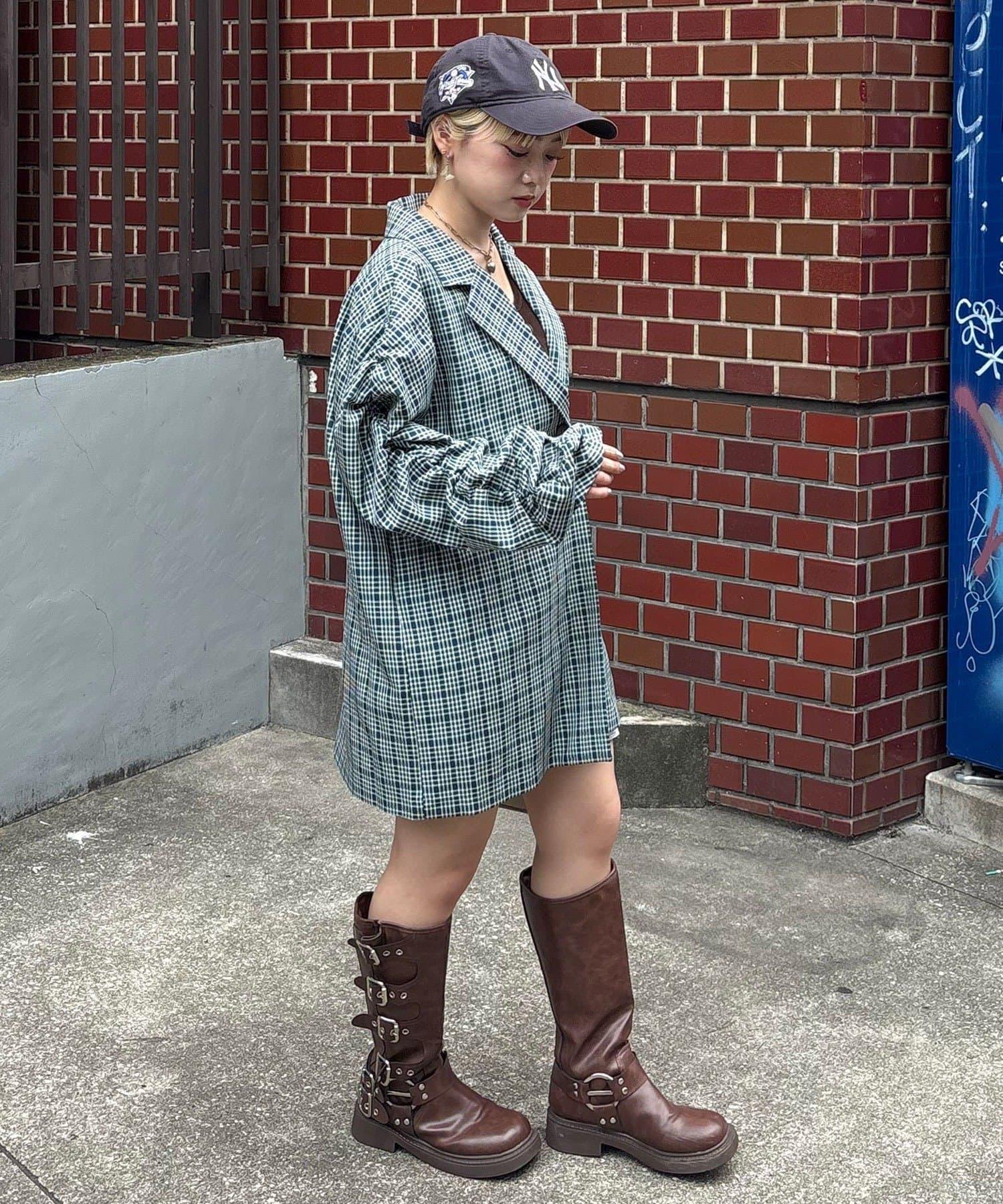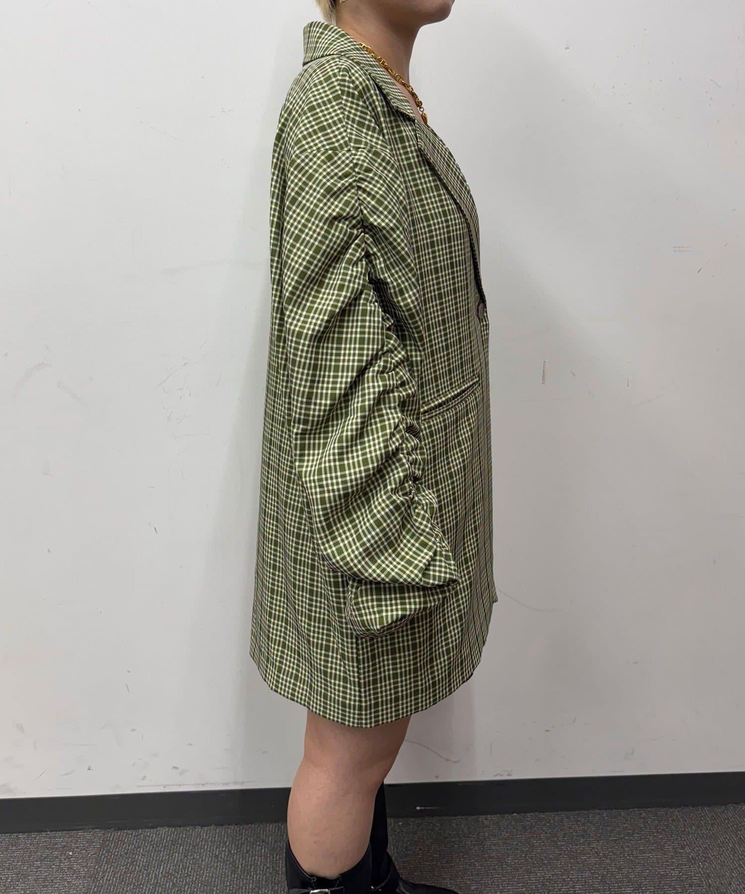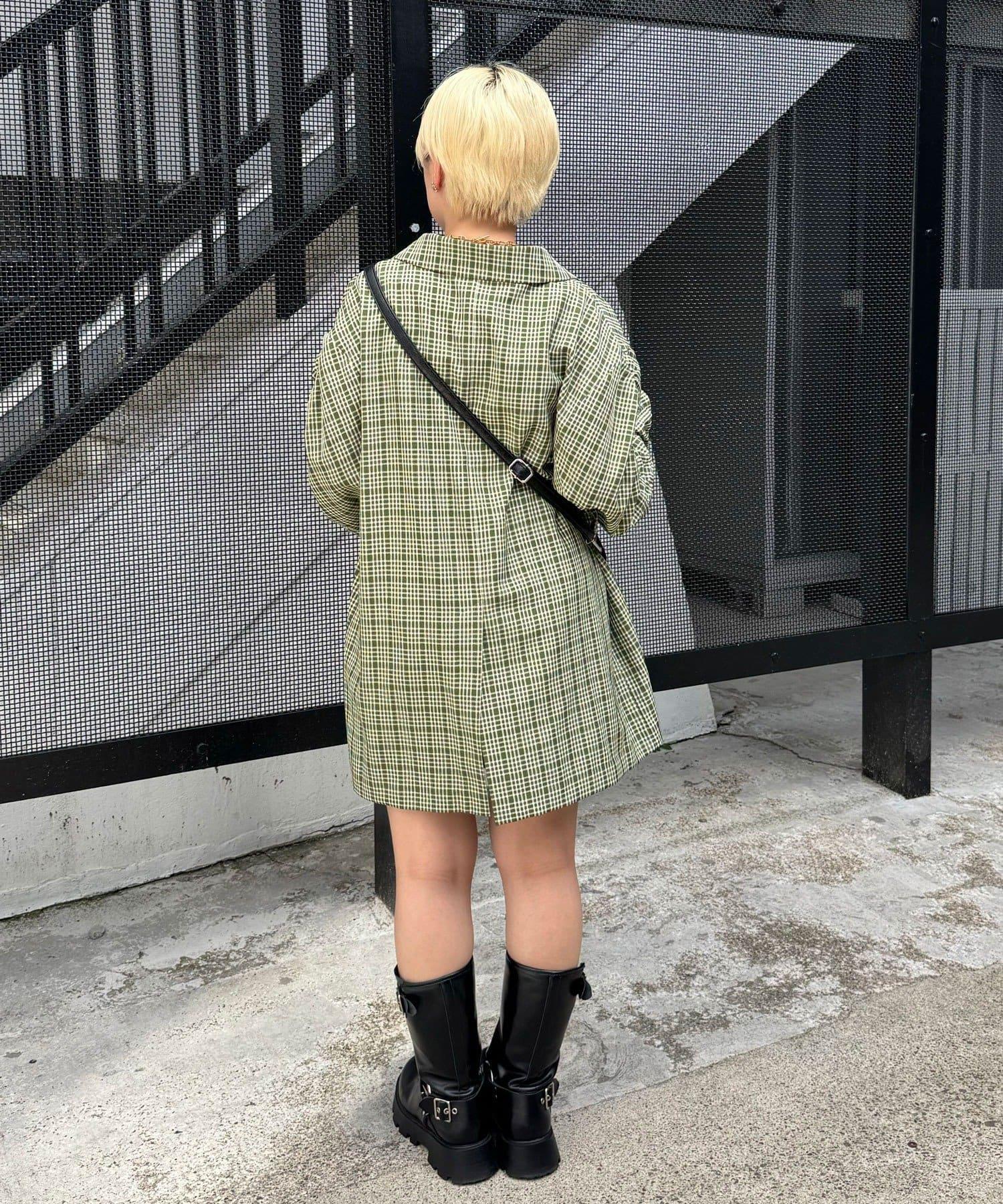 寬鬆廓形的 "老爺爺 "式夾克,肩部平放,飾有棋盤格圖案。